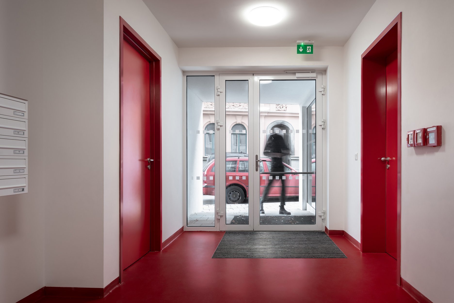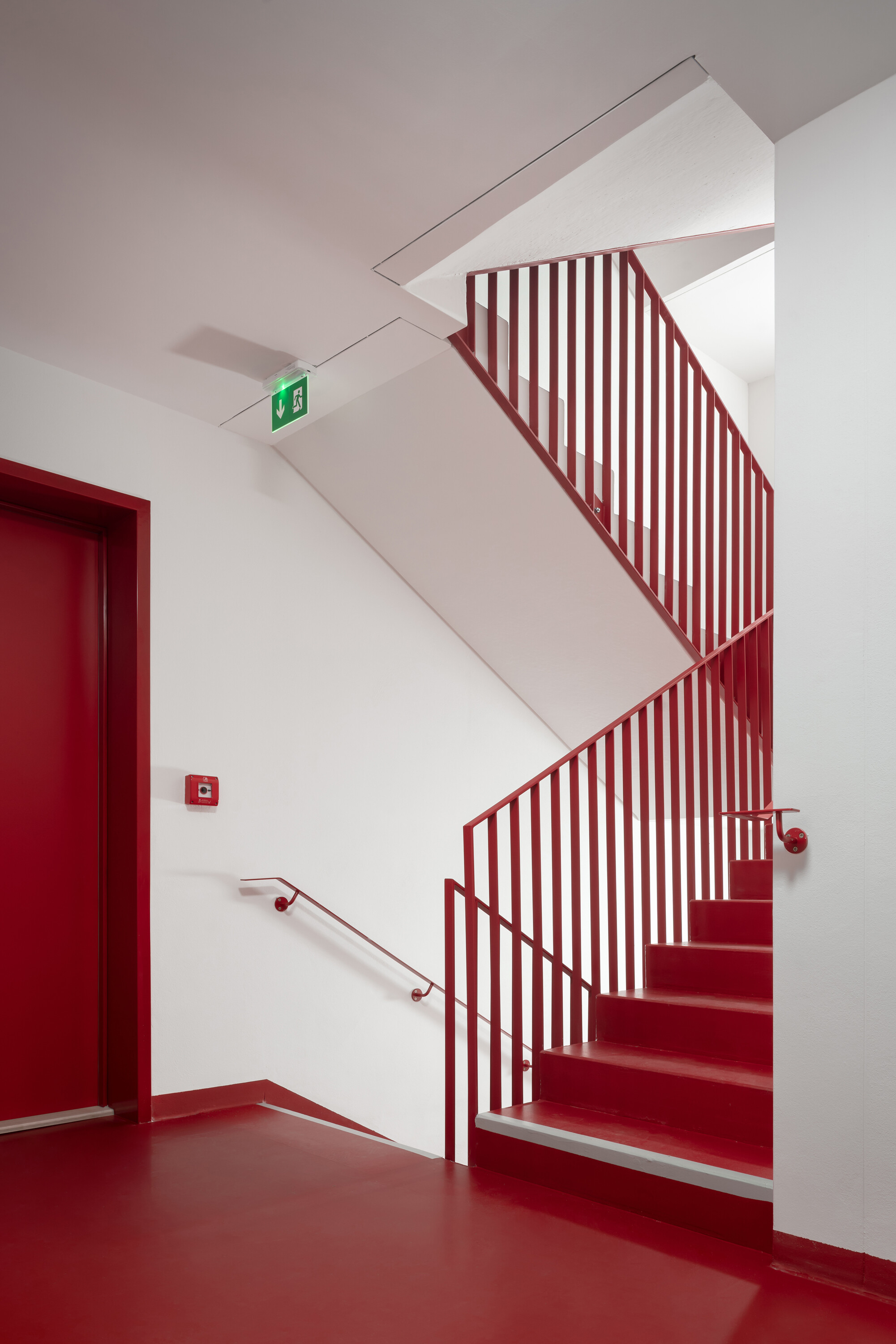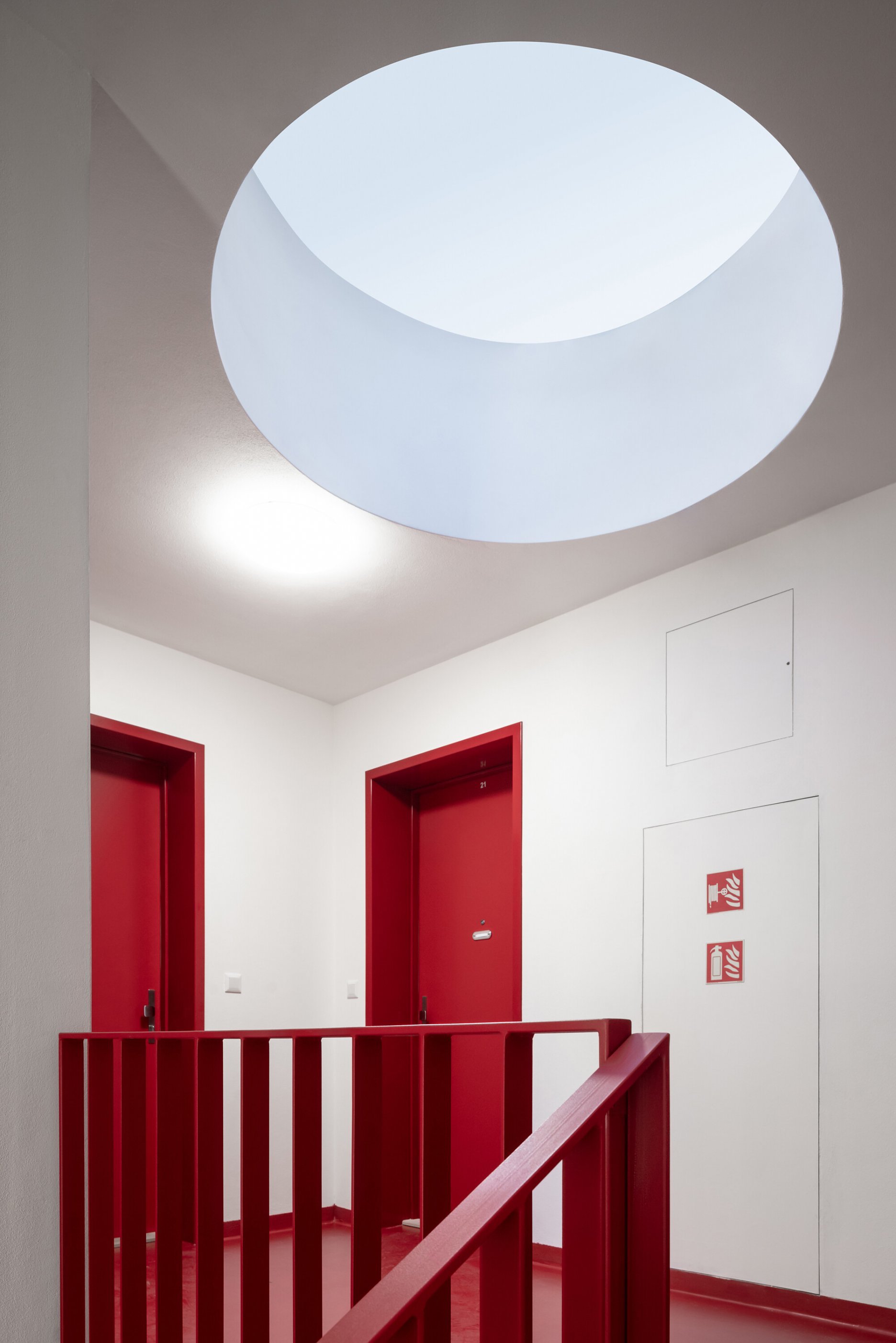 V kontraste k prísne geometrickej forme a monochromatickej fasáde pôsobí červená podlaha spoločných priestorov chodieb a schodísk, ktorá sa vinie celým domom od vstupnej haly až po kruhový svetlík, presvetľujúci schodiskovú halu v hornom podlaží.