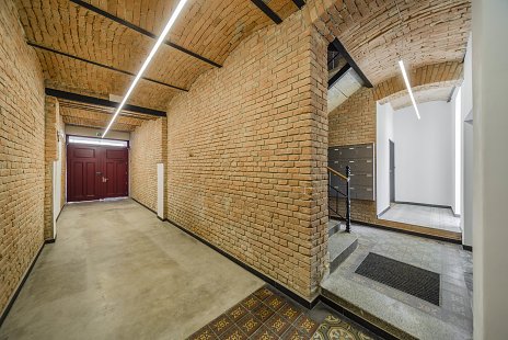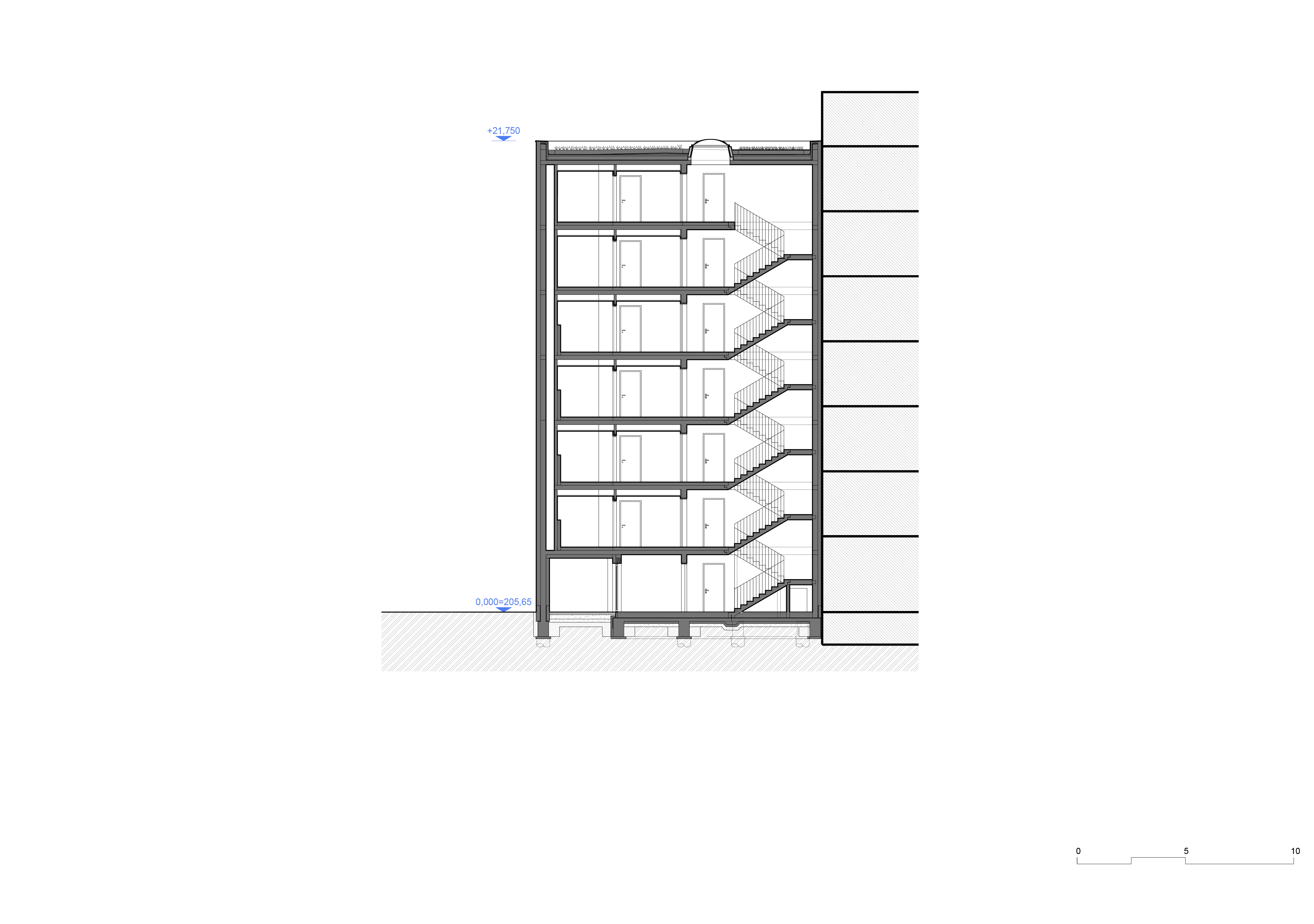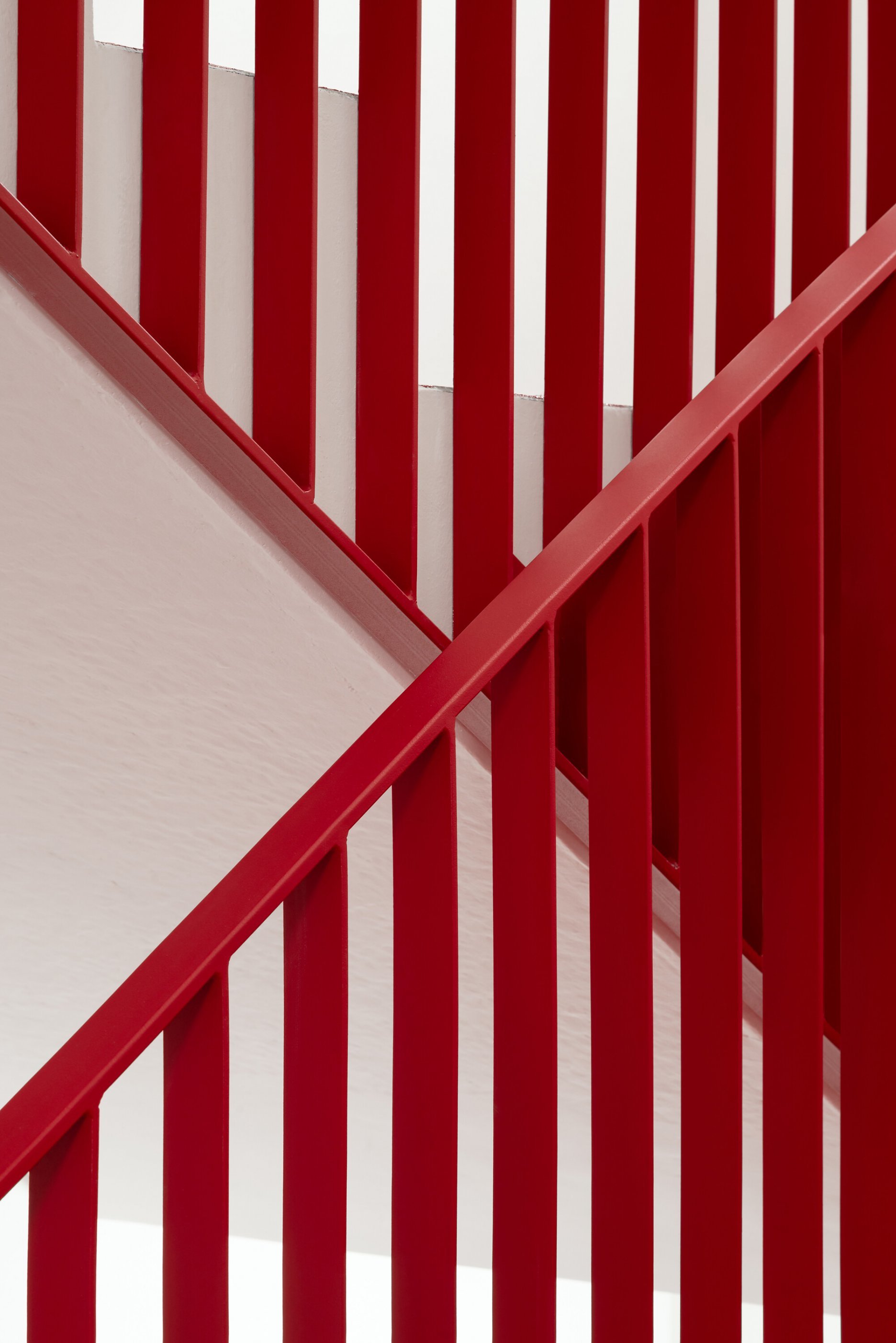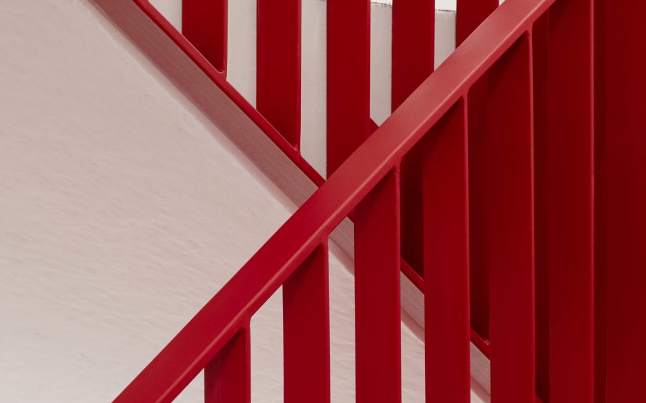 V kontraste k prísne geometrickej forme a monochromatickej fasáde pôsobí červená podlaha spoločných priestorov chodieb a schodísk, ktorá sa vinie celým domom od vstupnej haly až po kruhový svetlík, presvetľujúci schodiskovú halu v hornom podlaží.