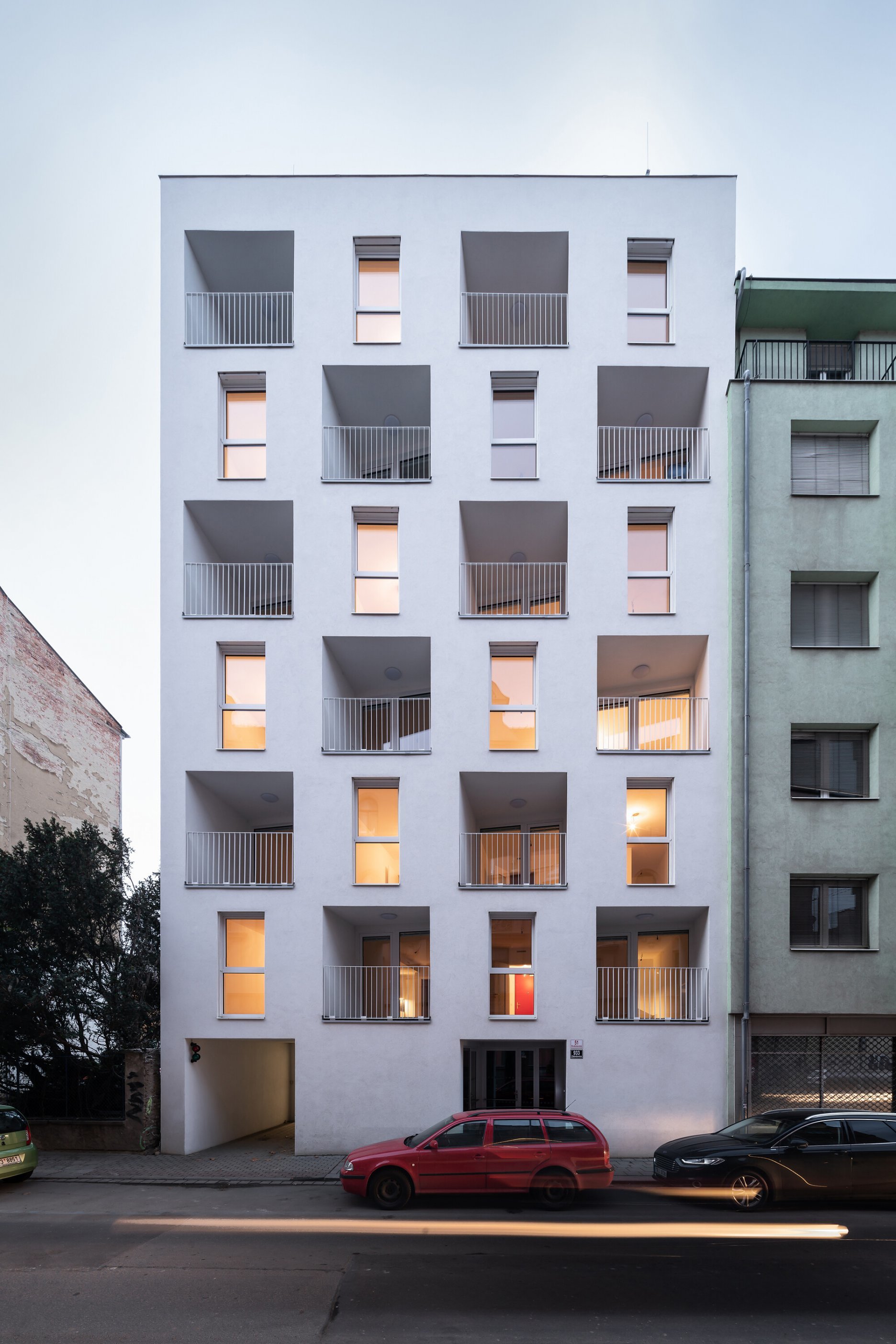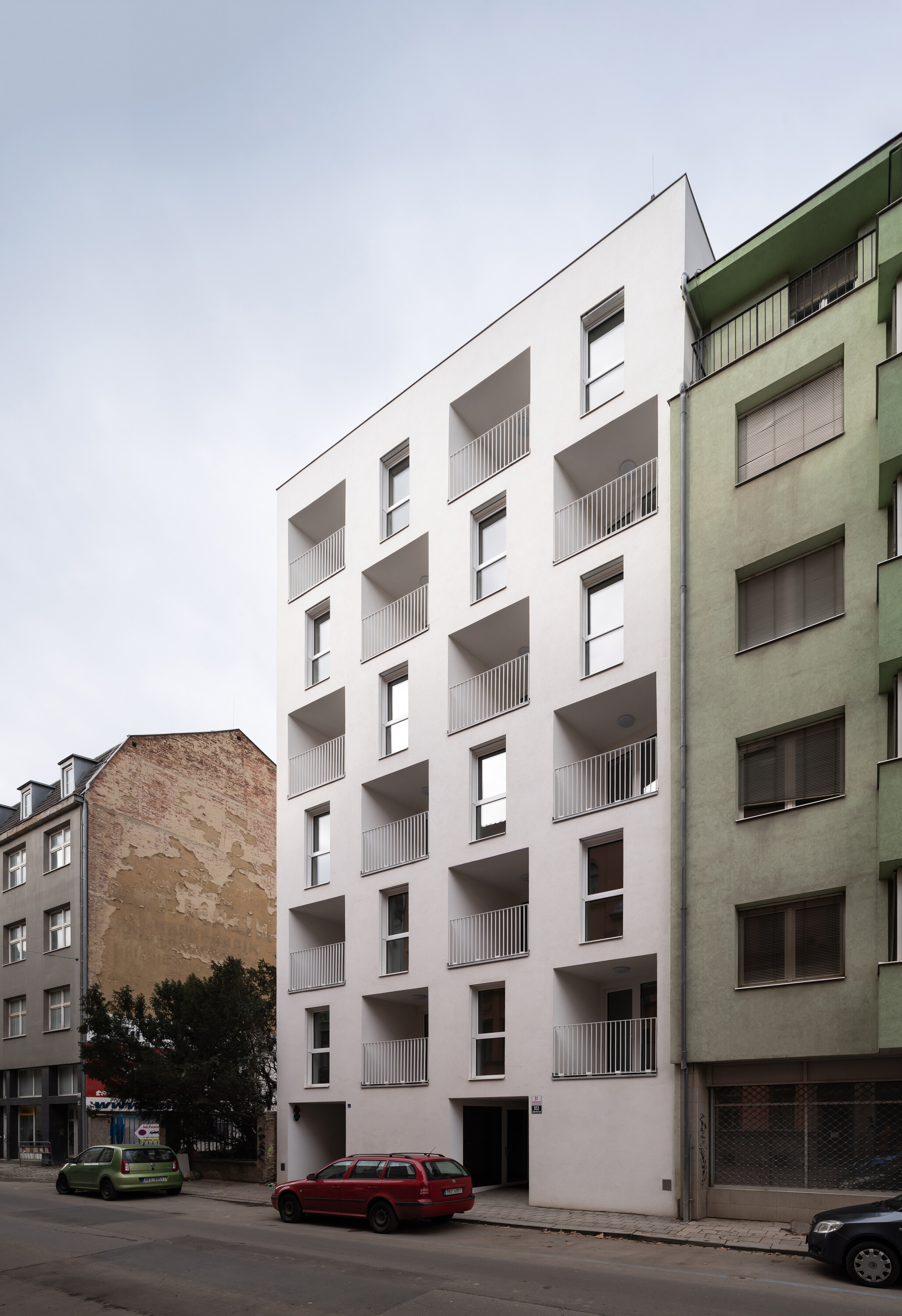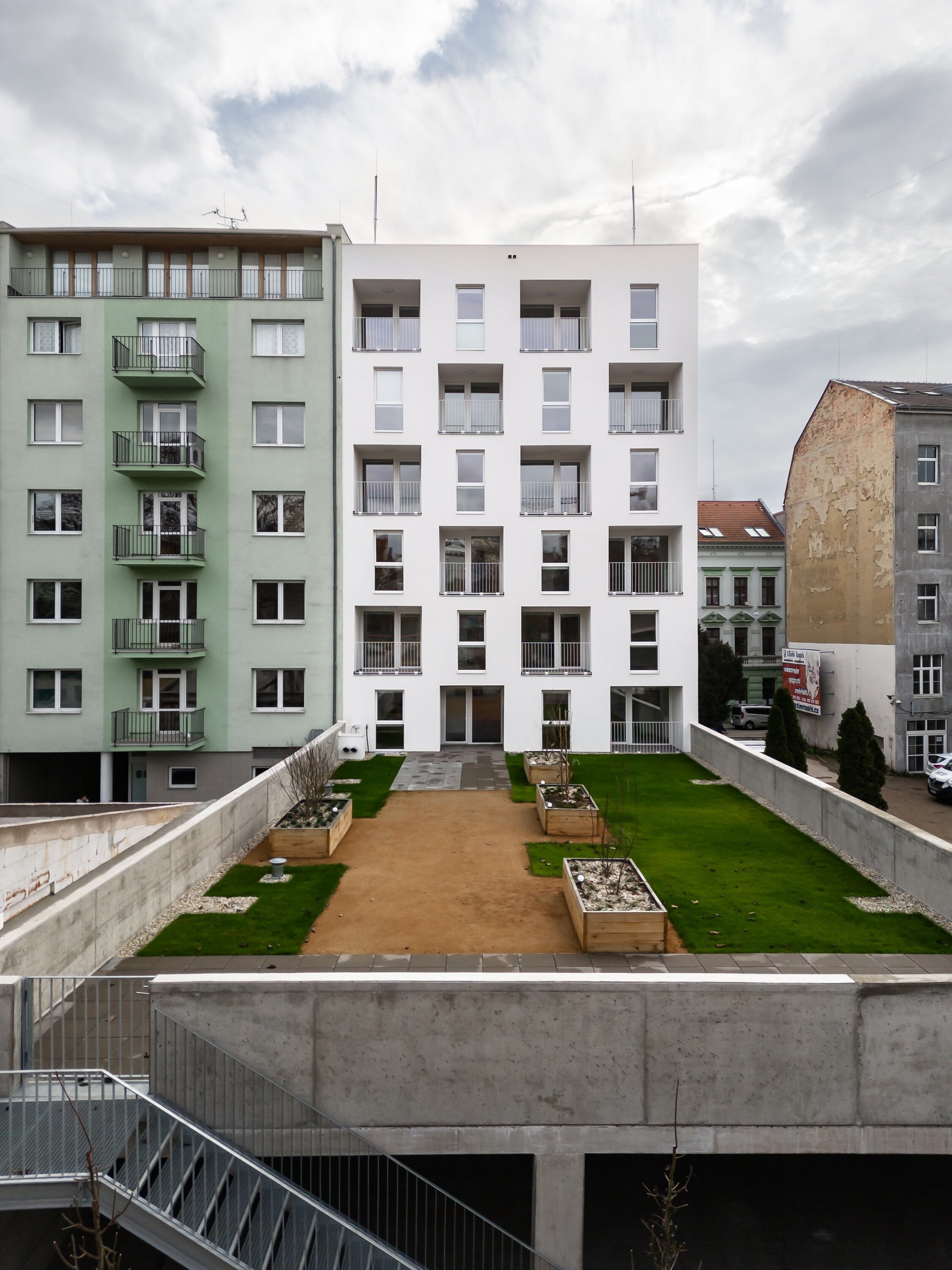 Stavbu tvorí sedempodlažný hranol, pretkaný pravidelným rastrom štvorcových otvorov. Striedajúce sa okná a lodžia prinášajú výraznú geometrickú plasticitu do inak čistej kubickej hmoty. Tú dopĺňa pobytová zelená terasa na streche garáží a átrium s ovocnými stromami.