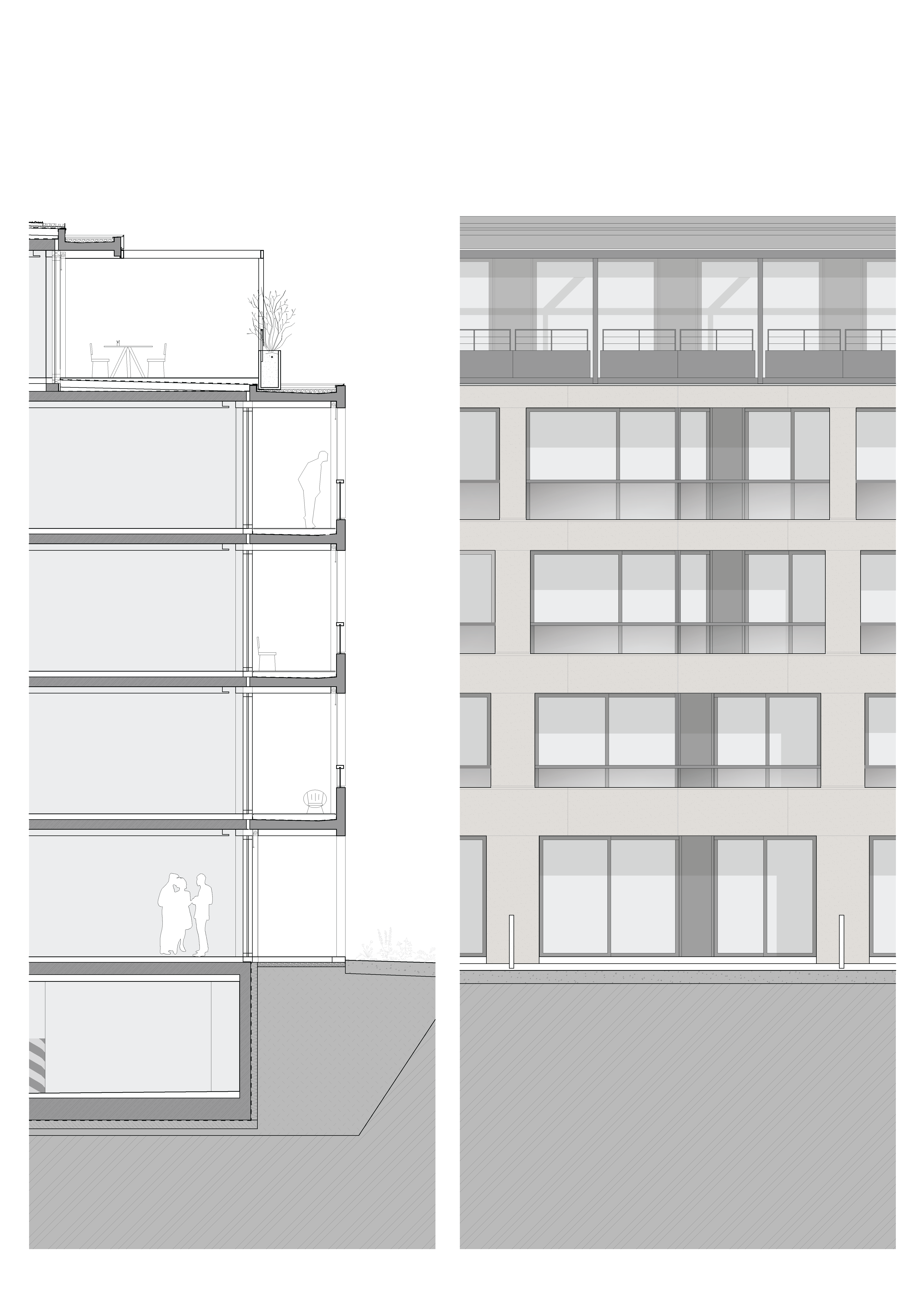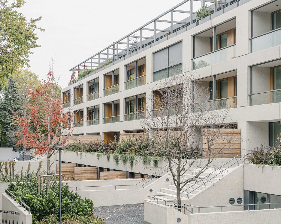 Dôležitou súčasťou konceptu je poctivá materialita stavby a práca architekta s proporciou a detailom. Betón na fasáde dopĺňajú hliníkové prvky a drevené povrchy, pričom dôležitý humanizujúci prvok tvorí zeleň na terasách a streche. Obytné priestory so svetlou výškou takmer tri metre sa prostredníctvom rozsiahleho presklenia a lodžií otvárajú do pokojného mestského prostredia.