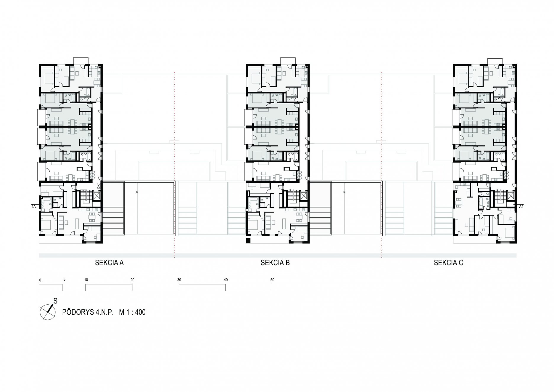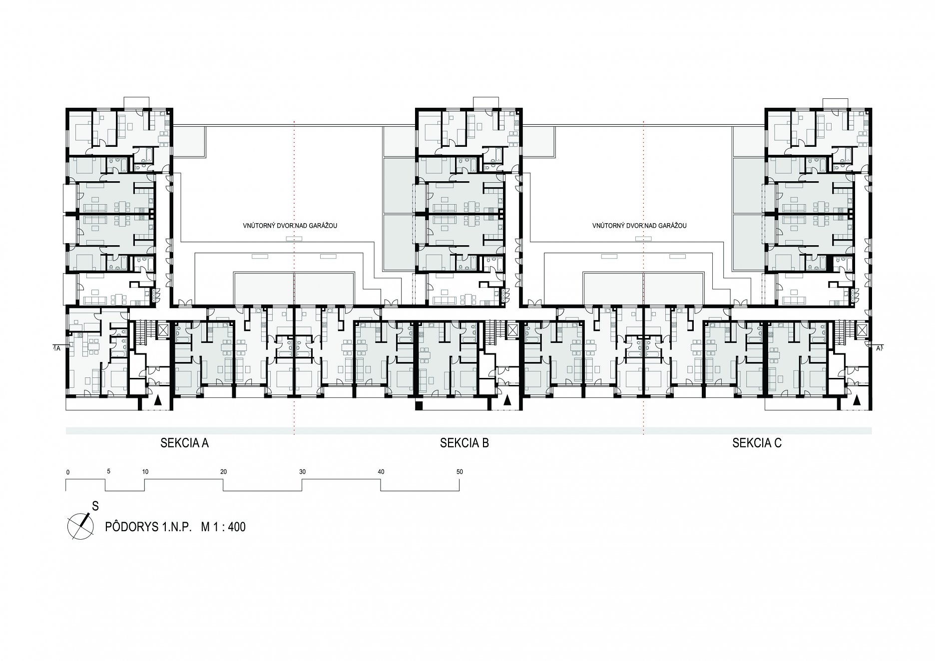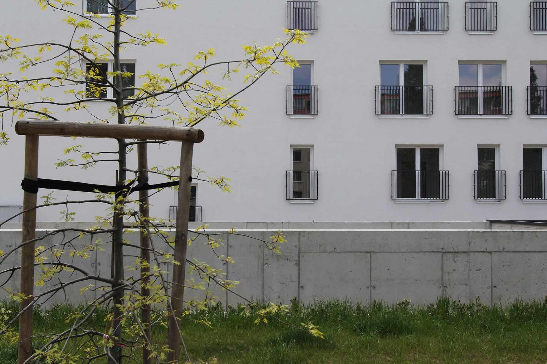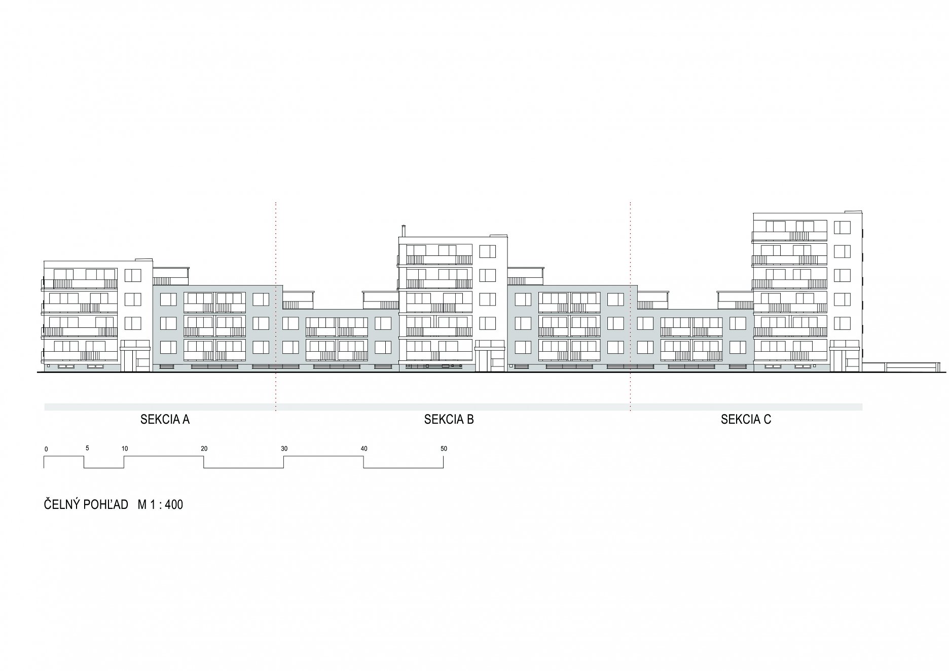 Bytový dom na rozhraní nízkopodlažnej zástavby rodinných domov a susediacich viacpodlažných obytných blokov. Členitá obytná štruktúra stúpajúca smerom k vyšším susedom zabezpečuje veľmi dobré preslnenie bytov, vnútorných dvorov a prístup na stupňovité strešné terasy. Investor sa v tomto prípade vzdal polyfunkčného partera. Zodvihnutím podzemného podlažia (garáže) sa byty na prvom poschodí dostali nad úroveň ulice. Zároveň vznikol priestor pre prevýšené vstupy, ktoré od ulice delí široký zelený pás.