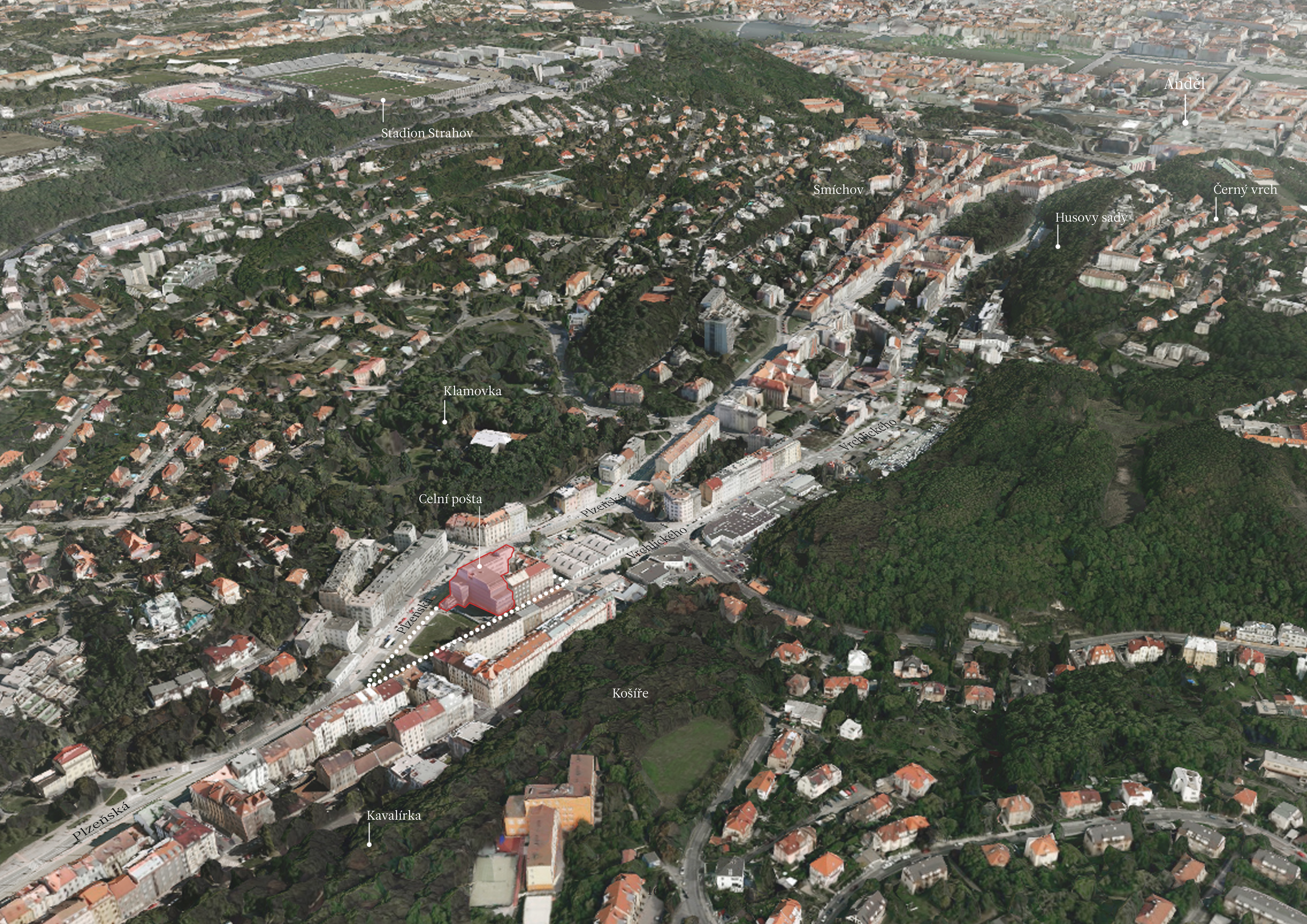 Zástavba mizí a znovu se objevuje mezi zelenými klíny pronikajícími hluboko do údolí. O to překvapující a silnější je moment, kdy se před námi mezi ulicemi Plzeňskou a Vrchlického otevře široký prostor lemovaný po obou stranách pěti a více podlažní zástavbou obytných budov s řešenou parcelou v centru. Čilý ruch ulice nás nenechá na pochybách. Pokud se do města v minulosti vstupovalo ze západu branou Újezdskou, můžeme s nadsázkou považovat tento prostor za bránu současnou. První dojem je důležitý a není náhodou, že Košířské údolí, přes své nesporné hodnoty a potenciál, platilo a stále platí za špatnou adresu. Změna je však pravděpodobná a výstavba nových rezidenčních objektů v okolí tomu nasvědčuje. Je možné tento vývoj ovlivnit?