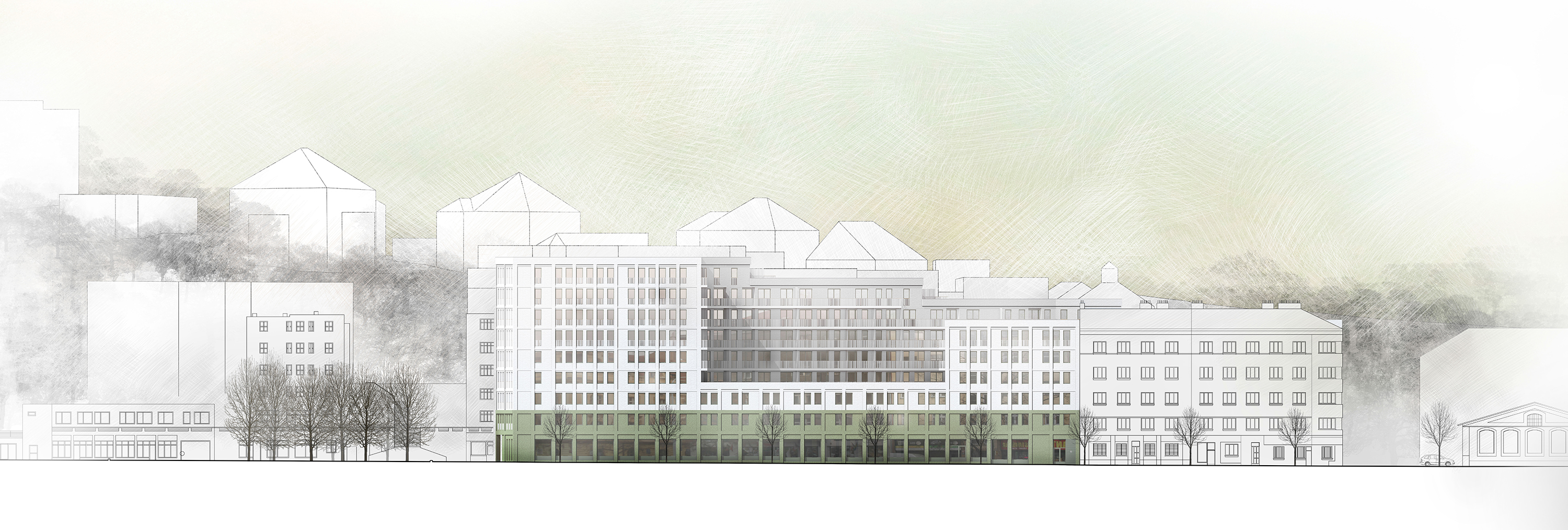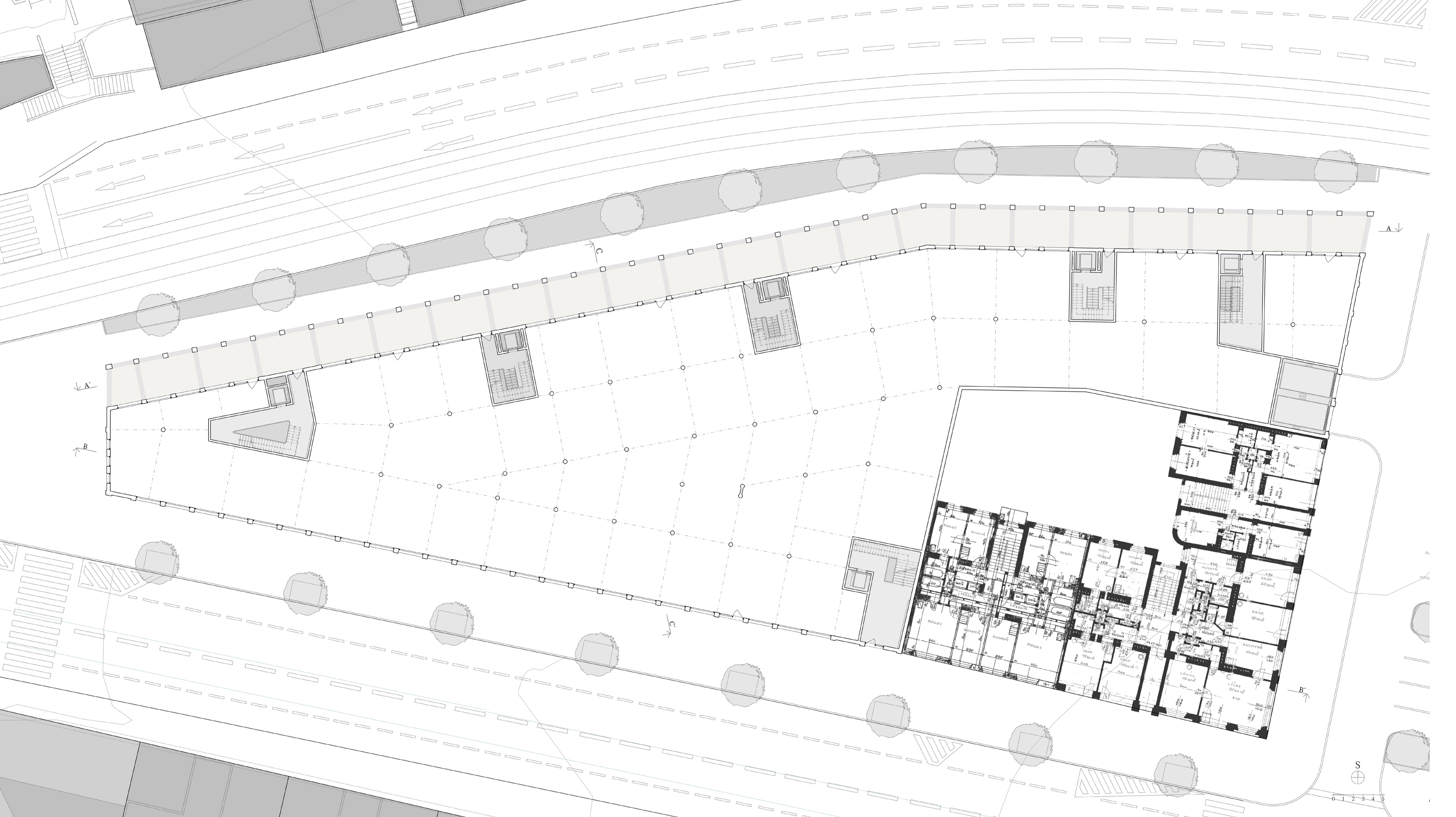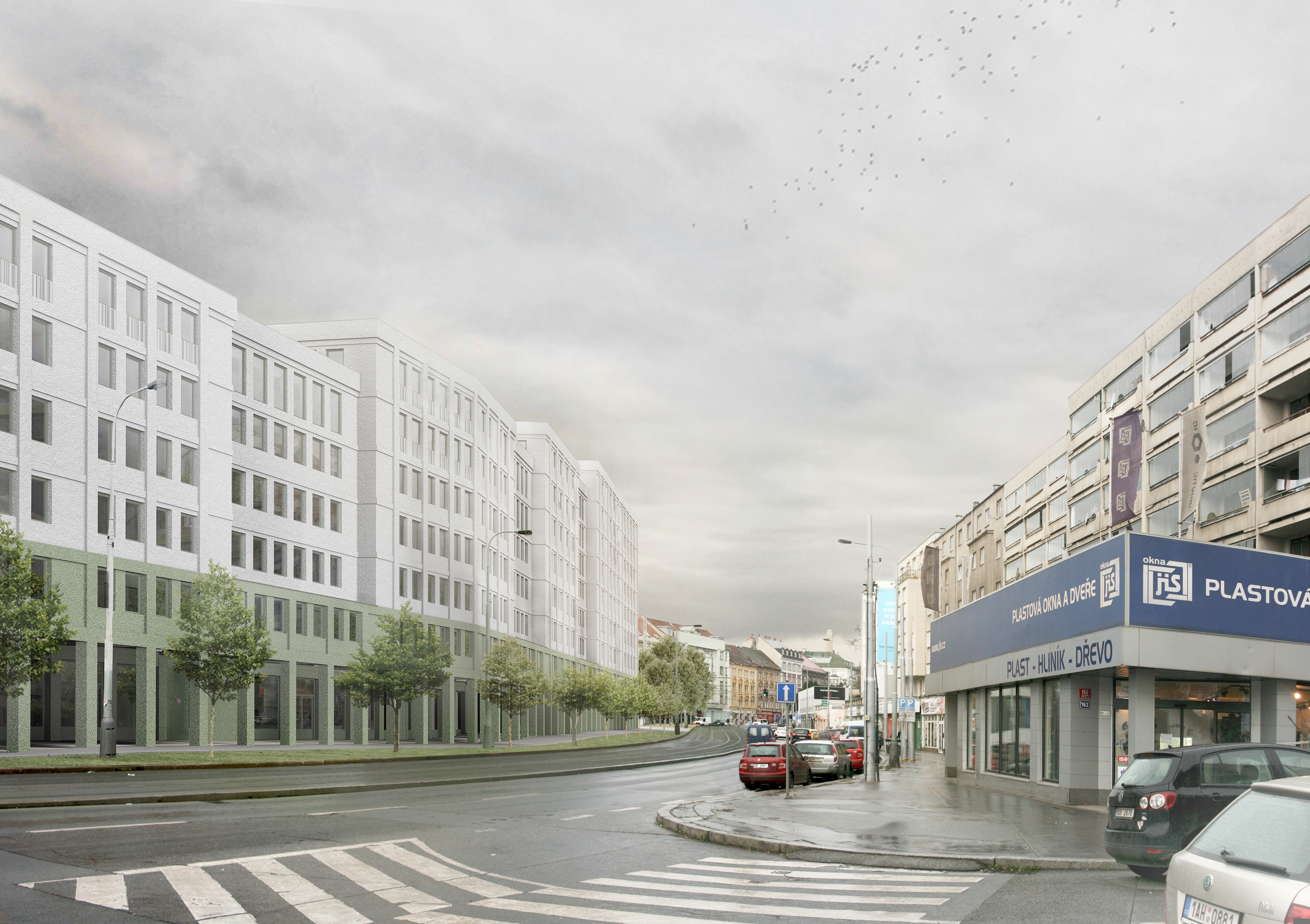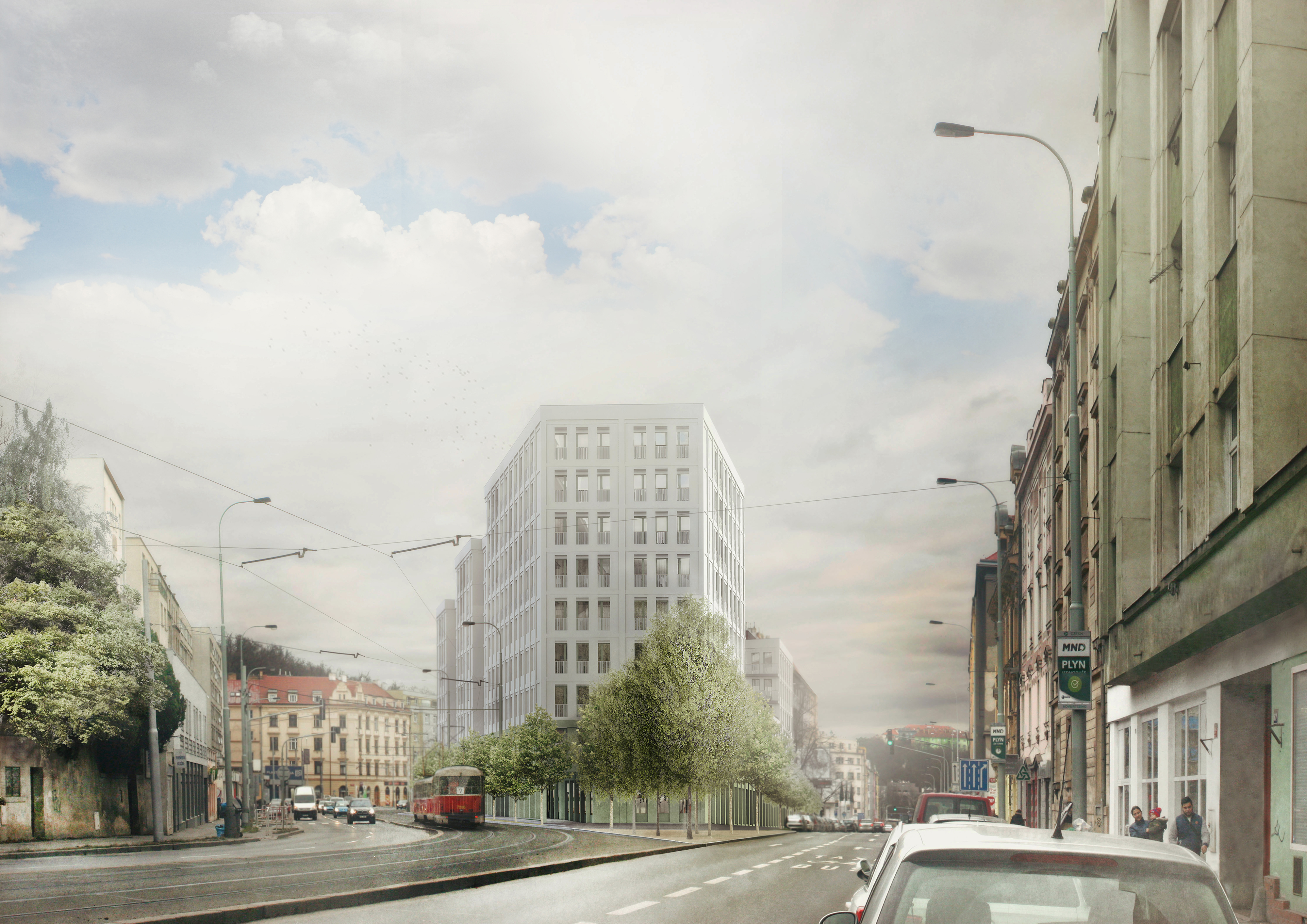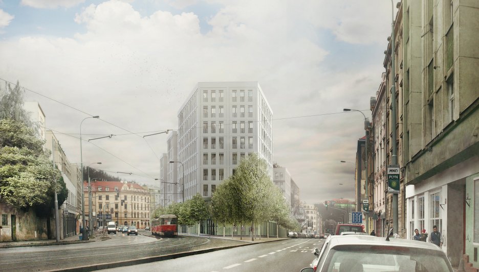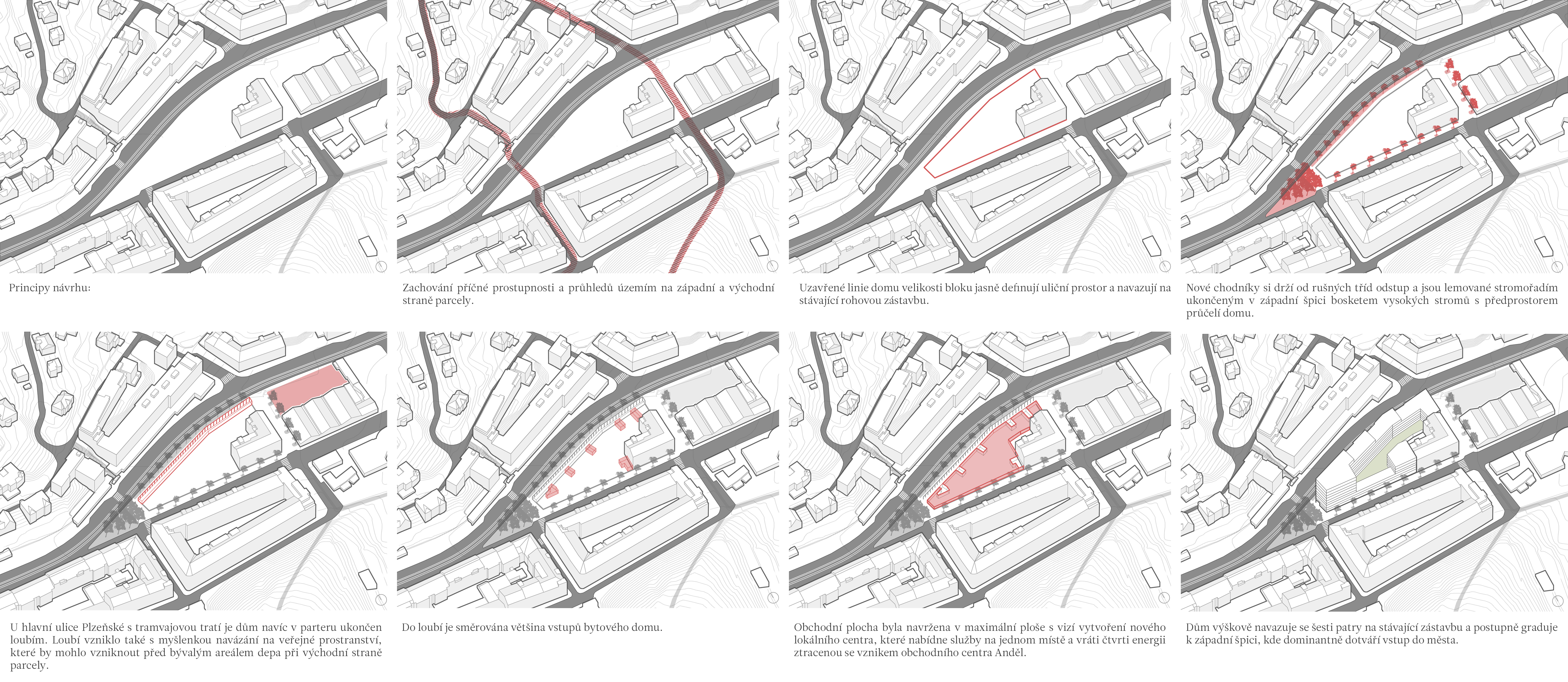 Uzavřené linie domu velikosti městského bloku jasně definují uliční prostor a navazují na stávající rohovou zástavbu tří činžovních domů. Nové ulice si drží od rušných tříd odstup a jsou lemované stromořadím zakončeným ve špici bosketem vysokých stromů. U hlavní ulice Plzeňské je navíc dům v parteru ukončen loubím, ze kterého vstupujeme do obchodů a bytového domu. Návrh loubí vznikl také s myšlenkou navázání na veřejné prostranství, které by mohlo vzniknout před bývalým areálem depa při východní straně parcely. Výškově objekt navazuje se šesti patry na současné domy a postupně graduje k západní špičce, kde dominantně dotváří vstup do města. Při jižní straně se blok částečně snižuje na výšku tří pater při zachování jasné definovanosti ulice a pouští do vnitrobloku slunce. Tématem bylo rovněž vytvoření vnitřního prostoru bloku na velmi exponované parcele.)
