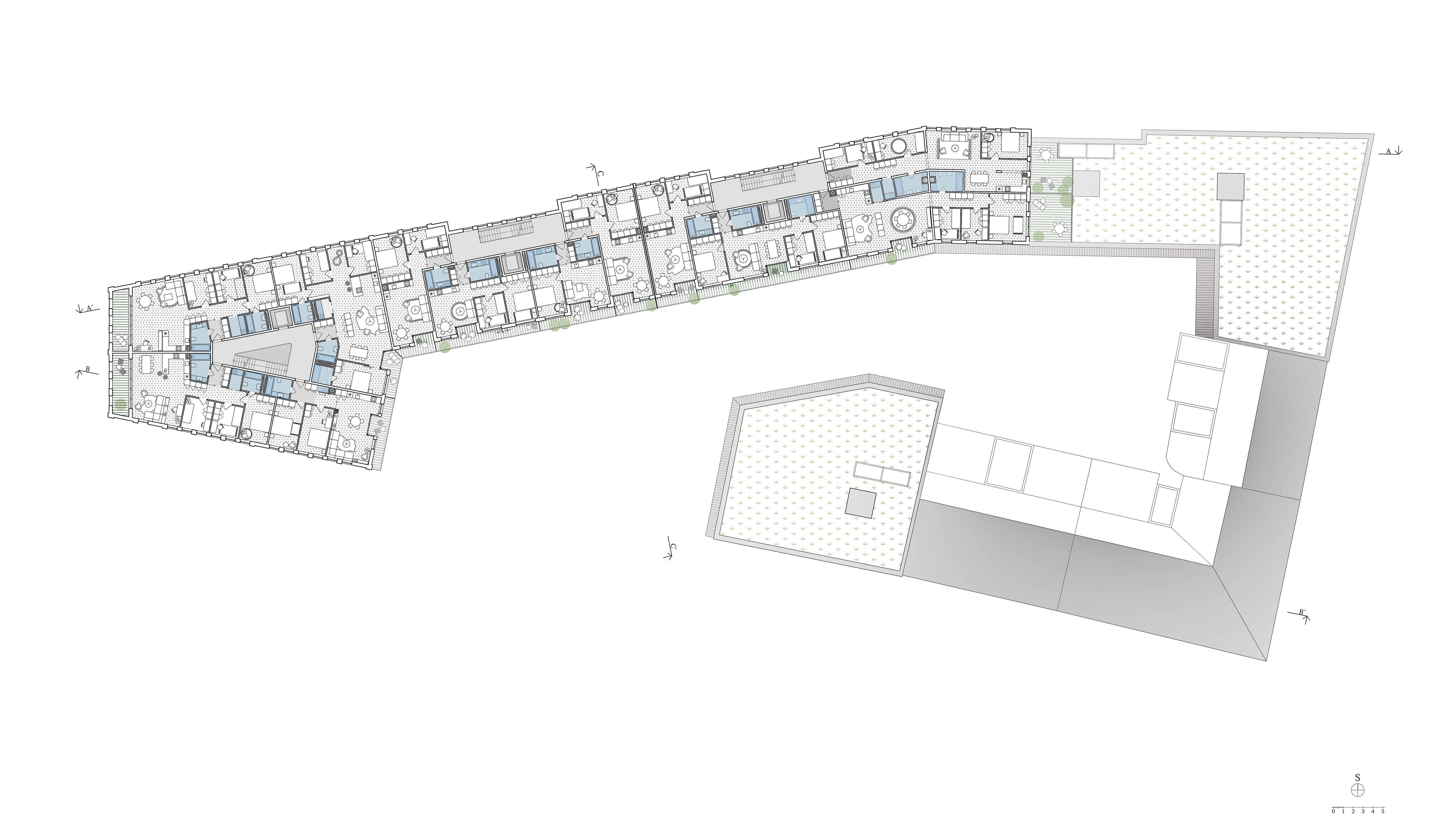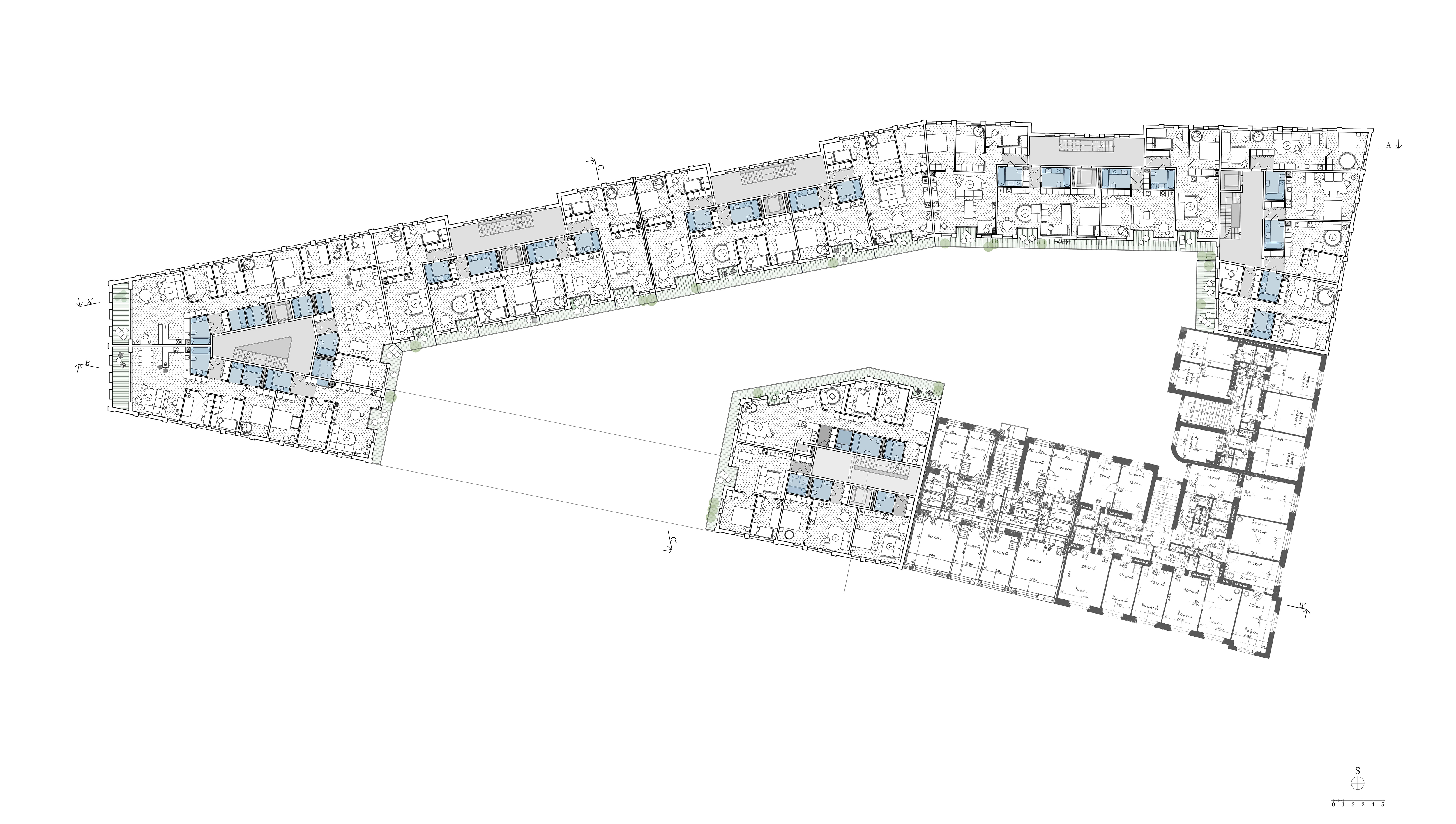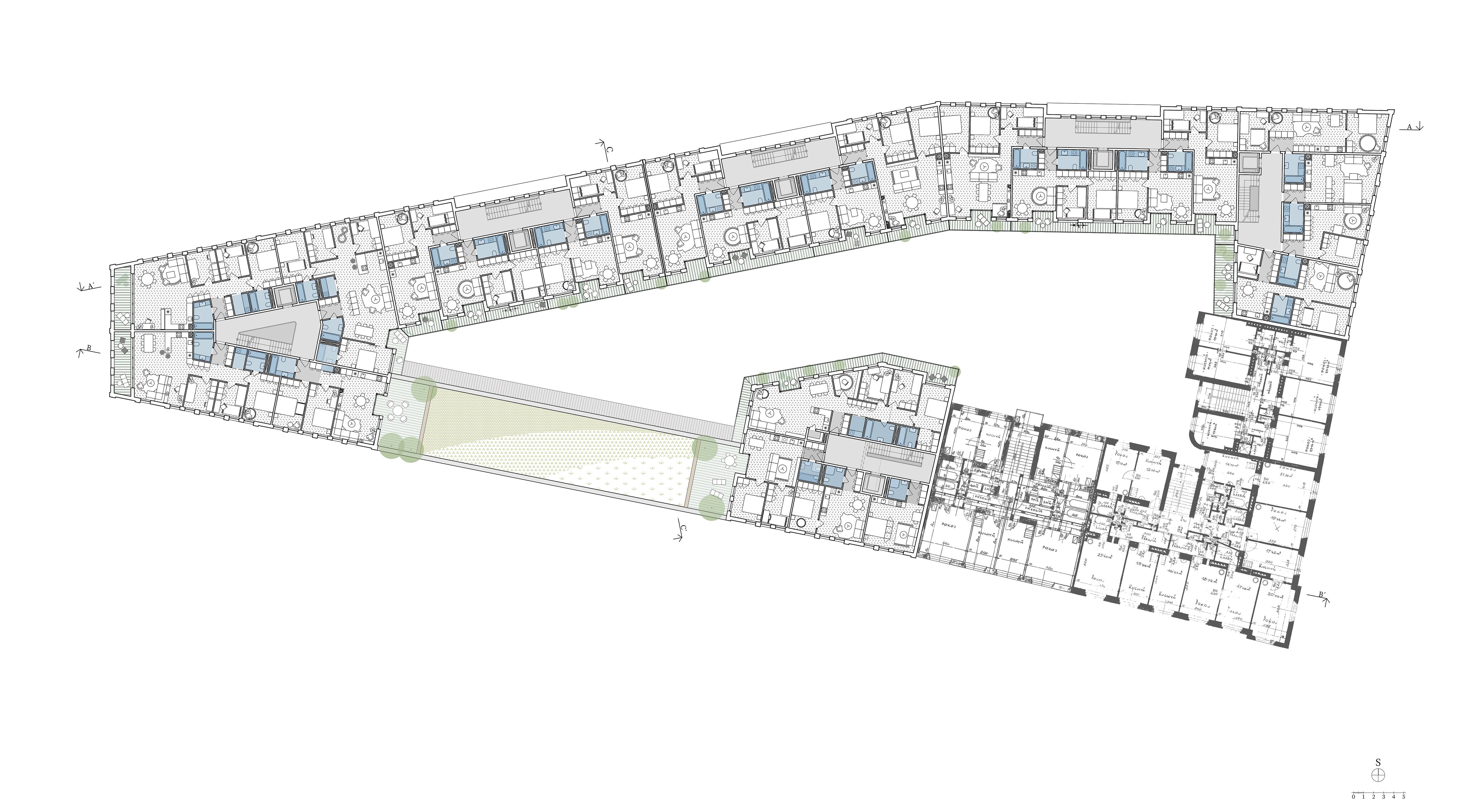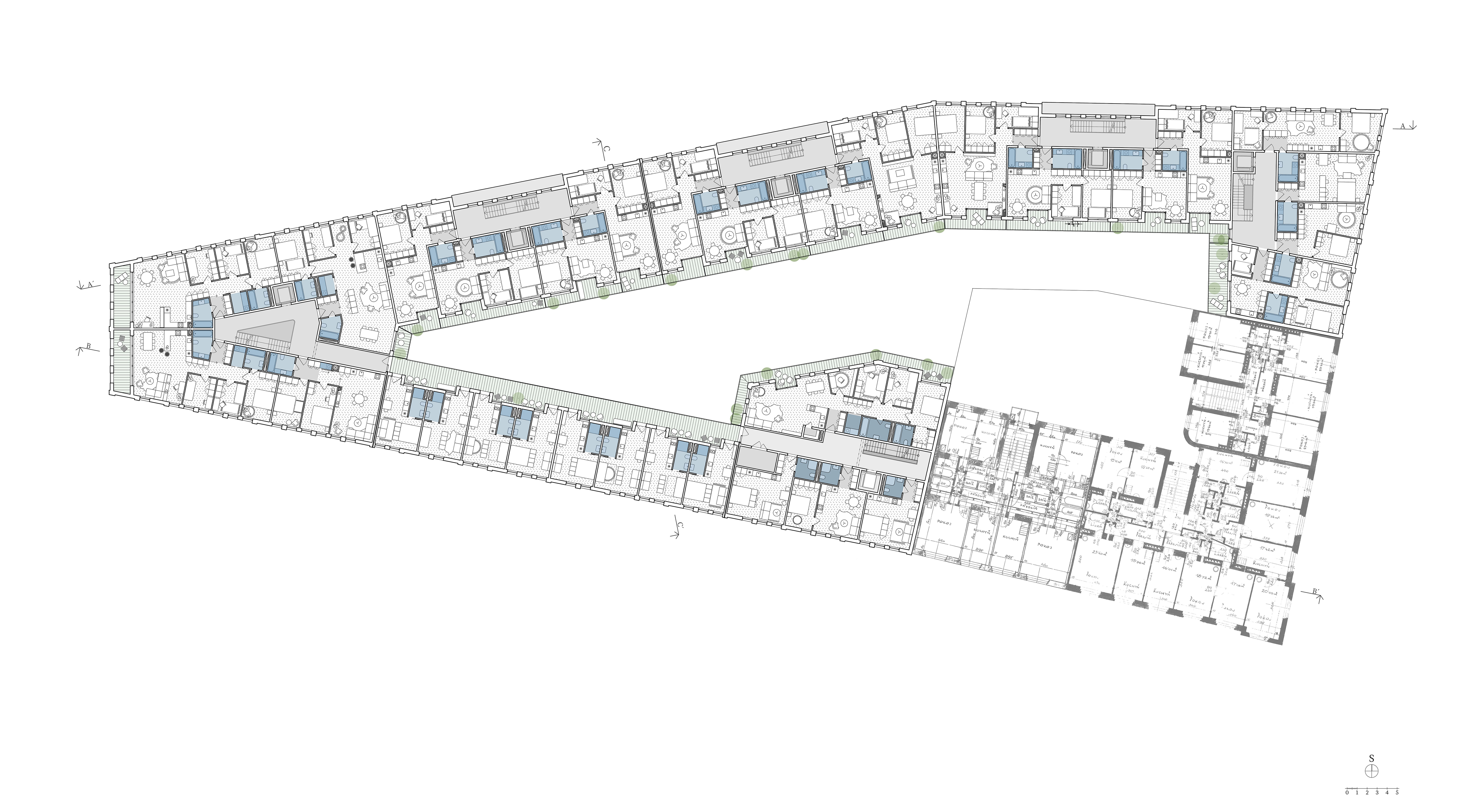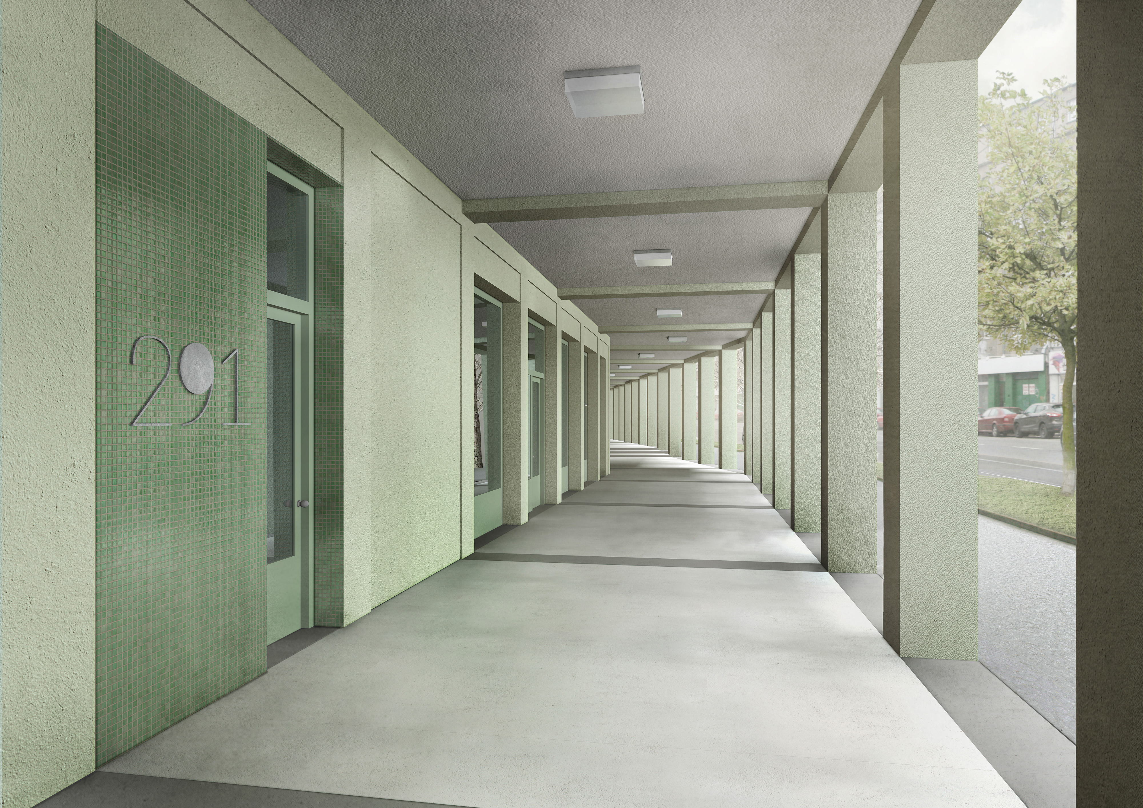 Uzavřené linie domu velikosti městského bloku jasně definují uliční prostor a navazují na stávající rohovou zástavbu tří činžovních domů. Nové ulice si drží od rušných tříd odstup a jsou lemované stromořadím zakončeným ve špici bosketem vysokých stromů. U hlavní ulice Plzeňské je navíc dům v parteru ukončen loubím, ze kterého vstupujeme do obchodů a bytového domu. Návrh loubí vznikl také s myšlenkou navázání na veřejné prostranství, které by mohlo vzniknout před bývalým areálem depa při východní straně parcely. Výškově objekt navazuje se šesti patry na současné domy a postupně graduje k západní špičce, kde dominantně dotváří vstup do města. Při jižní straně se blok částečně snižuje na výšku tří pater při zachování jasné definovanosti ulice a pouští do vnitrobloku slunce. Tématem bylo rovněž vytvoření vnitřního prostoru bloku na velmi exponované parcele.)