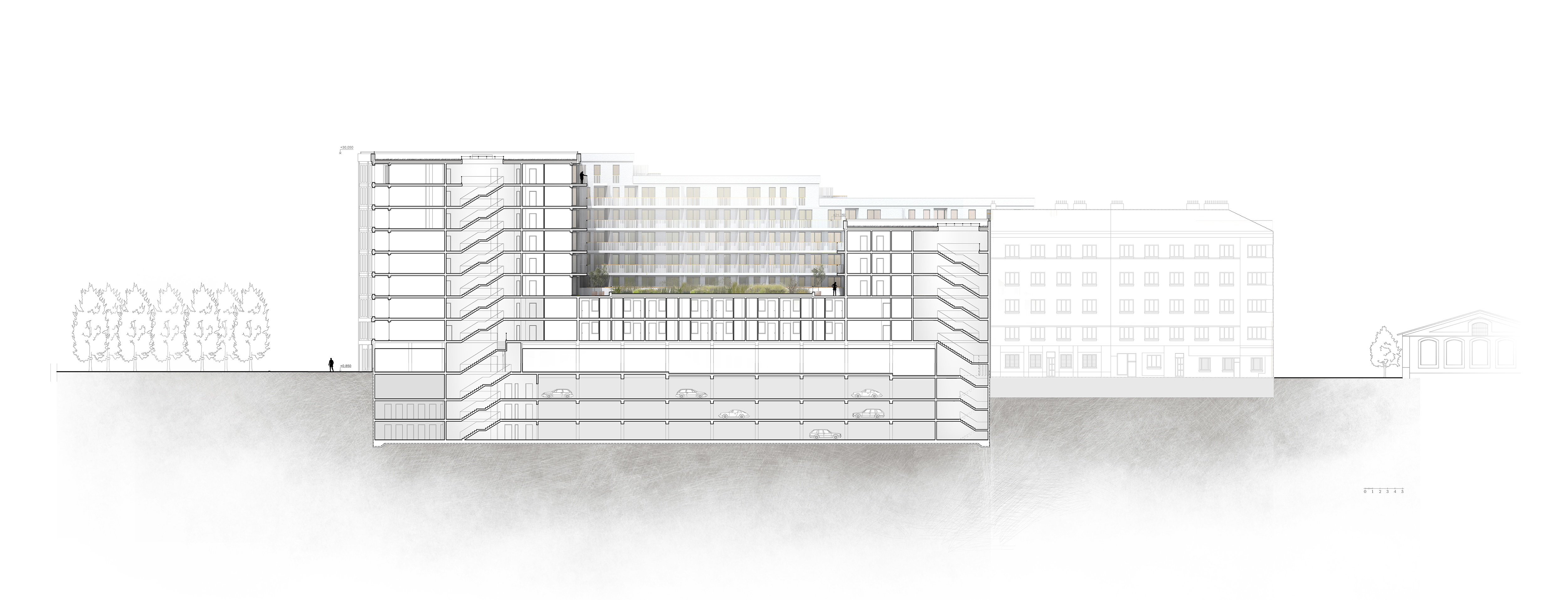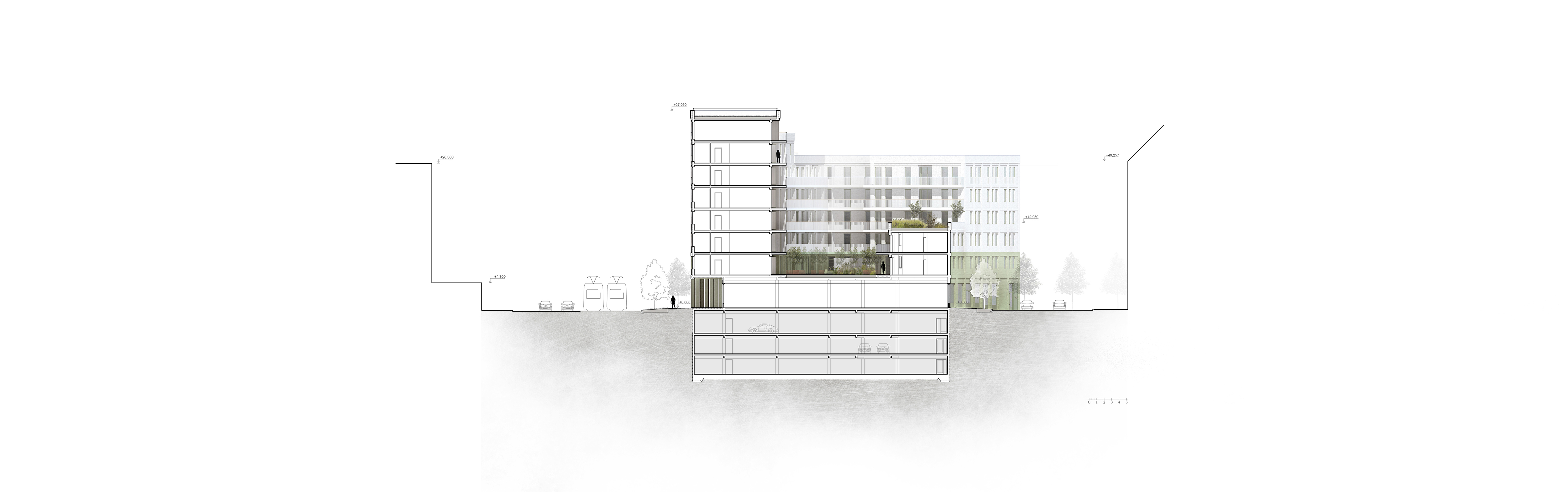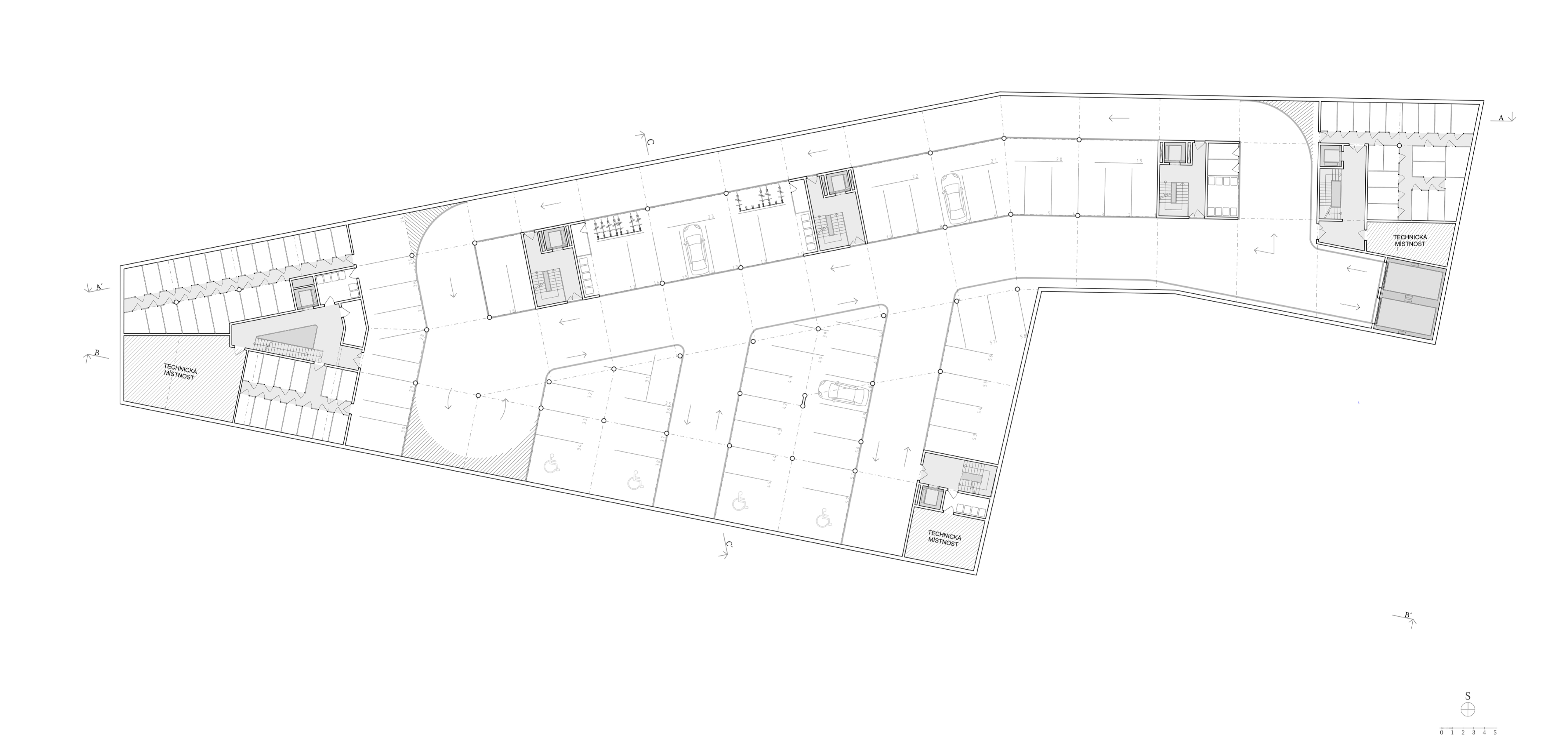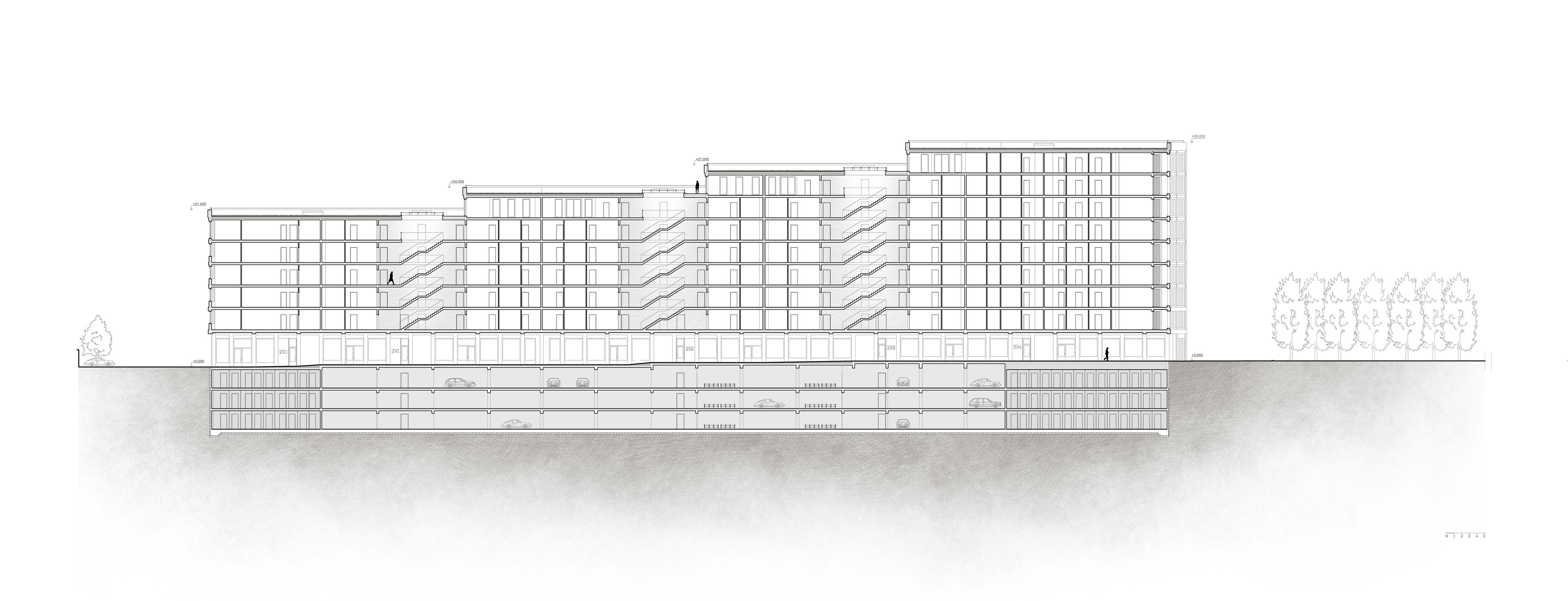 Parkování pro rezidenty je zajištěno v hromadných podzemních garáží přístupných z východní strany budovy.