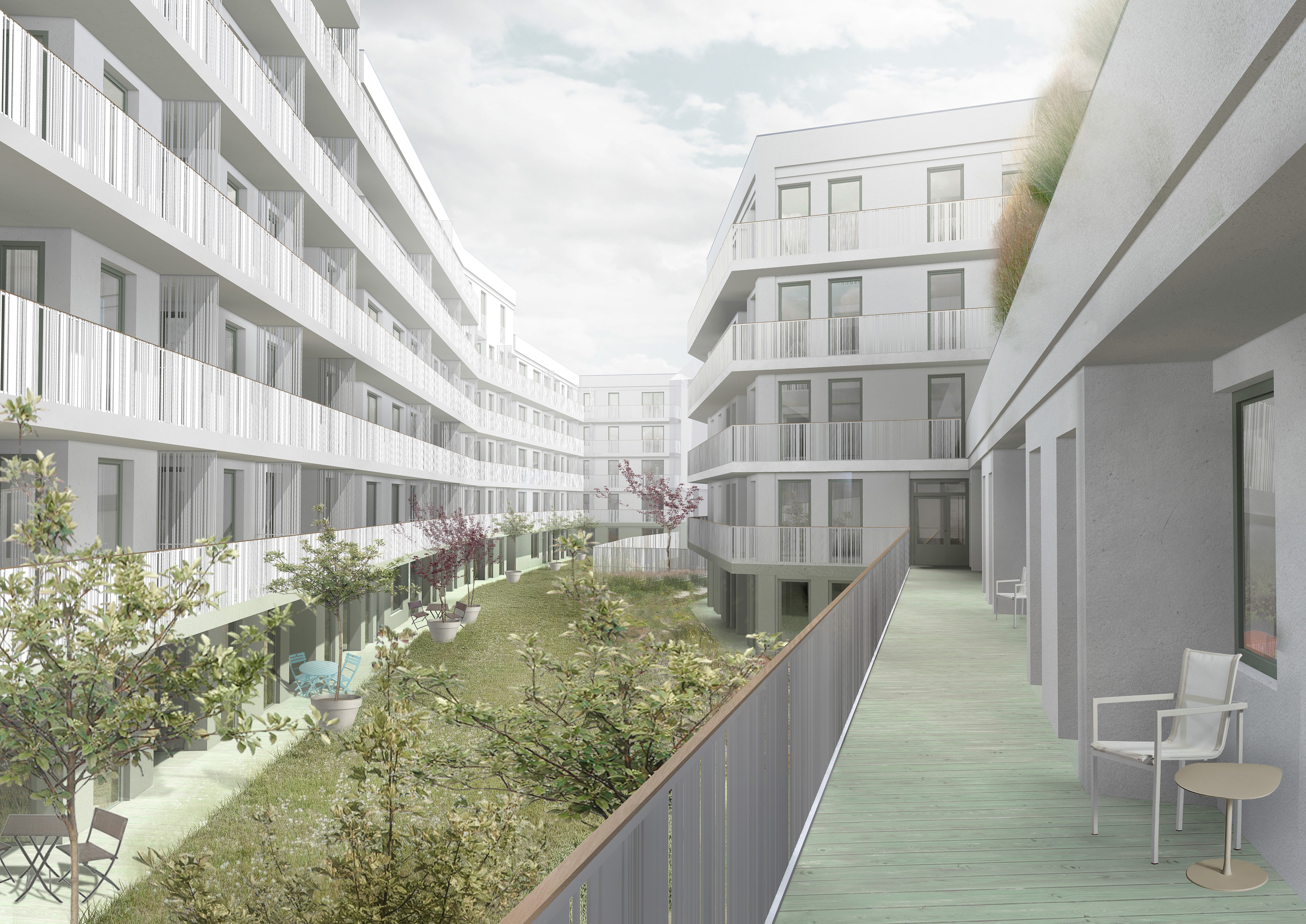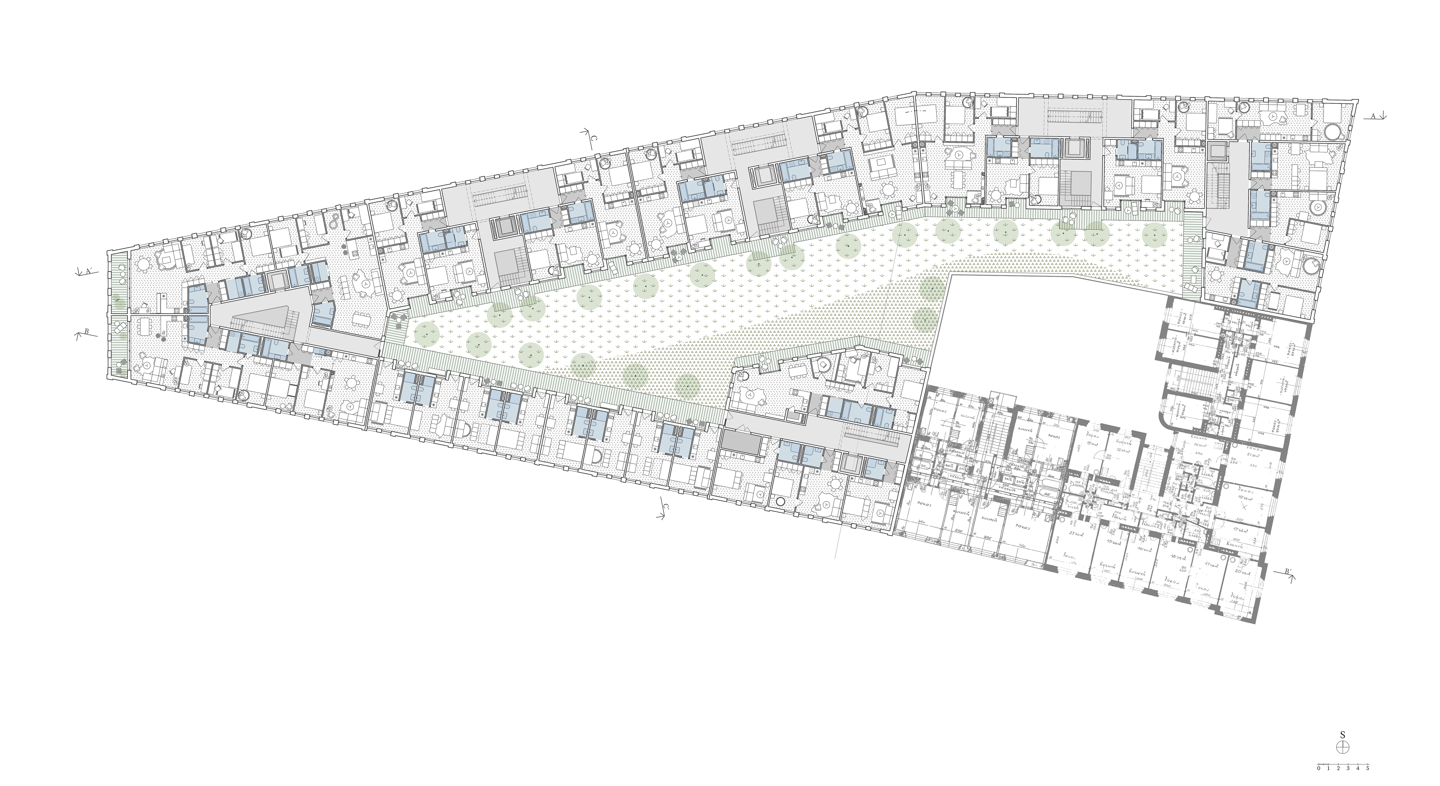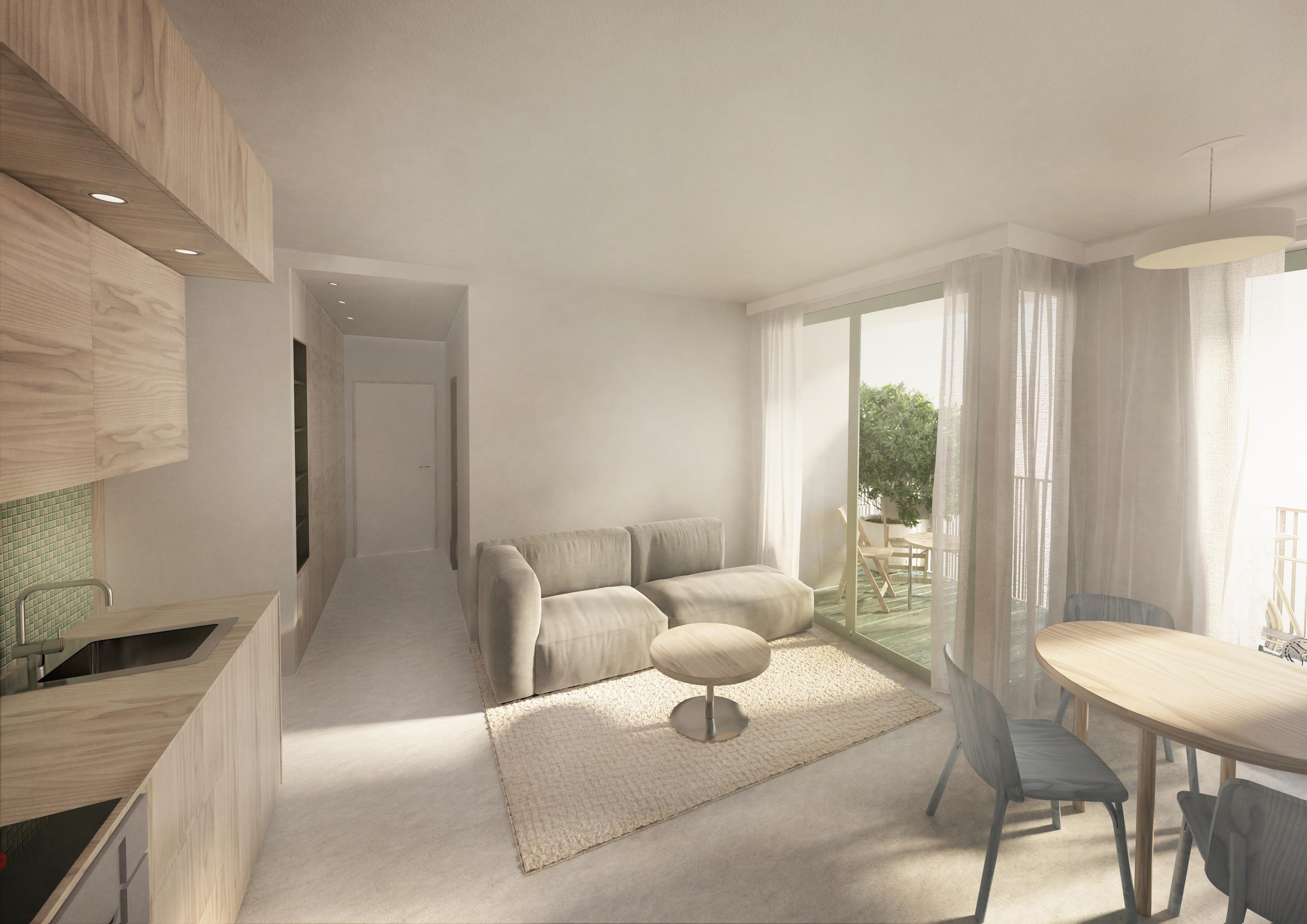 Využití přízemí ke komerčním účelům posouvá první obytné patro na úroveň 2.NP a zmírňuje negativní projev dopravy. Přesto je s každým dalším podlažím jasná zvyšující se obytná kvalita. Návrh domu od počátku doprovázely úvahy o dostupném/sociálním bydlení. Po vzoru zahraniční praxe je projekt zamýšlen jako model běžného nájemního/vlastnického bydlení kombinovaný v části domu (2., 3. NP) s byty nižšího standardu, které by mohly v případě potřeby sloužit k sociálním účelům. Úspornost je společným znakem všech bytů. Nižší standard se projevuje menší otevřeností prostoru vnitrobloku, omezenými výhledy a zvýšenou hlukovou zátěží oproti bytům vyšších pater, nikoliv v dispozičních rozdílech. Celkově se v domě nachází 161 bytů. Z toho největší počet představují byty o dvou ložnicích. Počty dalších typů bytů jsou poměrně vyrovnané až na minimální počet jednotek se 4 ložnicemi.