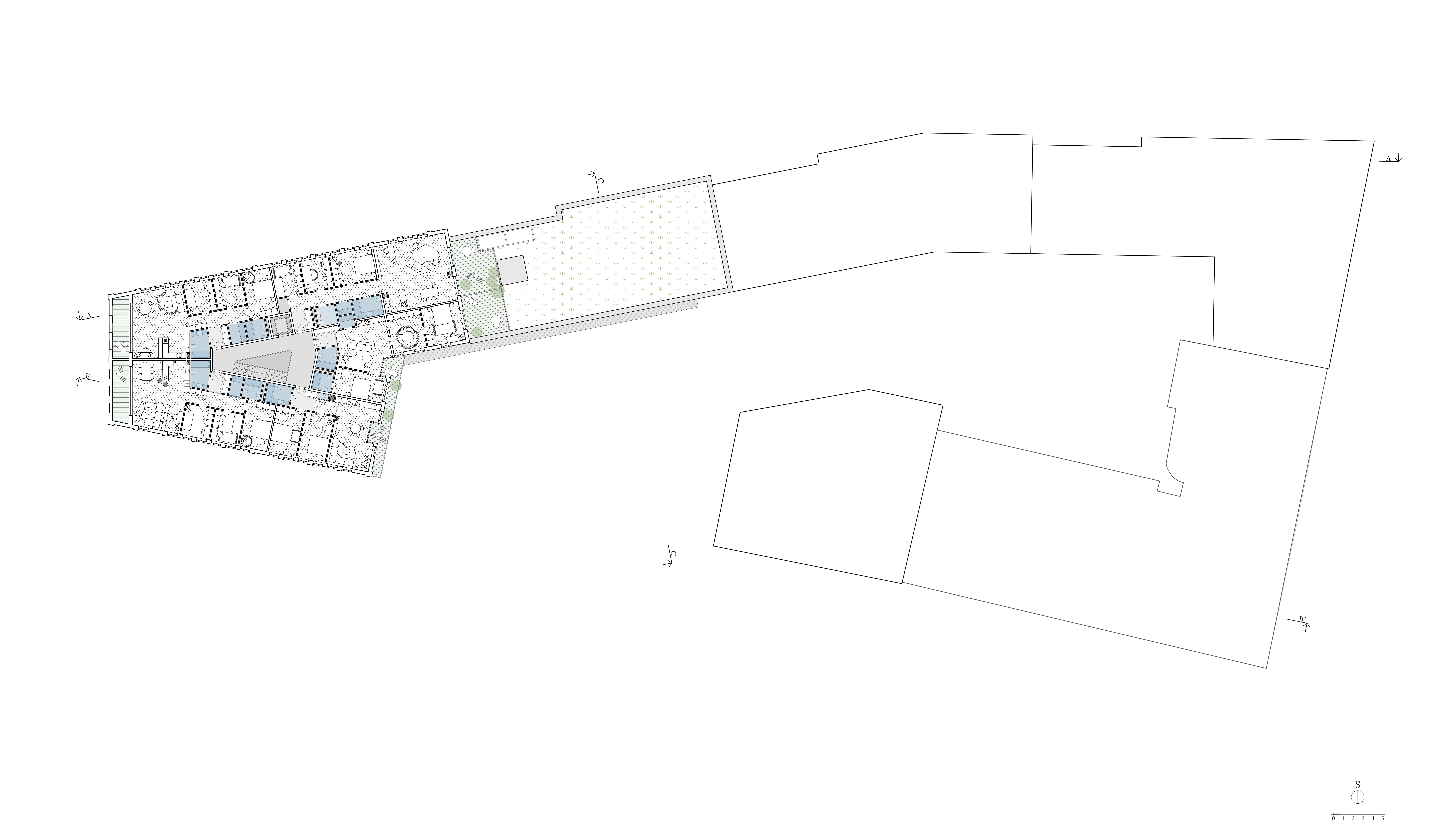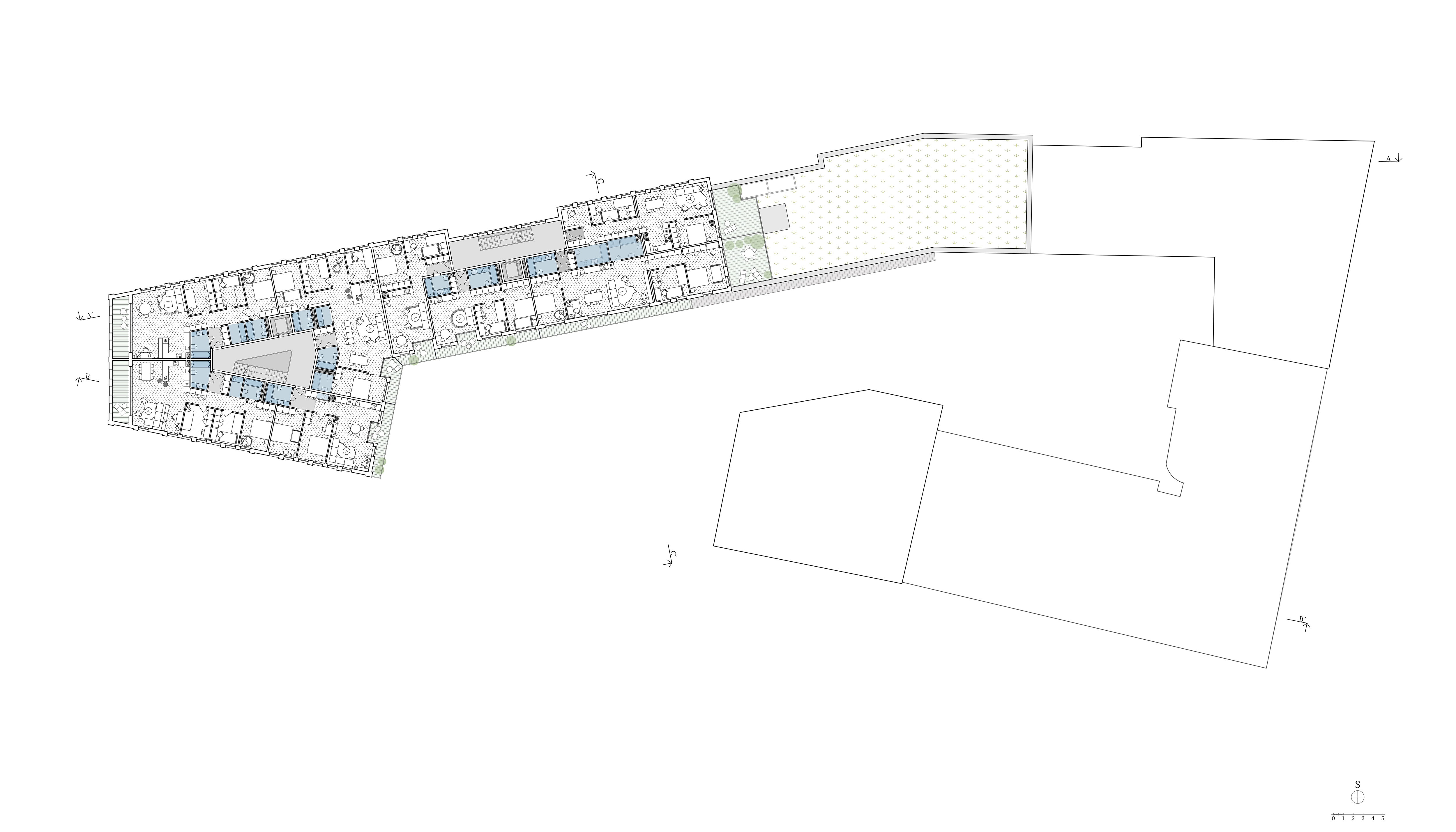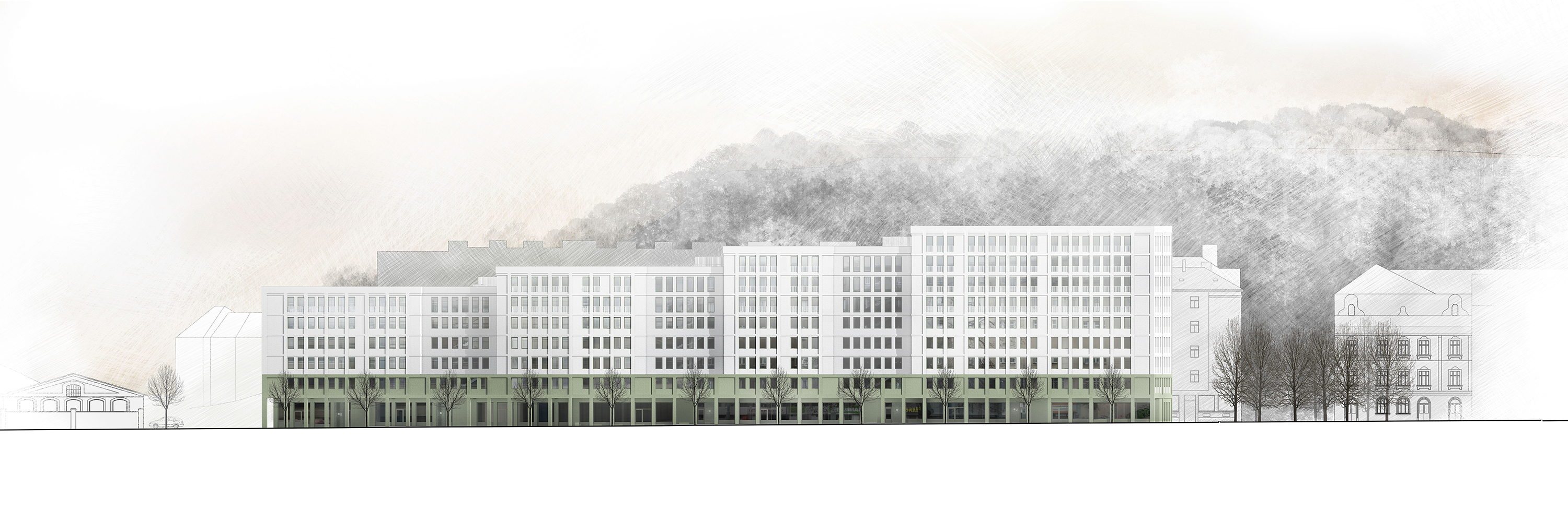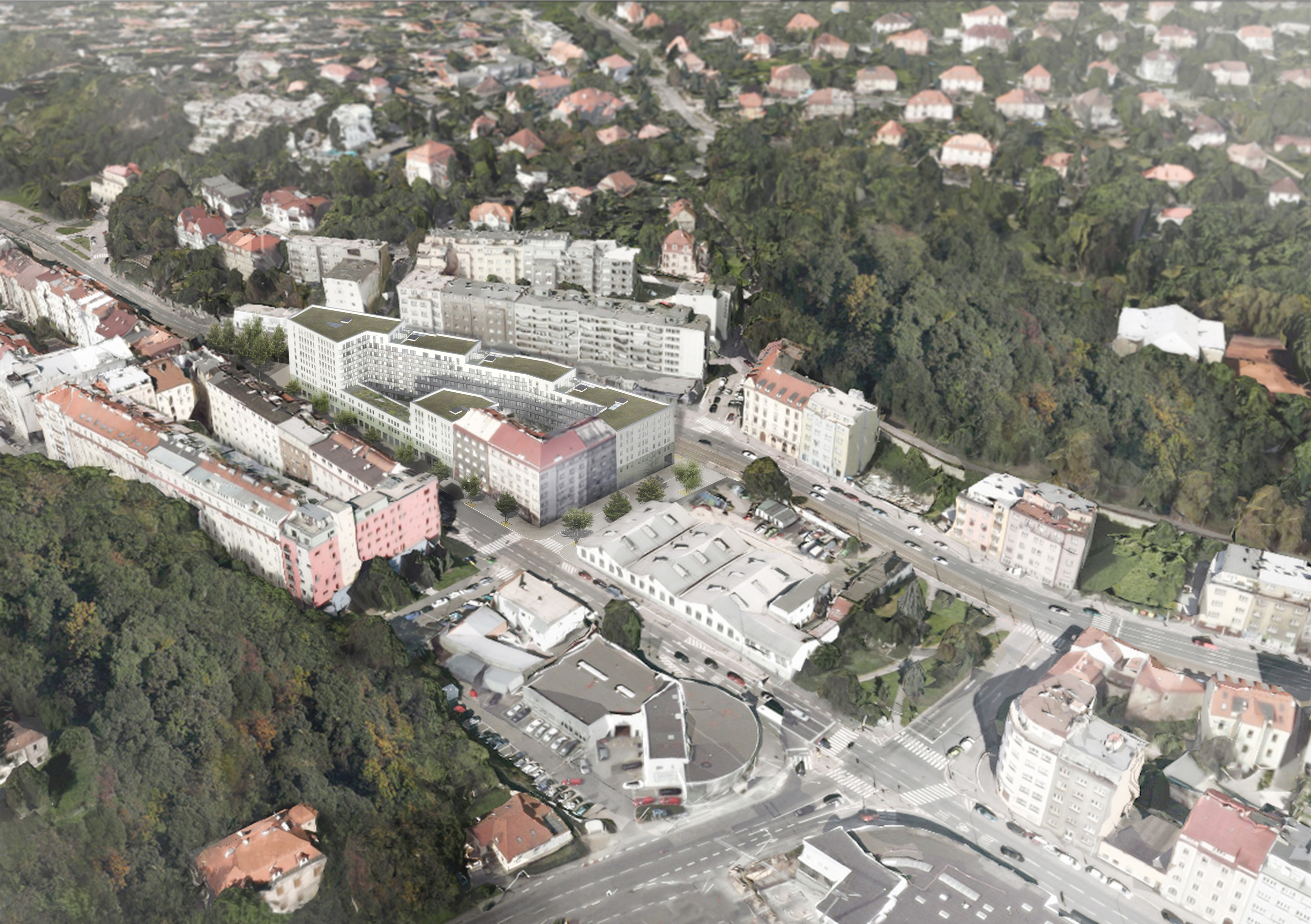 Uzavřené linie domu velikosti městského bloku jasně definují uliční prostor a navazují na stávající rohovou zástavbu tří činžovních domů. Významnou podmínkou návrhu bylo zachování příčné pěší cesty a průhledů na svahy údolí na západní a východní straně parcely. Nové ulice si drží od rušných tříd odstup a jsou lemované stromořadím zakončeným ve špici bosketem vysokých stromů. U hlavní ulice Plzeňské je navíc dům v parteru ukončen loubím, ze kterého vstupujeme do obchodů a bytového domu.