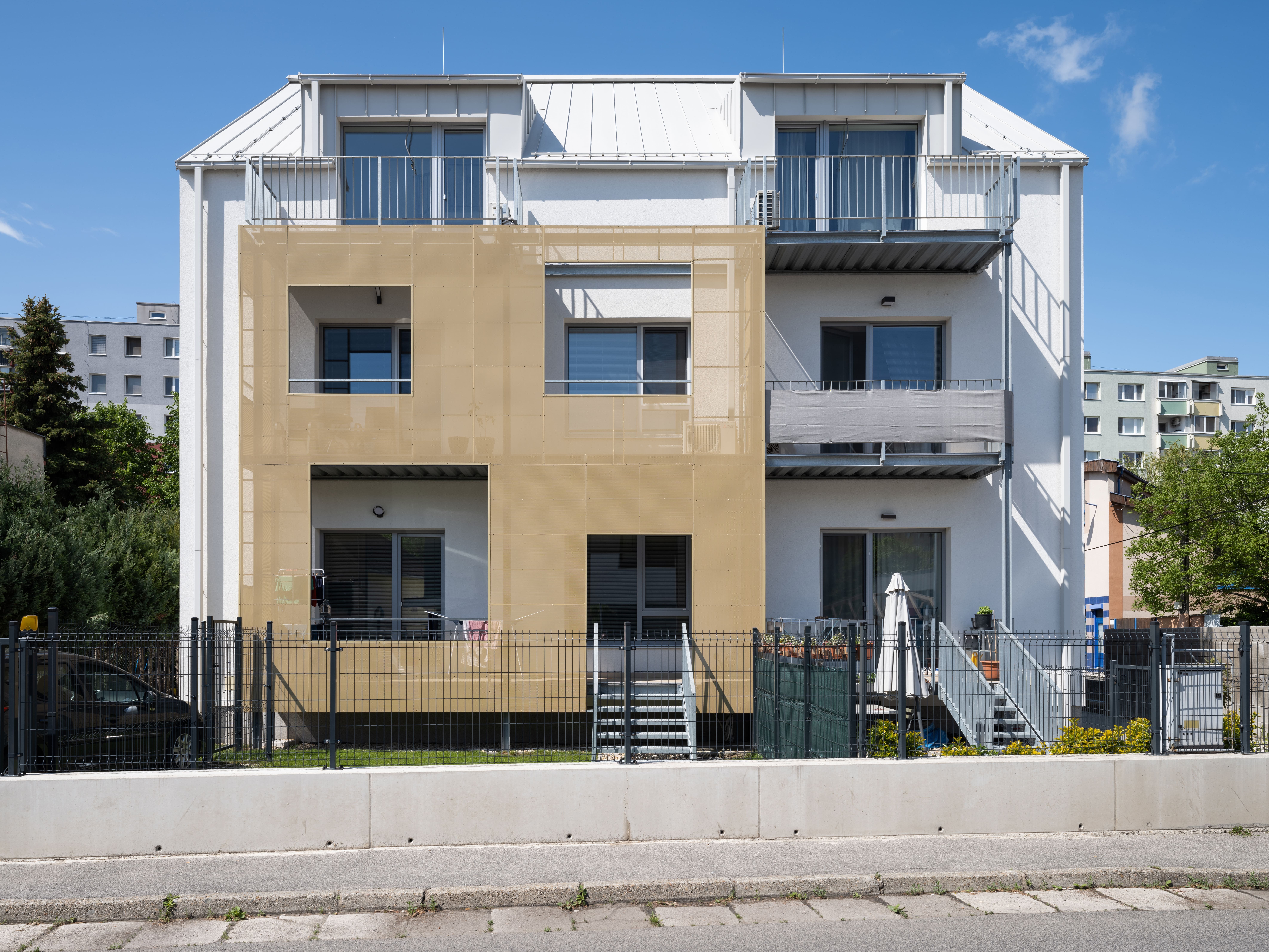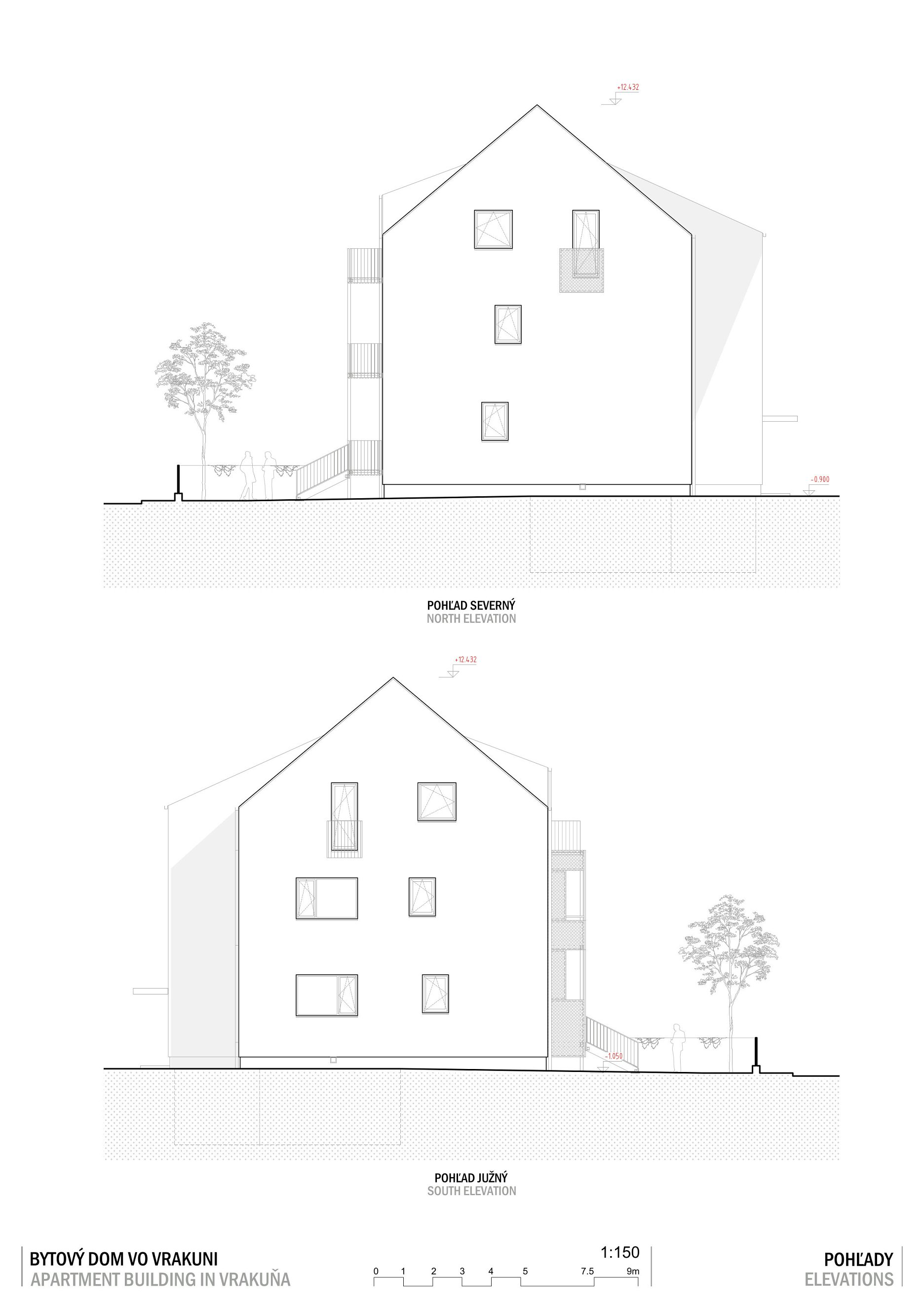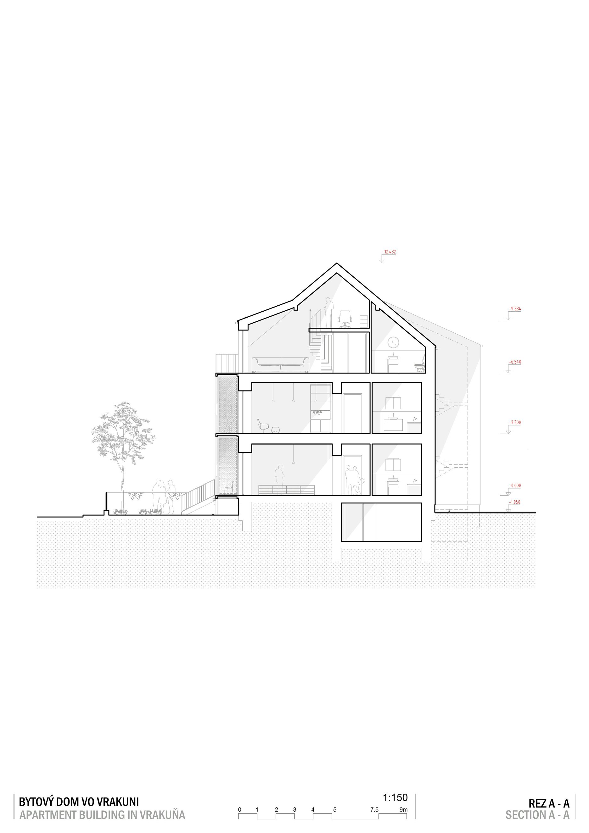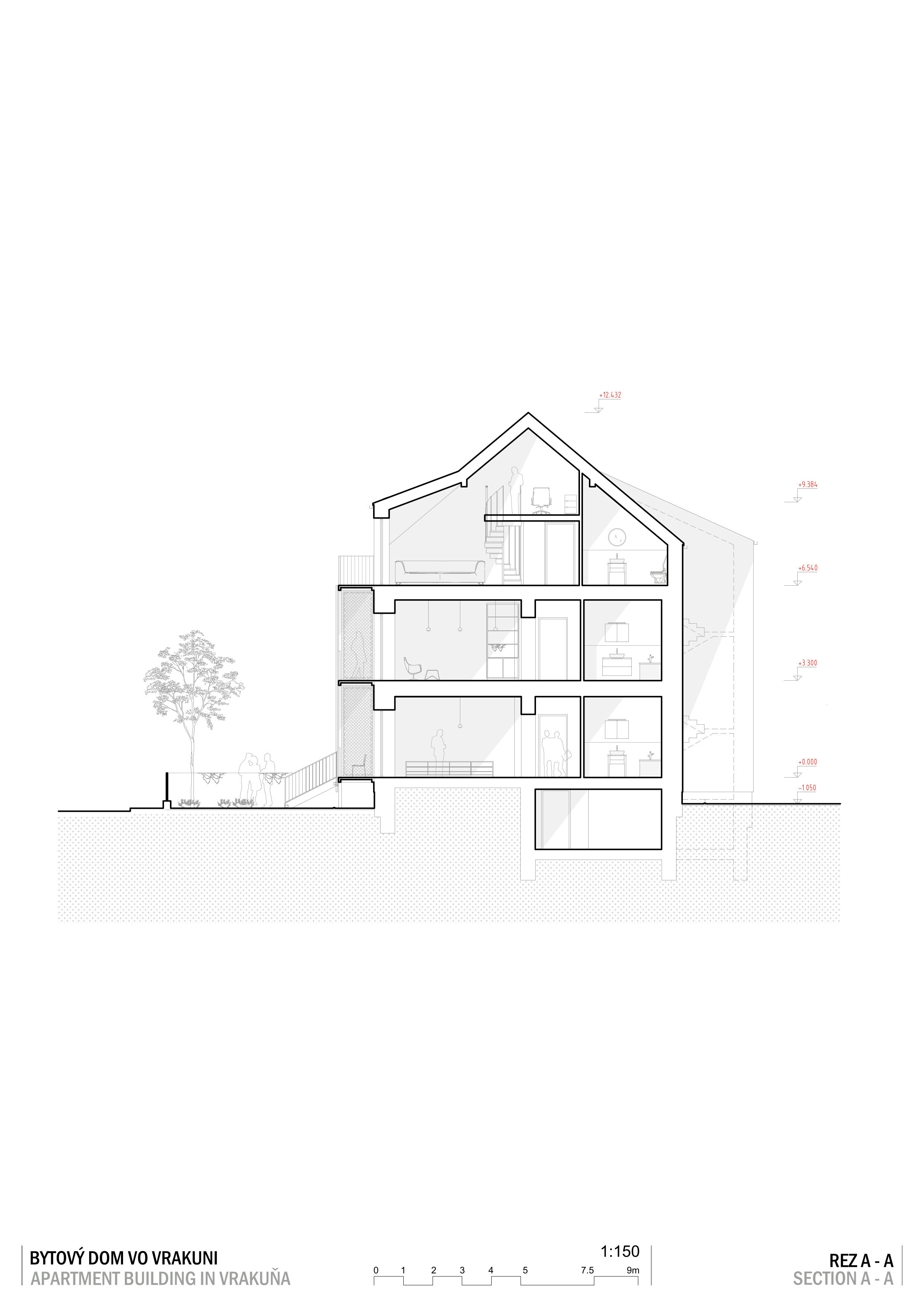 Vrakuňa je predmestie Bratislavy charakterizované kontrastom pôvodnej vidieckej uličnej zástavby a novšej mestskej sídliskovej výstavby. Objekt bytového domu je situovaný v nárožnej polohe na križovatke ulíc na rozhraní týchto dvoch typov zástavby a je kombináciou týchto kontrastov na viacerých úrovniach. Formálne aj programovo stelesňuje jeho hraničnú polohu jednak kombináciou zachovanej sedlovej strechy a doplnením predsadených balkónov, ako aj rozšírením o dva nové podkrovné byty. Práca s kontrastmi je viditeľná aj v interiéri, predovšetkým zachovanými pôvodnými detailmi schodiska či dlažby a zároveň jasnou artikuláciou novodoplnených prvkov.