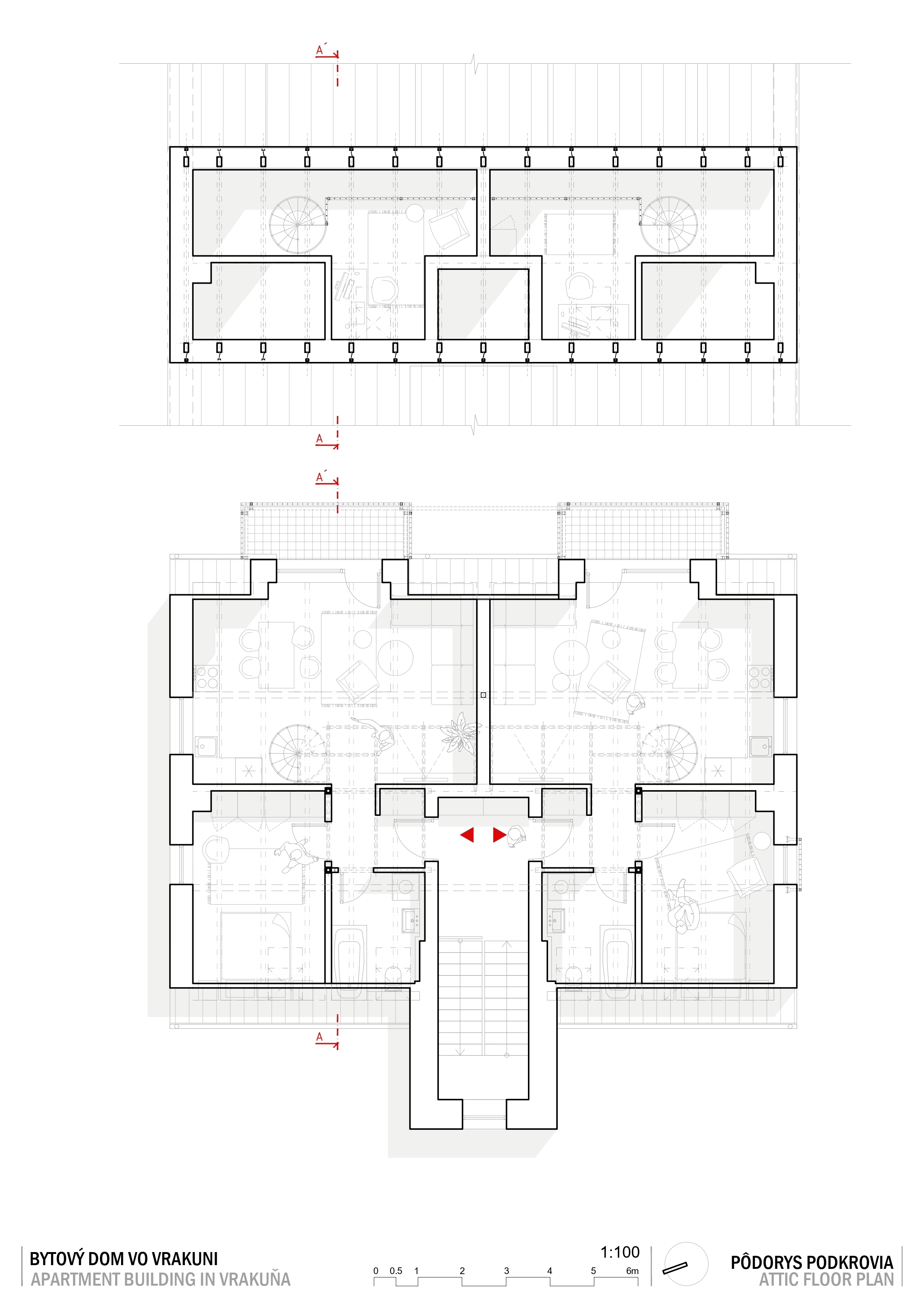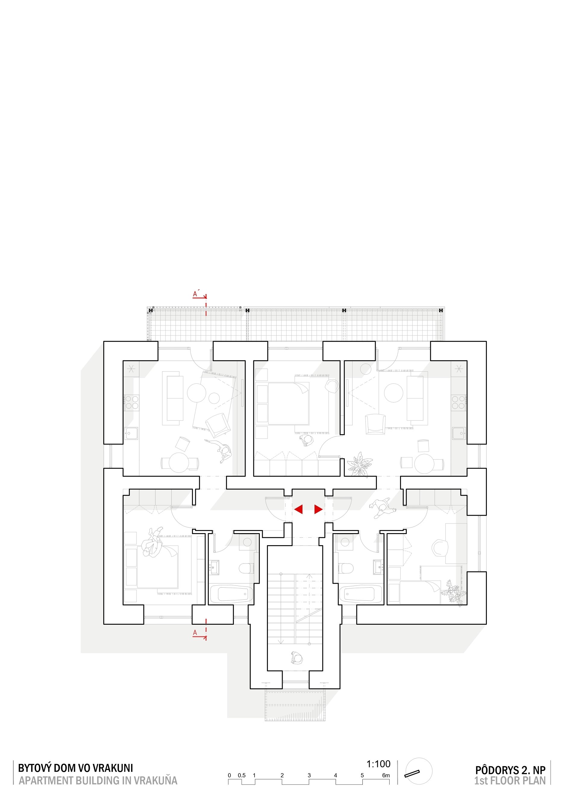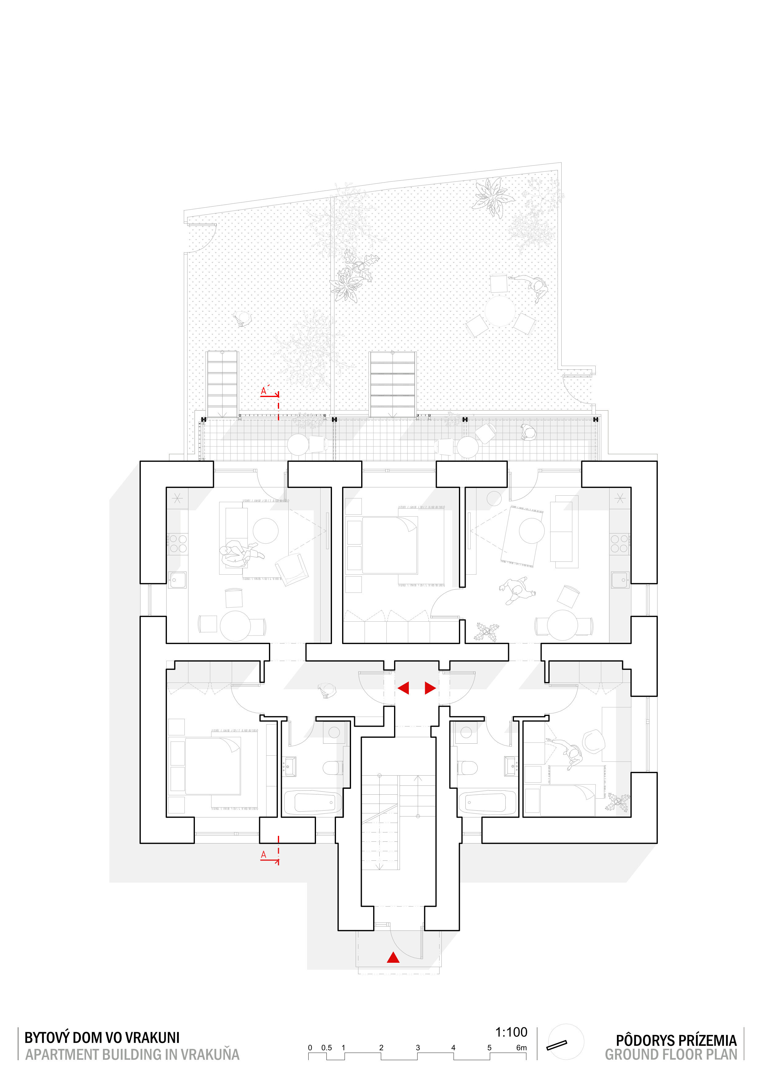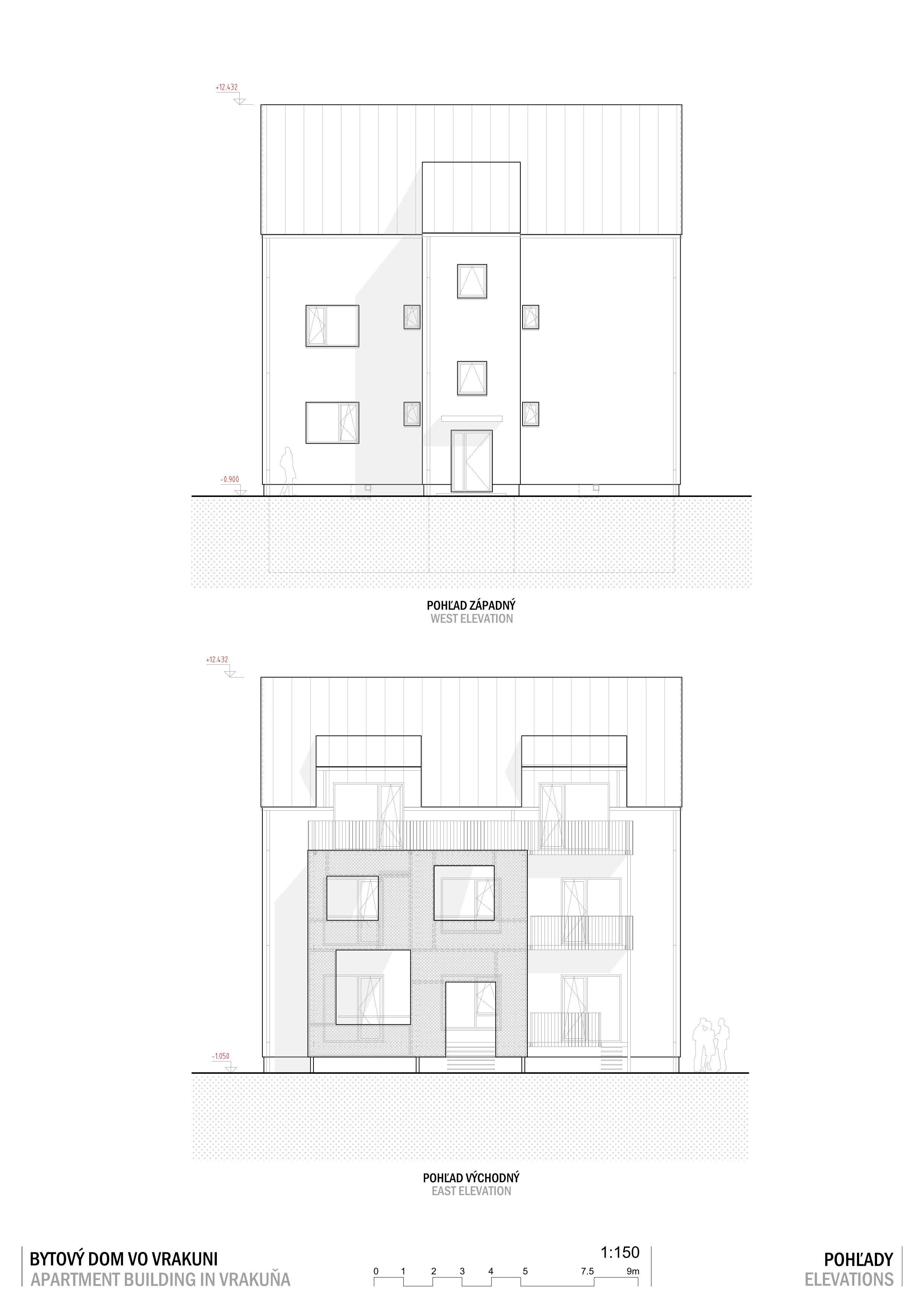 Vrakuňa je predmestie Bratislavy charakterizované kontrastom pôvodnej vidieckej uličnej zástavby a novšej mestskej sídliskovej výstavby. Objekt bytového domu je situovaný v nárožnej polohe na križovatke ulíc na rozhraní týchto dvoch typov zástavby a je kombináciou týchto kontrastov na viacerých úrovniach. Formálne aj programovo stelesňuje jeho hraničnú polohu jednak kombináciou zachovanej sedlovej strechy a doplnením predsadených balkónov, ako aj rozšírením o dva nové podkrovné byty. Práca s kontrastmi je viditeľná aj v interiéri, predovšetkým zachovanými pôvodnými detailmi schodiska či dlažby a zároveň jasnou artikuláciou novodoplnených prvkov.