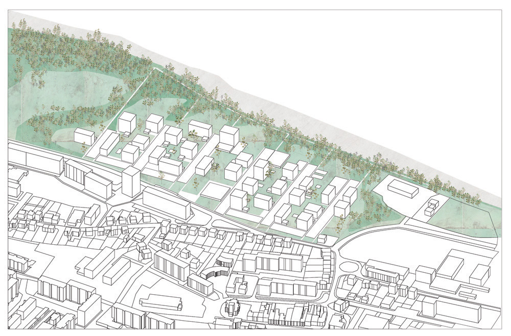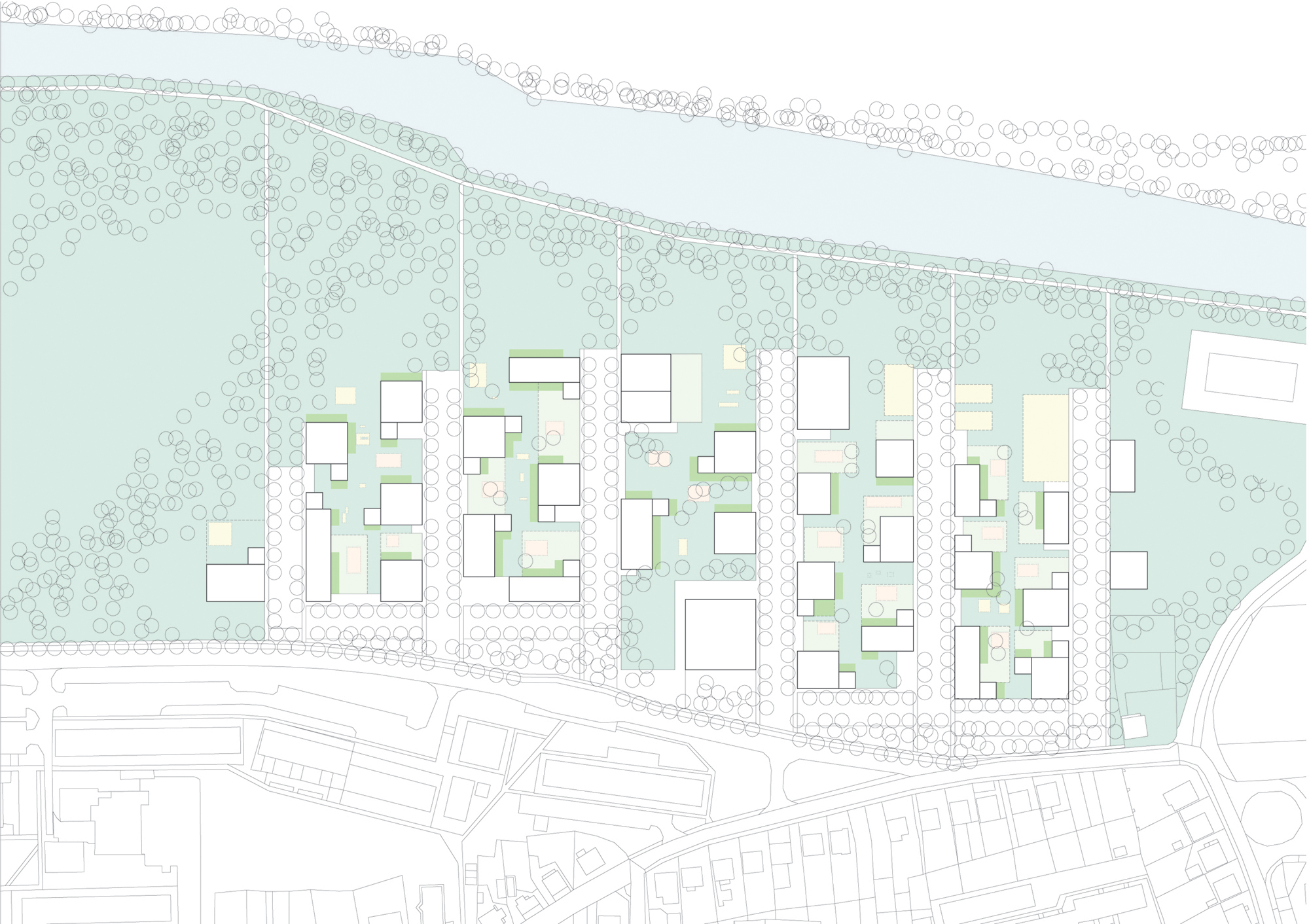 Tieto zelené priestory bez áut prepájajú existujúce Kamence s riekou a ponúkajú široké spektrum situácií a aktivít pre nových aj súčasných obyvateľov tak, aby nová zástavba nebola bariérou medzi mestom a riekou, ale spájajúcim elementom. Územie je organizované do pruhov, ktoré sú napojené na existujúcu štruktúru ulicami so vstupmi, spoločnými priestormi, vybavenosťou a parkovaním.