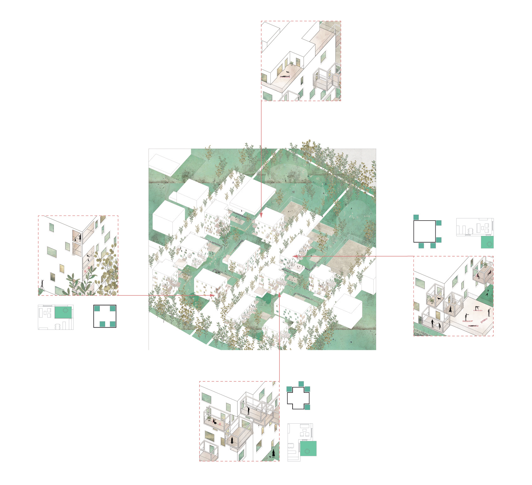 Projekt zahŕňa viaceré typy domov, s rôznymi výškami, dispozíciou, orientáciou a charaktermi verejných priestorov. Od súkromných predzáhradiek, cez záhrady a terasy spoločné pre obyvateľov jednotlivých domov, komunitné priestory pre obytné bloky s detskými ihriskami, pingpongovými stolmi, miestami pre piknik atď až po verejné priestory.