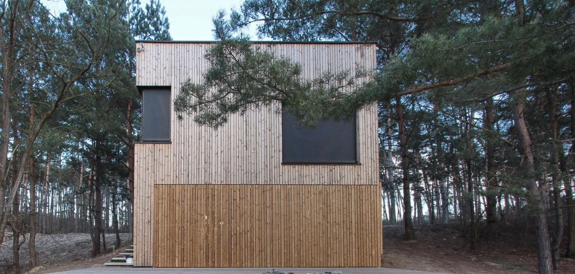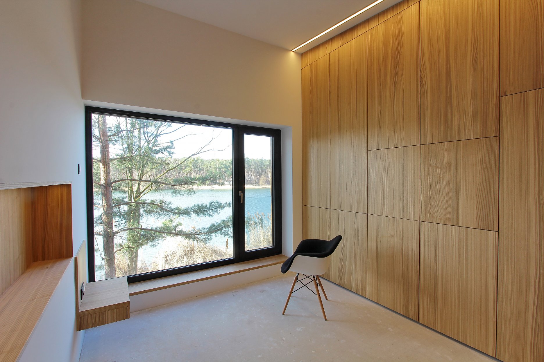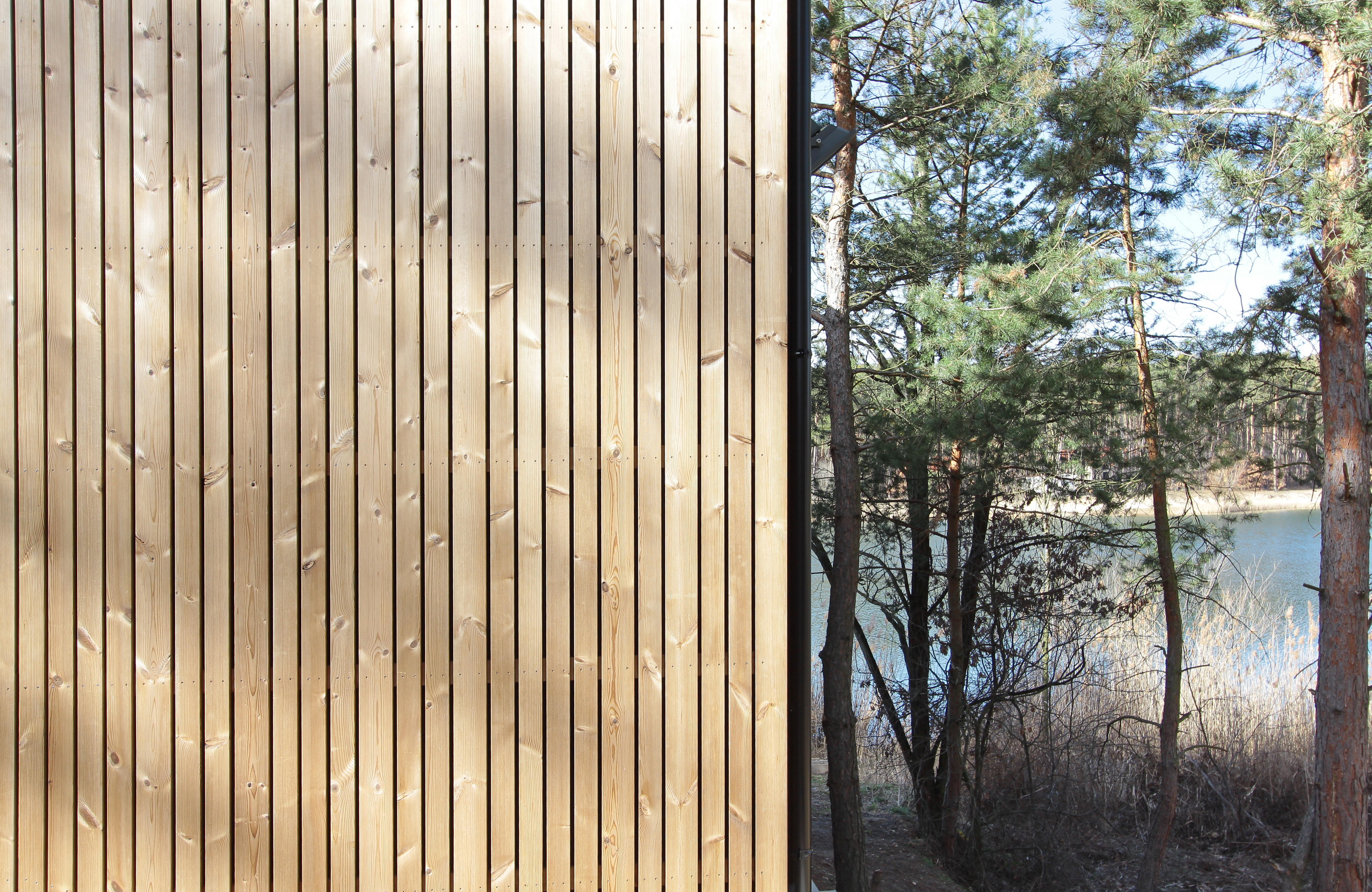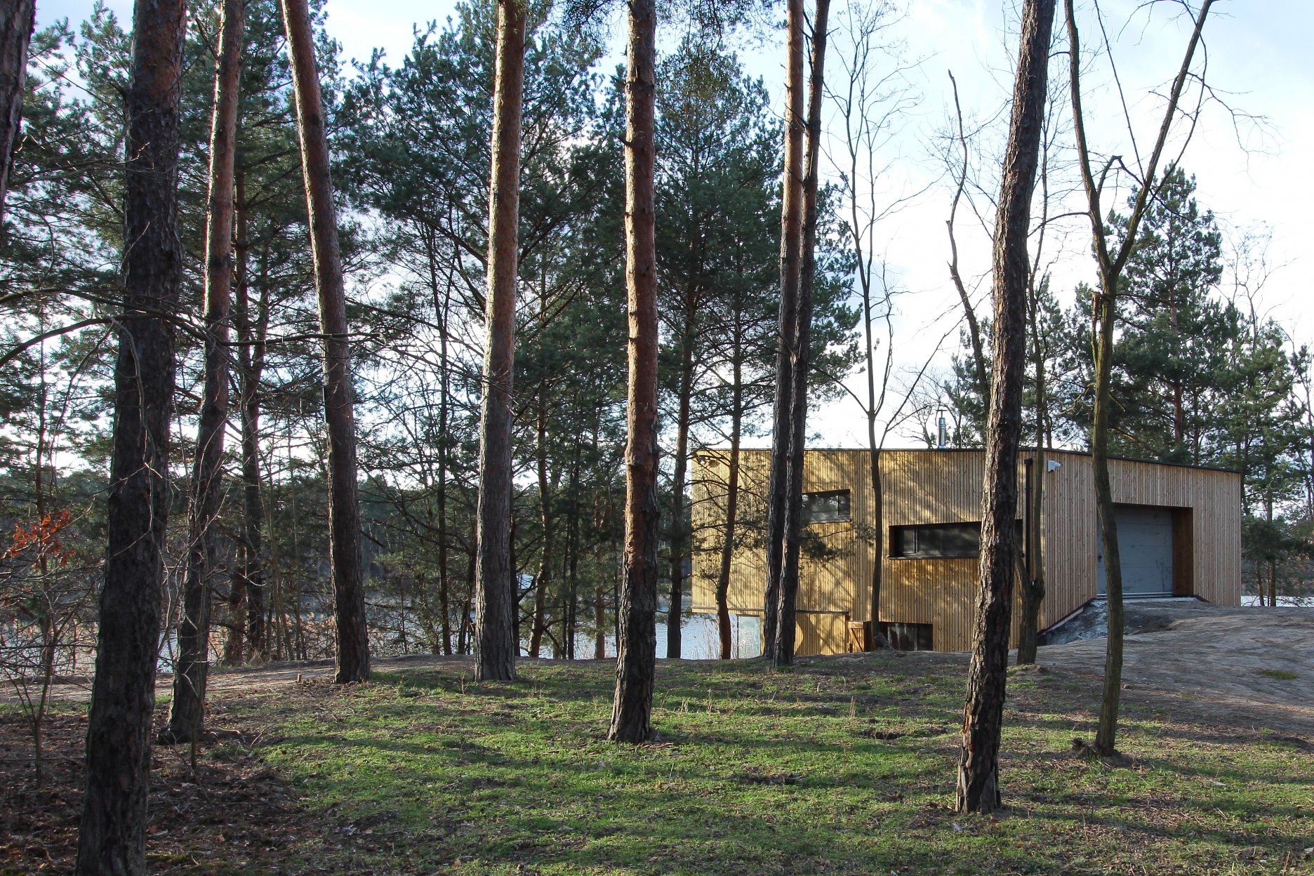 Dispozičné riešenie domu vychádza z požiadaviek investora, z orientácie svetových strán, zo zámeru využitia maximálnych možností výhľadu z daného miesta a z bezprostredného kontaktu s okolitým lesíkom. Takisto aj s priľahlou vodnou plochou. Objekt má podobu jednoduchého ortogonálneho, drevom obloženého kubusu, narušeného iba nepravidelnou perforáciou otvorov, ktoré svojim rozptýleným rastrom dotvárajú minimalistickú kompozíciu.
