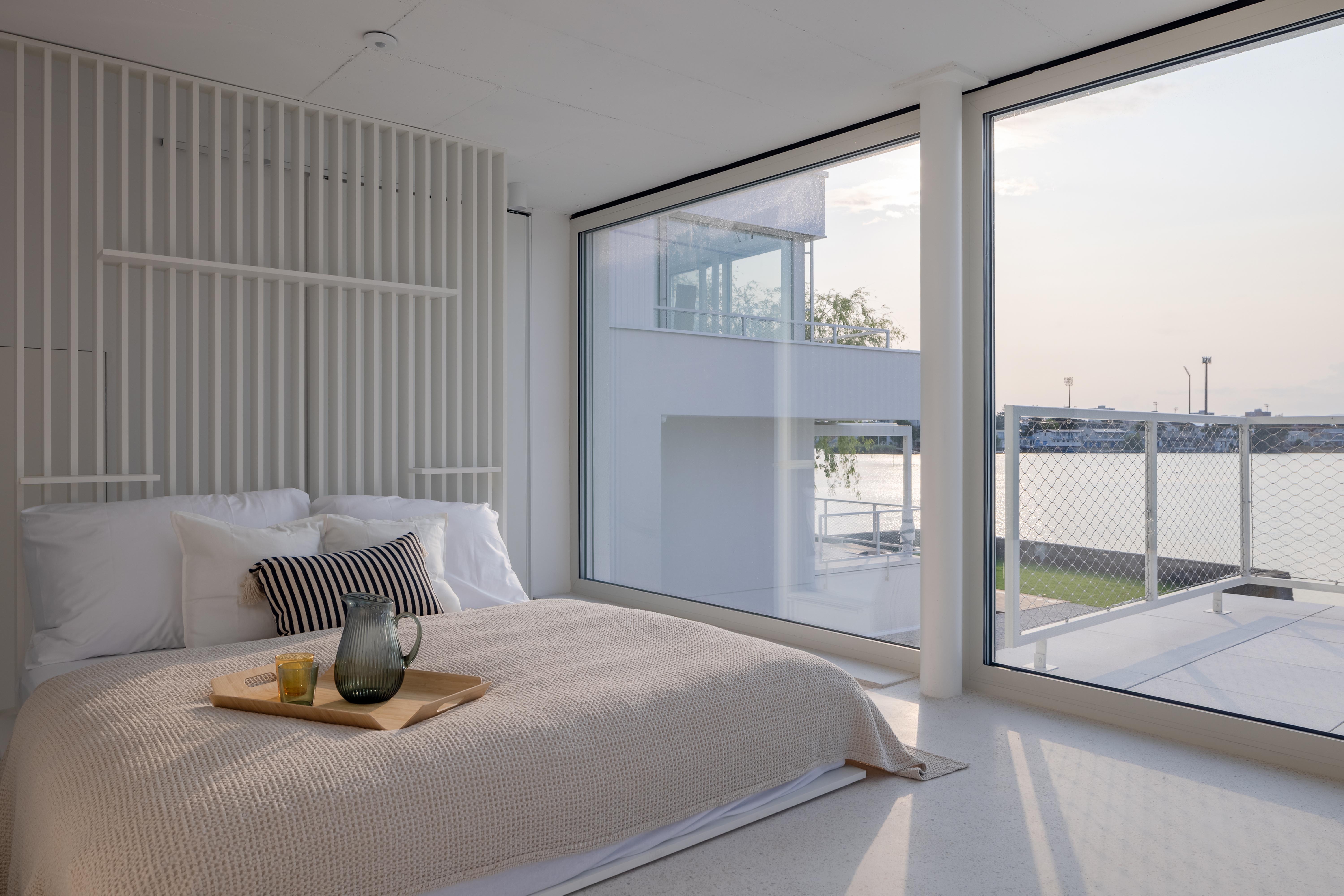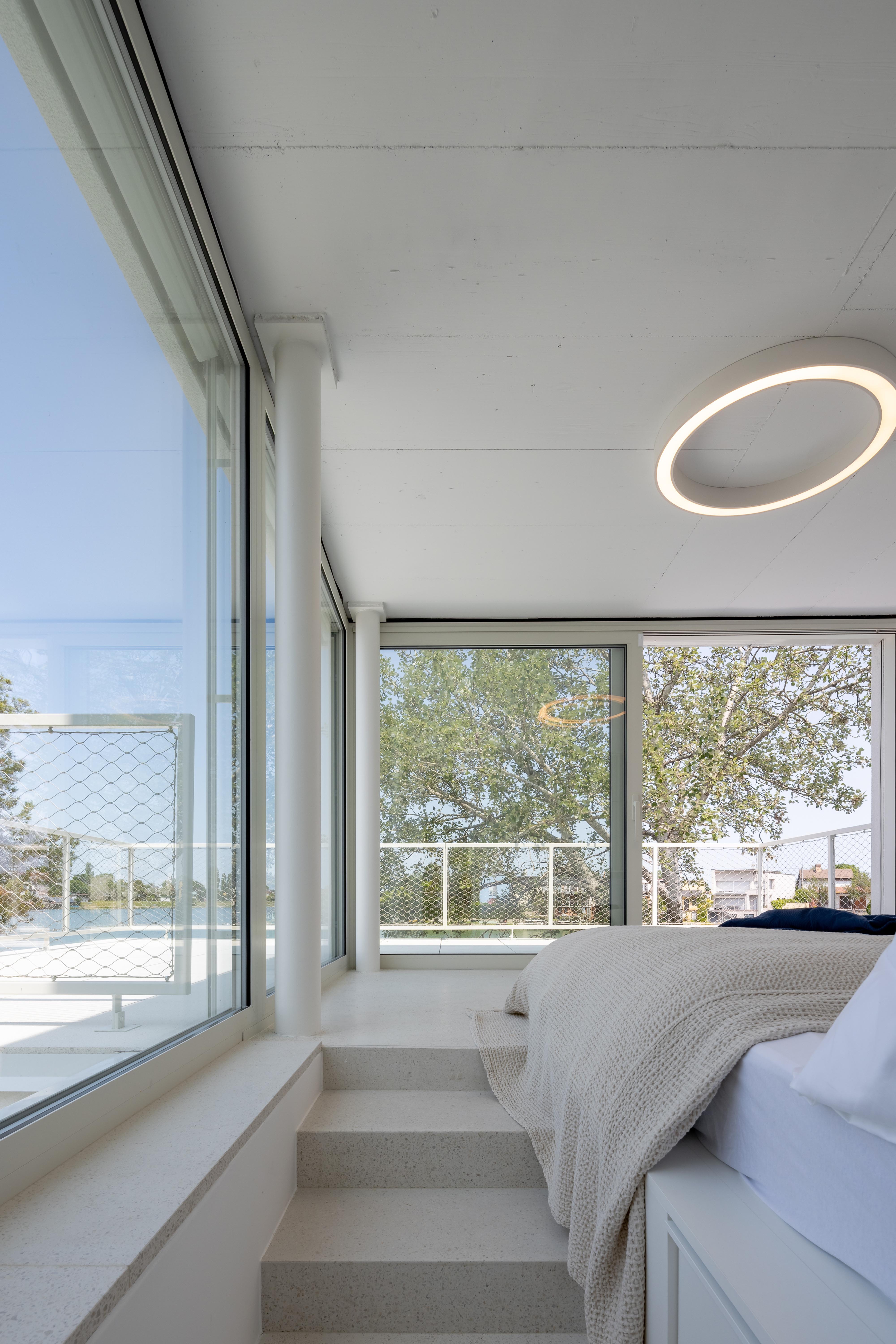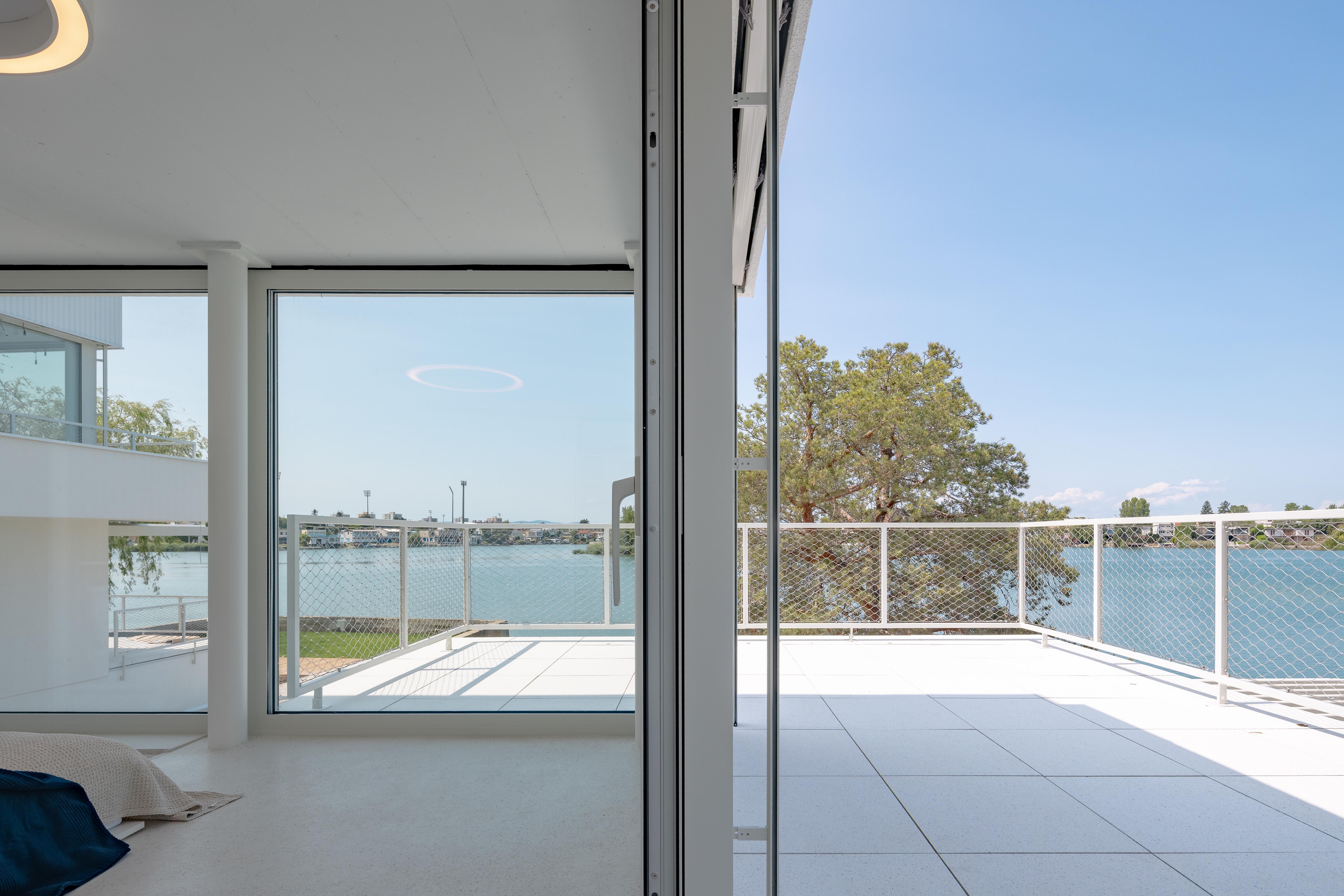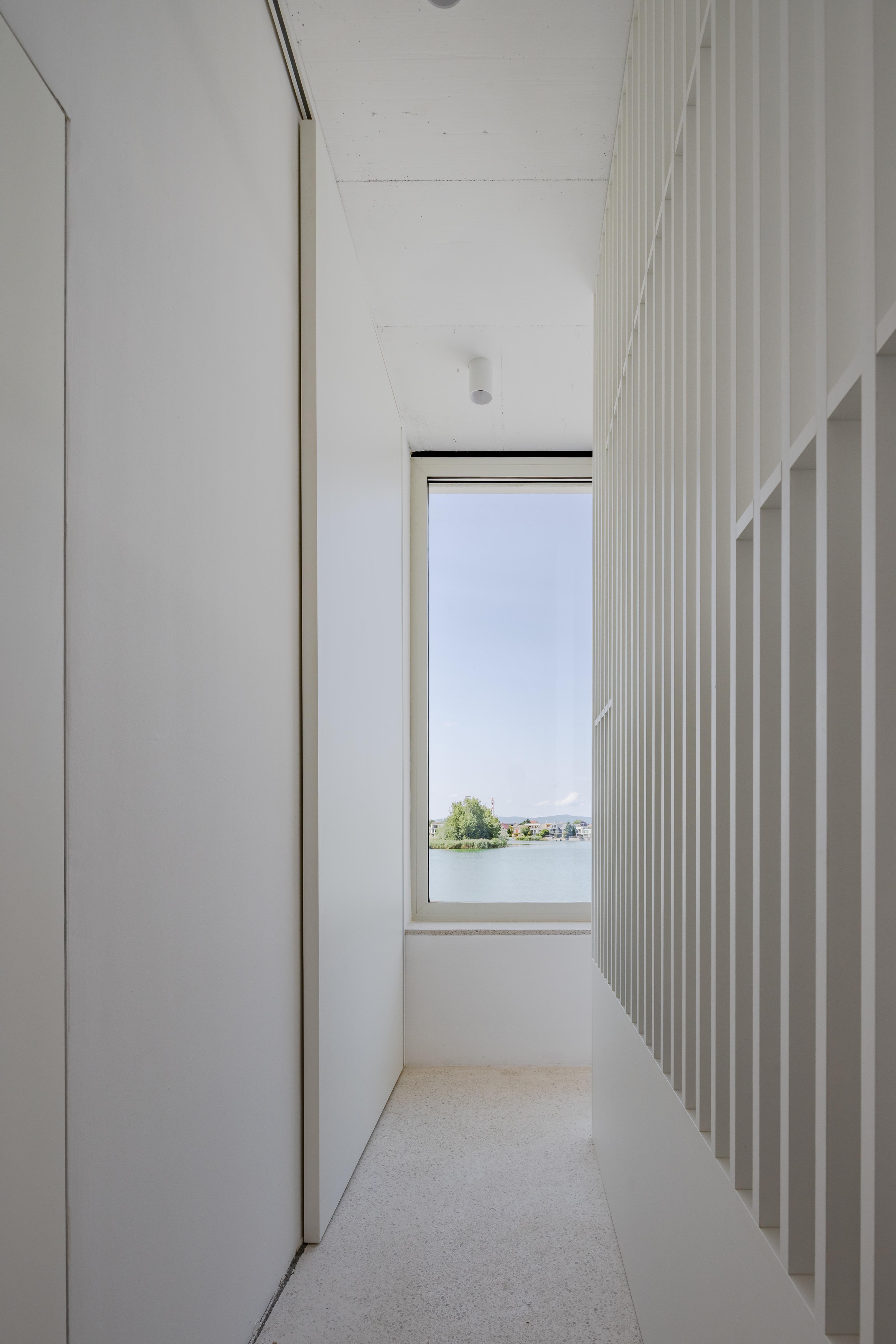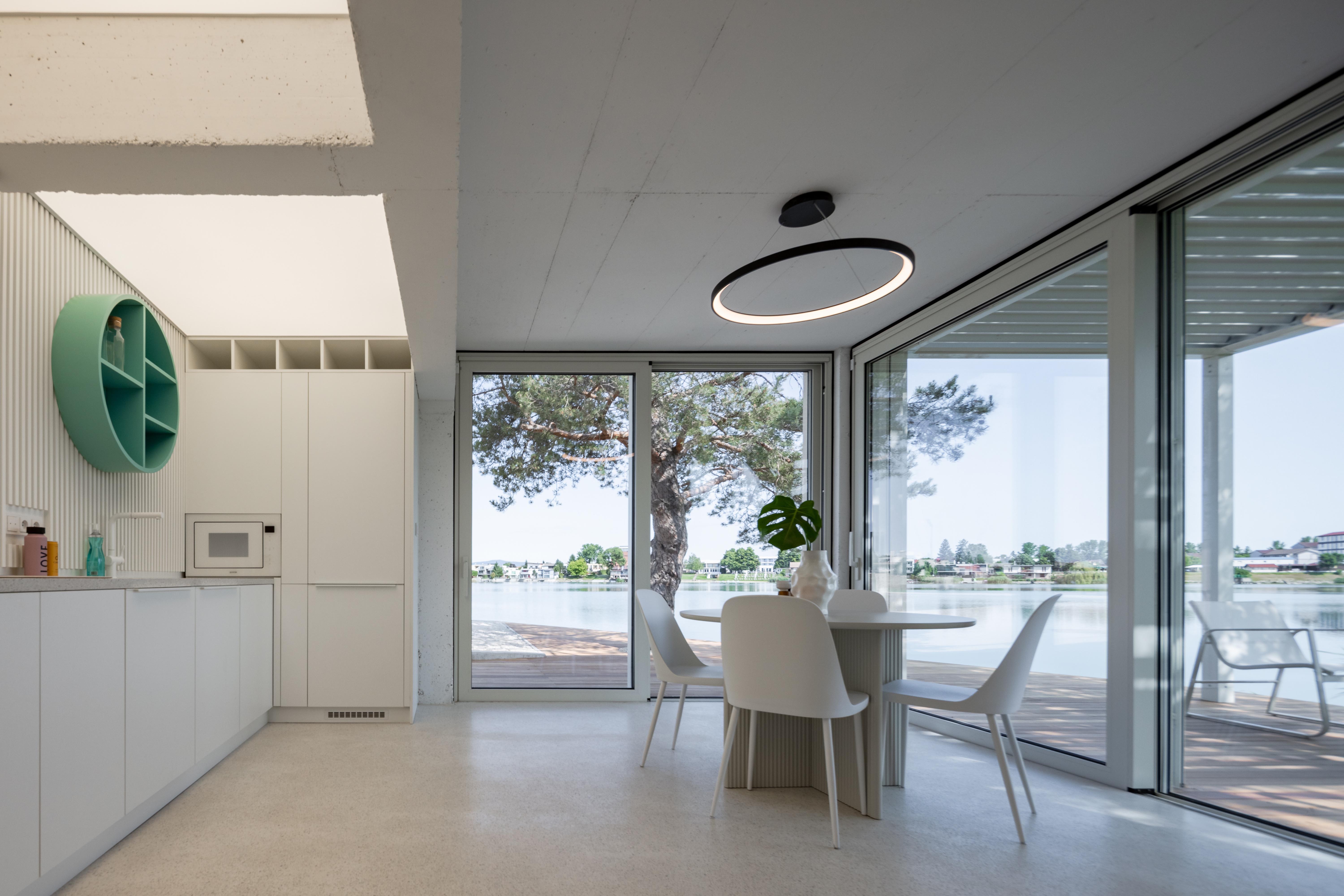 Väčšina nábytku je navrhnutá ako atypické vstavané prvky a realizovaná stolárskou dielňou. Koncept zdôrazňuje veľké presklenia, ktoré otvárajú nerušené výhľady na jazero a zeleň. Interiér je ladený do biela – tá nekonkuruje okoliu, ale naopak ho zvýrazňuje. Biela farba bola použitá aj na surové materiály, ako betón, keramické tvarovky, debniace tehly či pôvodné stropné konštrukcie.