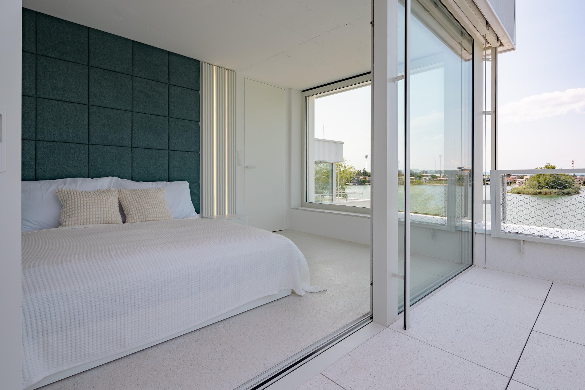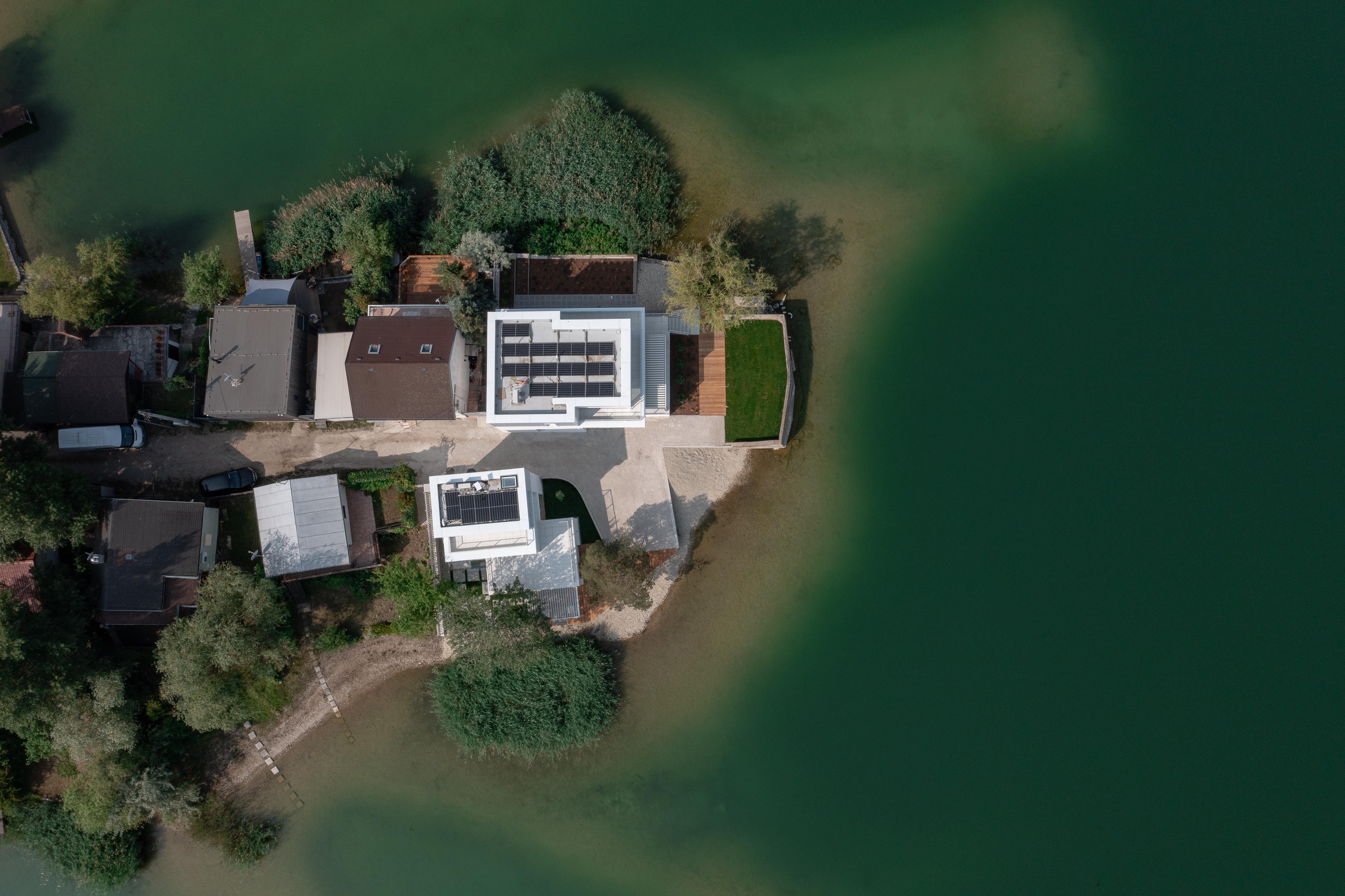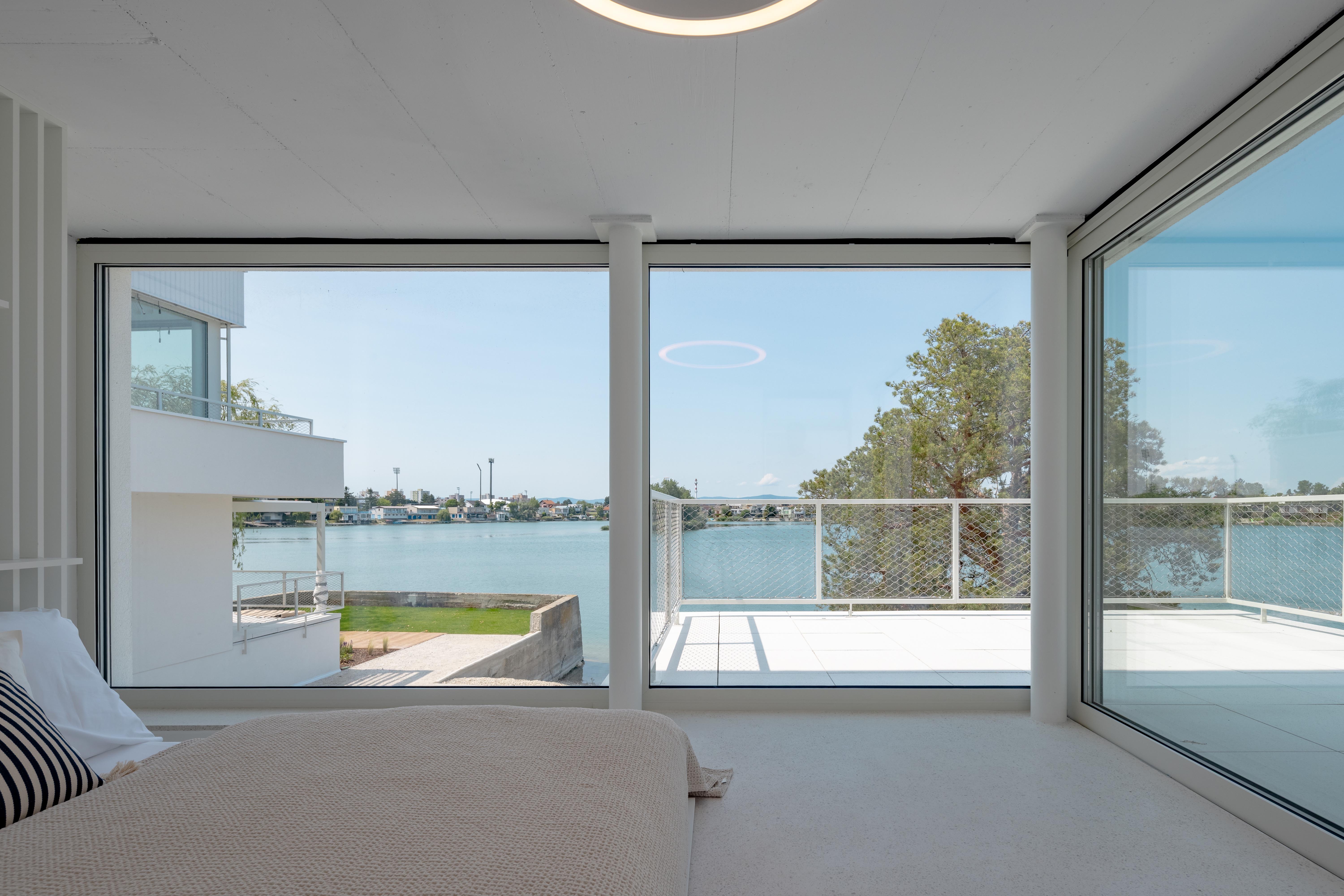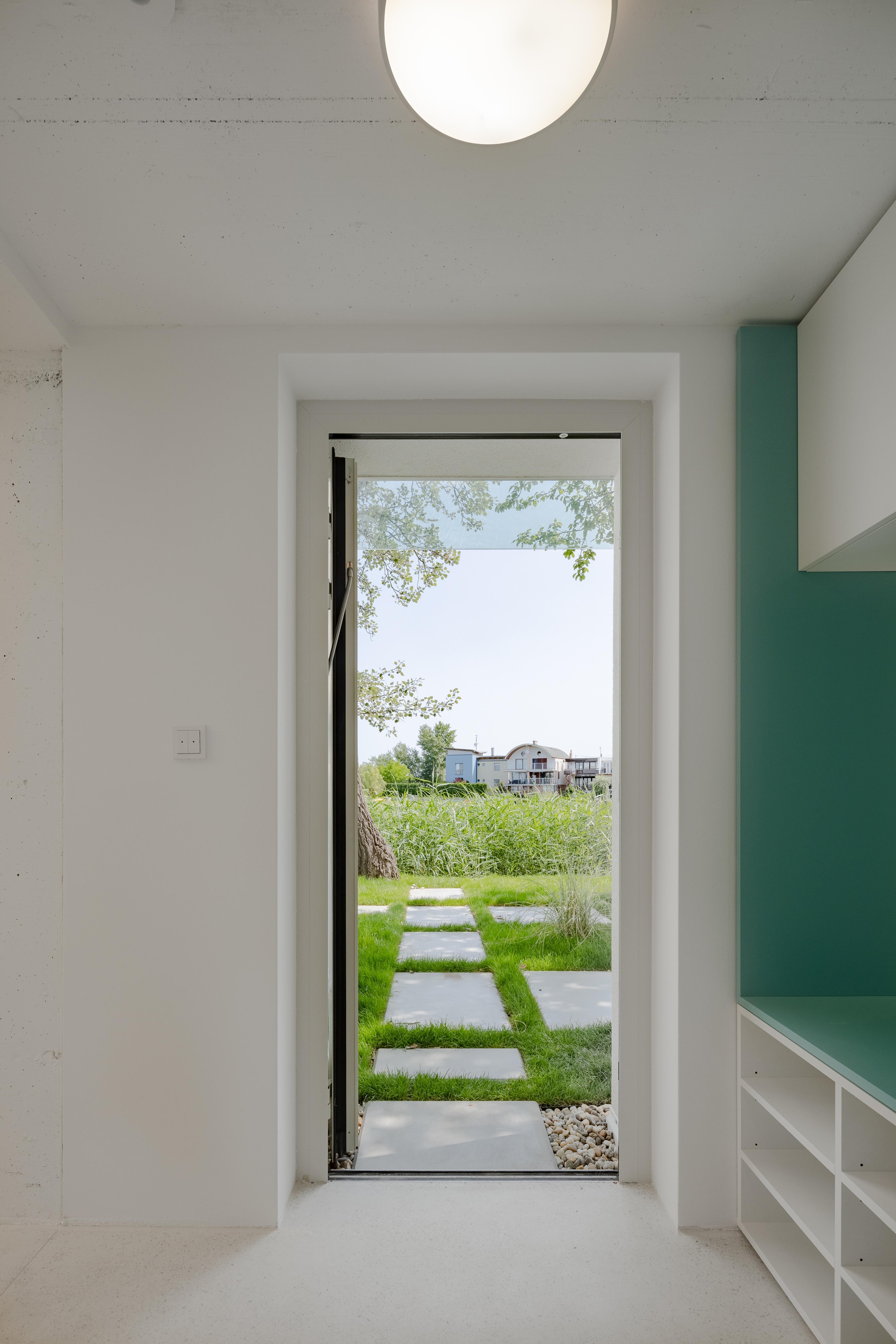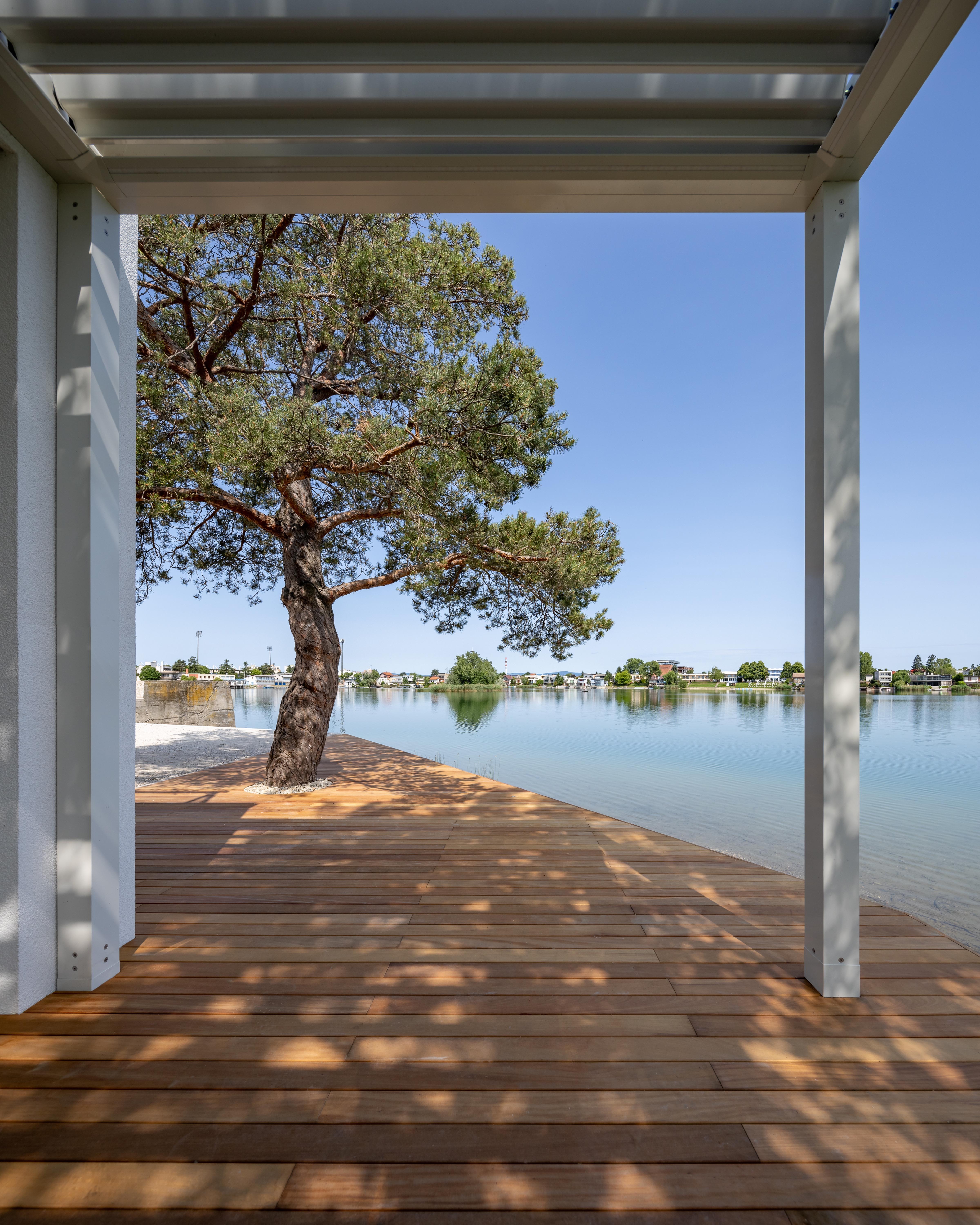 Väčšina nábytku je navrhnutá ako atypické vstavané prvky a realizovaná stolárskou dielňou. Koncept zdôrazňuje veľké presklenia, ktoré otvárajú nerušené výhľady na jazero a zeleň. Interiér je ladený do biela – tá nekonkuruje okoliu, ale naopak ho zvýrazňuje. Biela farba bola použitá aj na surové materiály, ako betón, keramické tvarovky, debniace tehly či pôvodné stropné konštrukcie.