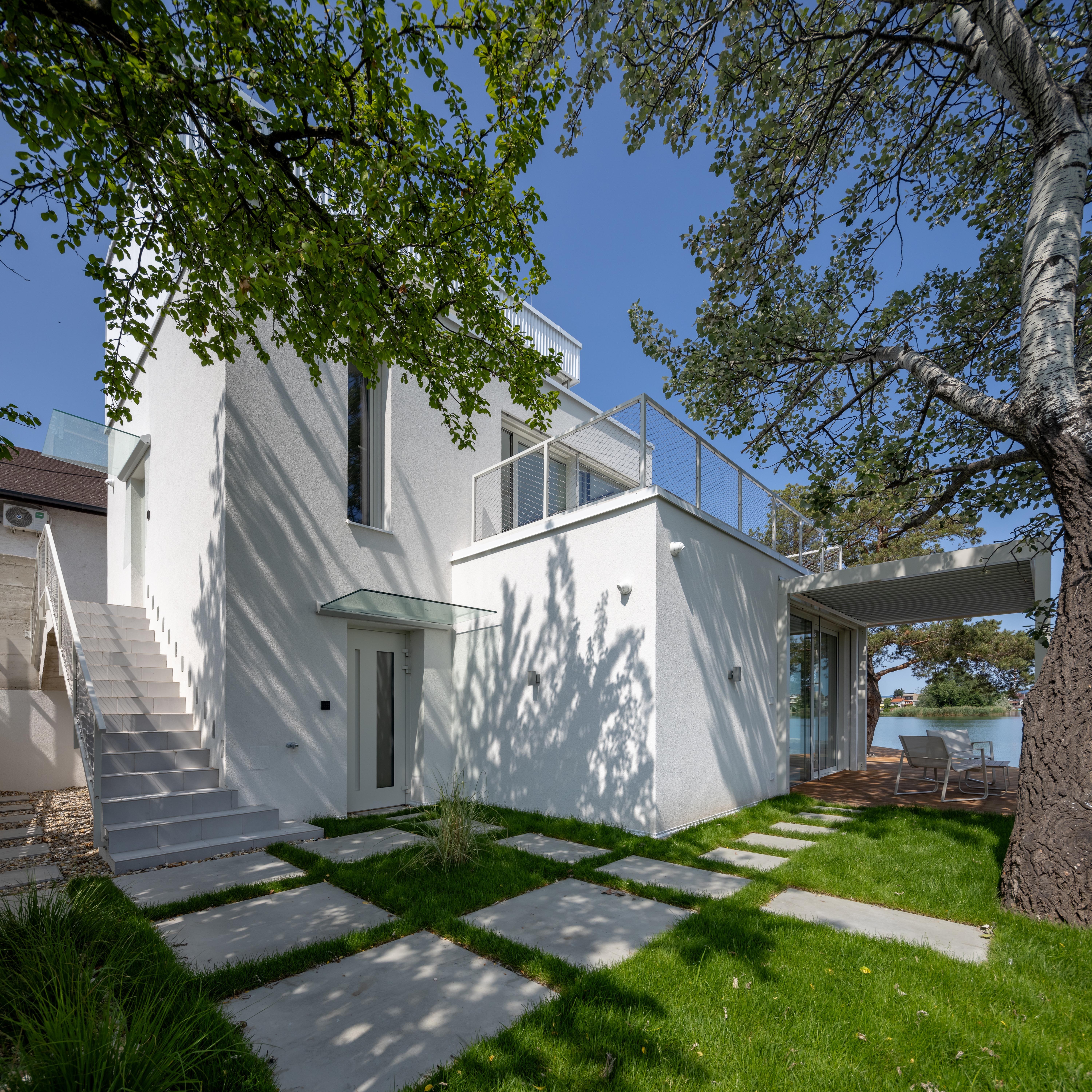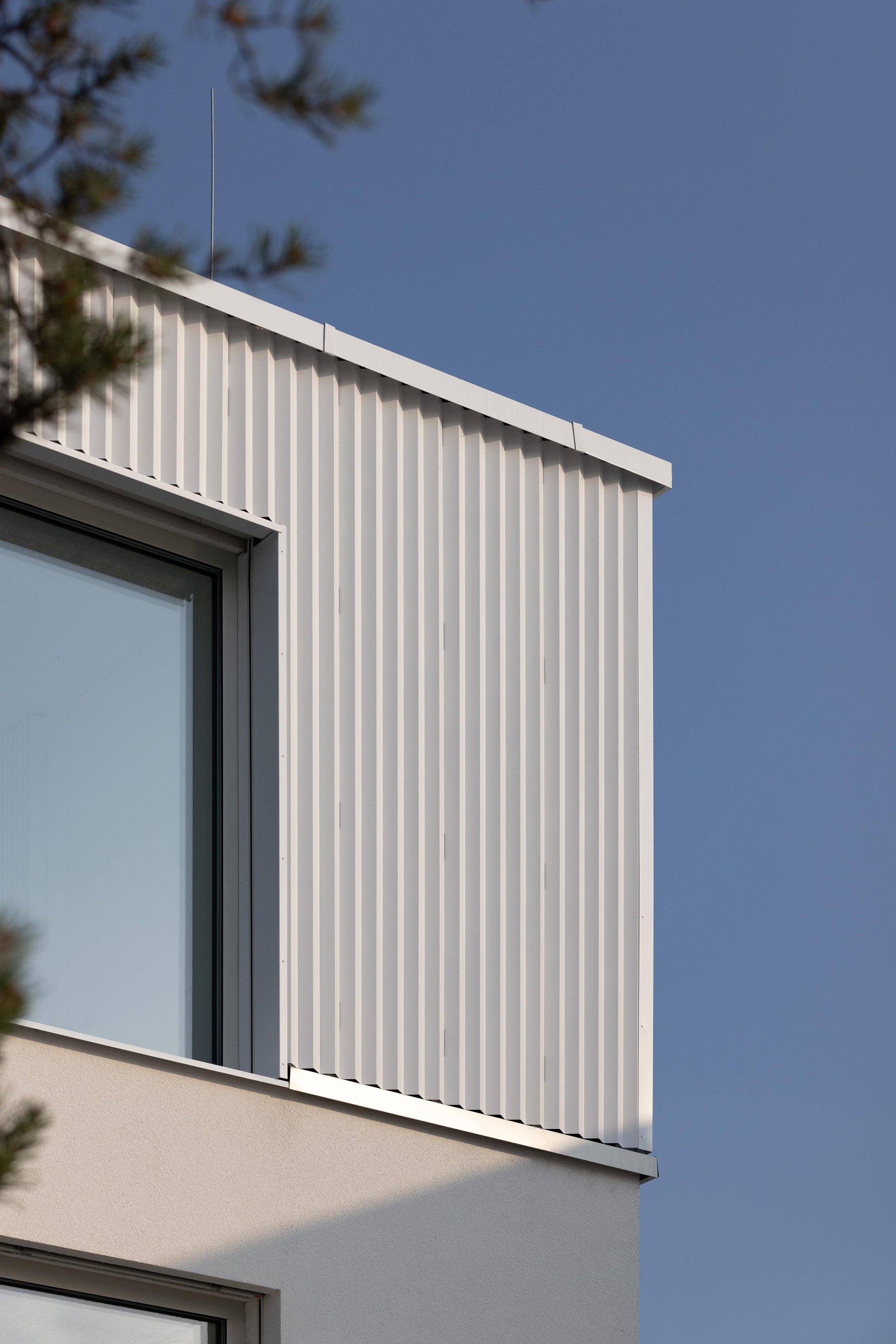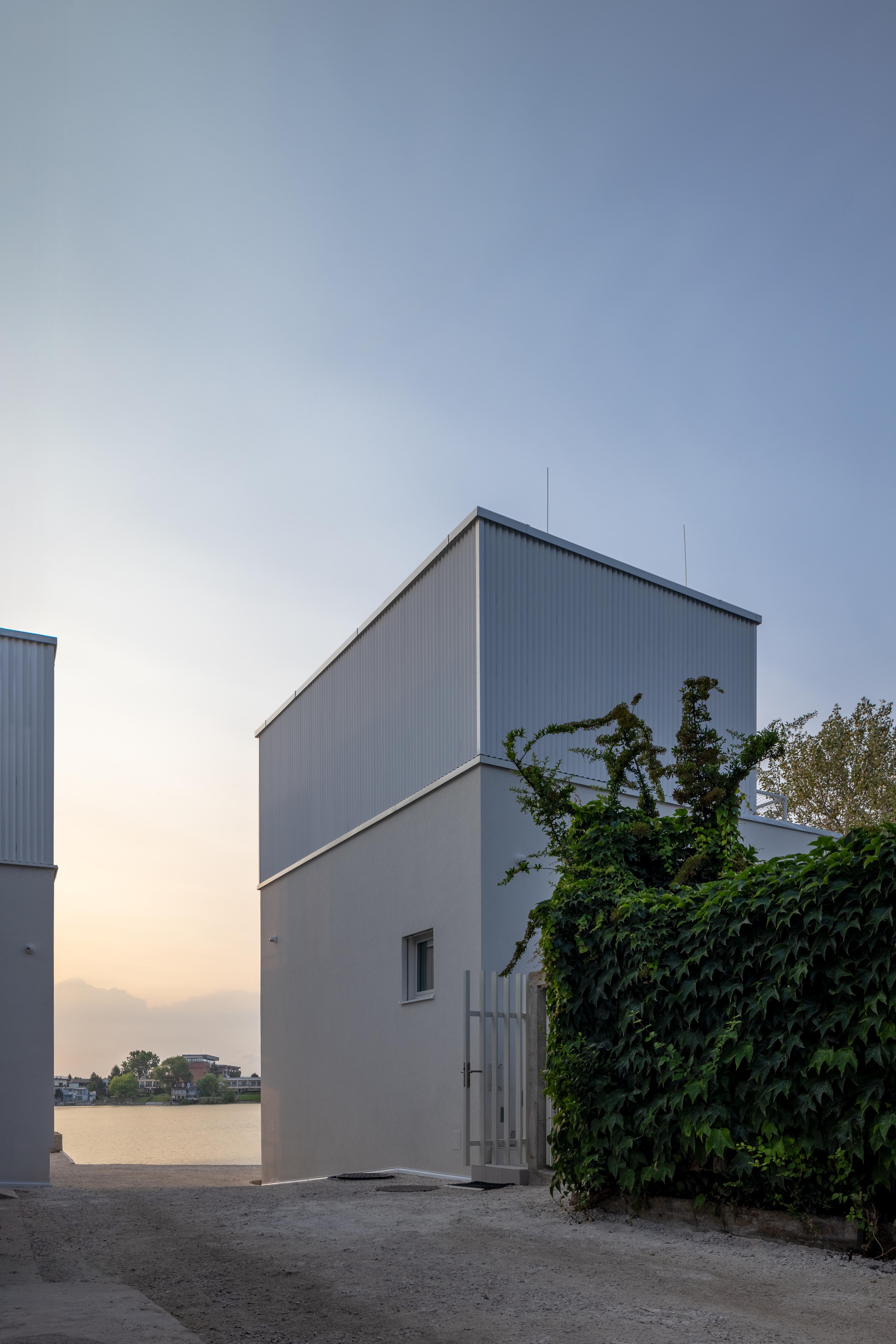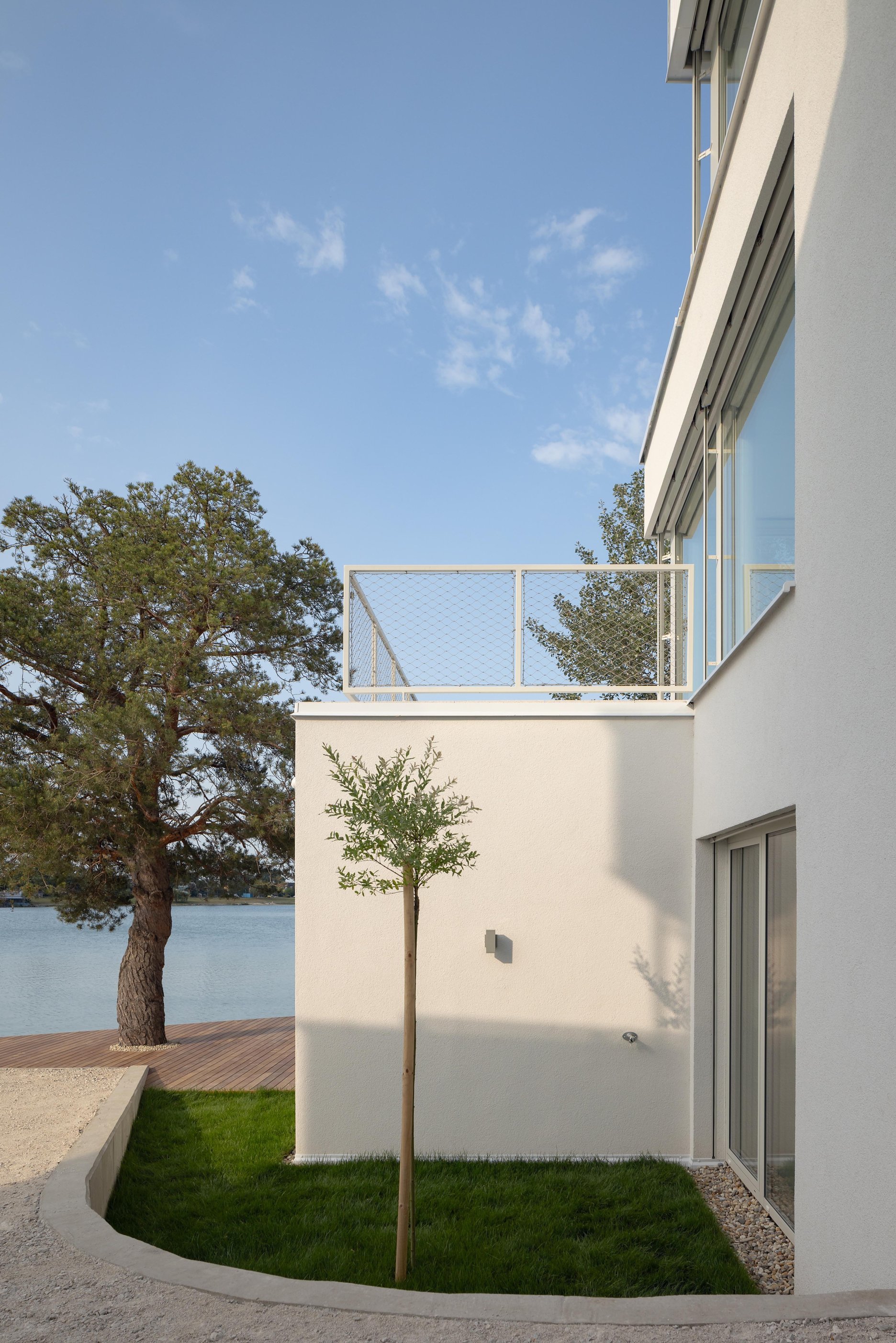 Nový objem v podobe nadstavby je materiálovo odlíšený – prevetrávaná kovová fasáda nadväzuje na strešnú rovinu okolitých budov. Farebnosť je riešená v bielom, jednoliatom prevedení doplnenom o kovové konštrukcie. Tie odkazujú na pôvodné detaily, ako rámy okien či harmonikové bezpečnostné krídla, ktoré boli inšpiráciou aj pre fasádu druhého nadzemného podlažia (trapézový plech s trojuholníkovým, mierne zaobleným pôdorysom). V rovnakom kovovom prevedení sú pergoly s bioklimatickými lamelami, nové okenné rámy, žalúzie, dvere i fasáda na druhom podlaží. Omietka je biela, stredne hrubozrnná, čo odkazuje na pôvodný objekt. Oplotenie medzi parcelami tvorí systém bielych lamiel natočených tak, aby umožňovali priehľady k vode, v kolmom pohľade pôsobili polopriesvitne a medzi terasami zabezpečovali nepriehľadnosť.
