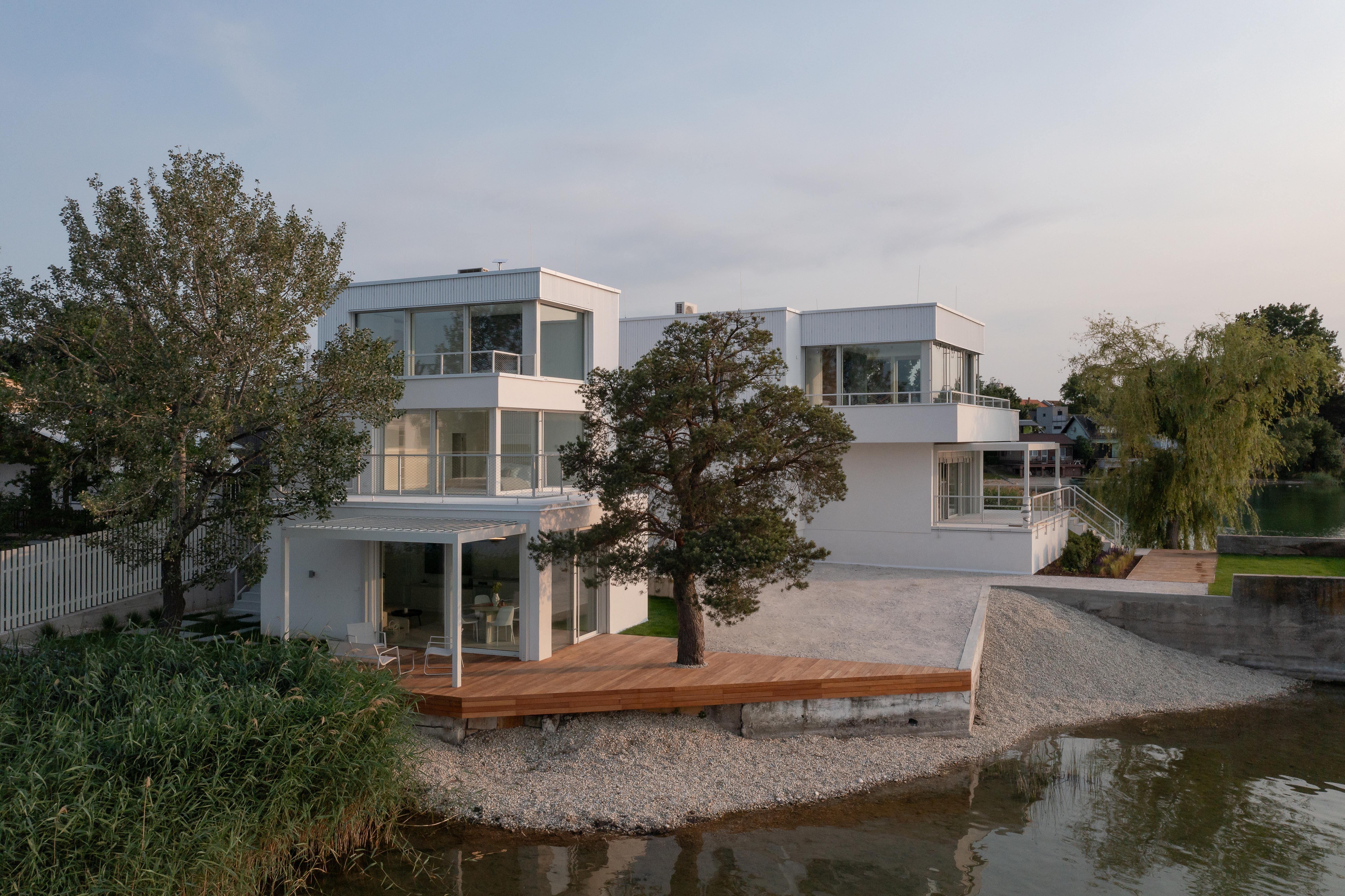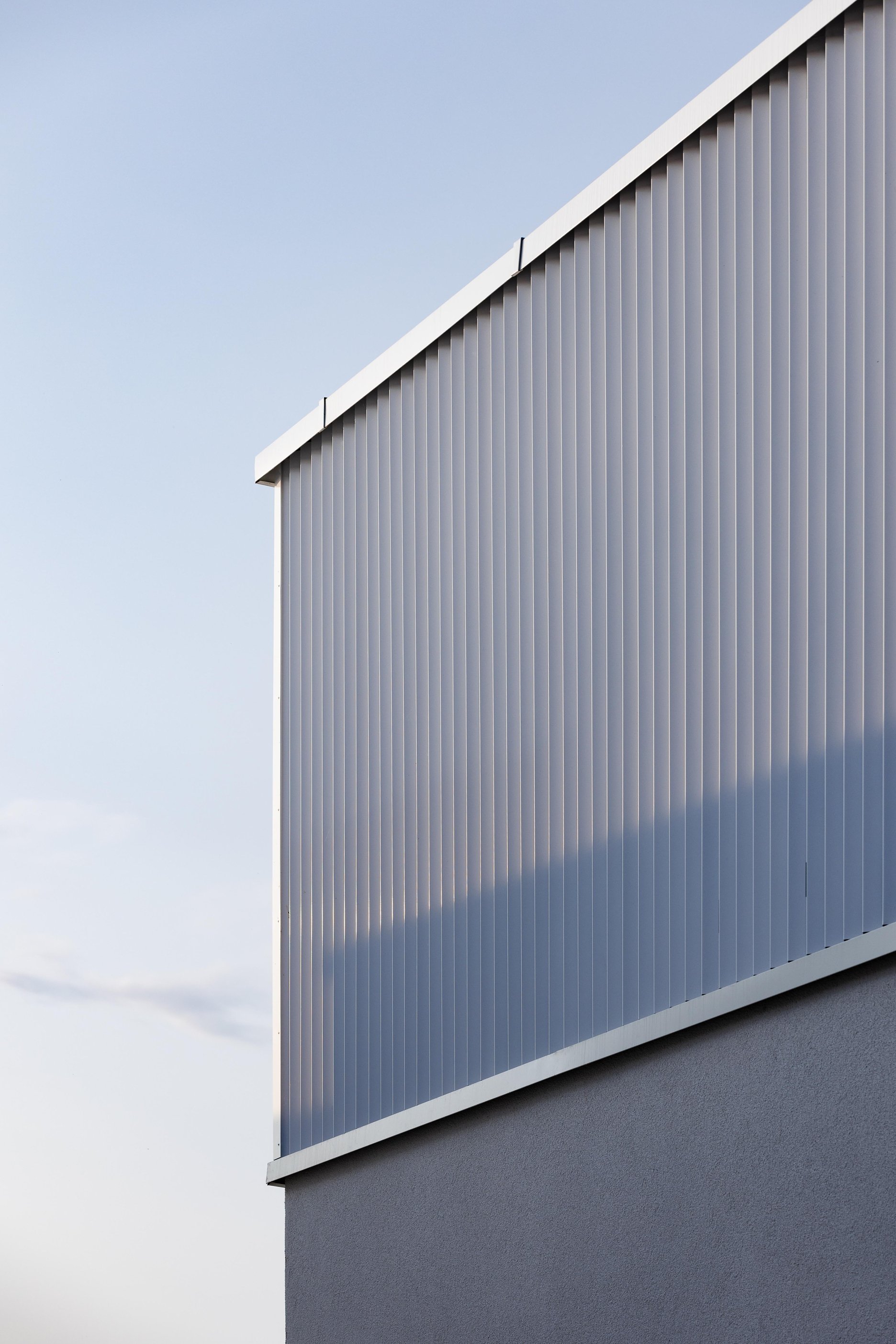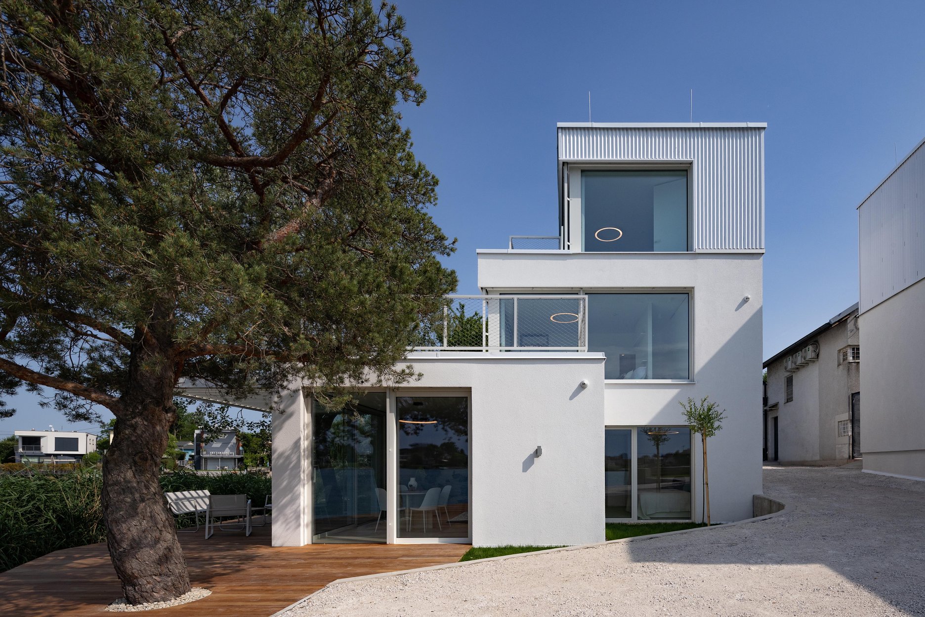 Nový objem v podobe nadstavby je materiálovo odlíšený – prevetrávaná kovová fasáda nadväzuje na strešnú rovinu okolitých budov. Farebnosť je riešená v bielom, jednoliatom prevedení doplnenom o kovové konštrukcie. Tie odkazujú na pôvodné detaily, ako rámy okien či harmonikové bezpečnostné krídla, ktoré boli inšpiráciou aj pre fasádu druhého nadzemného podlažia (trapézový plech s trojuholníkovým, mierne zaobleným pôdorysom). V rovnakom kovovom prevedení sú pergoly s bioklimatickými lamelami, nové okenné rámy, žalúzie, dvere i fasáda na druhom podlaží. Omietka je biela, stredne hrubozrnná, čo odkazuje na pôvodný objekt. Oplotenie medzi parcelami tvorí systém bielych lamiel natočených tak, aby umožňovali priehľady k vode, v kolmom pohľade pôsobili polopriesvitne a medzi terasami zabezpečovali nepriehľadnosť.