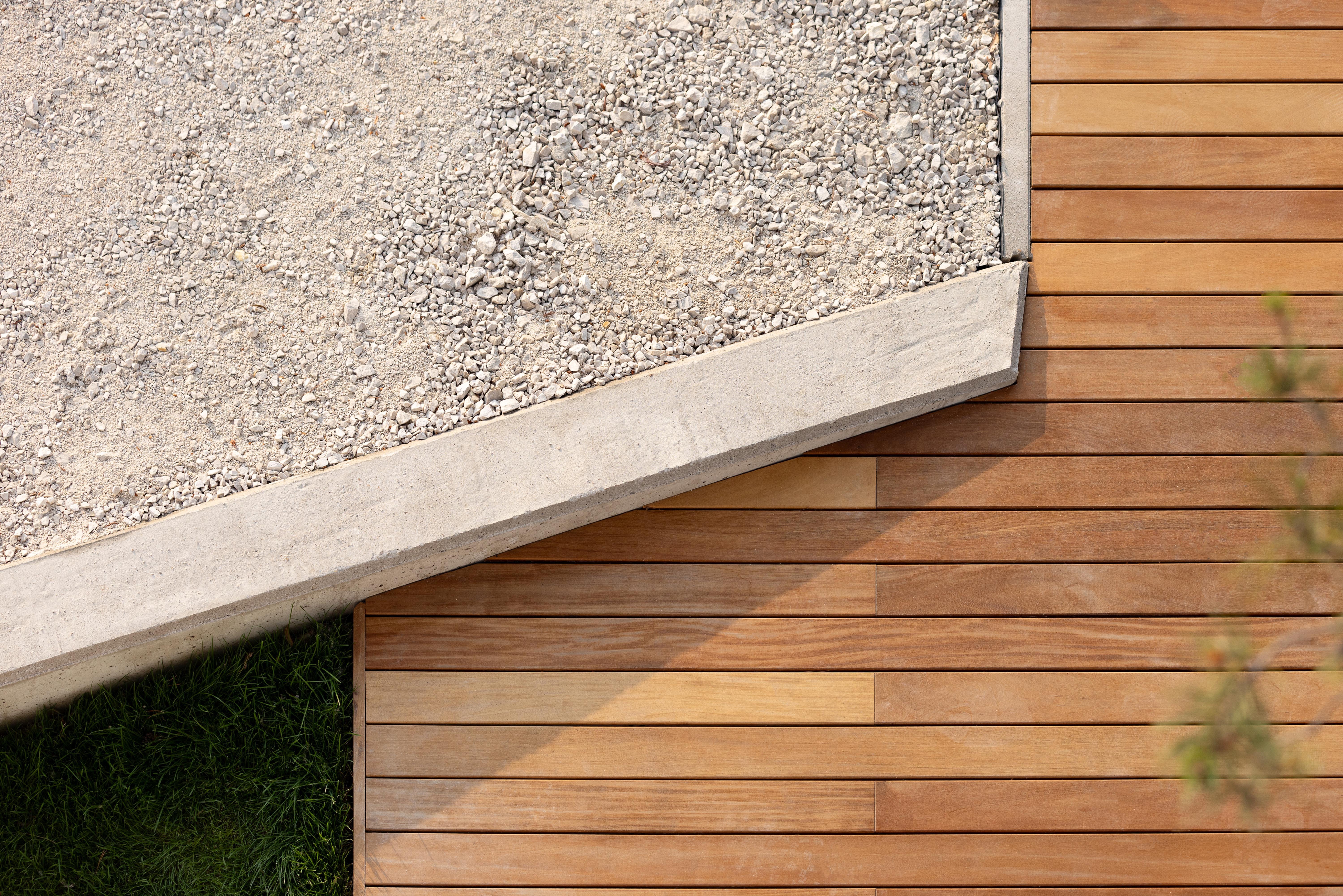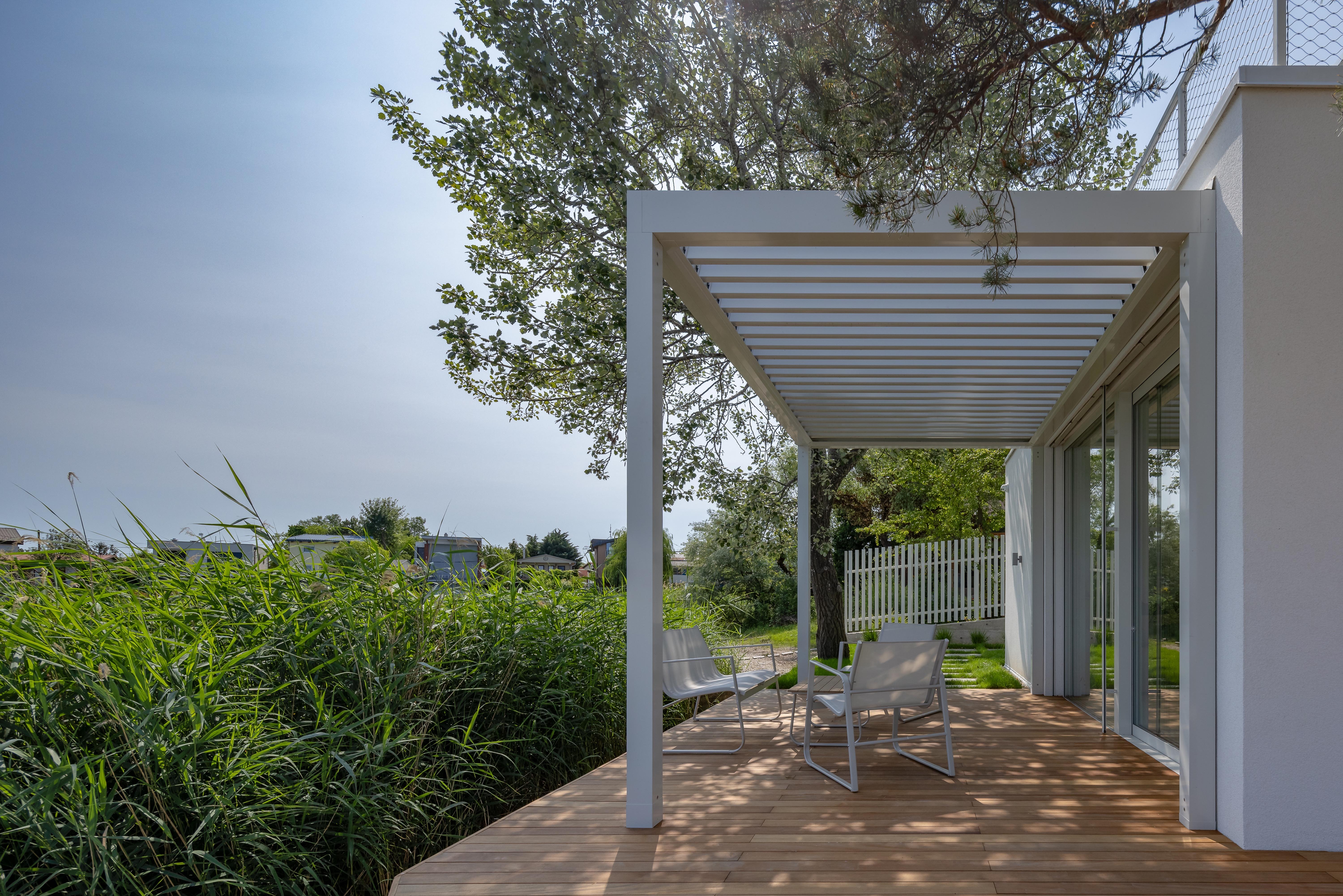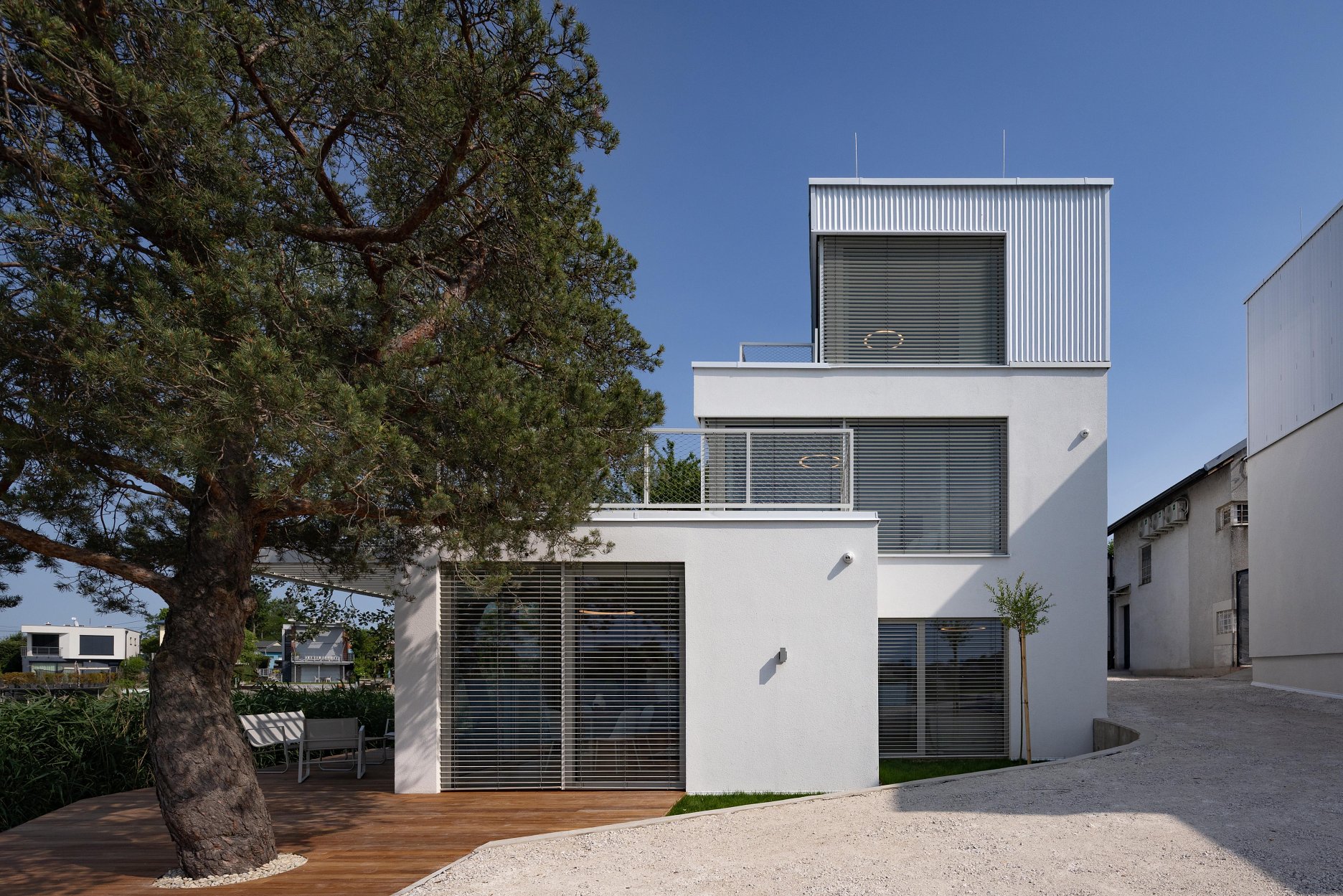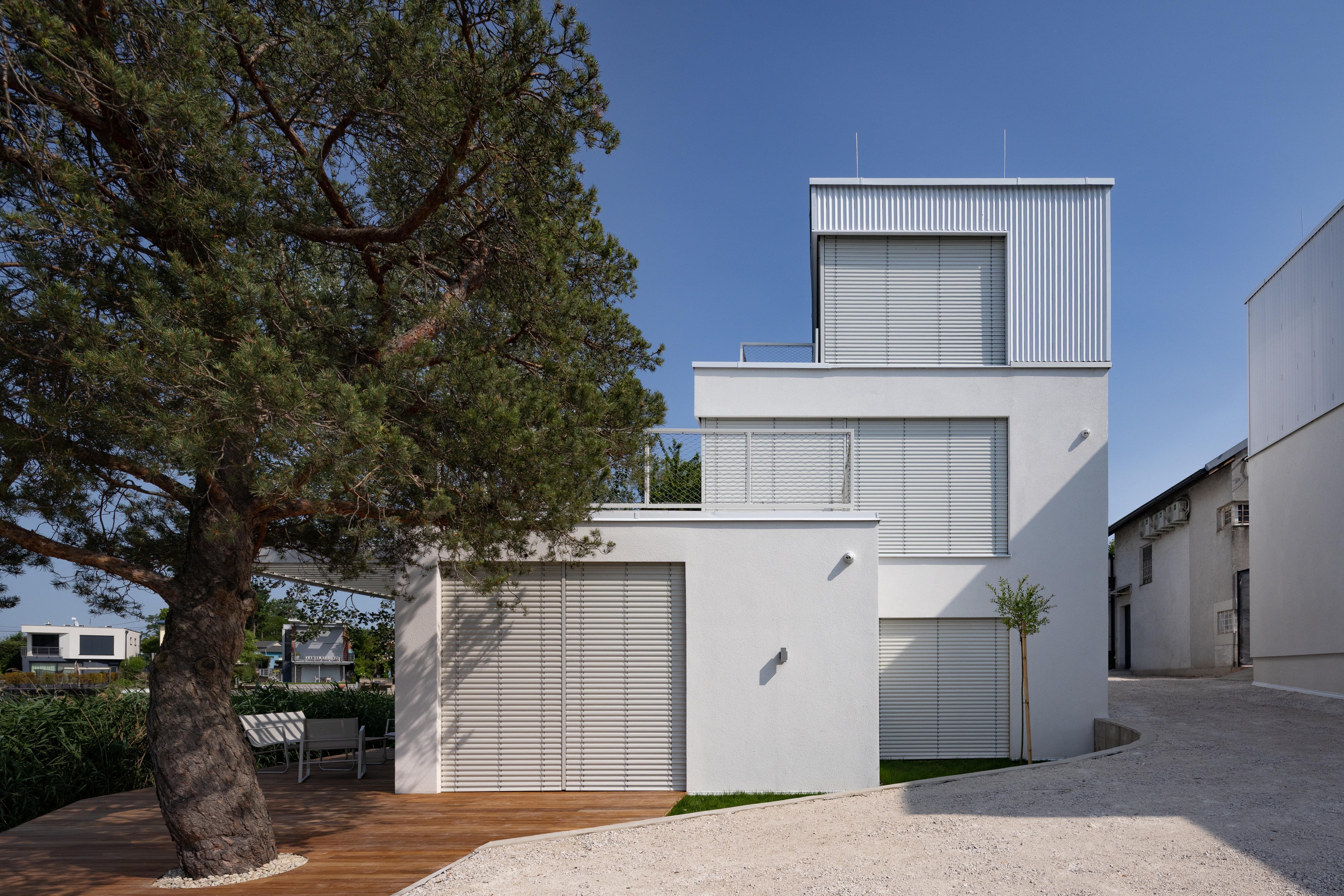 Nový objem v podobe nadstavby je materiálovo odlíšený – prevetrávaná kovová fasáda nadväzuje na strešnú rovinu okolitých budov. Farebnosť je riešená v bielom, jednoliatom prevedení doplnenom o kovové konštrukcie. Tie odkazujú na pôvodné detaily, ako rámy okien či harmonikové bezpečnostné krídla, ktoré boli inšpiráciou aj pre fasádu druhého nadzemného podlažia (trapézový plech s trojuholníkovým, mierne zaobleným pôdorysom). V rovnakom kovovom prevedení sú pergoly s bioklimatickými lamelami, nové okenné rámy, žalúzie, dvere i fasáda na druhom podlaží. Omietka je biela, stredne hrubozrnná, čo odkazuje na pôvodný objekt. Oplotenie medzi parcelami tvorí systém bielych lamiel natočených tak, aby umožňovali priehľady k vode, v kolmom pohľade pôsobili polopriesvitne a medzi terasami zabezpečovali nepriehľadnosť.