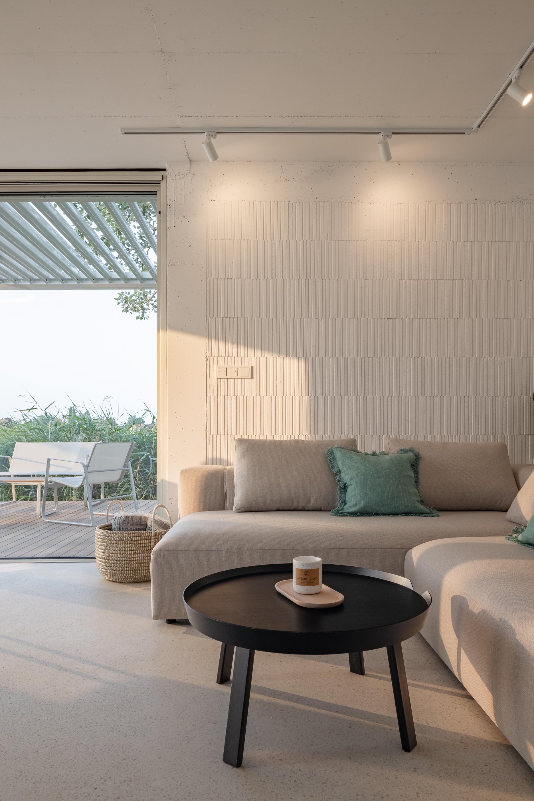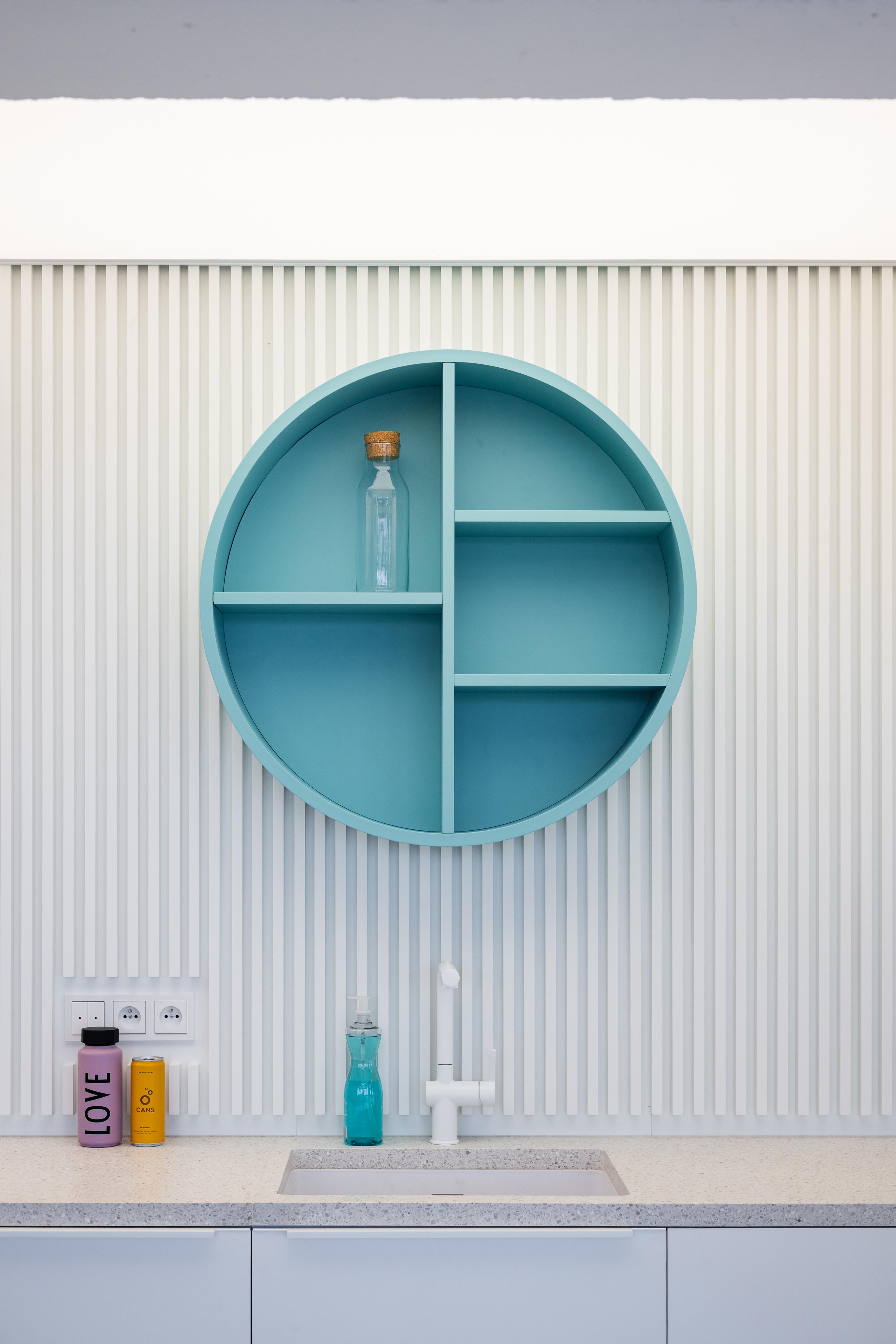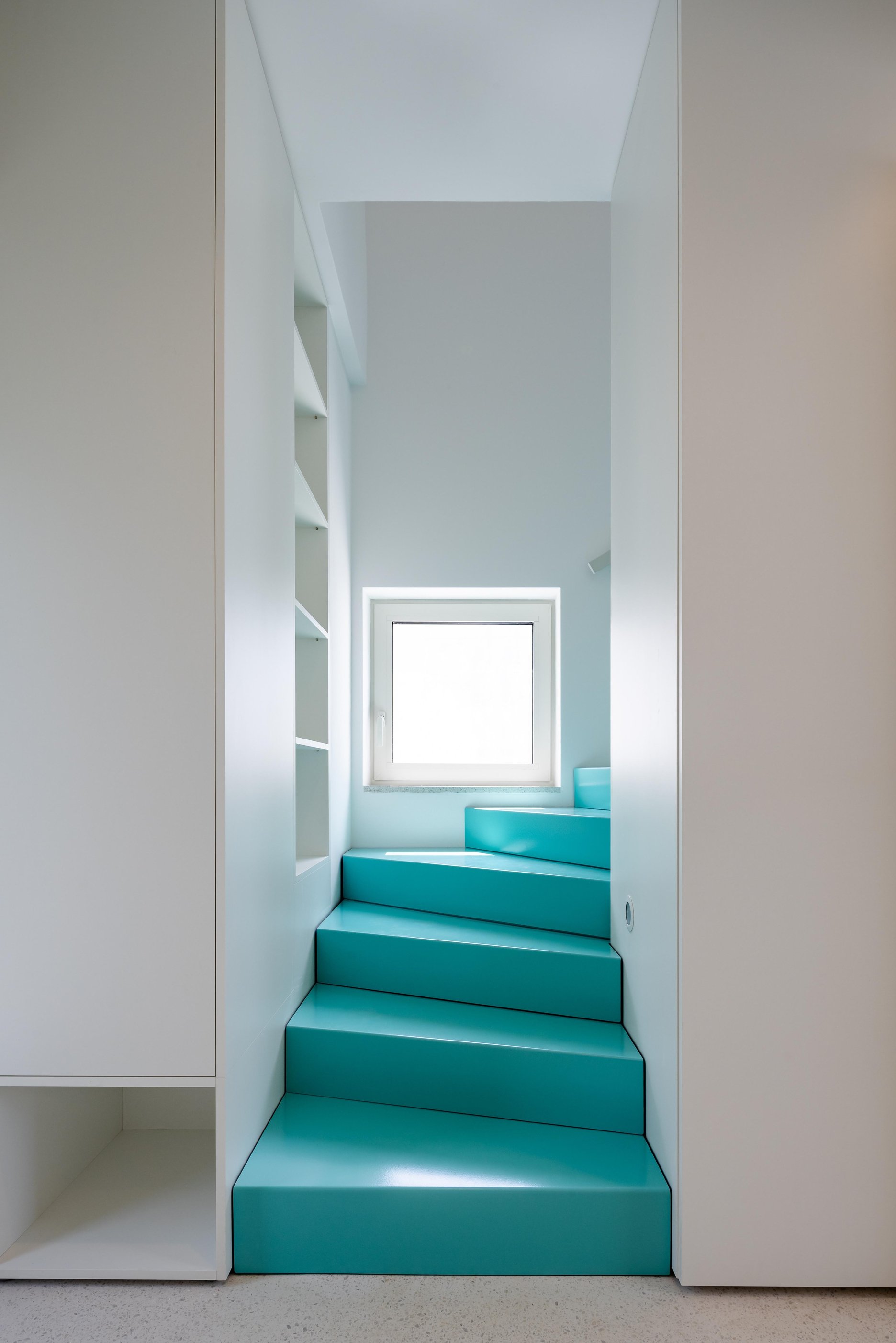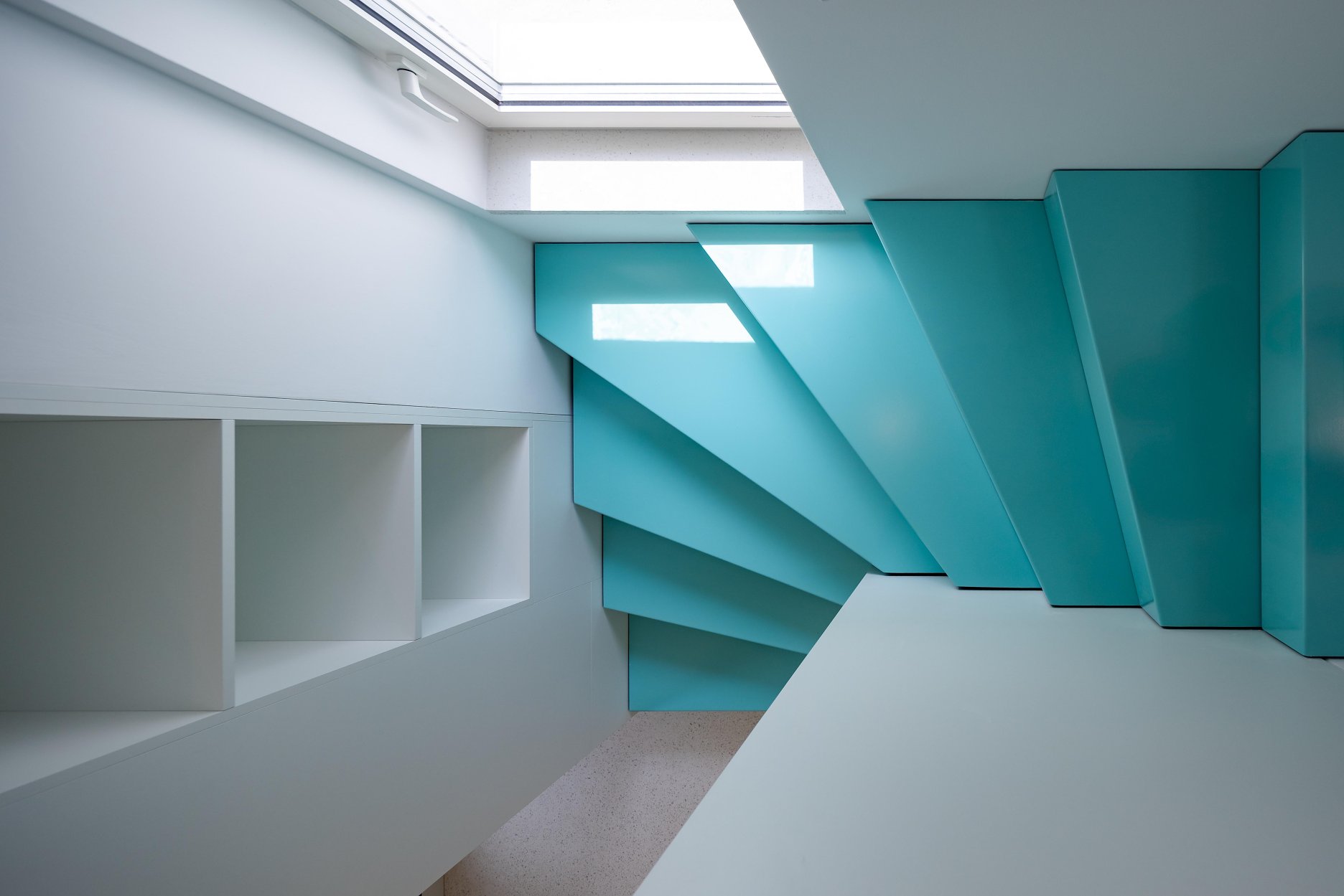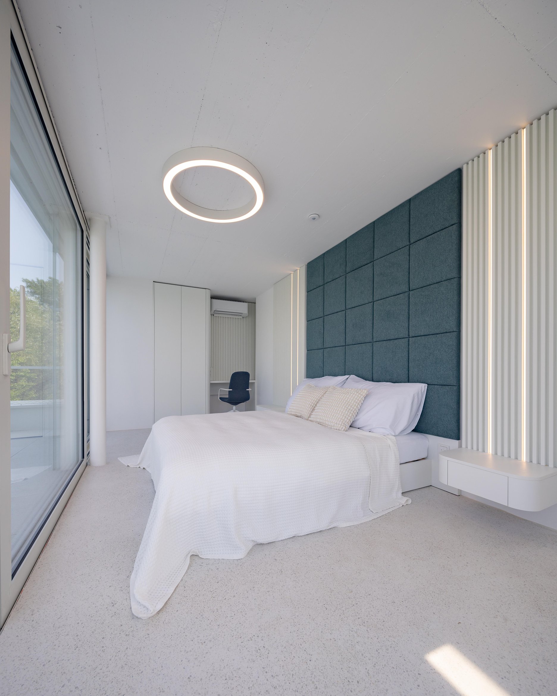 Niektoré steny dopĺňajú biele lamely, ktoré interiéru dodávajú haptickú rozmanitosť a štruktúrnu bohatosť. Akvamarínová farba v akcentoch pôsobí osviežujúco a chladnejšie, čo ocenia užívatelia počas letných mesiacov. Je použitá v poličkových zostavách, v sedení pri vstupe, na schodisku či ako čalúnenie za posteľou, kde zároveň tlmí ozvenu spôsobenú veľkoformátovým presklením.