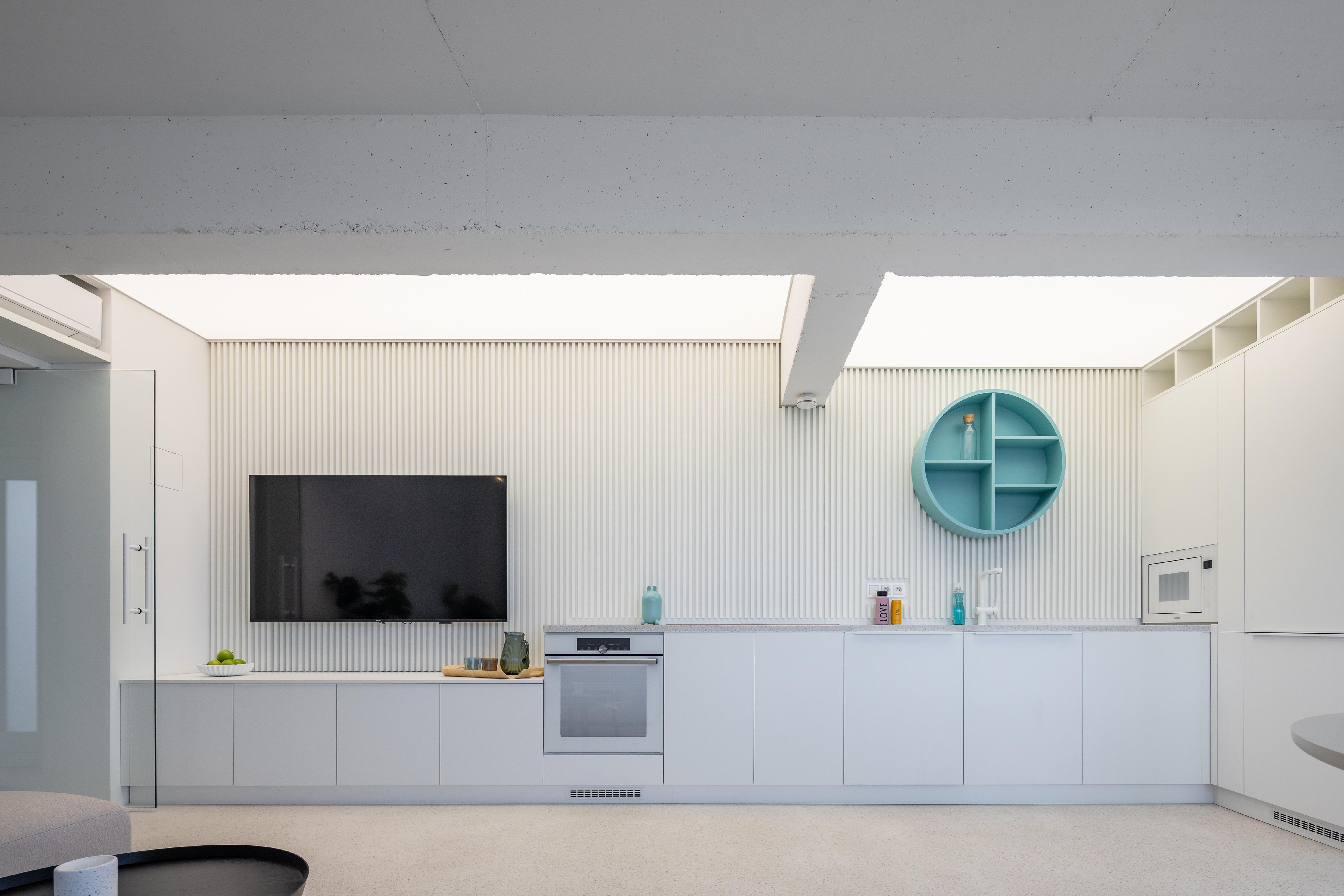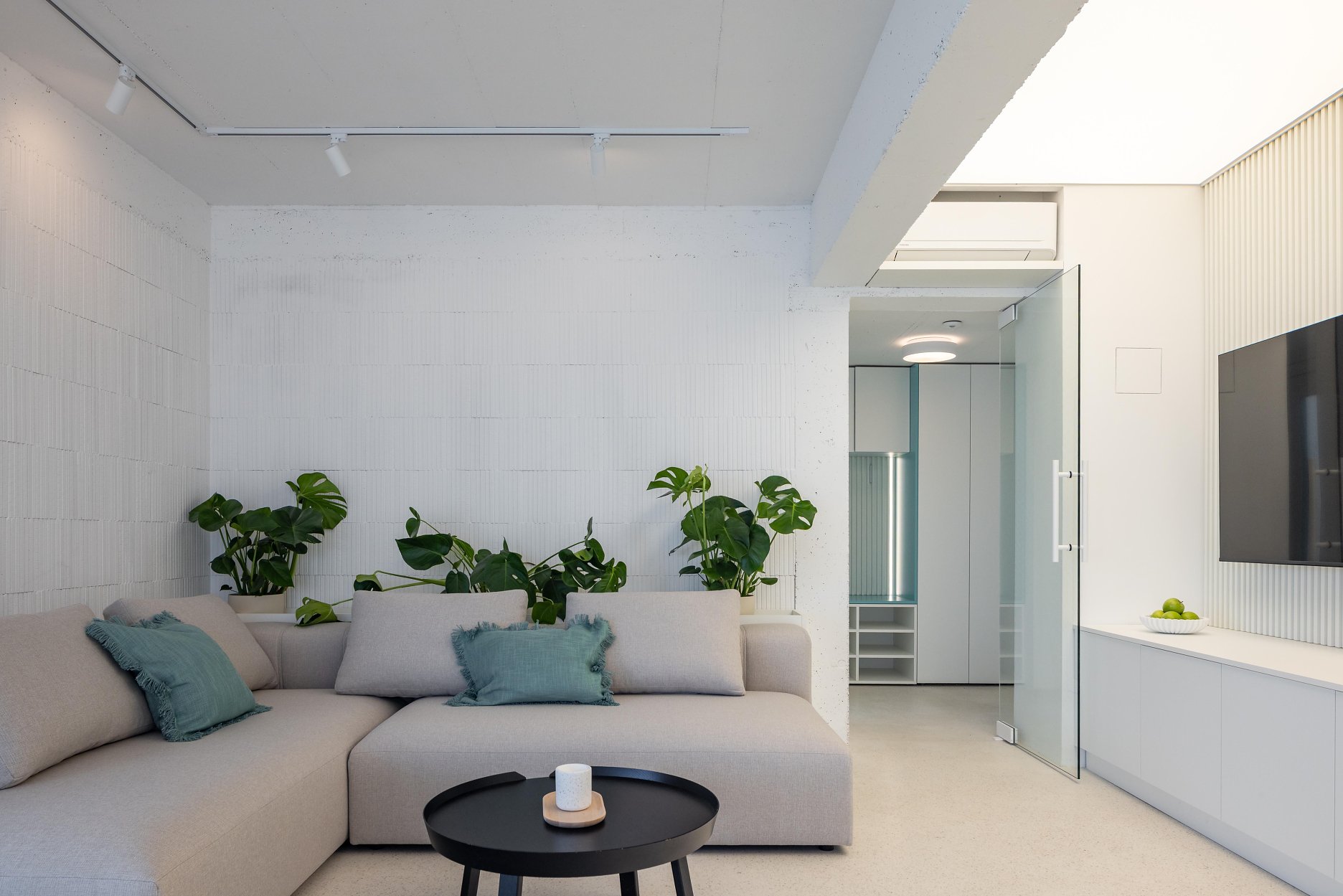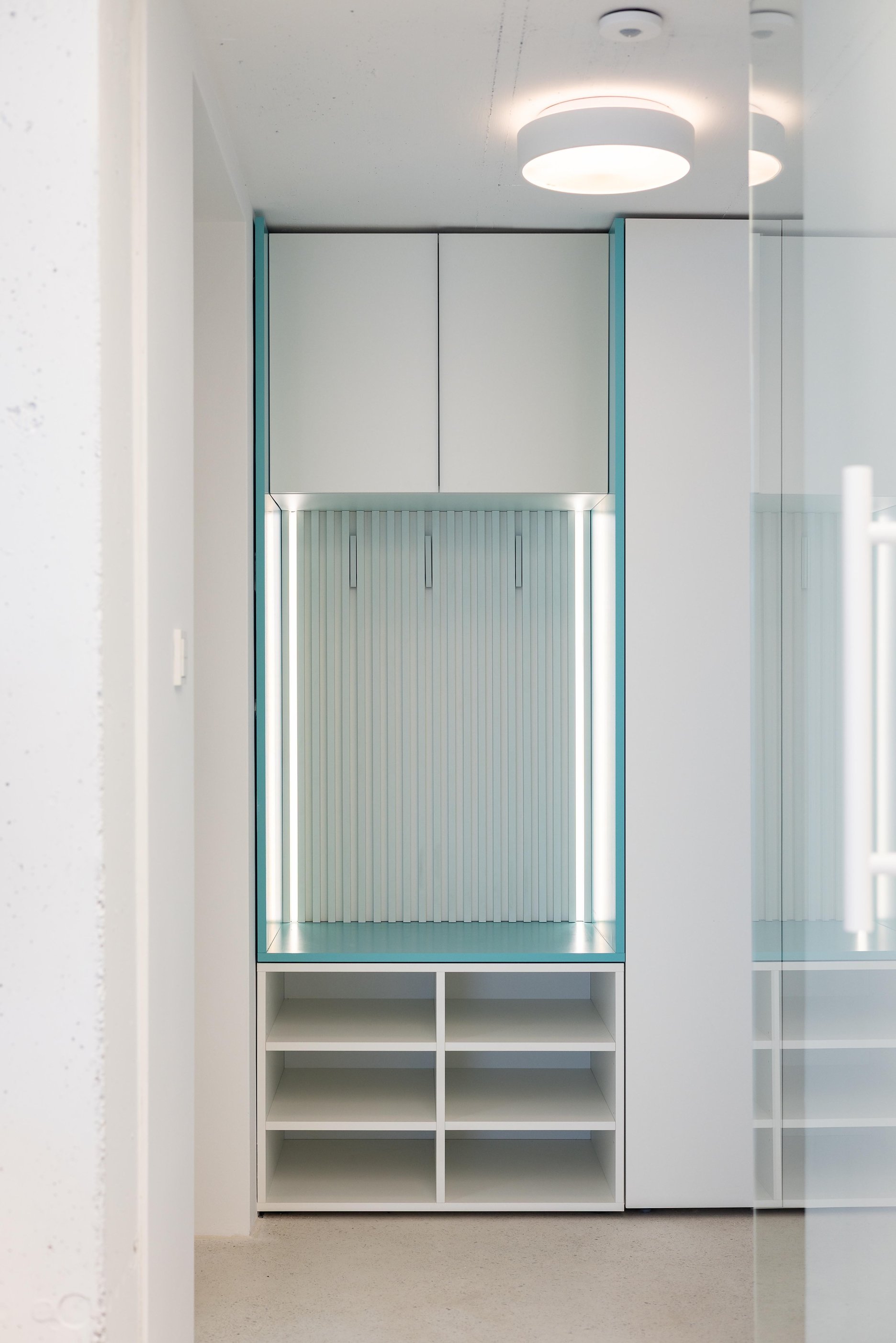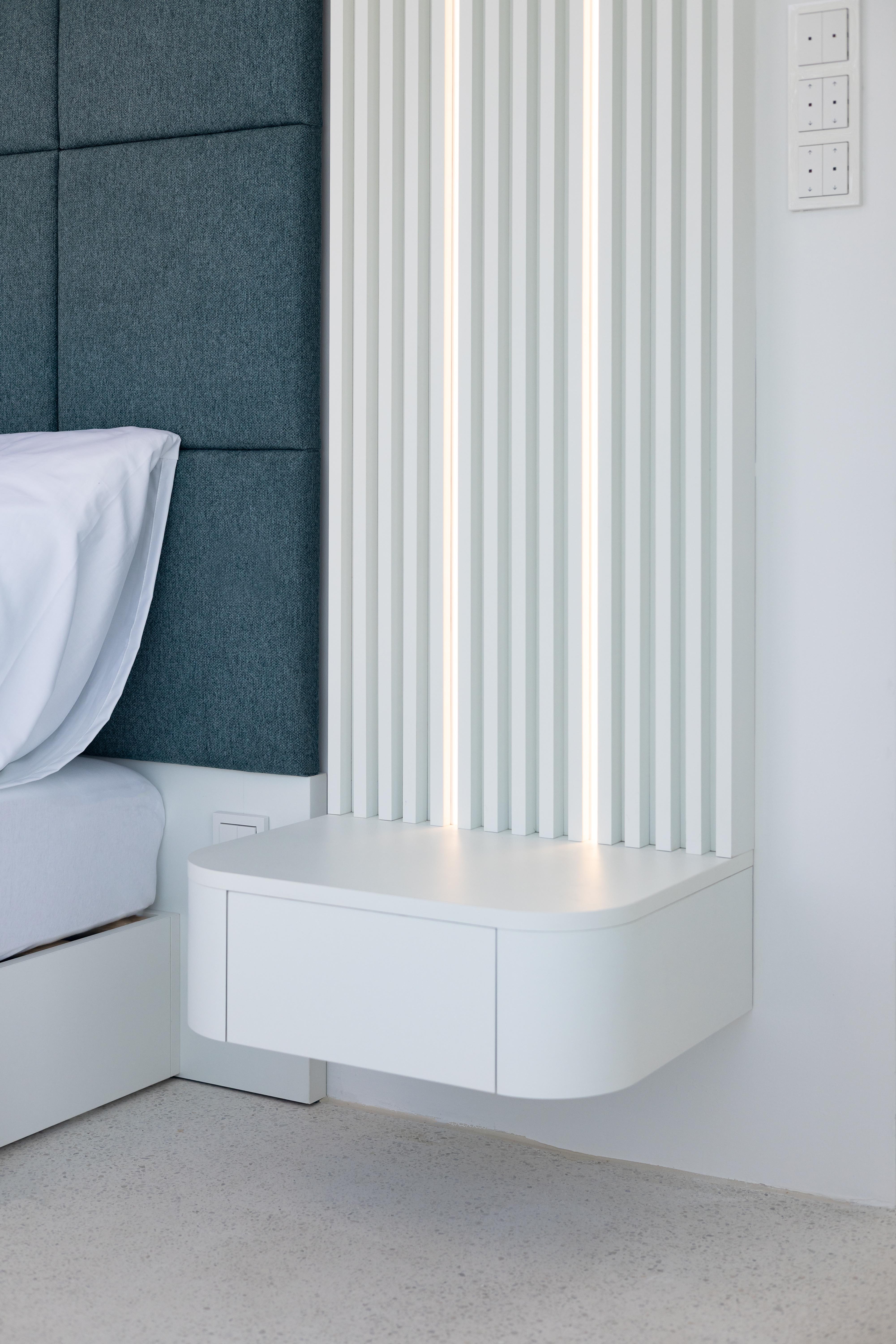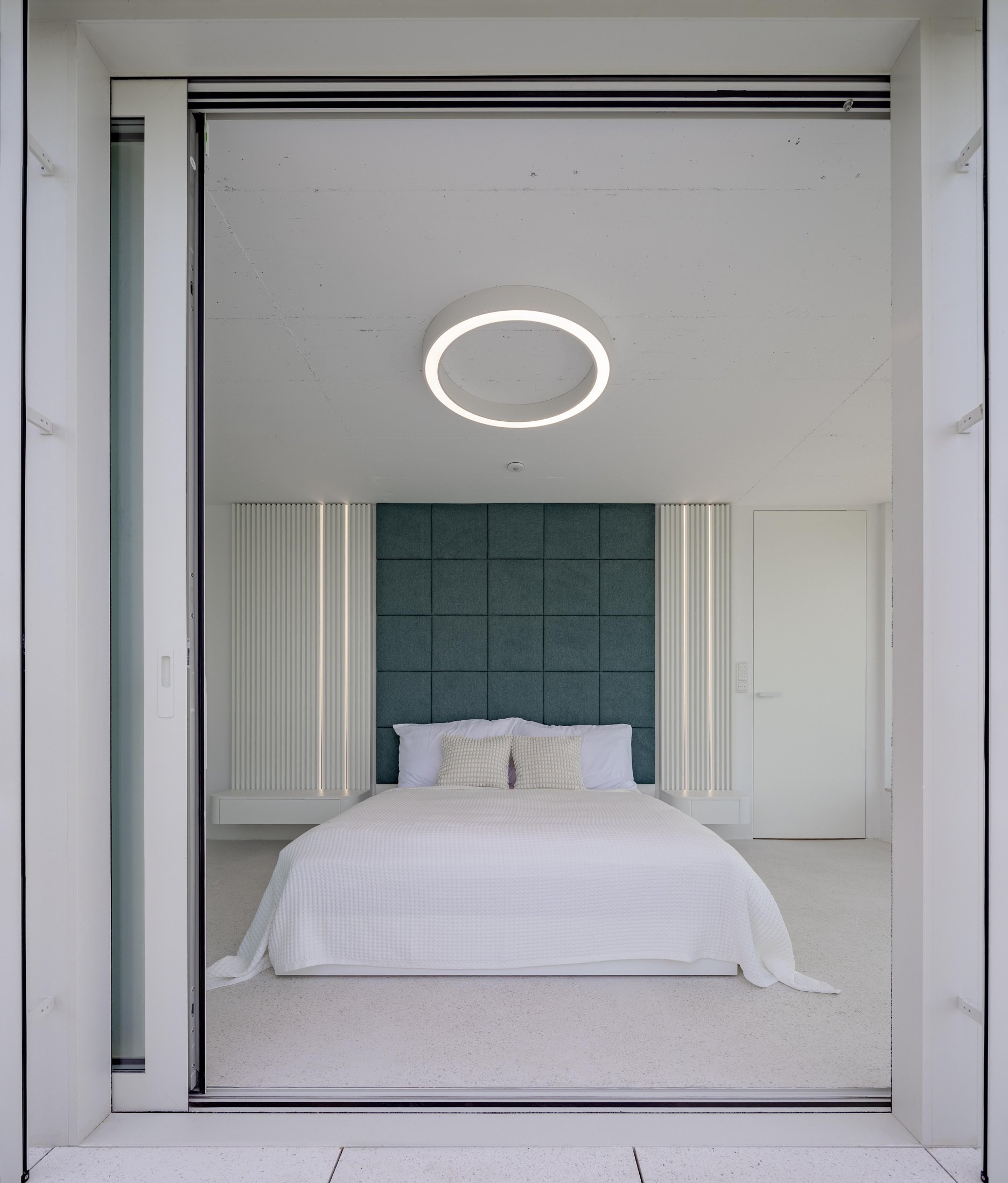 Niektoré steny dopĺňajú biele lamely, ktoré interiéru dodávajú haptickú rozmanitosť a štruktúrnu bohatosť. Akvamarínová farba v akcentoch pôsobí osviežujúco a chladnejšie, čo ocenia užívatelia počas letných mesiacov. Je použitá v poličkových zostavách, v sedení pri vstupe, na schodisku či ako čalúnenie za posteľou, kde zároveň tlmí ozvenu spôsobenú veľkoformátovým presklením.
