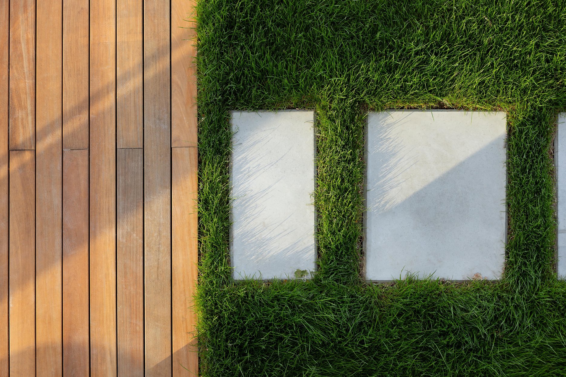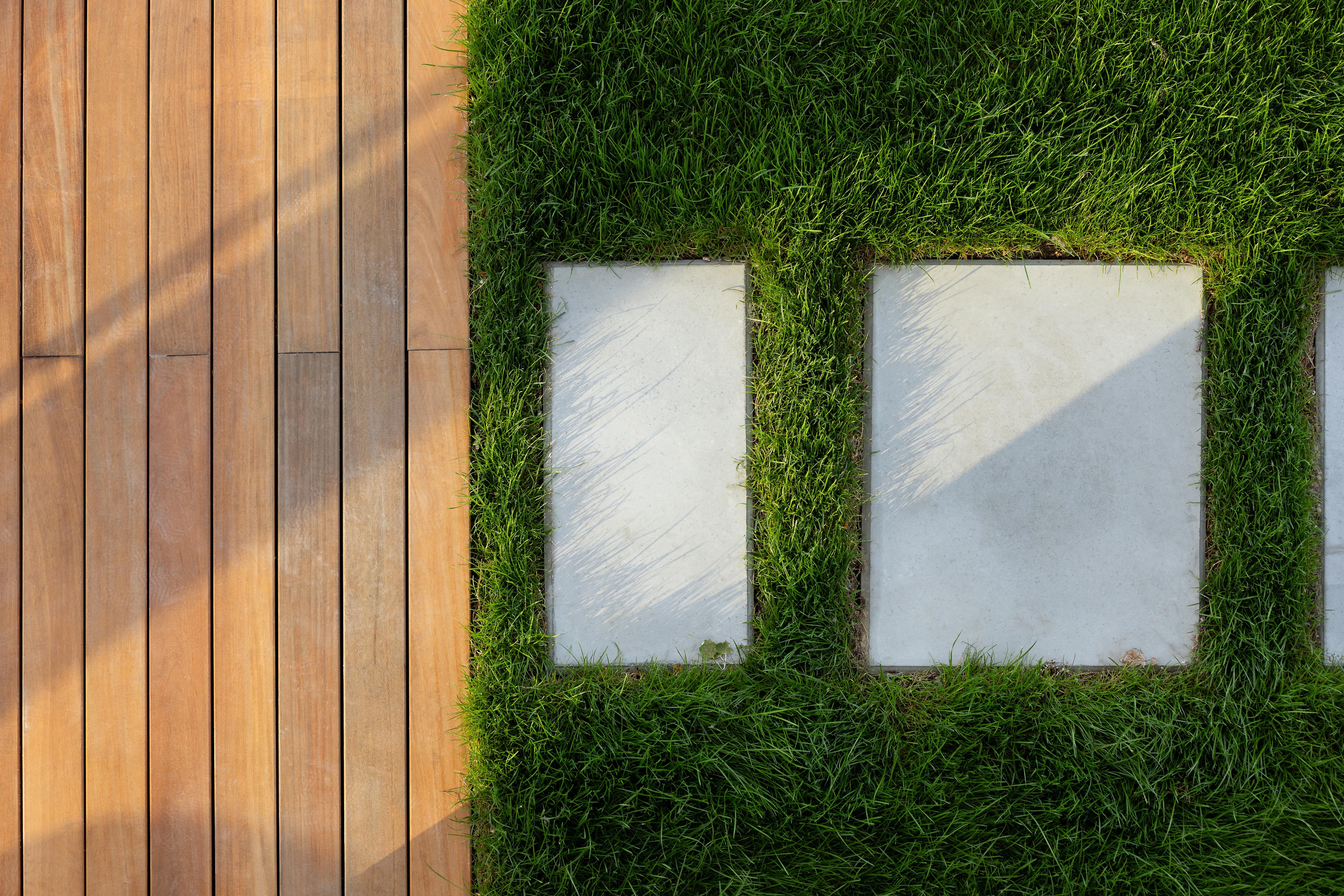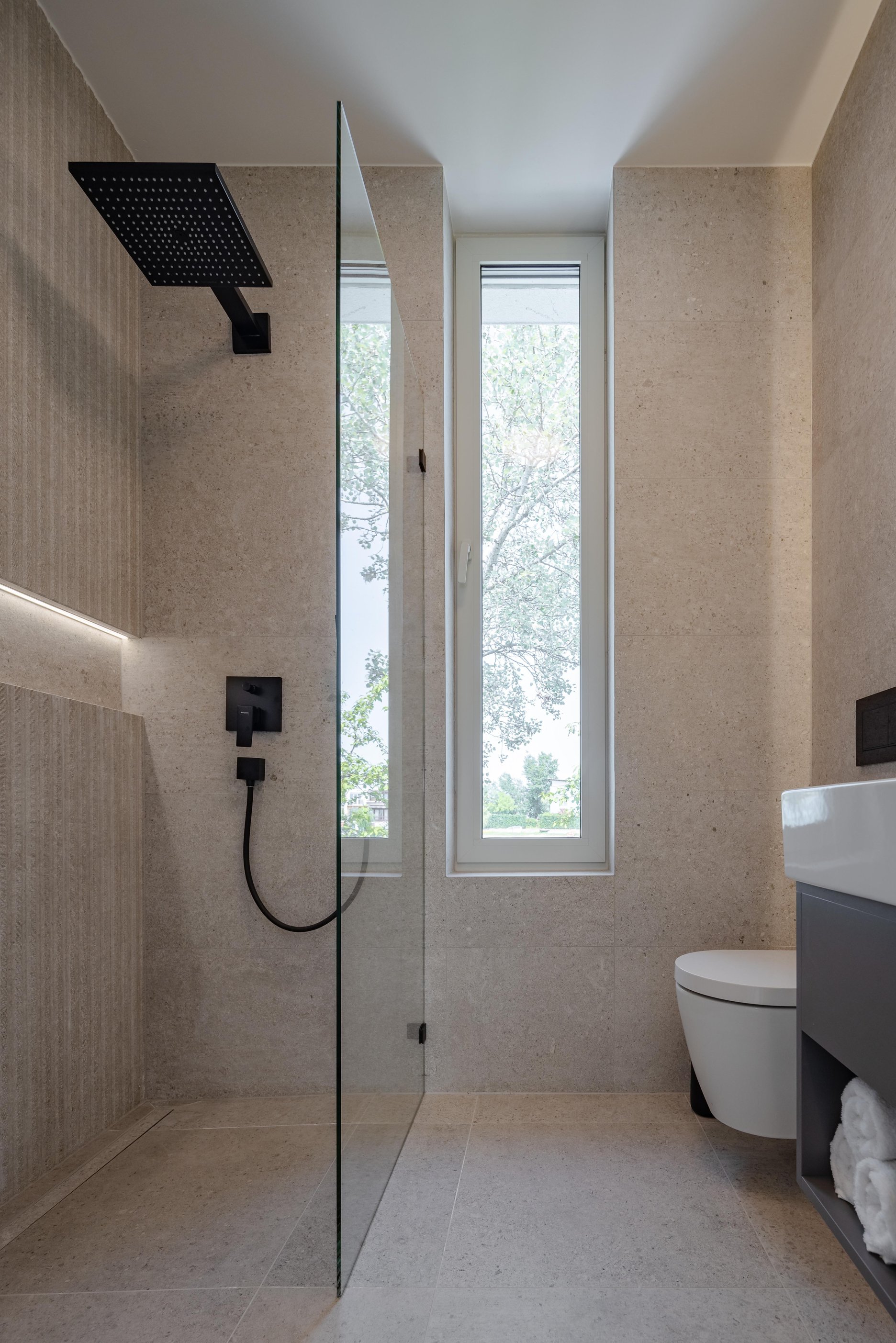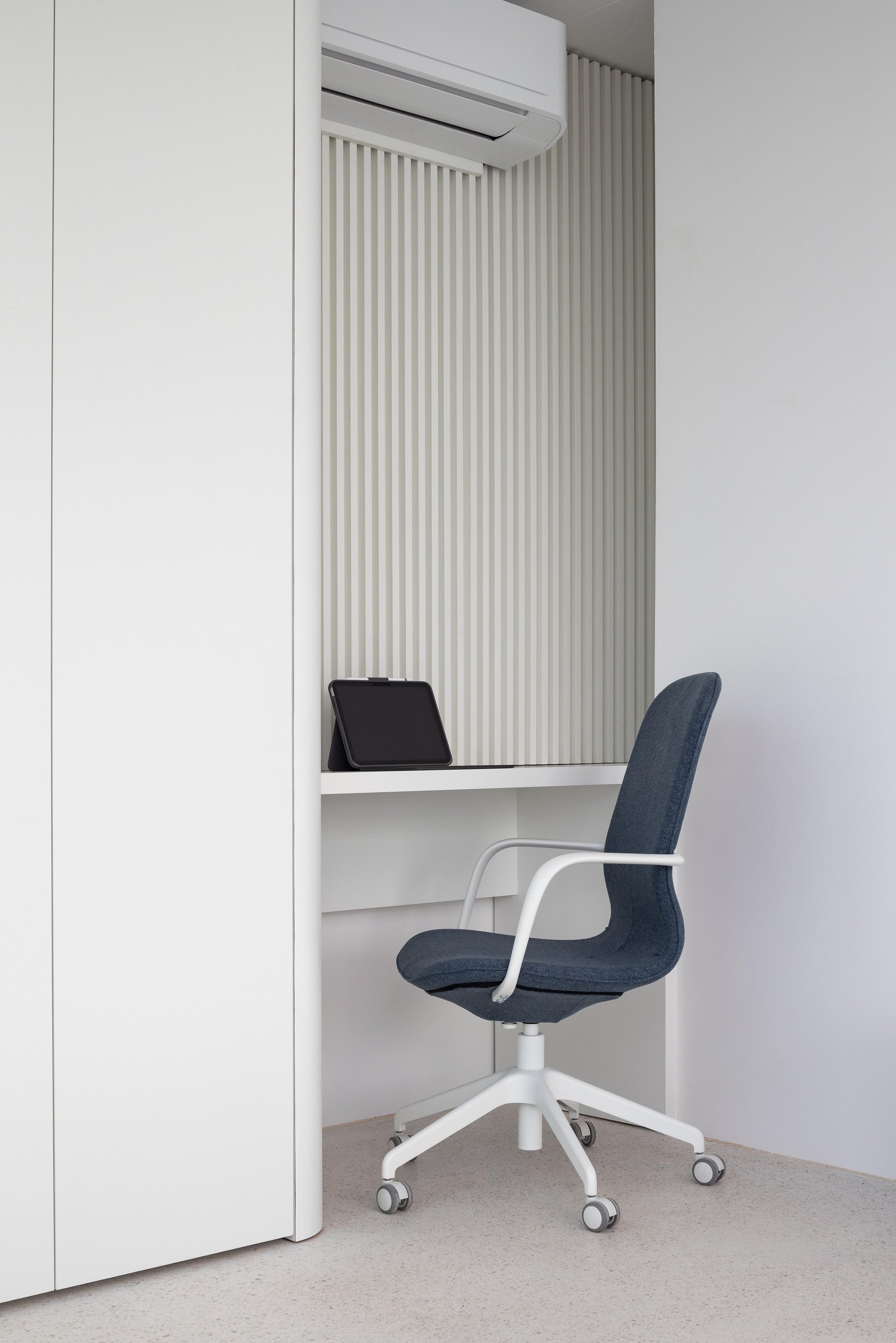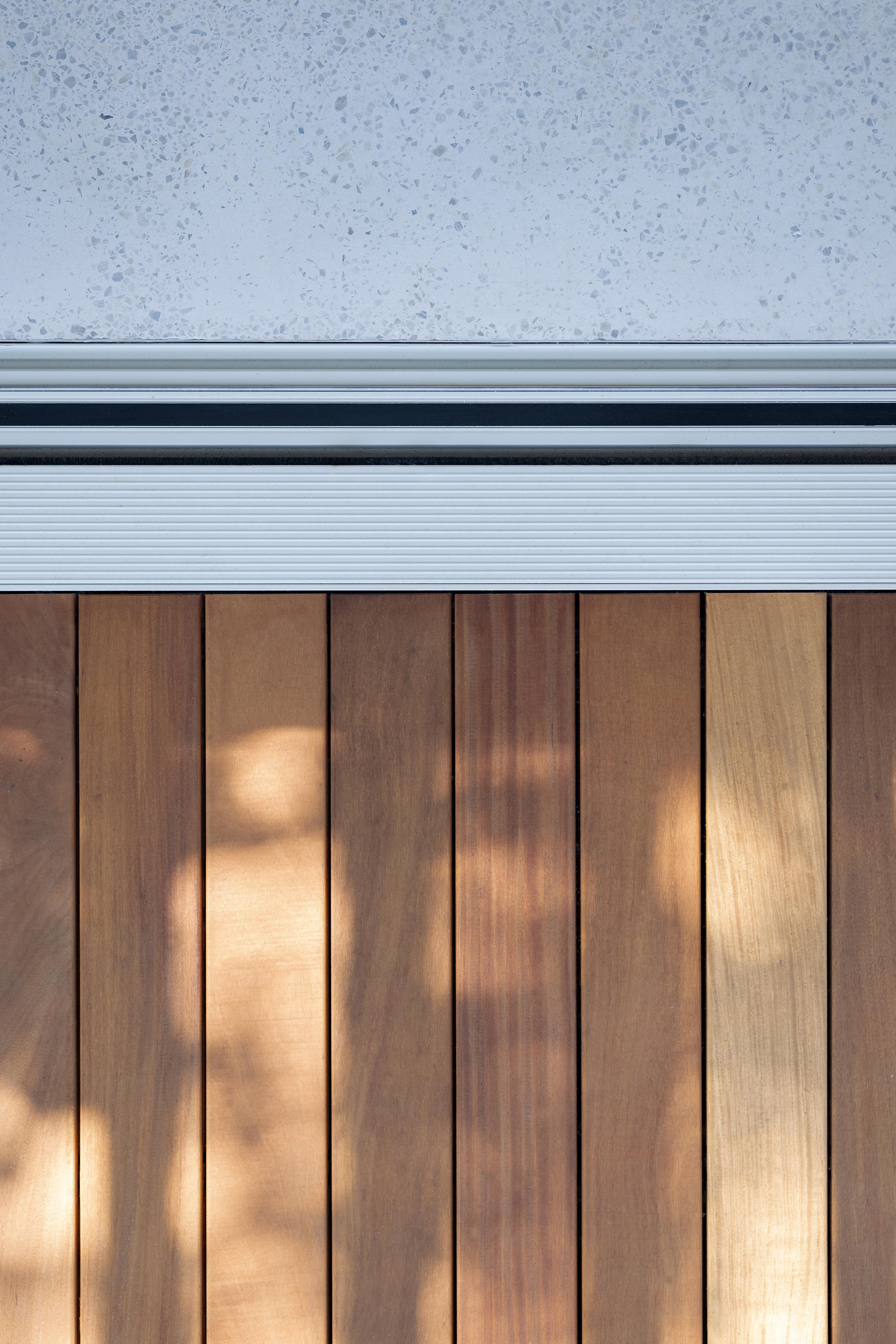 Niektoré steny dopĺňajú biele lamely, ktoré interiéru dodávajú haptickú rozmanitosť a štruktúrnu bohatosť. Akvamarínová farba v akcentoch pôsobí osviežujúco a chladnejšie, čo ocenia užívatelia počas letných mesiacov. Je použitá v poličkových zostavách, v sedení pri vstupe, na schodisku či ako čalúnenie za posteľou, kde zároveň tlmí ozvenu spôsobenú veľkoformátovým presklením.