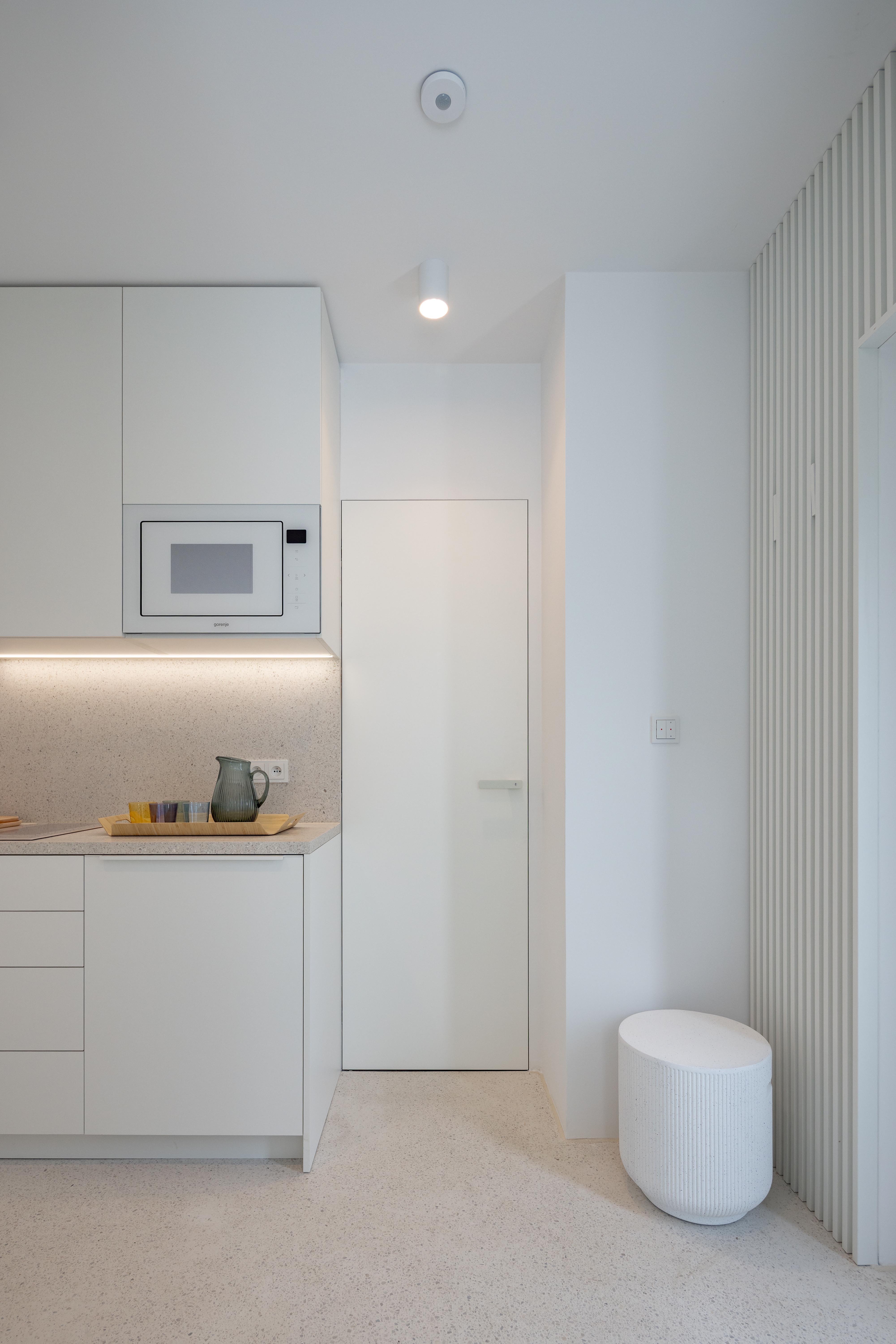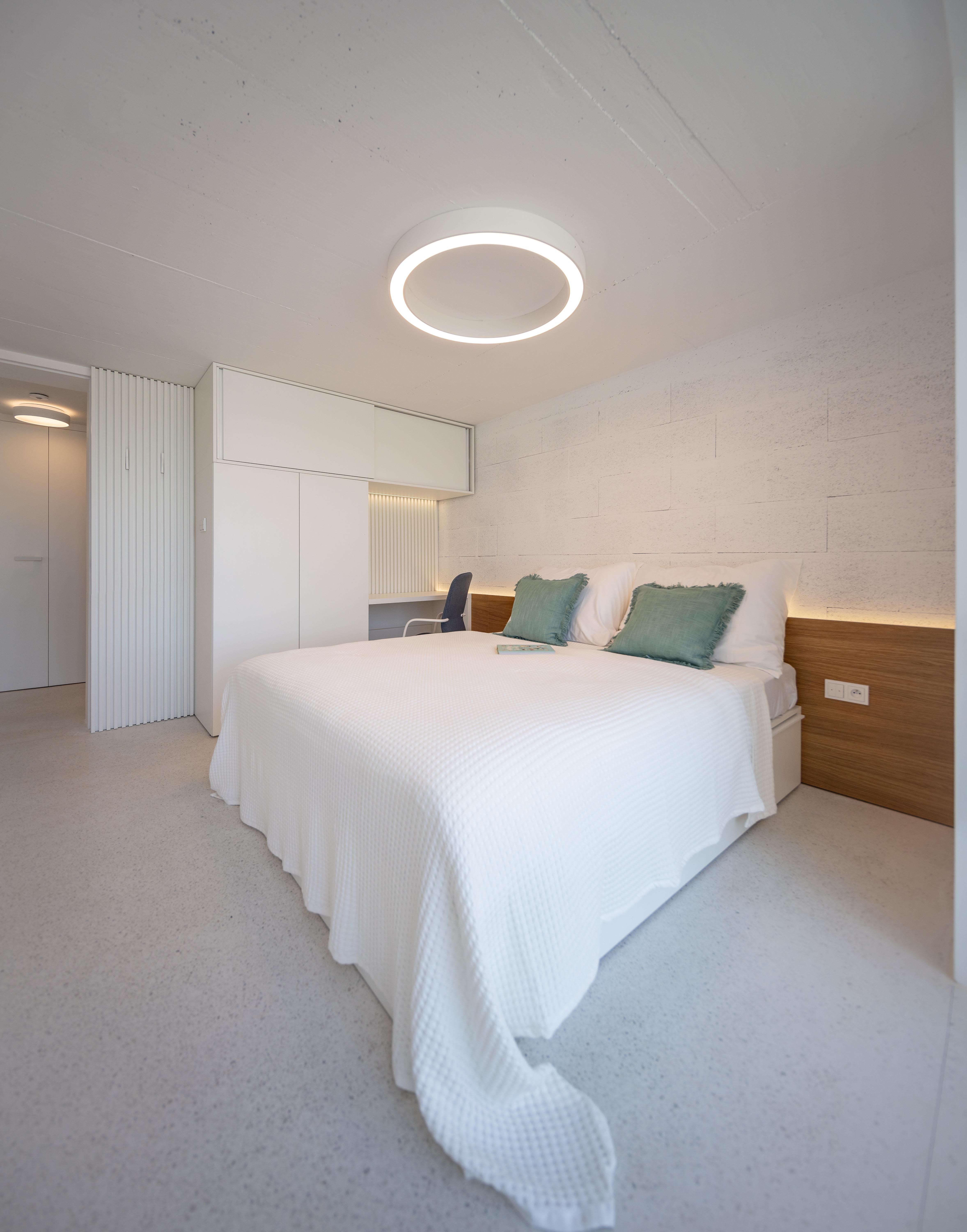 Jedna zo spální je orientovaná na sever, preto má zástenu za posteľou z dubového dreva, ktorá priestor opticky zohrieva a zútulňuje. Podlahy, pracovné dosky v kuchyni, schody aj parapetné dosky sú riešené z terazza s bielym pigmentovaným cementom.