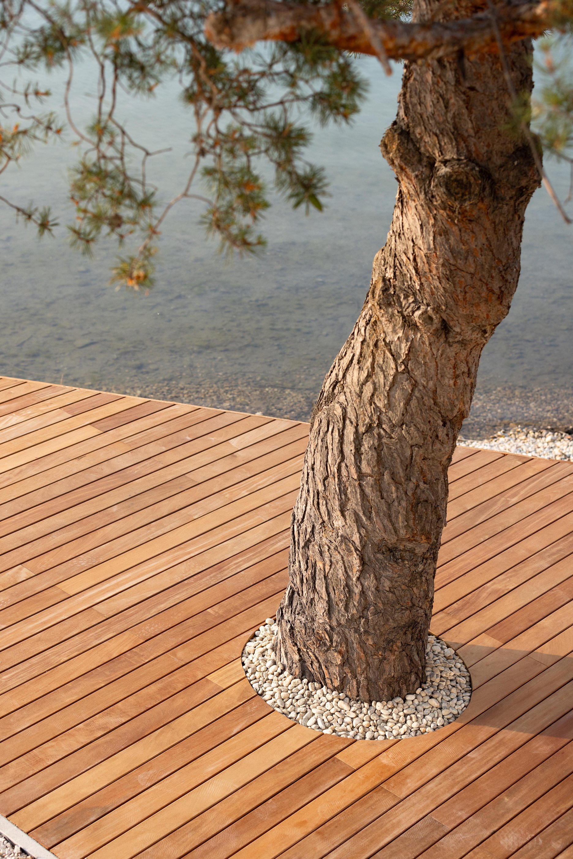 Okolie sa vyčistilo pri zachovaní vysokých stromov a doplnilo o novú výsadbu. Pred objektom, nad brehom, vznikla nová drevená terasa, ktorá opticky uzatvorila priestor nad pôvodnými betónovými stenami. Pobrežie bolo spevnené riečnym štrkom a príjazdová komunikácia s odstavnými plochami sa zjednotila vysypaním drobného lomového kameňa.