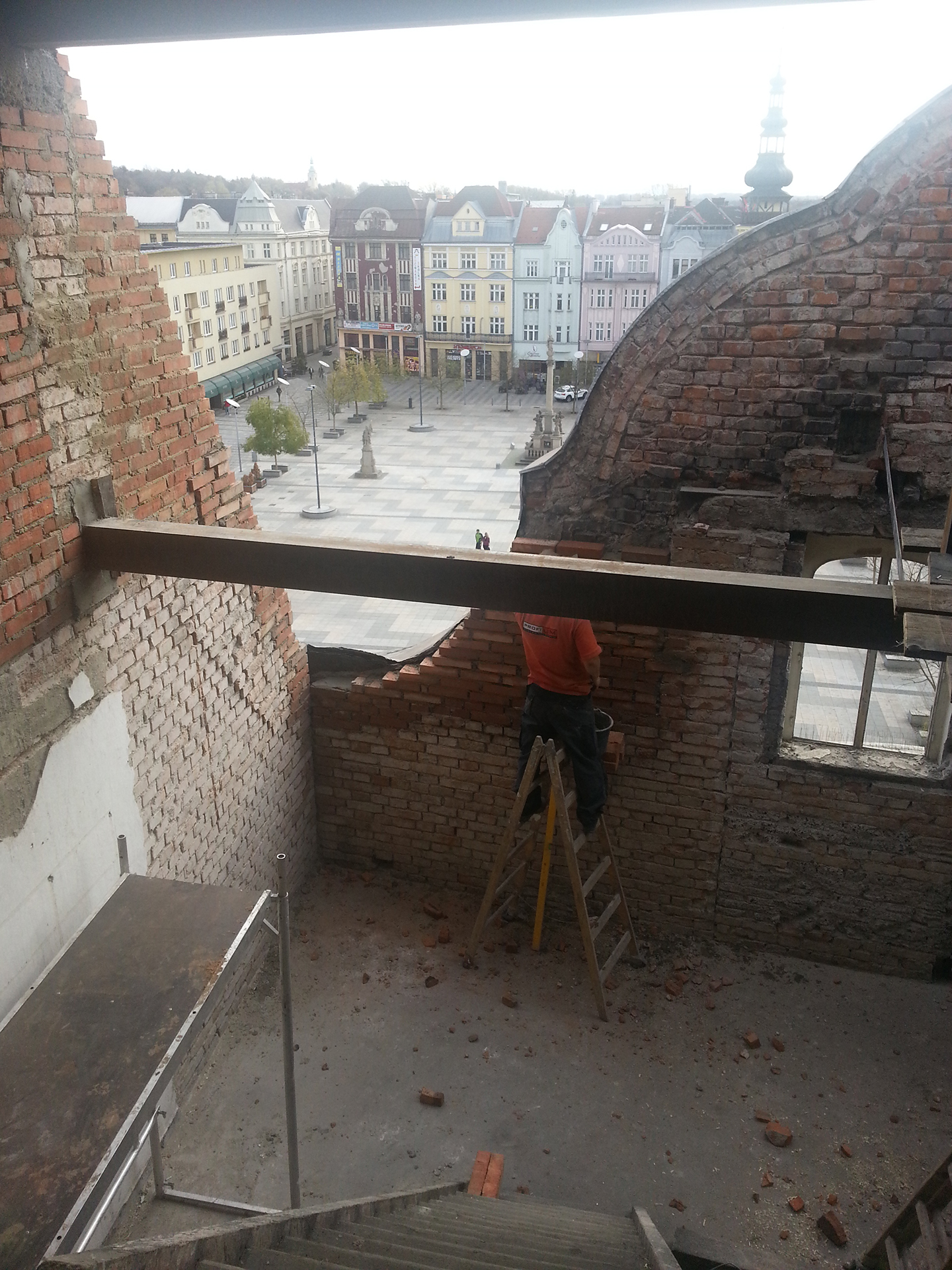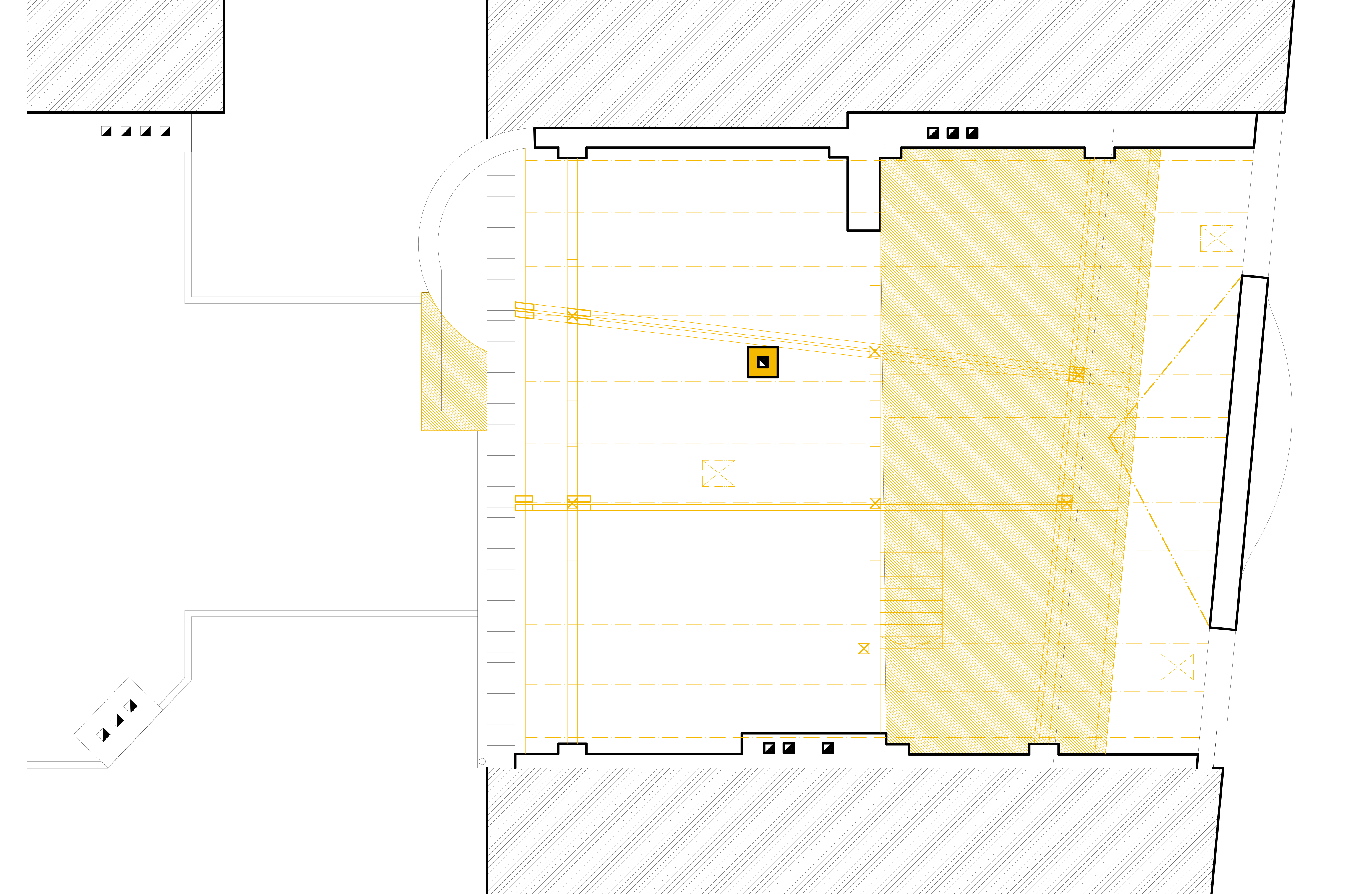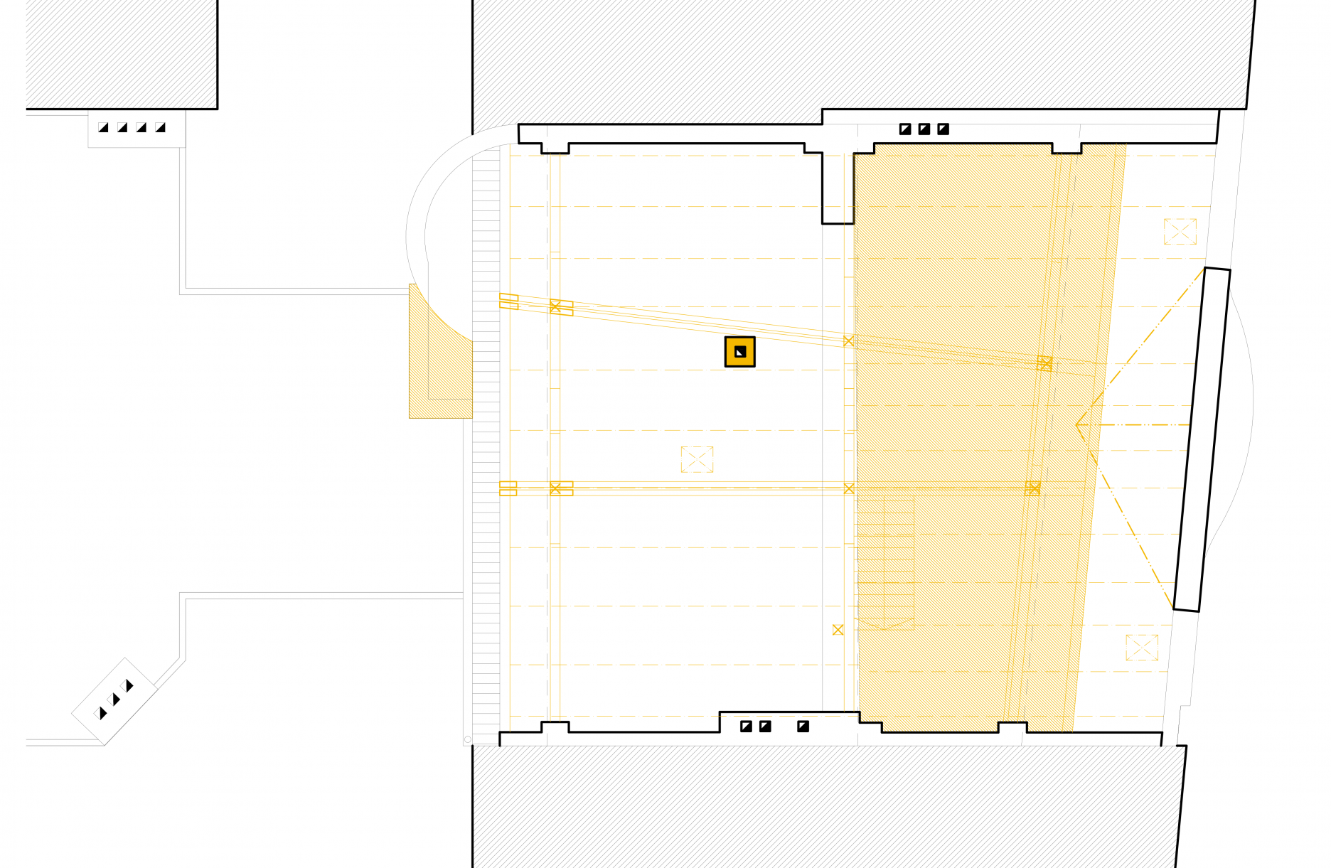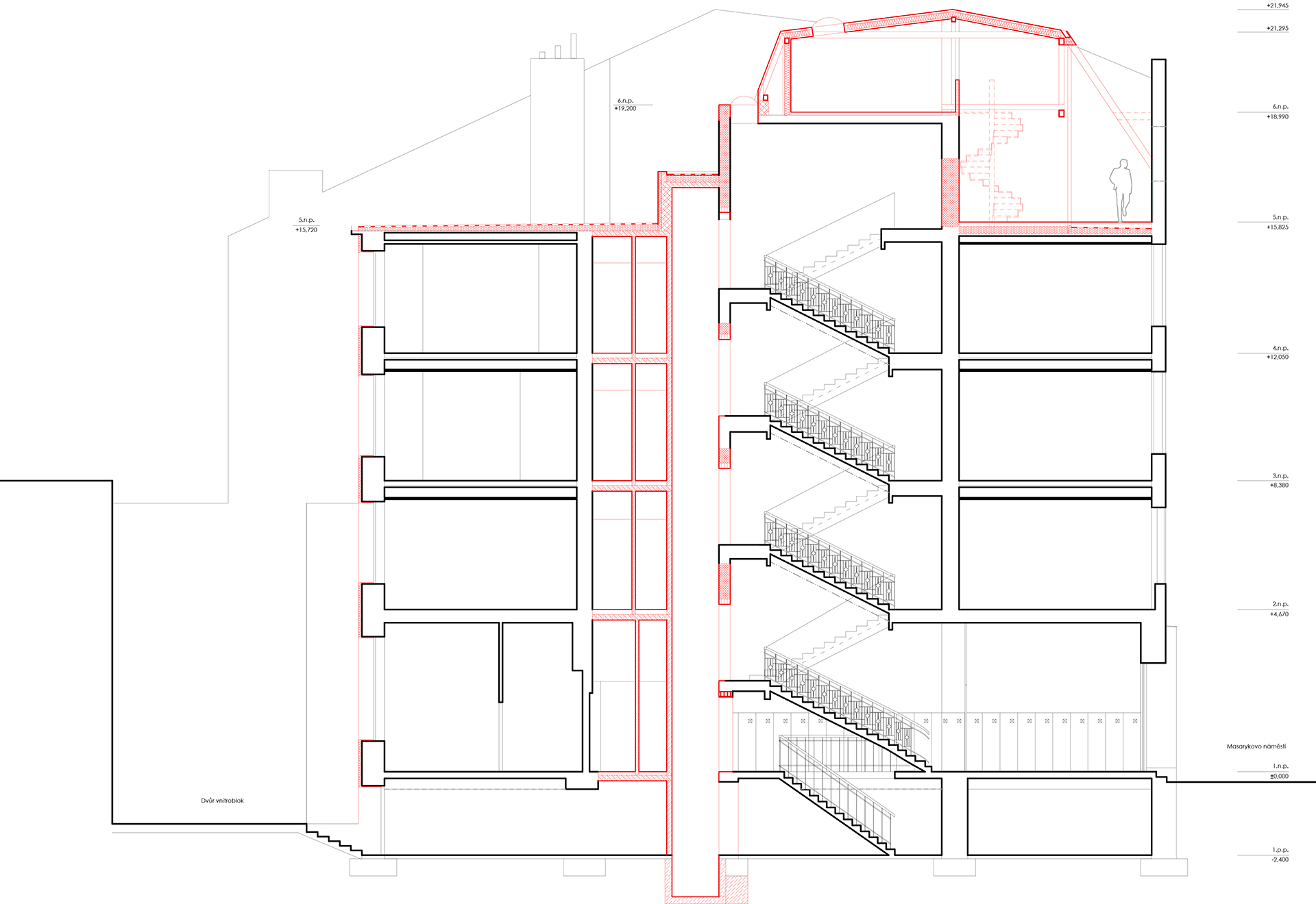 Pri zachovaní celej strechy v pôvodnej podobe by nebolo možné tieto priestory dlhodobo využiť a stali by sa tak mŕtvymi priestormi domu. Návrh citlivo zachováva obrys manzardovej strechy a nenarušuje celkový dojem vnímania tejto strechy z priestoru námestia. Aj napriek vloženiu zvislej zasklenej steny je zachovaný pôvodný obrys manzardy. Šikmé vonkajšie lamely potrebné pre tienenie (celá fasáda je na južnej strane) vytvárajú vertikálne členenie v smere pôvodnej strešnej roviny.