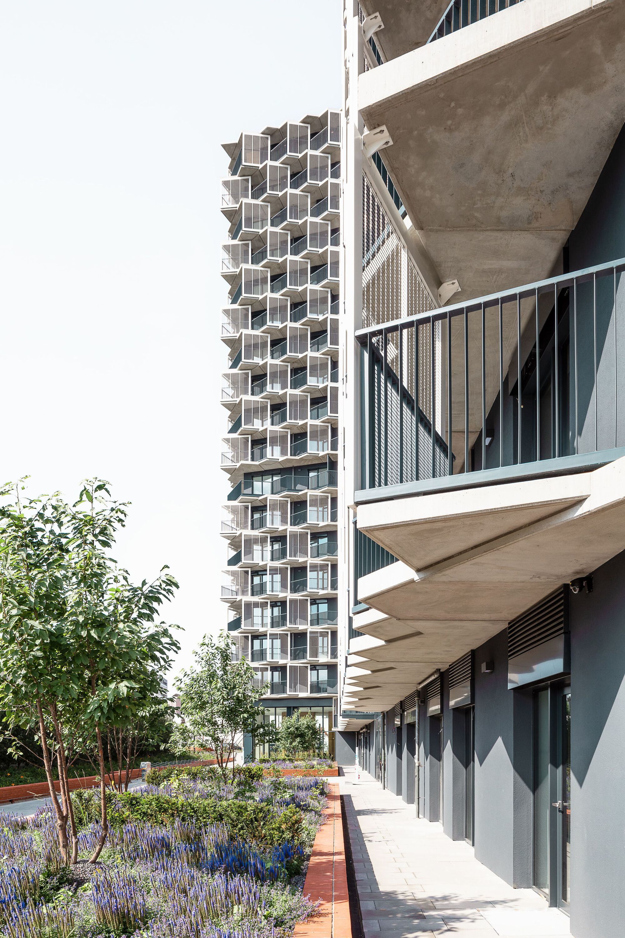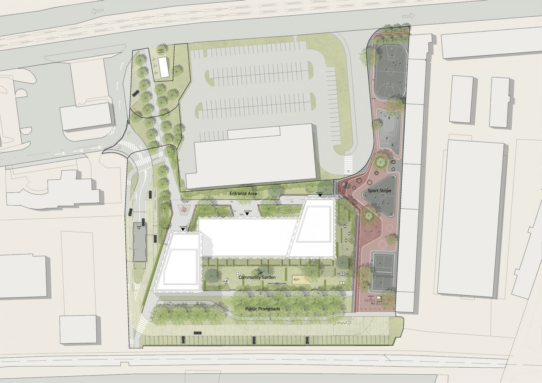 Dôležitú súčasť komplexu tvorí krajinársky koncept zelených plôch a dažďových záhrad, ktorý vychádza z návrhu berlínskeho ateliéru MAN MADE LAND. Zeleň nájdeme aj na streche stredného traktu.
