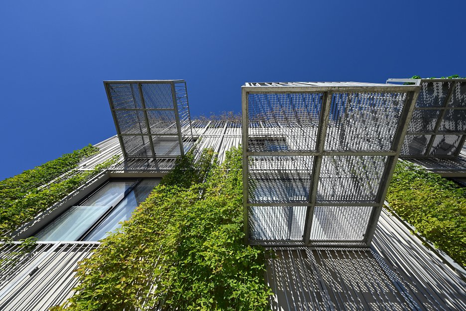 ...vysvetľujú autori. Racionálny priestorový rámec dopĺňajú dynamické elementy fasády. Nerezové prúty obaľujú fasádu a plynule prechádzajú až do zábradlí balkónov a terás. Súčasne slúžia ako celoplošná treláž pre popínavú zeleň, šplhajúcu sa zo zeme aj strešnej záhrady.