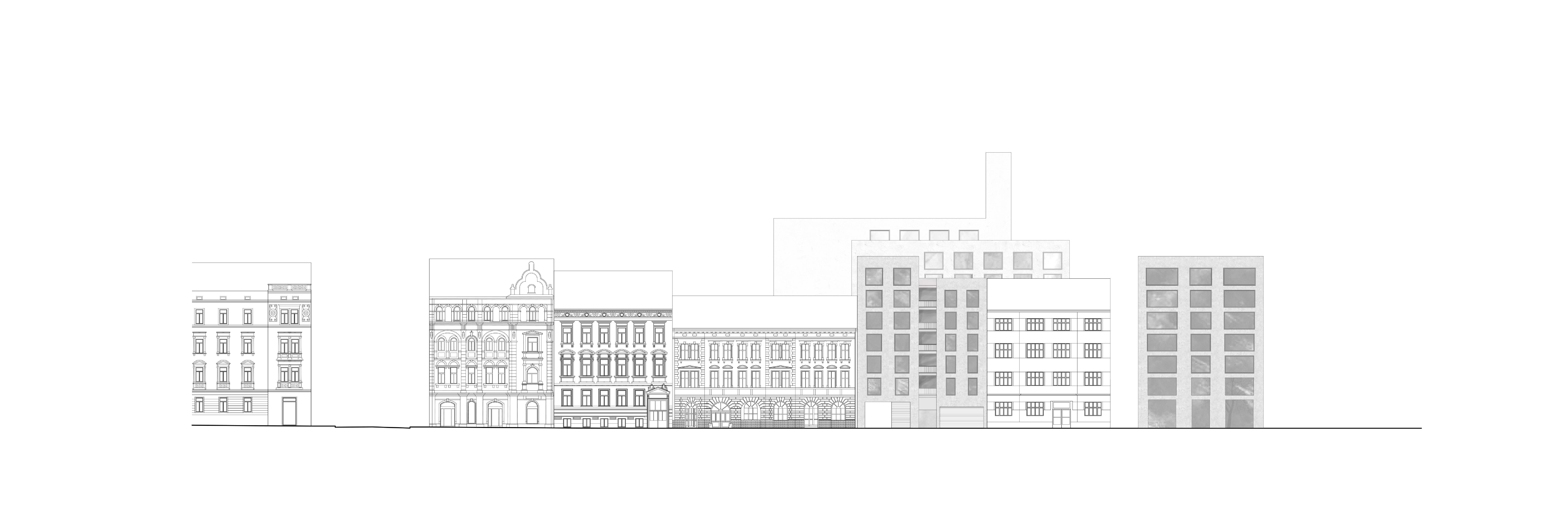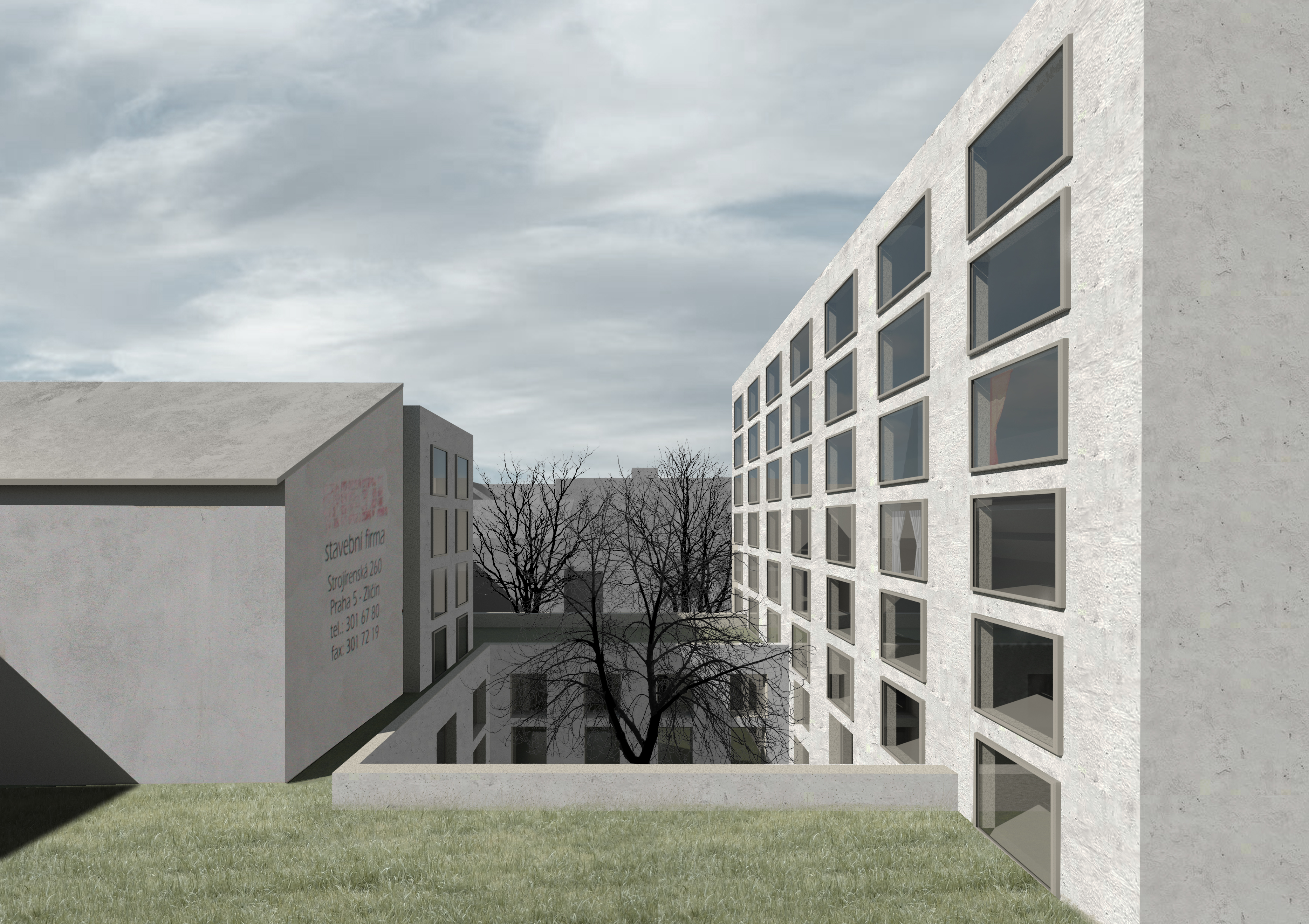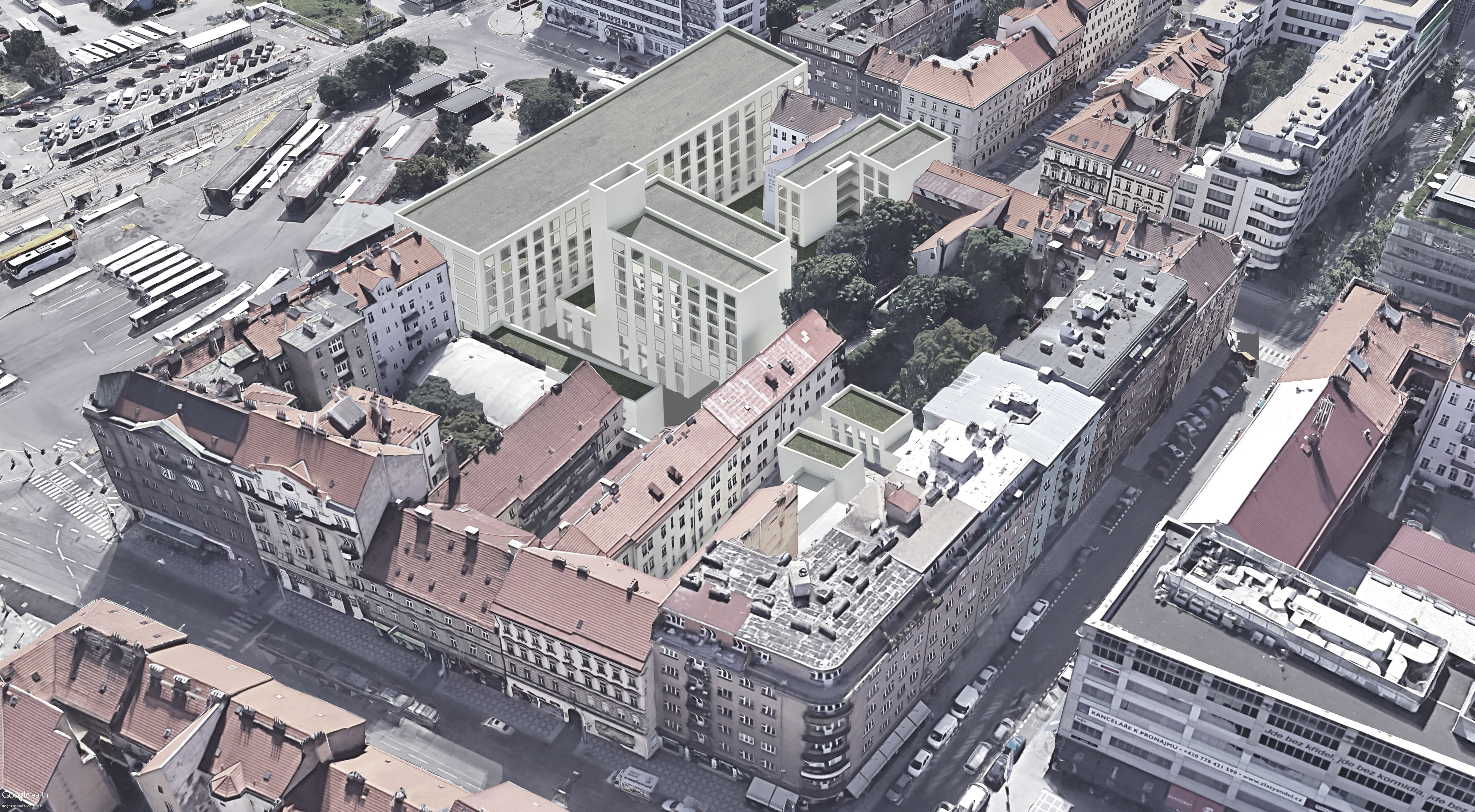 Vzniká útvar, který se skládá z objemů nejrůznějších měřítek počínaje největším objemem podél Ulice Ostrovského, až po drobné plomby, které nacházíme hluboko ve struktuře bloku. Tomáš Gelien využívá rigidní fasádu charakterizovanou rastrem velkoformátových oken aby veškerou novou hmotu sjednotil do jednoho organizmu, který blokem prorůstá a na několika místech se z něho vynořuje. Tímto způsobem se daří i integrace výdechu metra do celkového útvaru.