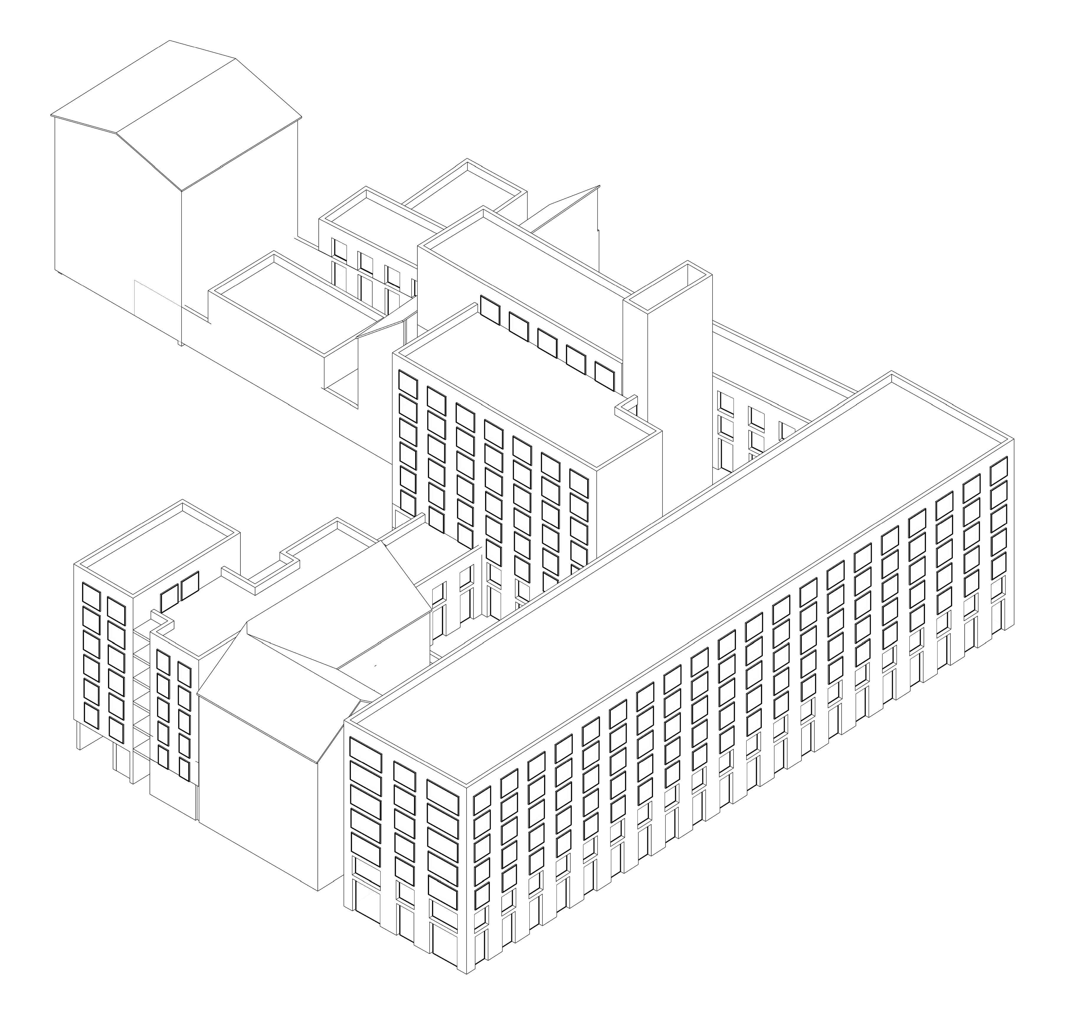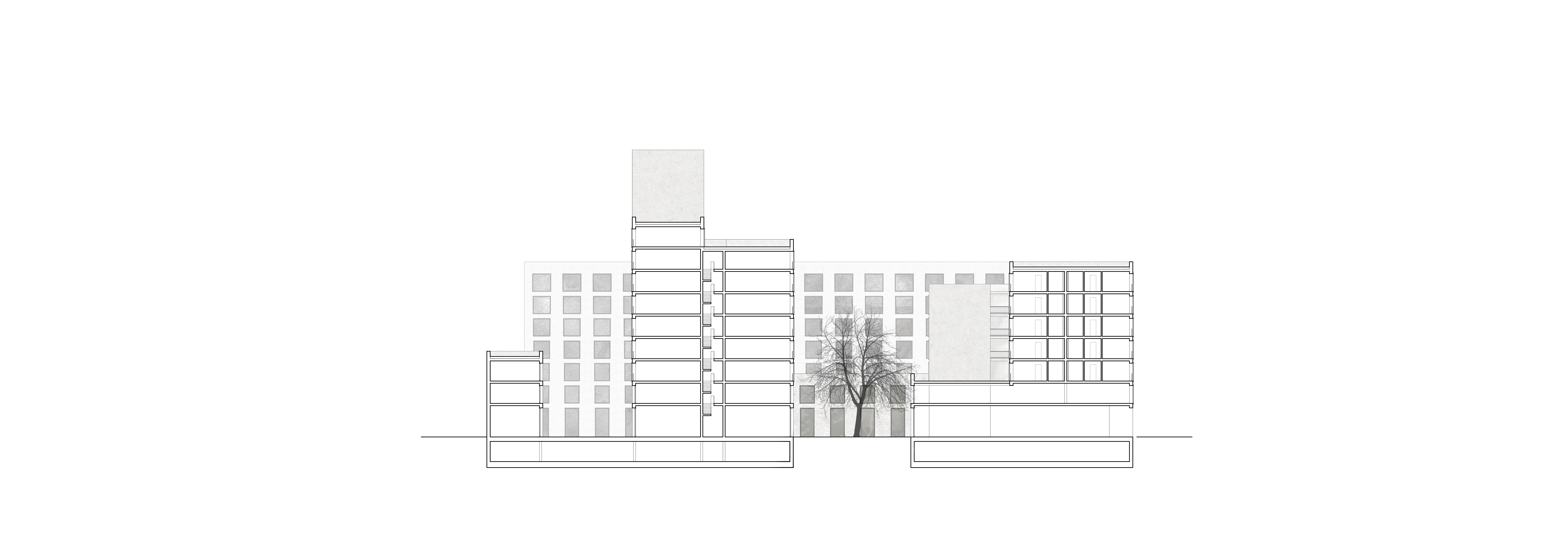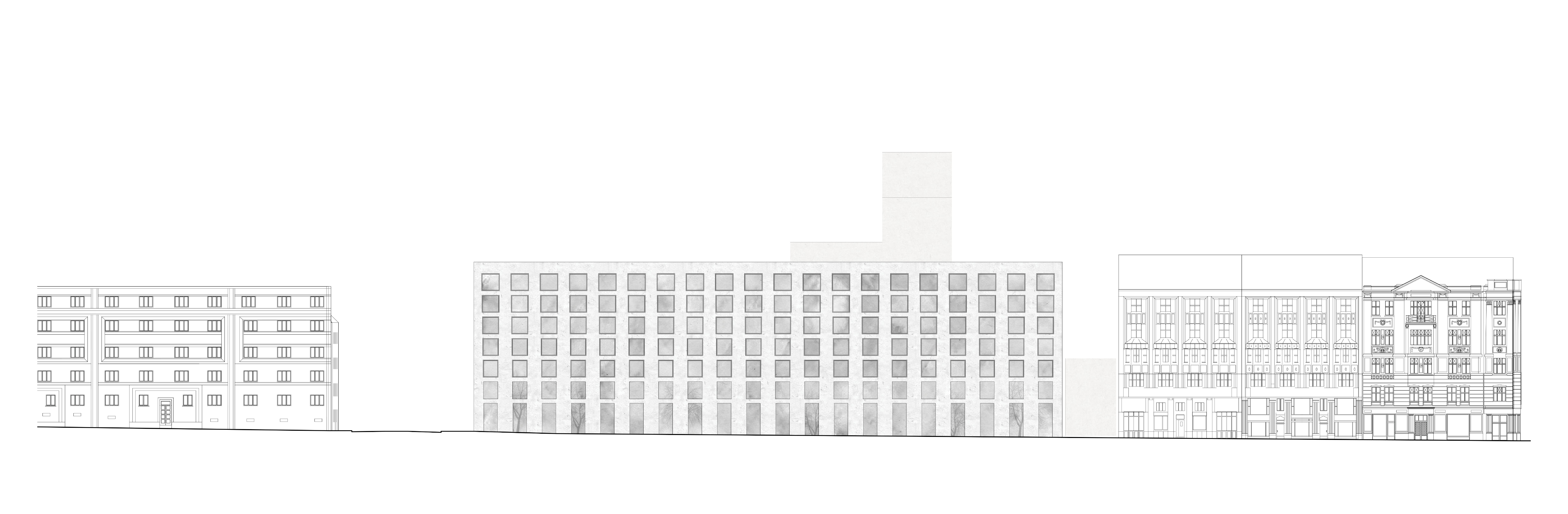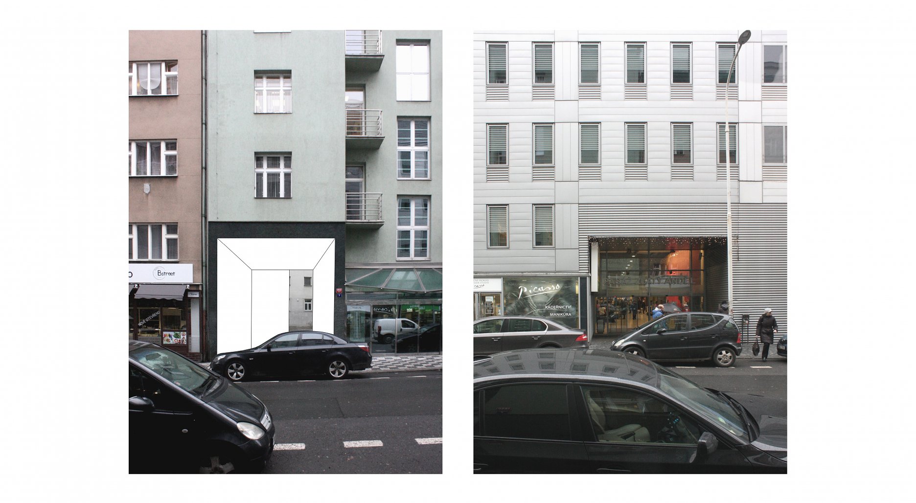 Vzniká útvar, který se skládá z objemů nejrůznějších měřítek počínaje největším objemem podél Ulice Ostrovského, až po drobné plomby, které nacházíme hluboko ve struktuře bloku. Tomáš Gelien využívá rigidní fasádu charakterizovanou rastrem velkoformátových oken aby veškerou novou hmotu sjednotil do jednoho organizmu, který blokem prorůstá a na několika místech se z něho vynořuje. Tímto způsobem se daří i integrace výdechu metra do celkového útvaru.