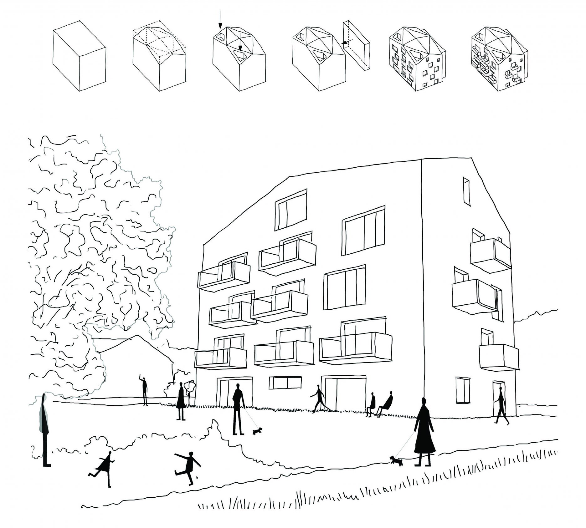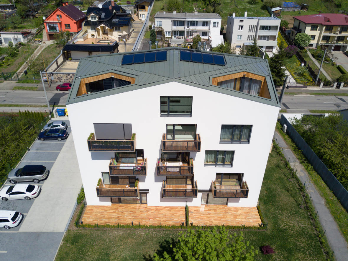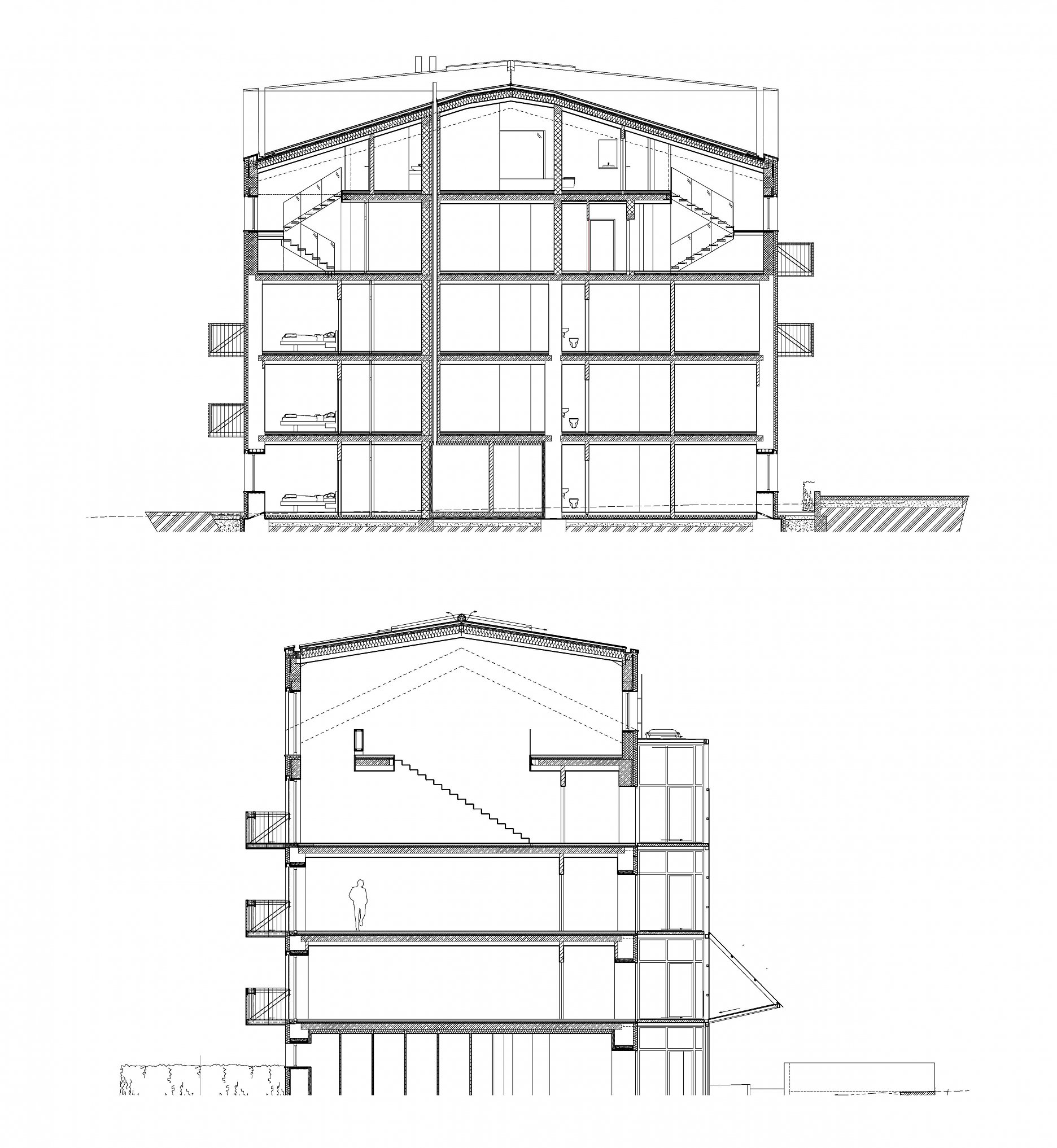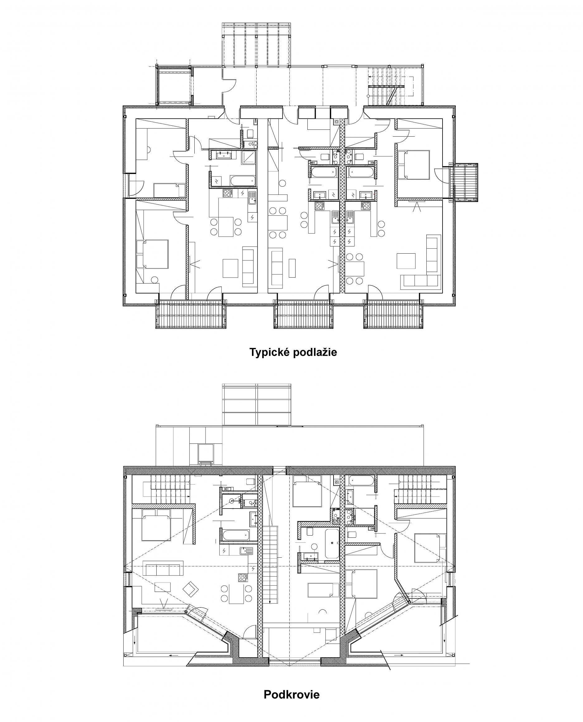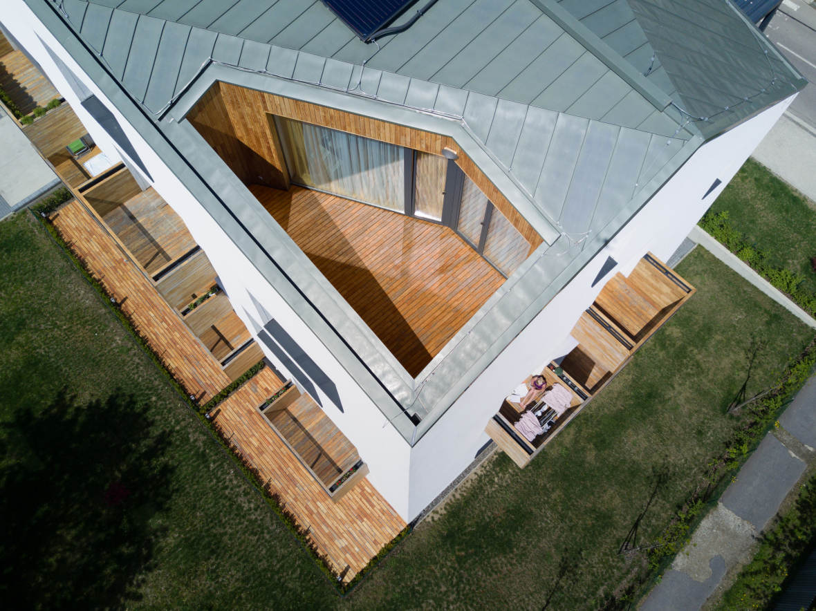 Na 1.nadzemnom podlaží sa nachádzajú dva byty, ktoré majú prístup do súkromných záhradiek oddelených od okolitej zelene živým plotom. Medzi bytmi je situovaná kotolňa a spoločné priestory s pivnicami. Na 2. a 3. podlaží sú tri bytové jednotky. Na štvrtom podlaží sa nachádzajú tri mezonetové byty, ktorých horné, 5. nadzemné podlažie má pre dva krajné byty výstup na otvorenú terasu. Stanová strecha z titanzinku má v rohoch dve výrezy pre otvorené terasy. Terasy nie sú z ulice viditeľné. Všetky okná s výnimkou severnej fasády sú vybavené elektricky ovládanou exteriérovou roletou.