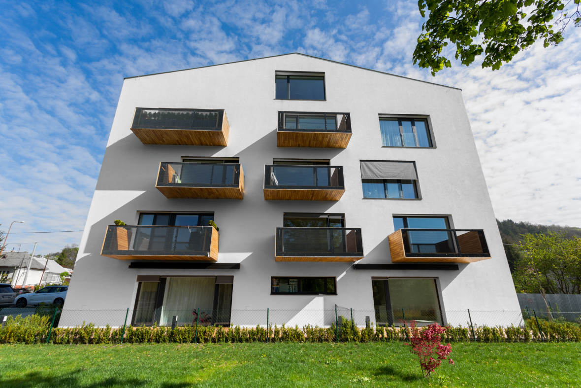 Štvorpodlažný objekt je rozšírený o podkrovie. Pri pohľade od cesty je viditeľná otvorená pavlač a vstupy do bytov. Z ostatných strán sú zas viditeľné rozmerné vykonzolované balkóny.