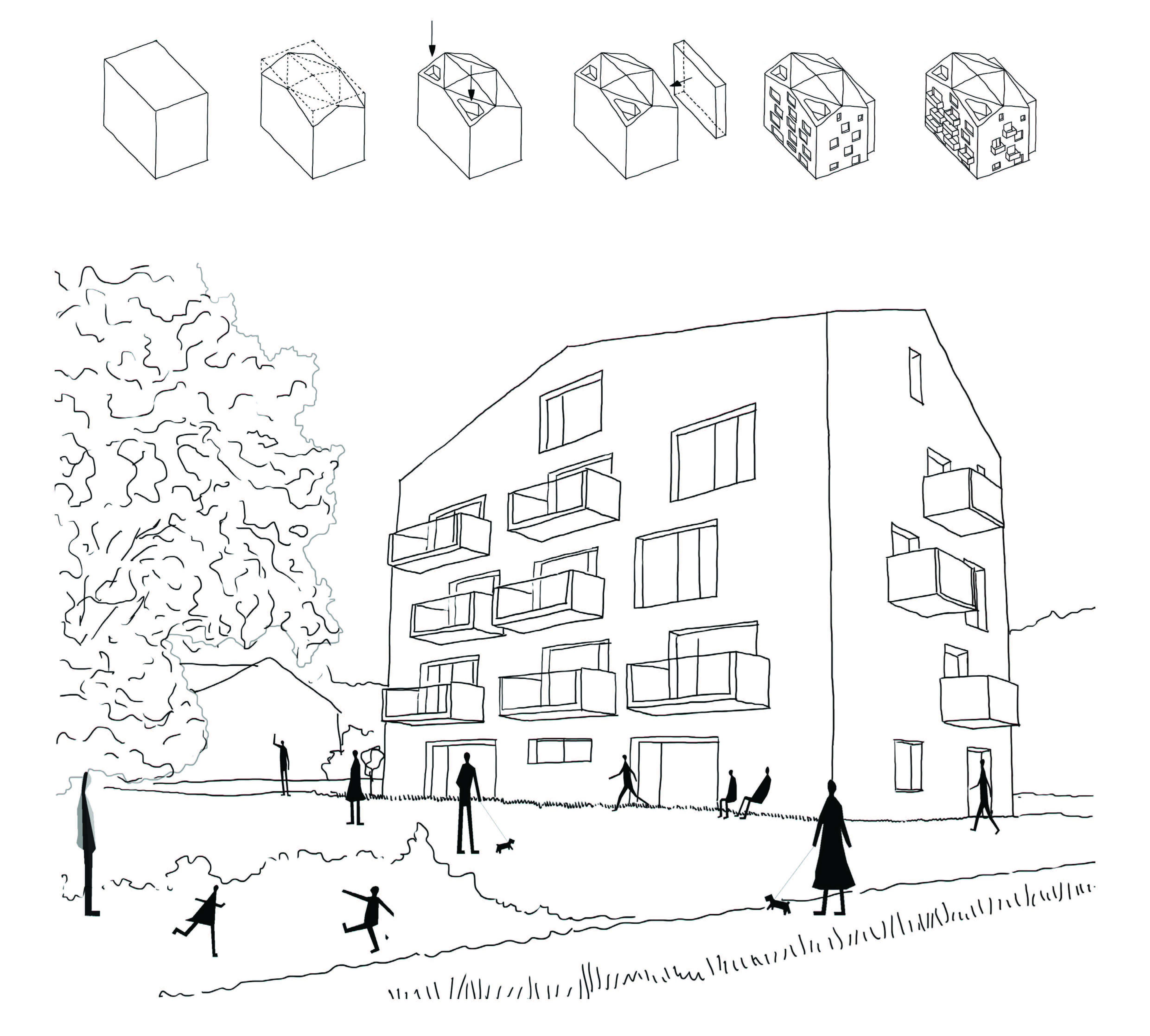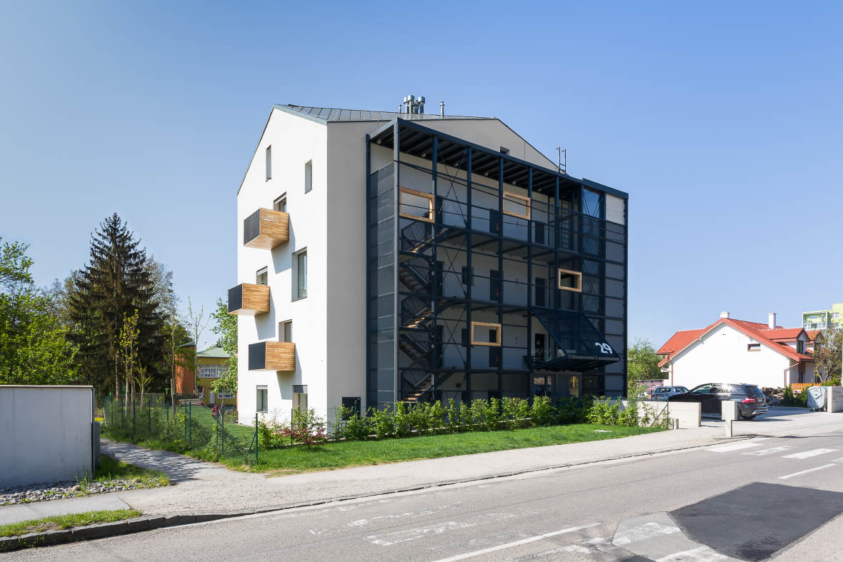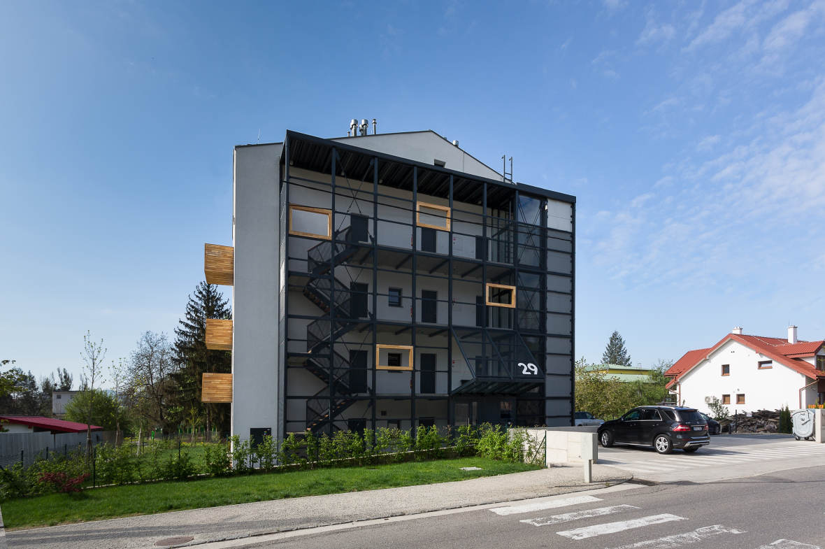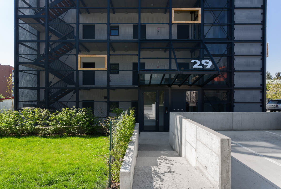 Zo severnej strany je k objektu pristavaná pavlač s nosným oceľovým systémom, ktorá zabezpečuje prístup do jednotlivých bytov. Pavlač obsahuje výťahovú šachtu a exteriérové schodisko s oceľovými schodnicami a drevenými stupňami. Vstup je zvýraznený vyklopením jedného pola plášťa z ťahokovu, pričom jeho funkciu nahrádza priehľadné sklenené zábradlie. Parkovisko je situované na západnej strane pozemku. Pri vjazde sa nachádza miesto pre komunálny odpad, ktoré je kryté betónovým múrikom. Do oplotenia je integrovaná aj plynomerná prípojka.