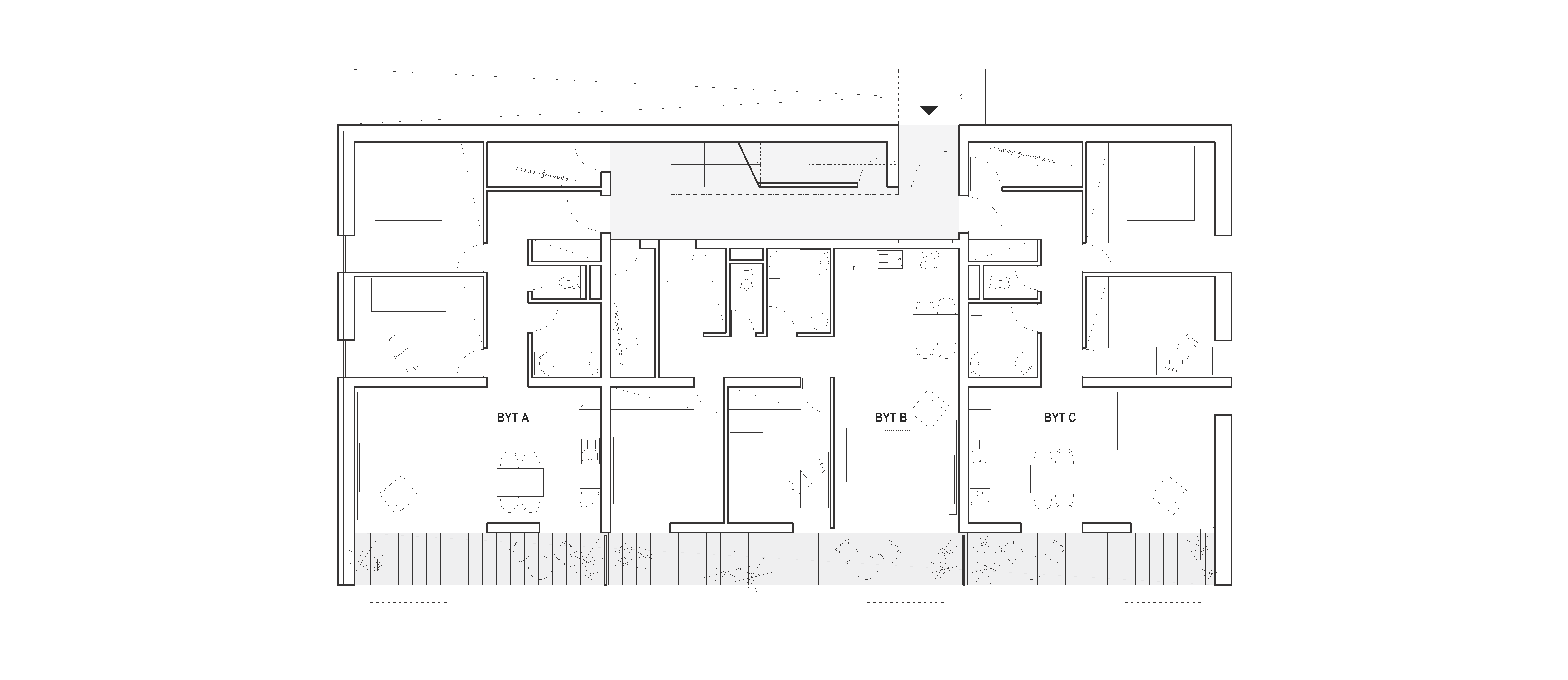 Jasná pôdorysná koncepcia domov vychádza z radenia bytov okolo priameho schodiska idúceho pozdĺž "zadnej" fasády objektu. Byty sú orientované opačným smerom na slnko a priehľady. Na 1. a 2. NP sú po tri trojizbové byty a na 3. NP sú dva štvorizbové byty s priestrannými terasami. Každý byt má naviac priamo na podlaží skladový priestor. Jednotlivé byty sú primeraných výmer, nadštandardný priestorový pocit z interiéru bol dosiahnutý veľkými presklenými plochami, priestrannými loggiami, respektíve strešnými terasami. Prízemným bytom naviac prislúchajú parcely pre budúce predzáhradky.
