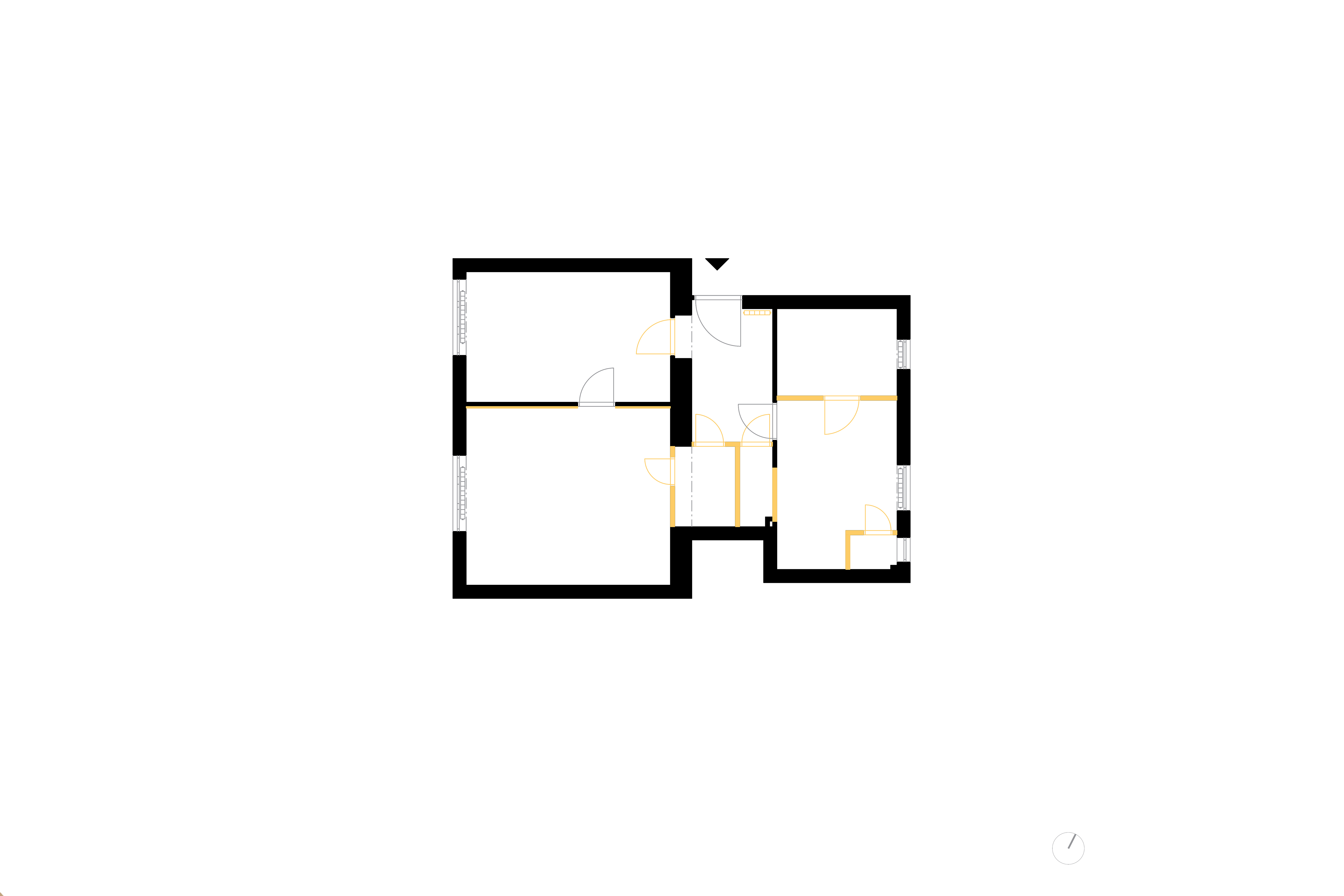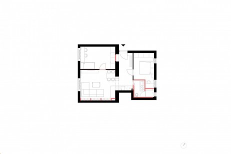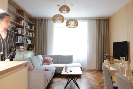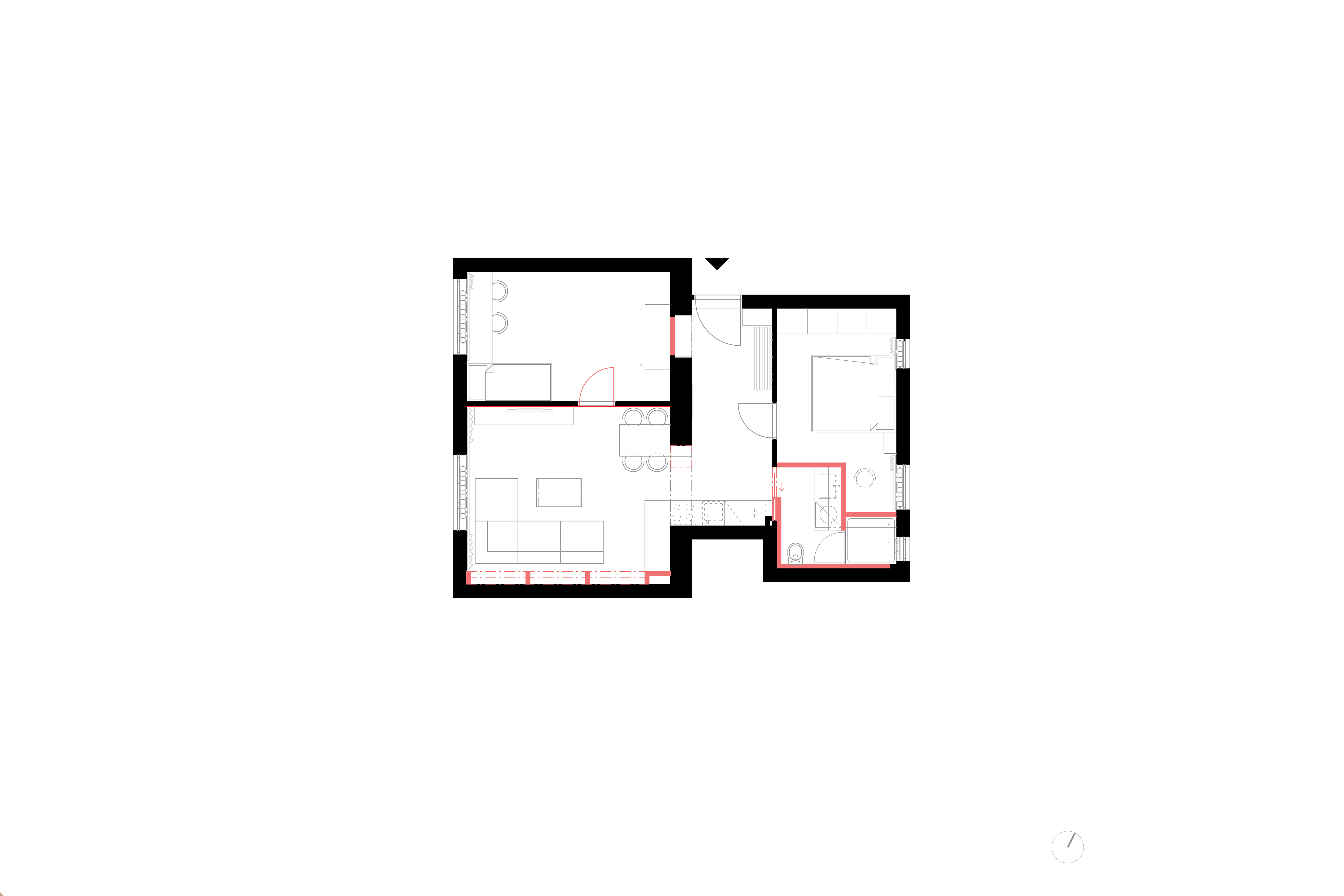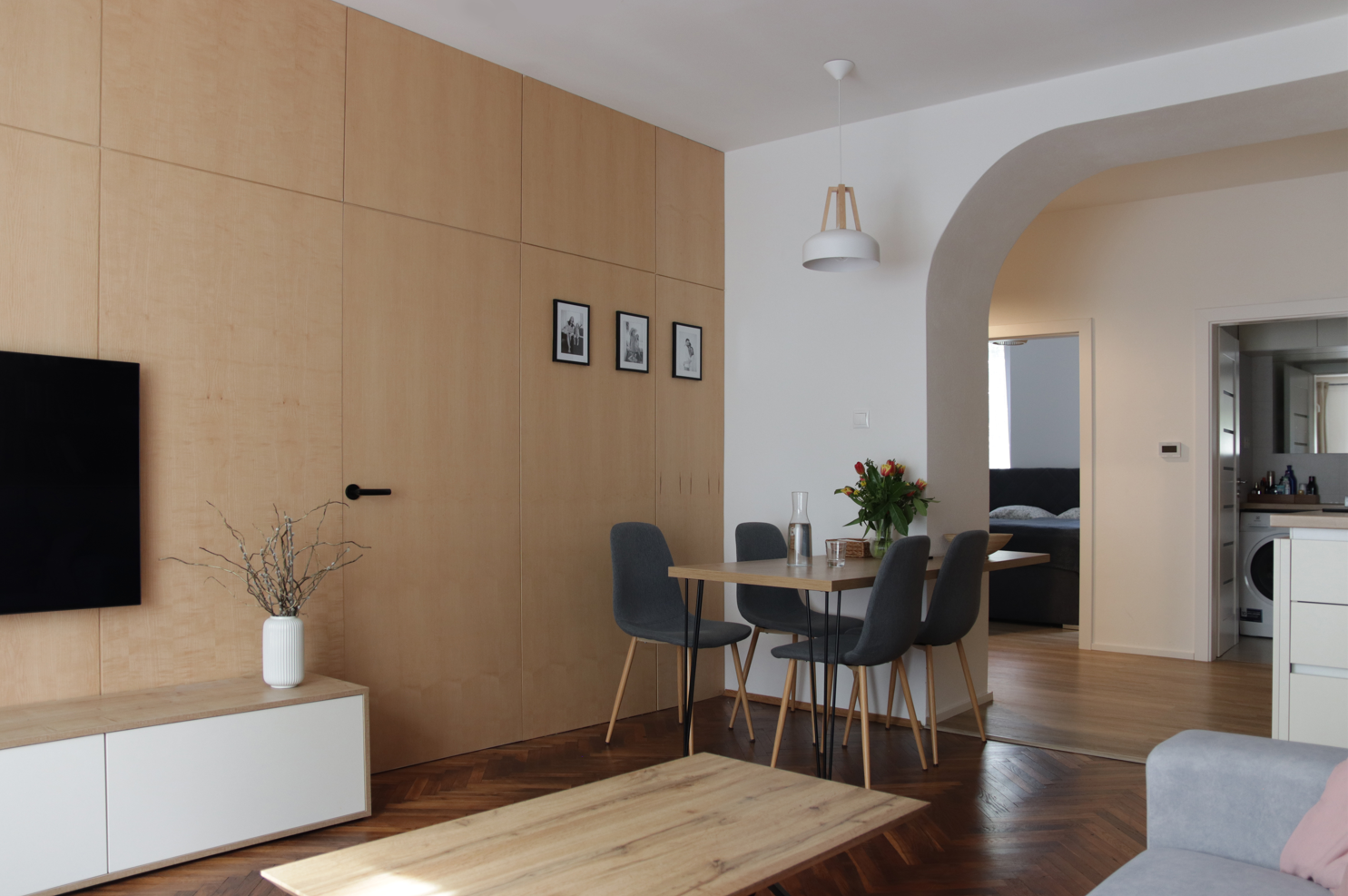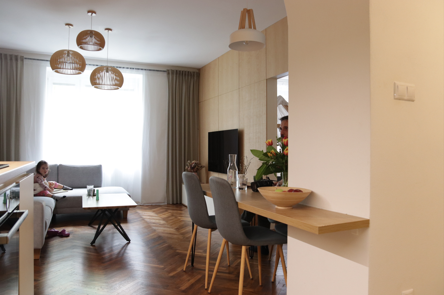 Byt má menej ako 62 m2 a jeho osou prechádza hrubá nosná stena, do ktorej nebolo možné zasahovať. Jednou z možností vytvorenia otvoreného spoločenského priestoru bolo vytvorenie atypickej rohovej kuchyne, ktorá plynule prechádza do vstavanej knižnice. Zaoblenie hrany kuchynského portálu má zjemniť prechod medzi oboma priestormi. V byte sa nachádza viacero skrytých úložných priestorov, ktoré zároveň kompenzujú zvolený minimalizmus obývačkovej steny. Materiály sú zväčša svetlé, aby odrážali potrebné svetlo.