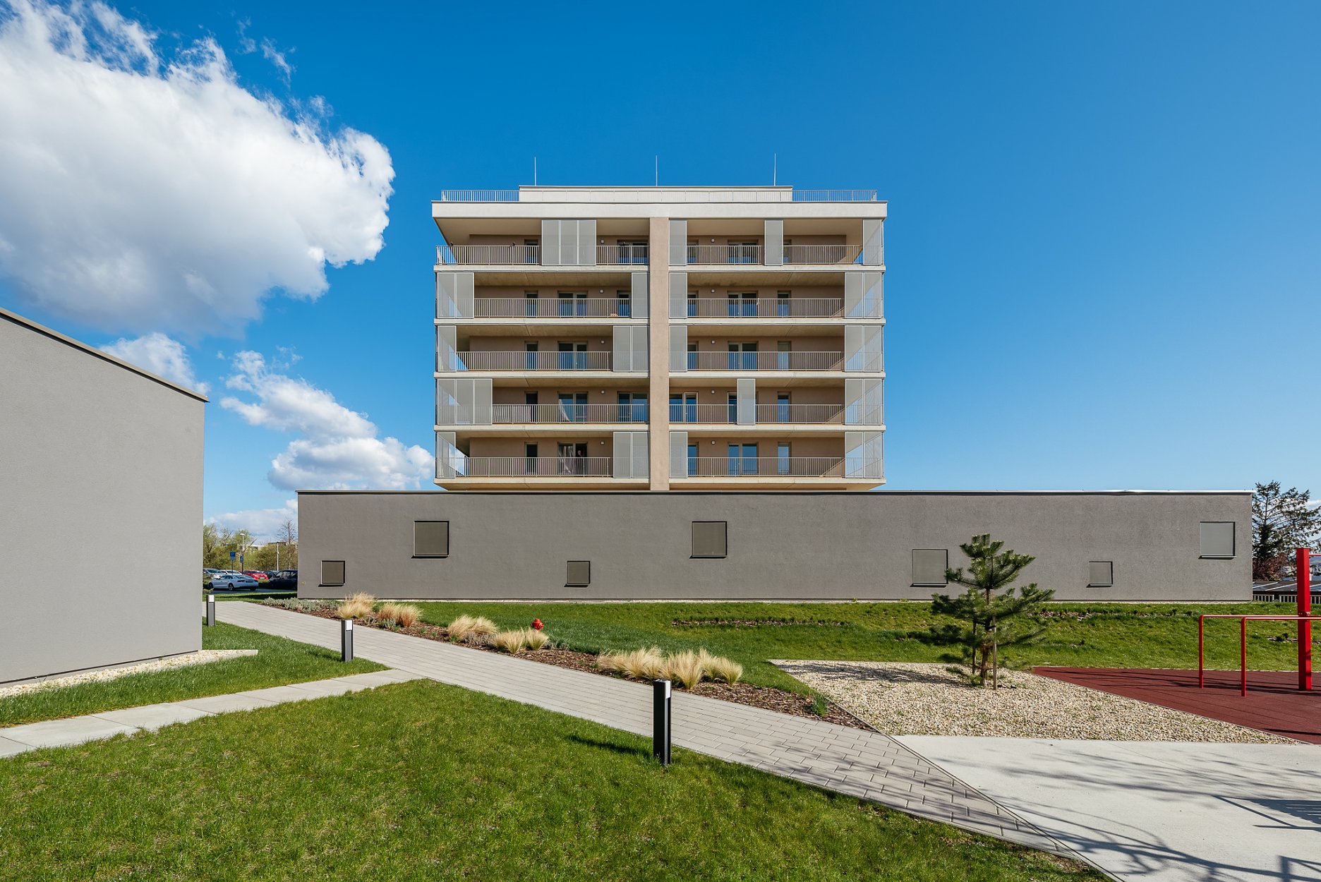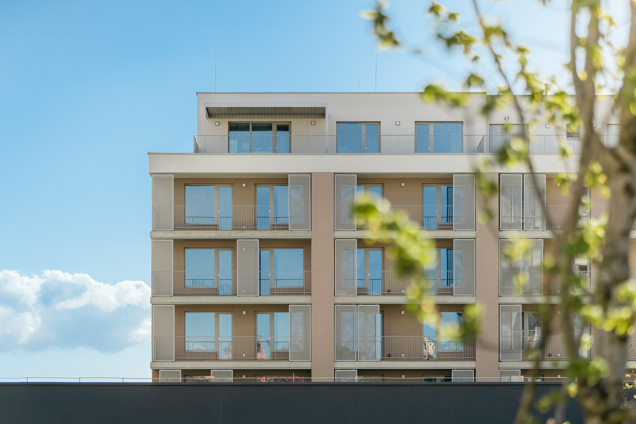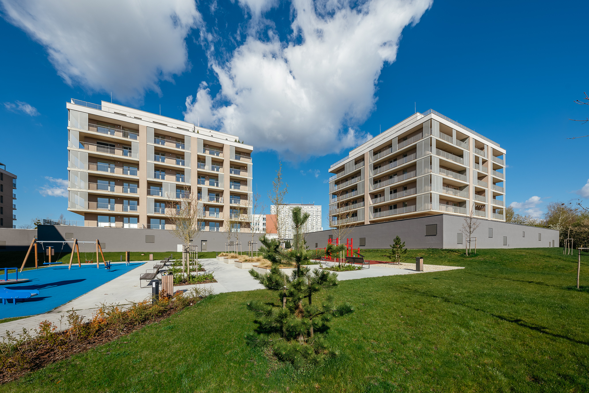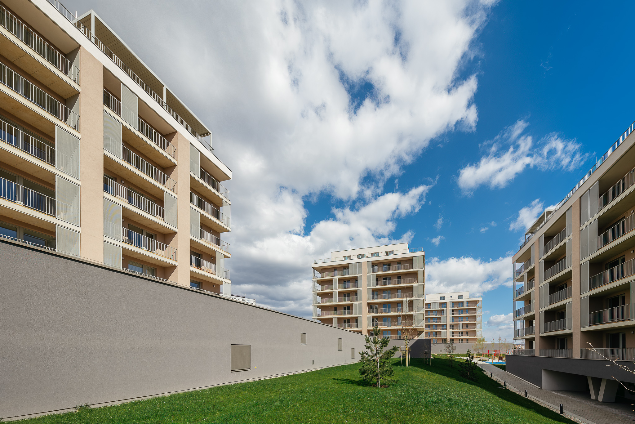 Architektonické riešenie bytových domov stavia na jednoduchej kompozícii kubických hmôt, do ktorej vnáša dynamický prvok systém predsadeného tienenia priebežných lodžií. Architekti zvolili podobné riešenie ako v druhej etape projektu. V štruktúrovaných častiach fasády dominuje pohľadový betón konzol spomínaných lodžií a oceľové rámy tieniacich prvkov s drevenou výplňou. “Hladké” Fasády zjednocuje svetlobéžová omietka s jemnou štruktúrou. Podnož s parkovaním od obytných blokov odčleňuje sivá farebnosť.