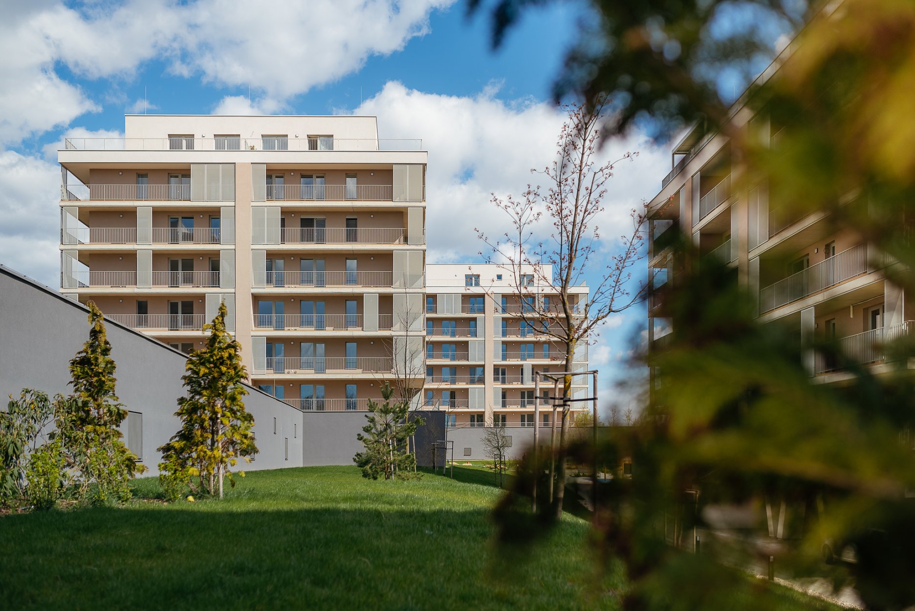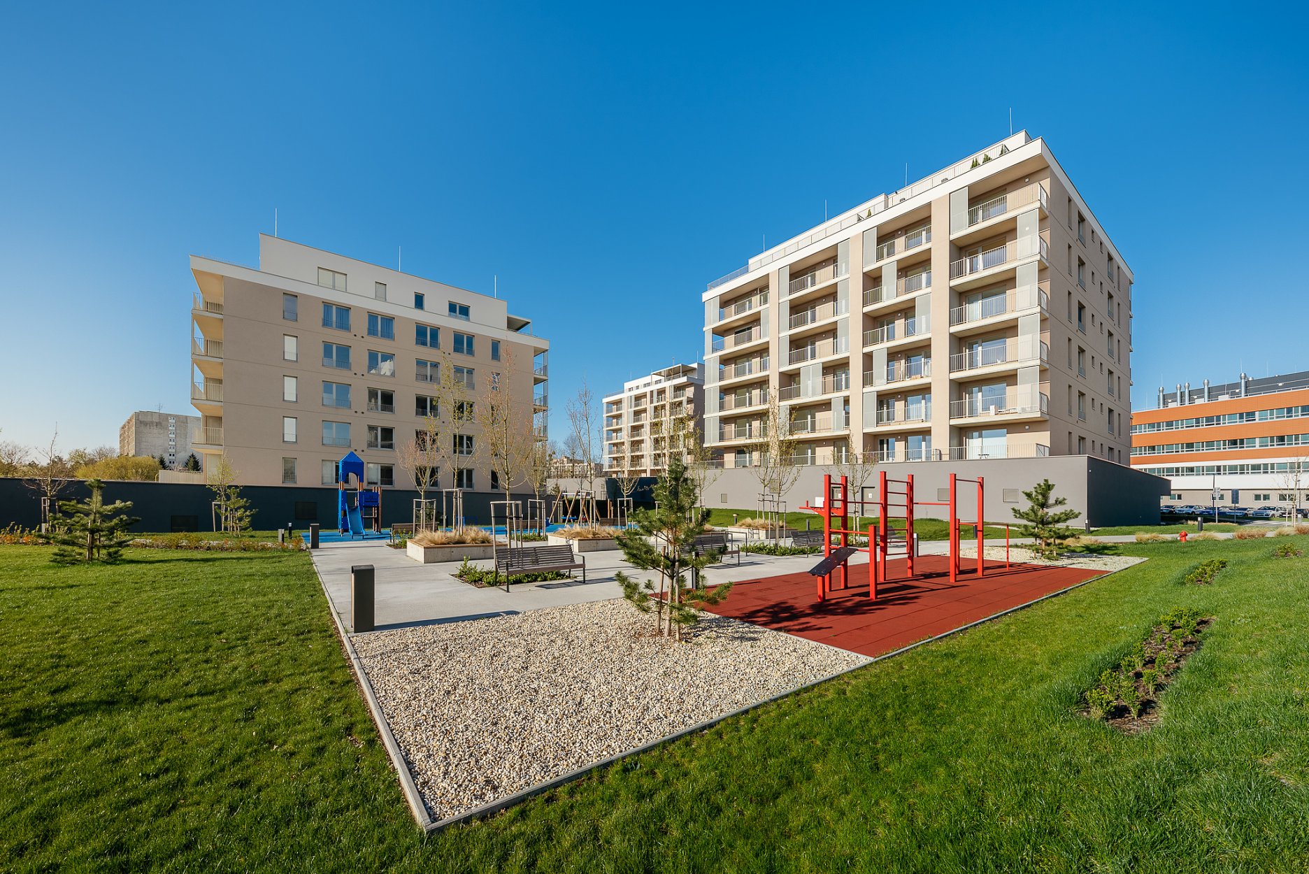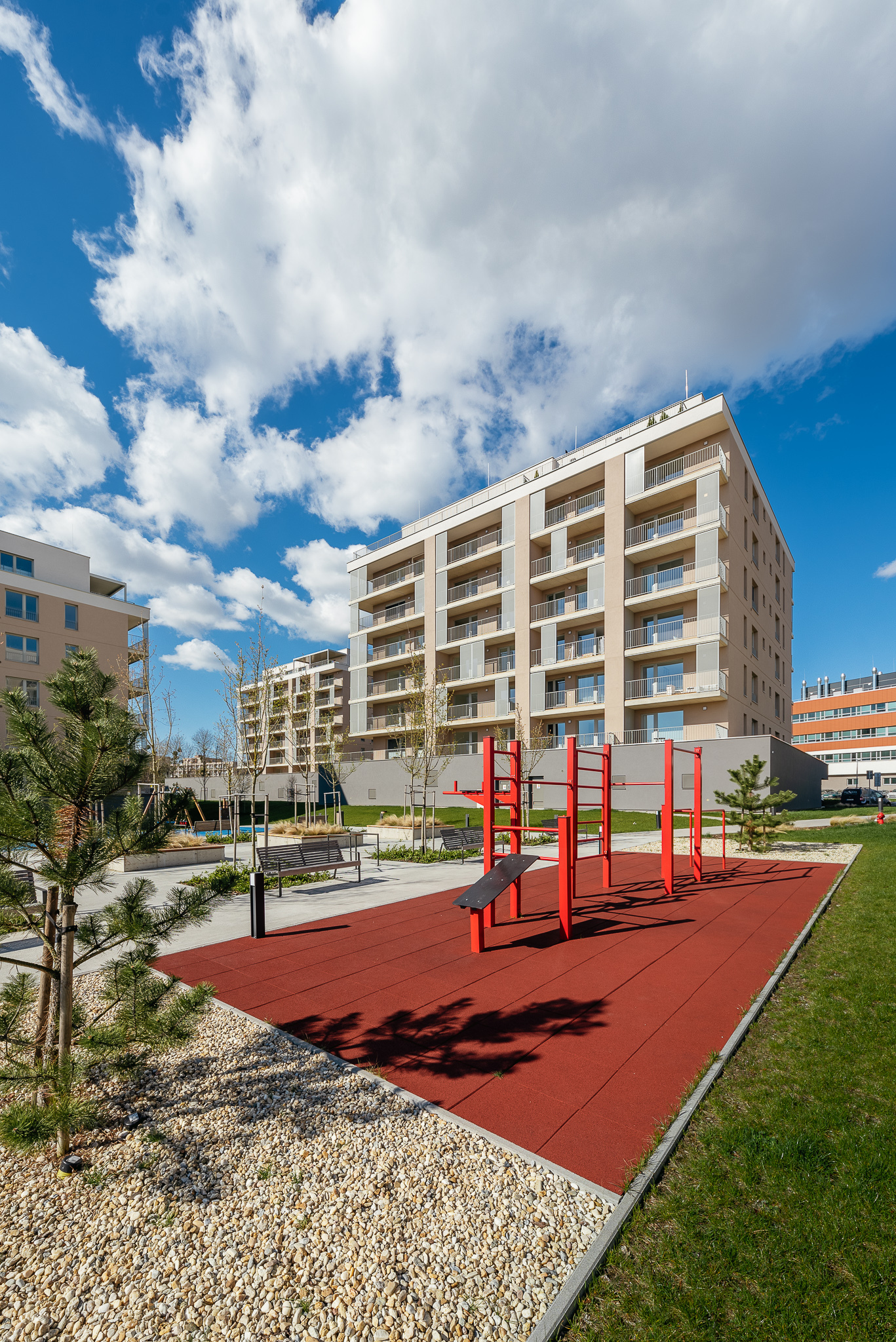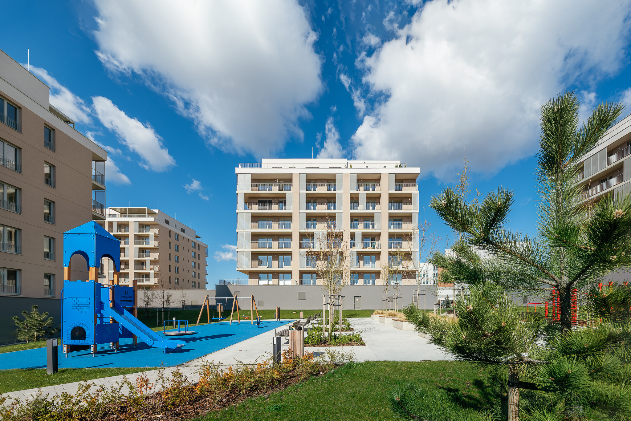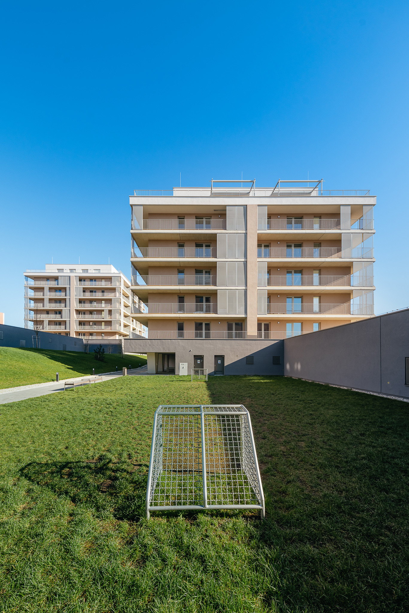Architektonické riešenie bytových domov stavia na jednoduchej kompozícii kubických hmôt, do ktorej vnáša dynamický prvok systém predsadeného tienenia priebežných lodžií. Architekti zvolili podobné riešenie ako v druhej etape projektu. V štruktúrovaných častiach fasády dominuje pohľadový betón konzol spomínaných lodžií a oceľové rámy tieniacich prvkov s drevenou výplňou. “Hladké” Fasády zjednocuje svetlobéžová omietka s jemnou štruktúrou. Podnož s parkovaním od obytných blokov odčleňuje sivá farebnosť.