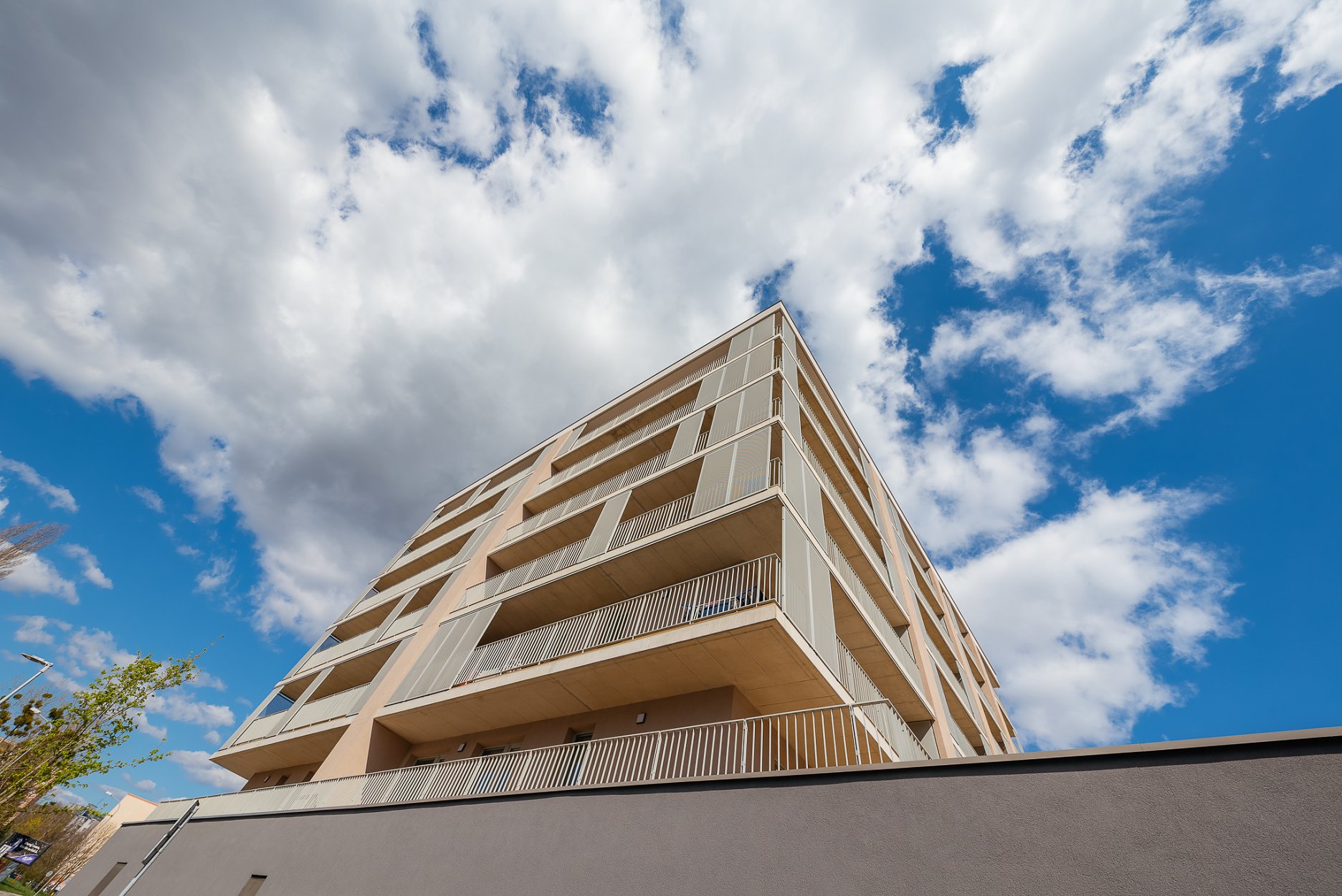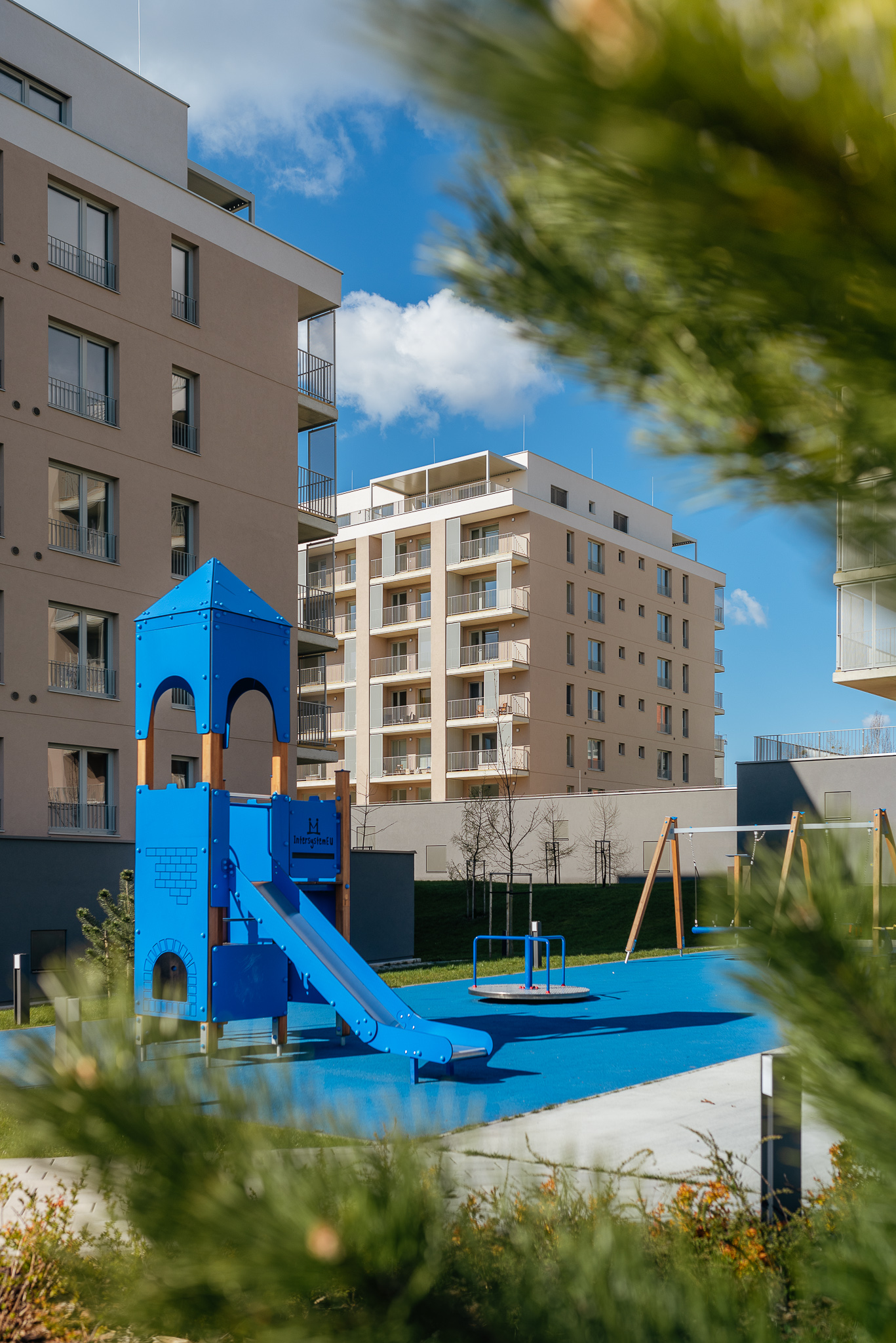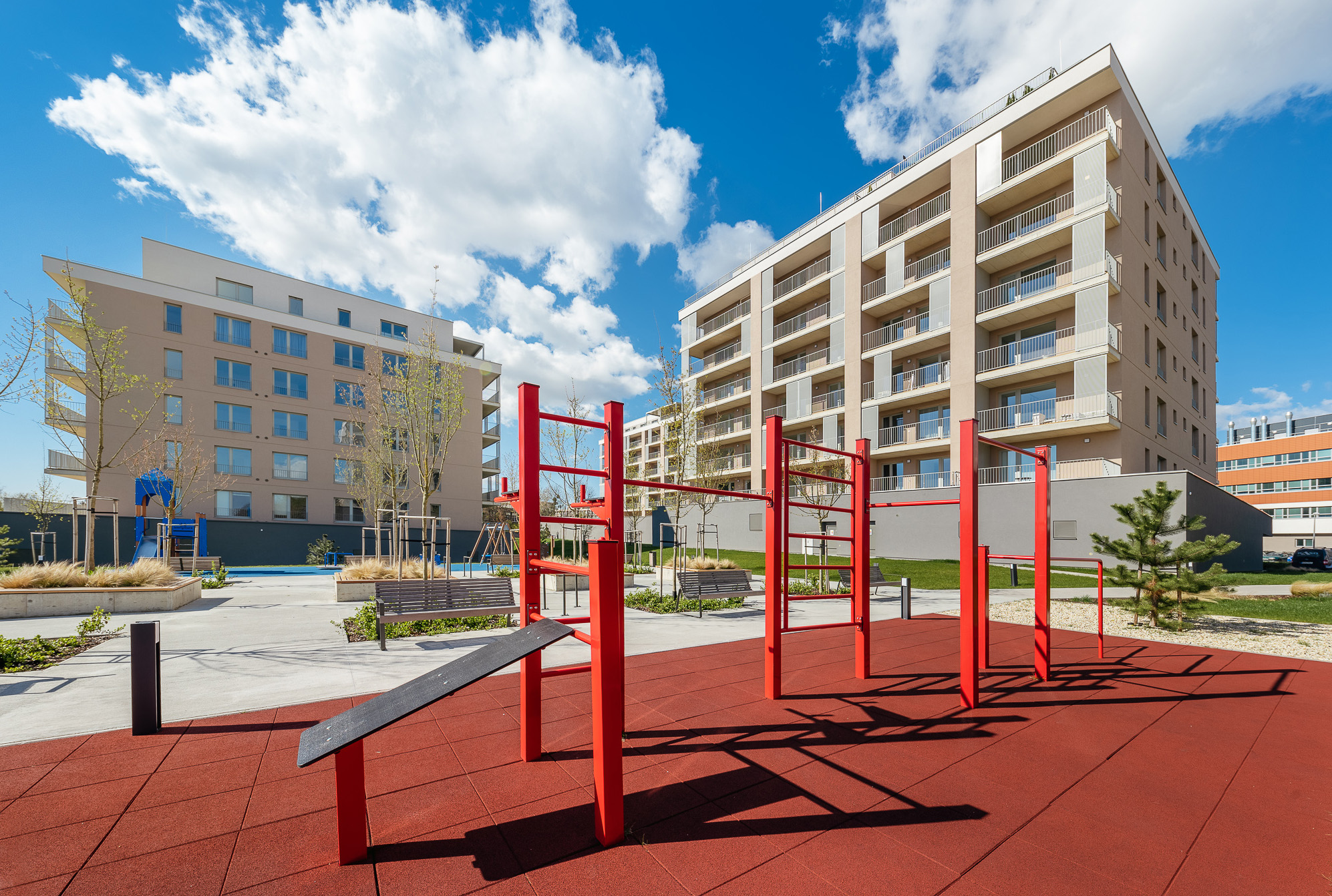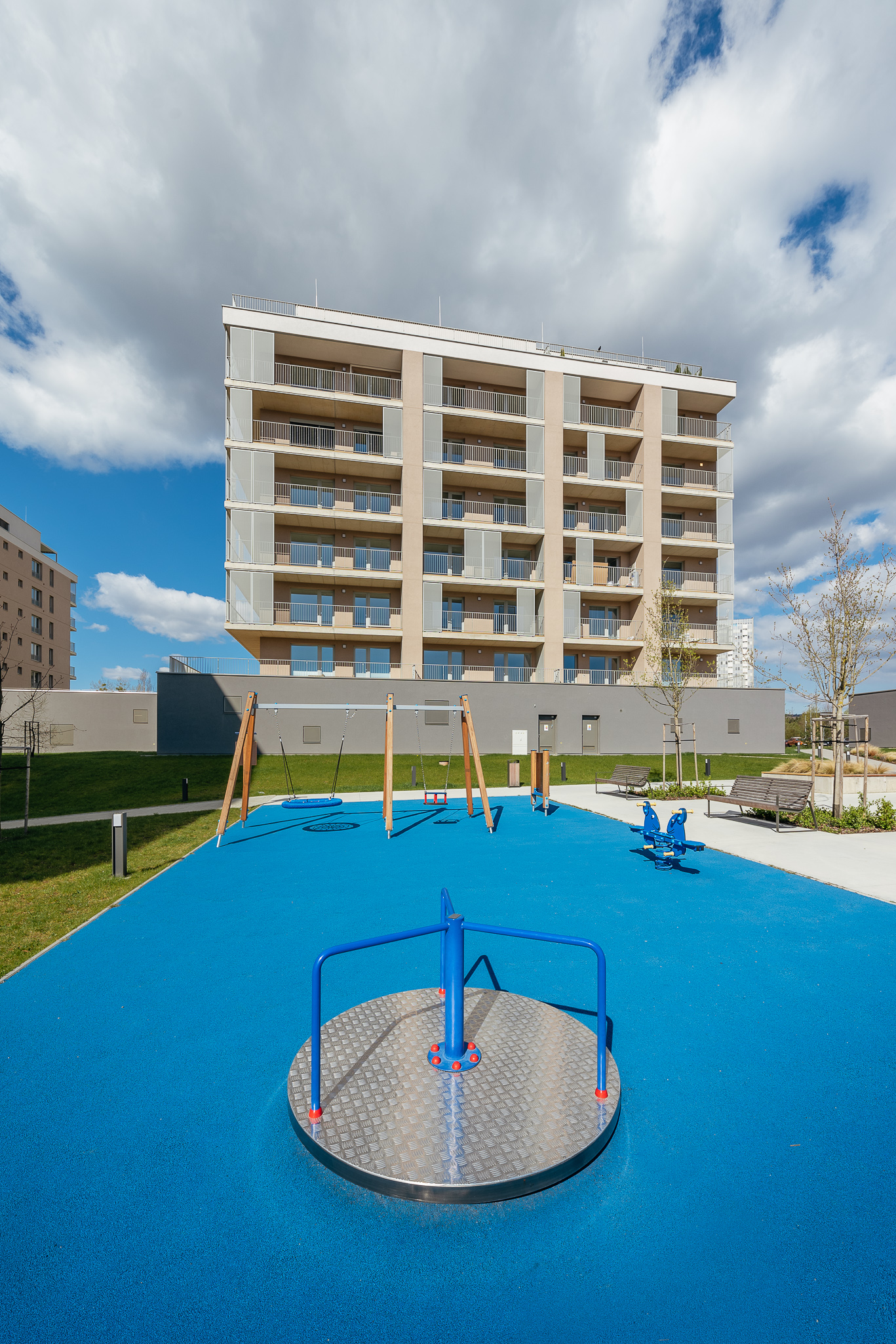 Architektonické riešenie bytových domov stavia na jednoduchej kompozícii kubických hmôt, do ktorej vnáša dynamický prvok systém predsadeného tienenia priebežných lodžií. Architekti zvolili podobné riešenie ako v druhej etape projektu. V štruktúrovaných častiach fasády dominuje pohľadový betón konzol spomínaných lodžií a oceľové rámy tieniacich prvkov s drevenou výplňou. “Hladké” Fasády zjednocuje svetlobéžová omietka s jemnou štruktúrou. Podnož s parkovaním od obytných blokov odčleňuje sivá farebnosť.