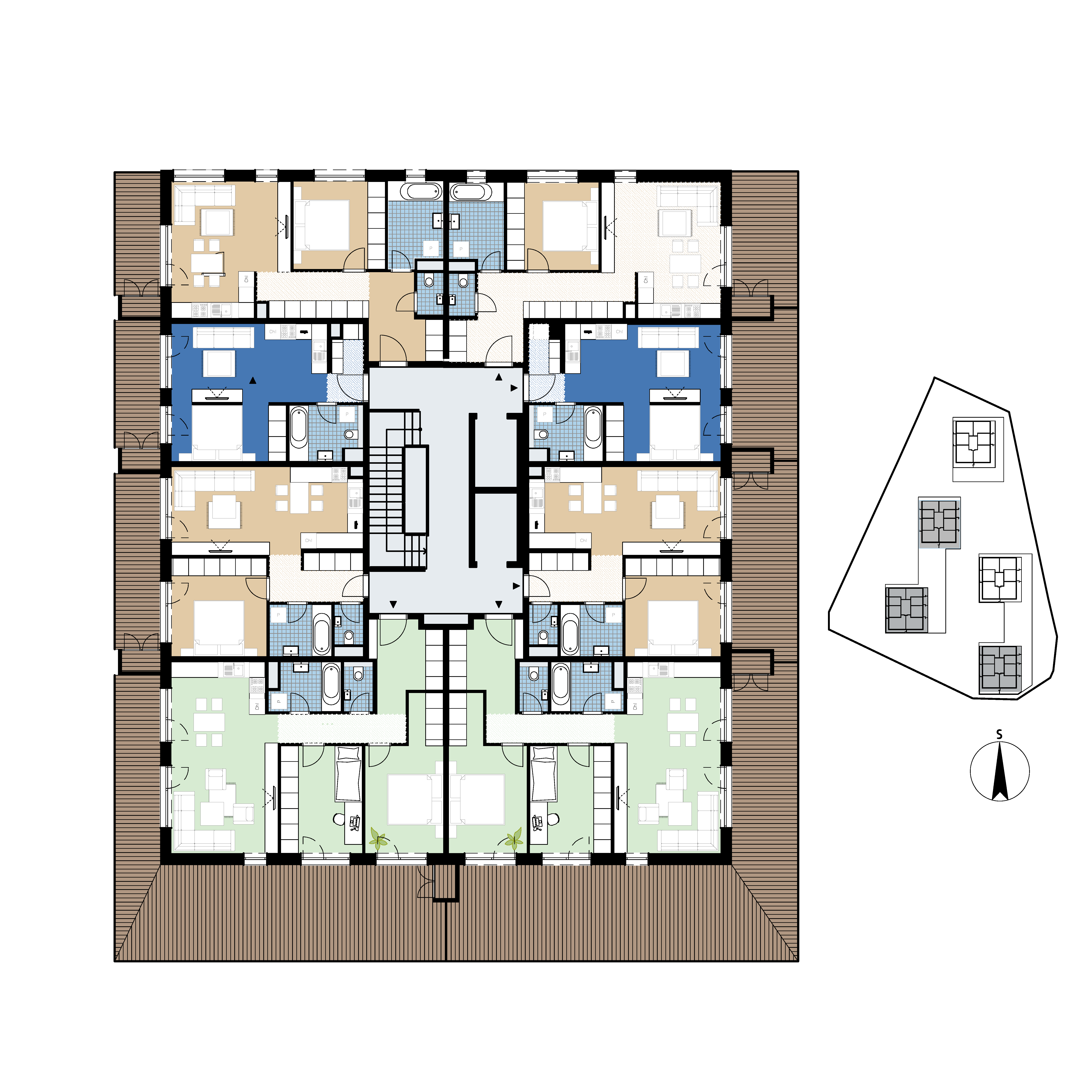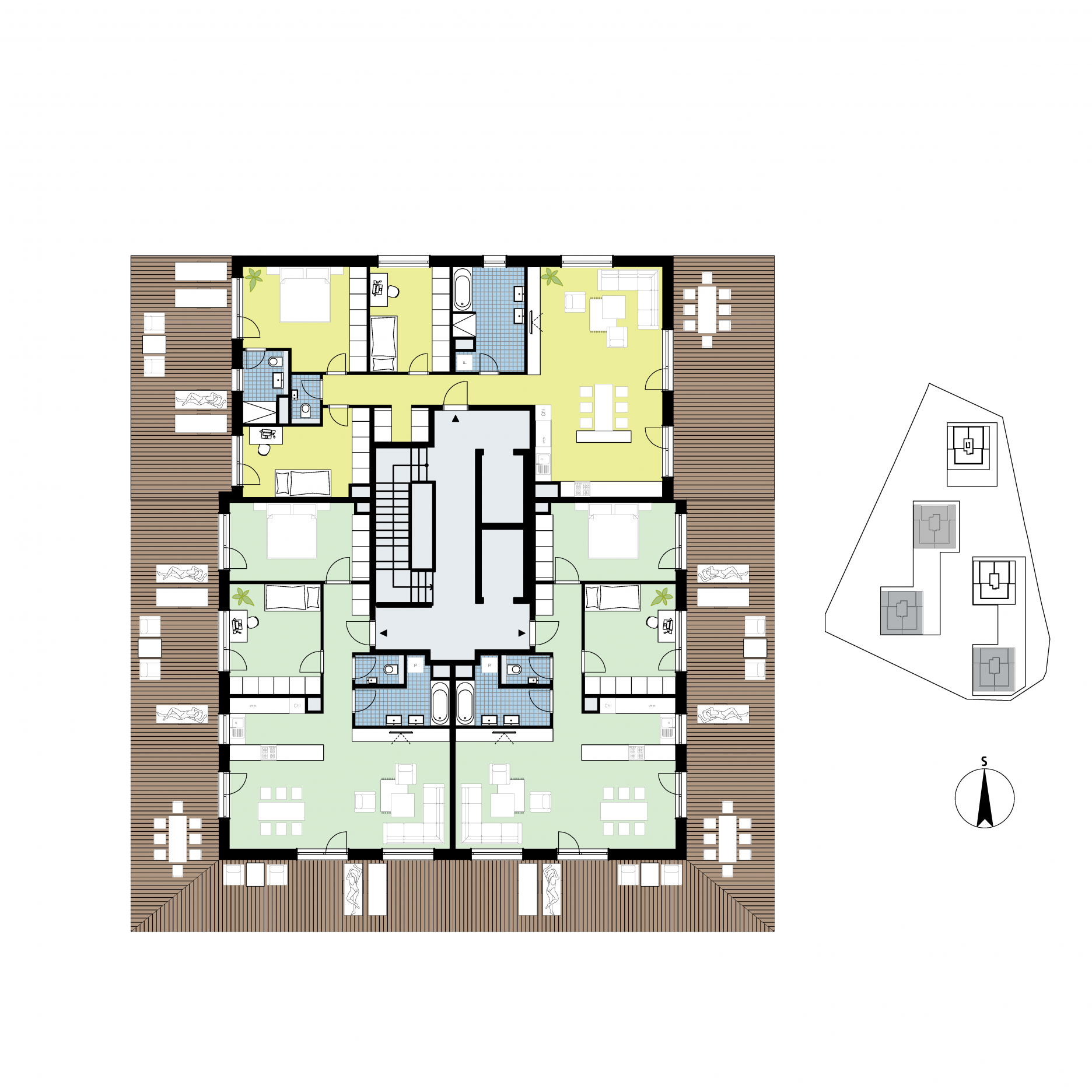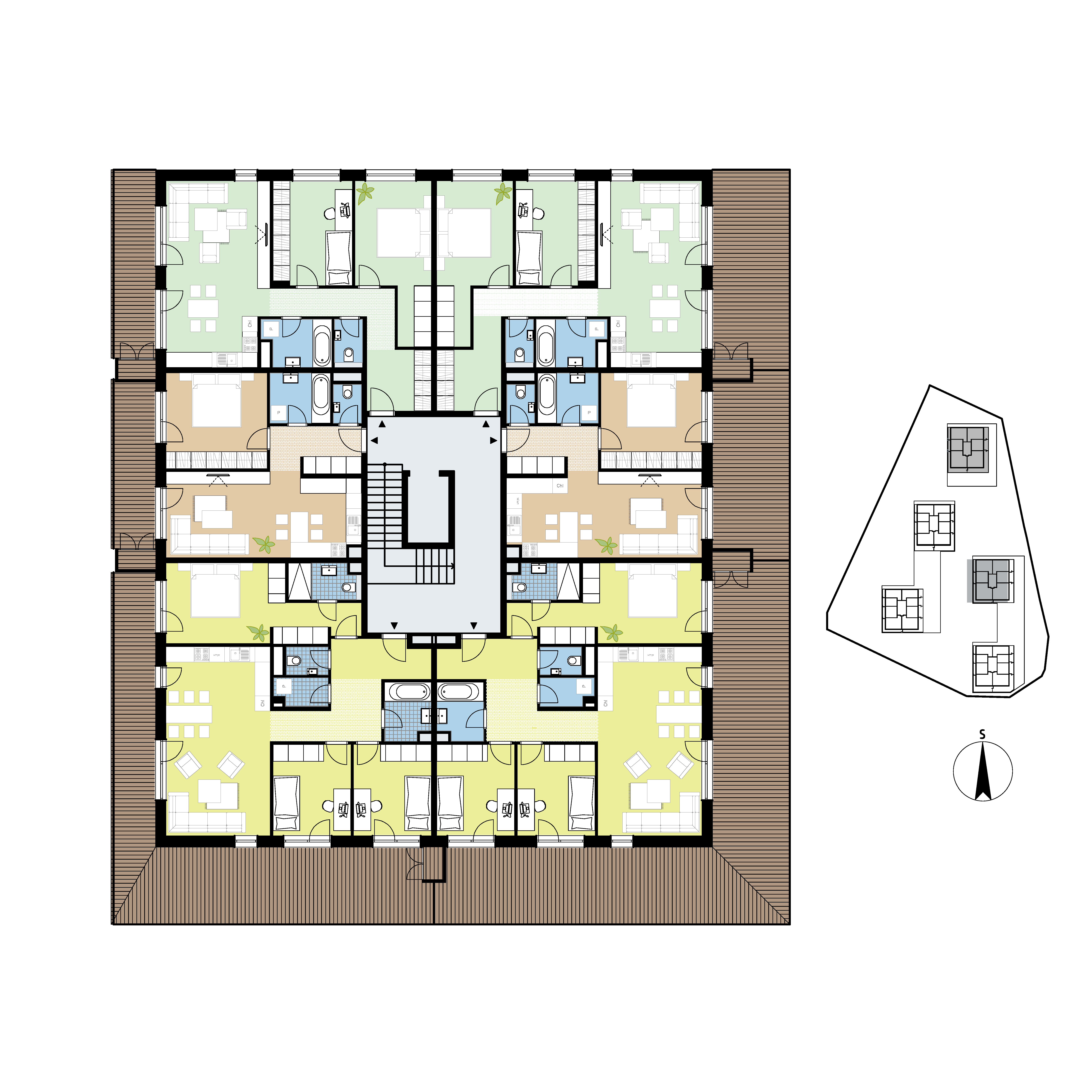 Na trojuholníkovej parcele vzniklo päť bytových domov, orientovaných v osi sever-juh. Sedem a osempodlažné objekty sú vzájomne posunuté do šachovnicového rastra, ktorý definuje intímnejšiu mierku exteriérových celkov. Urbánna štruktúra nových objektov zachováva koncept poloverejných priestorov, ktoré ju odlišujú od okolitého sídliska. Spoločná podnož prepája domy D2 a D3, rovnako tiež objekty D4 a D5. Blok D1 tvorí samostatný celok. Medzi bytovými domami prechádzajú promenádne osi, ktoré spájajú priestorové celky s trávnatými a spevnenými plochami, detskými ihriskami, alebo zónami pre komunitné aktivity.