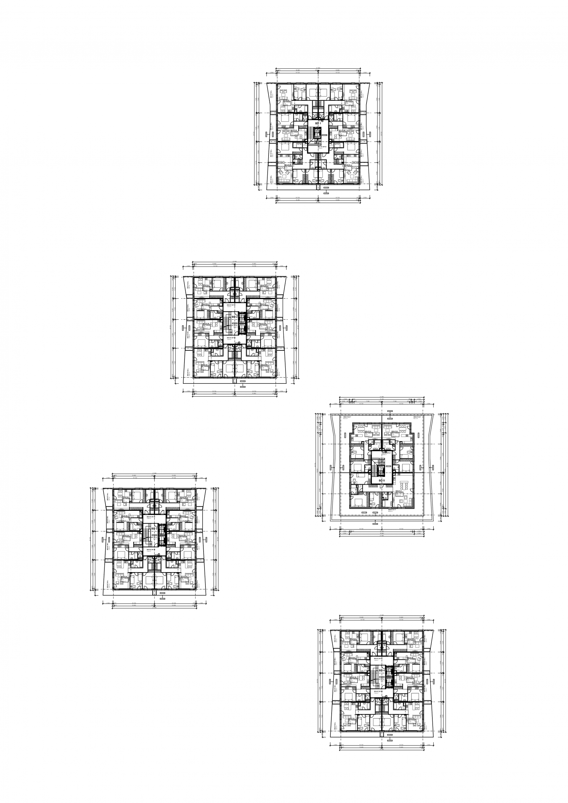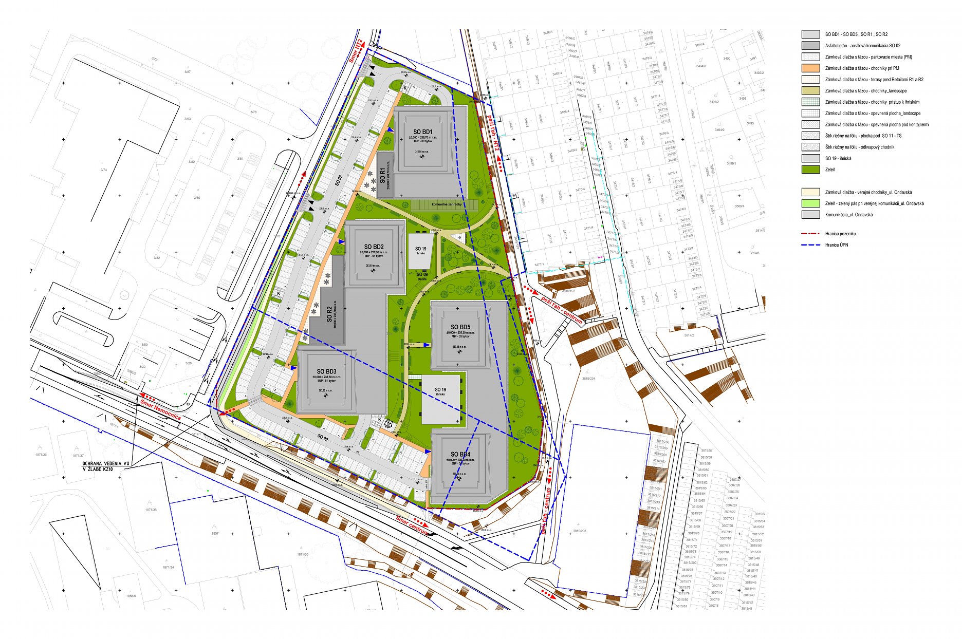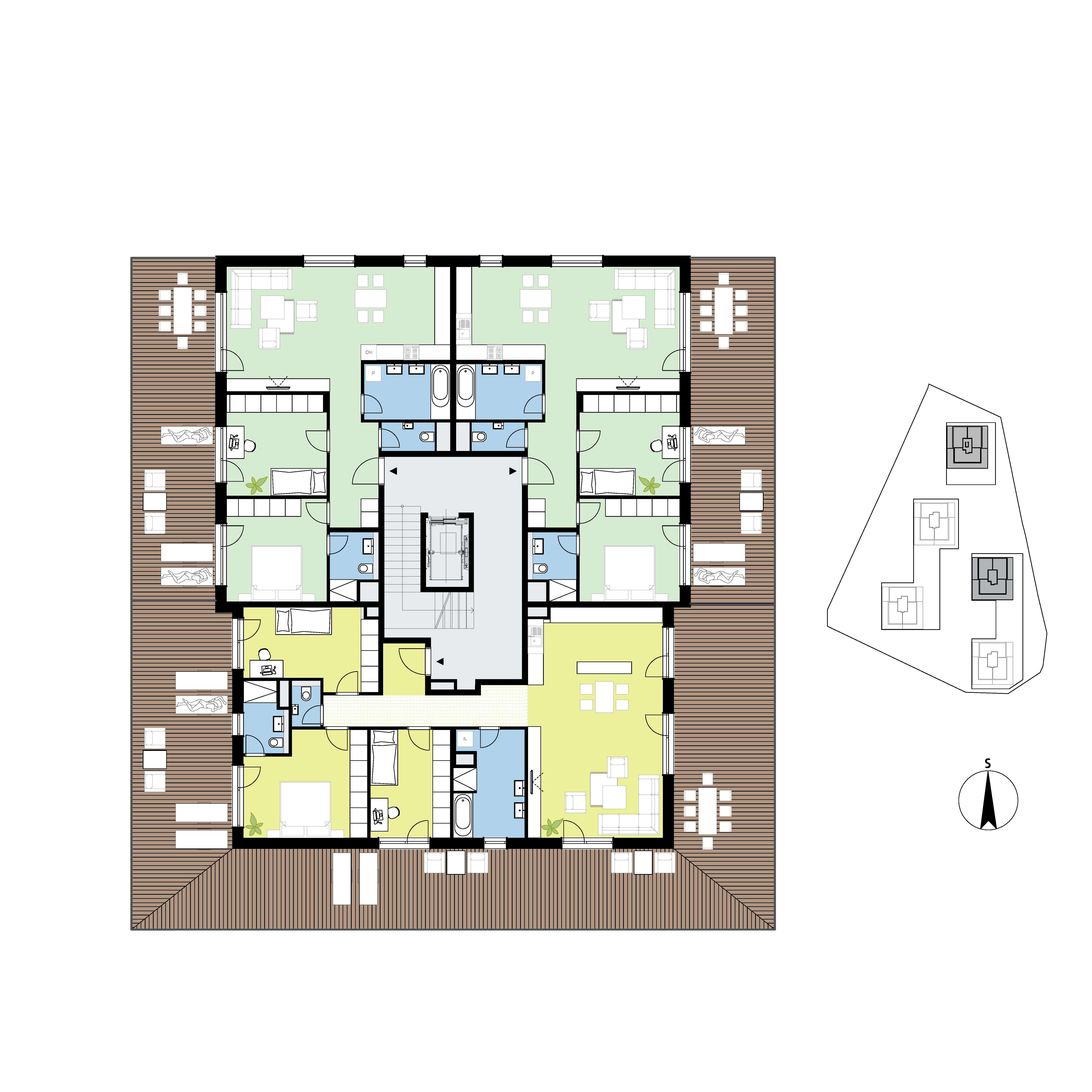 Na trojuholníkovej parcele vzniklo päť bytových domov, orientovaných v osi sever-juh. Sedem a osempodlažné objekty sú vzájomne posunuté do šachovnicového rastra, ktorý definuje intímnejšiu mierku exteriérových celkov. Urbánna štruktúra nových objektov zachováva koncept poloverejných priestorov, ktoré ju odlišujú od okolitého sídliska. Spoločná podnož prepája domy D2 a D3, rovnako tiež objekty D4 a D5. Blok D1 tvorí samostatný celok. Medzi bytovými domami prechádzajú promenádne osi, ktoré spájajú priestorové celky s trávnatými a spevnenými plochami, detskými ihriskami, alebo zónami pre komunitné aktivity.