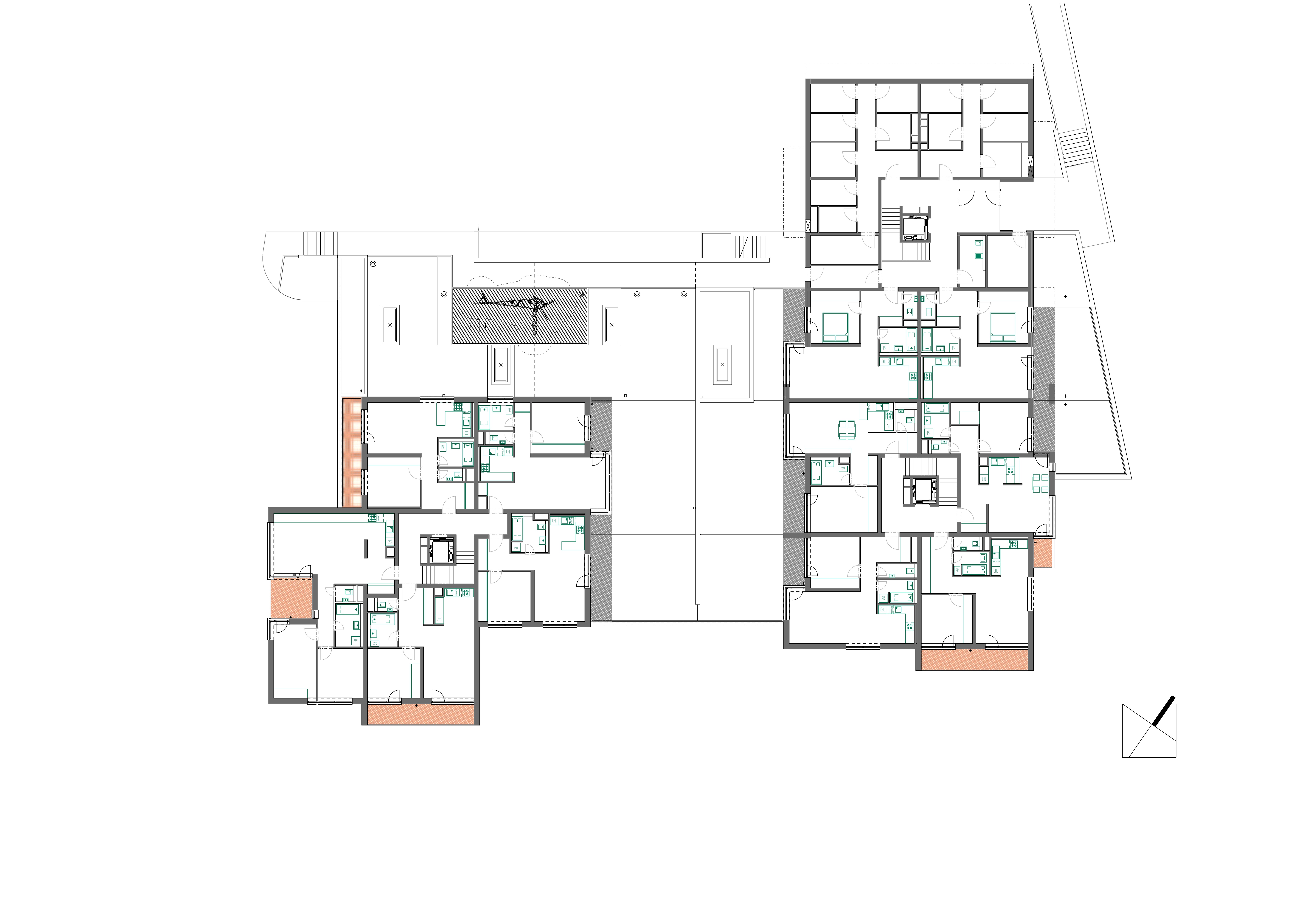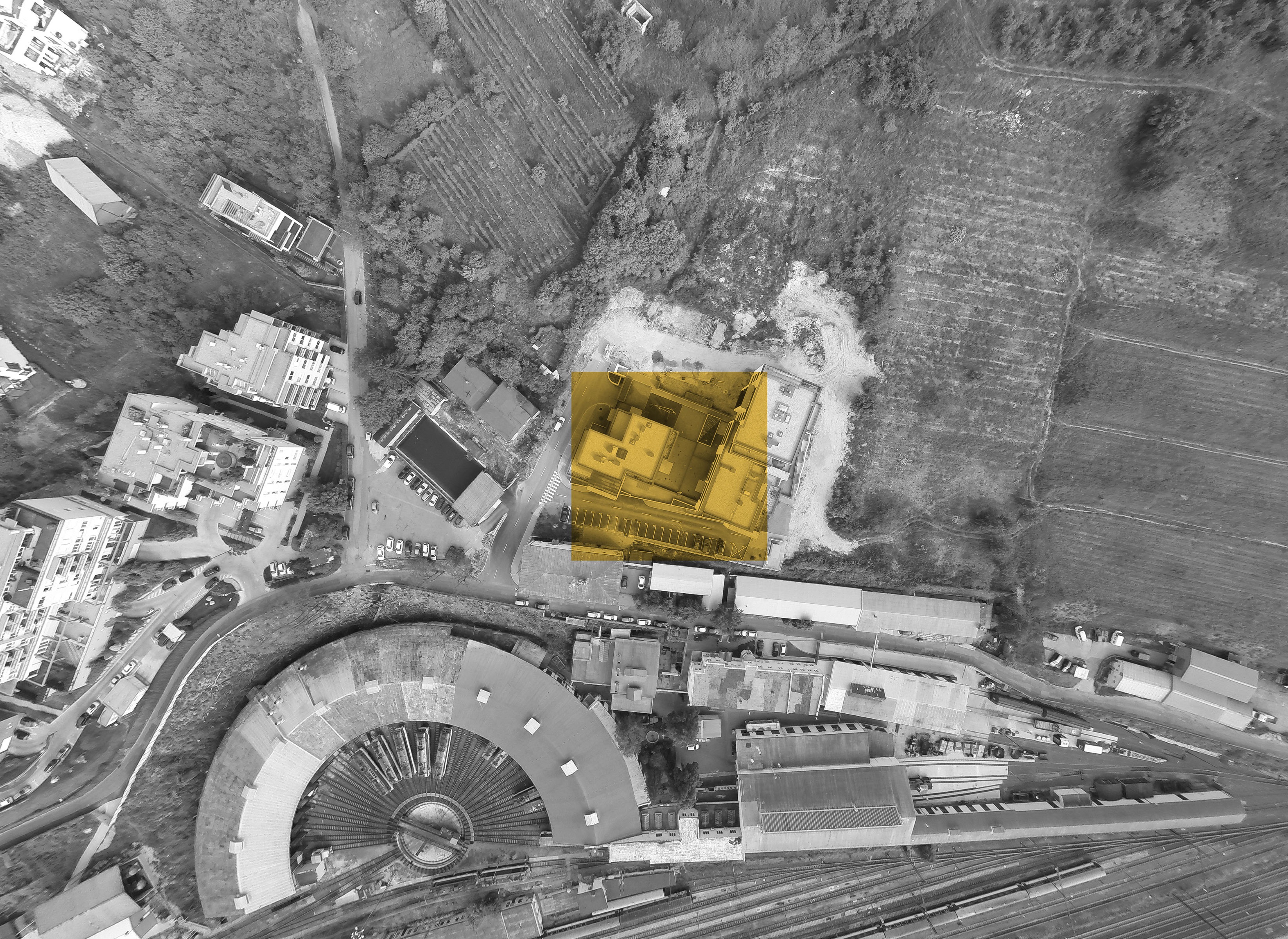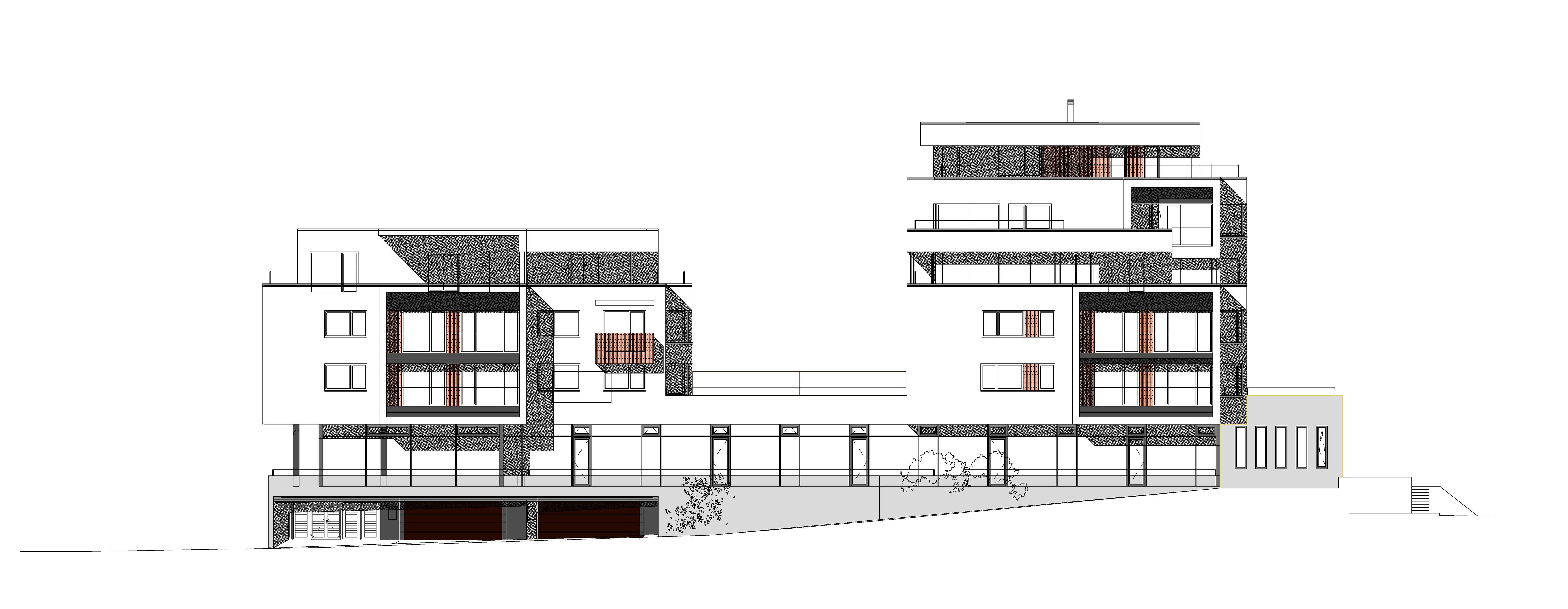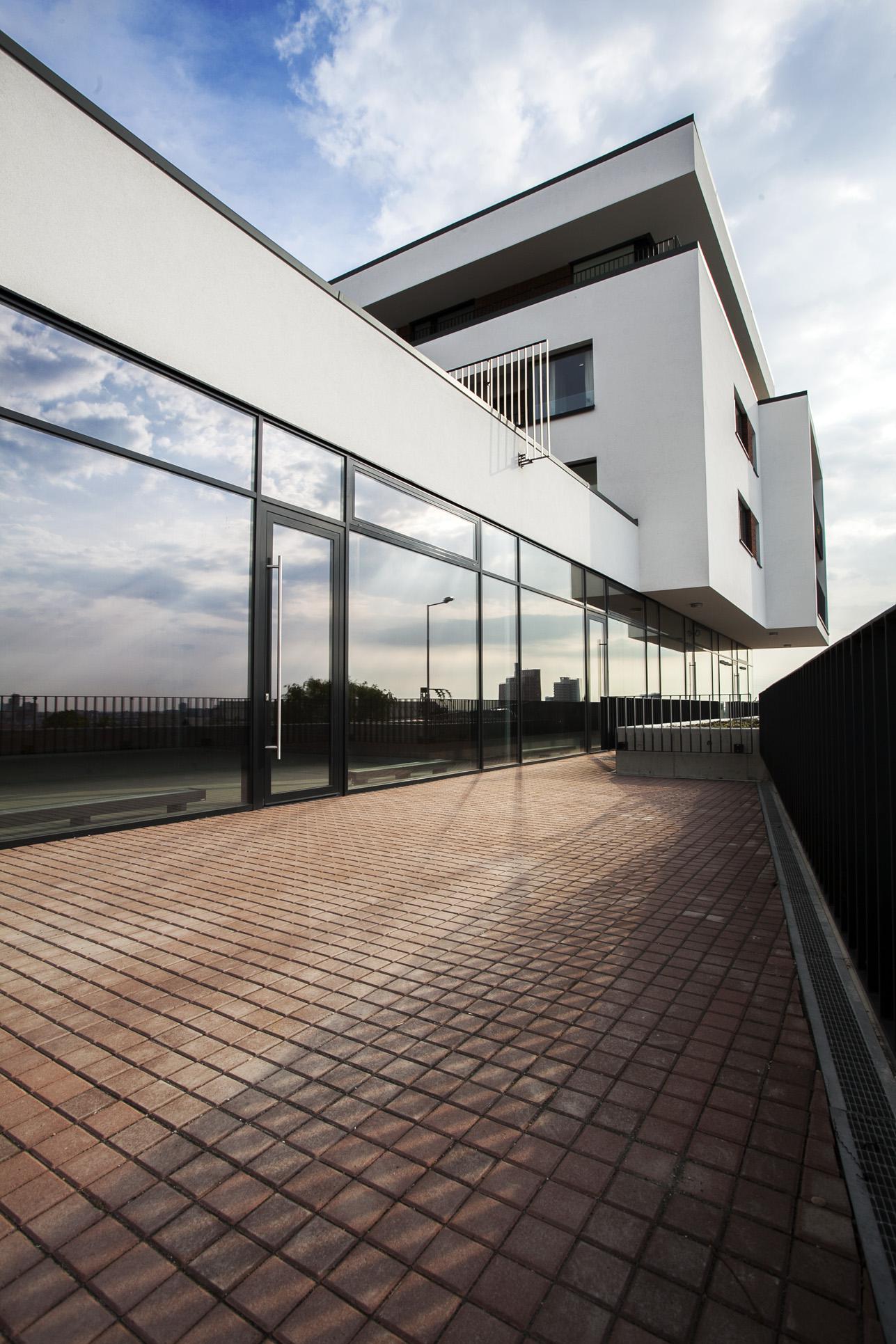 Parter tvorí betónová do zeme polozapustená podnož garáží a nad ňou odľahčený presklený pás obchodných priestorov. Aj najnižšie položené byty tak získali zvýšenú polohu, z ktorej hľadia ponad pitoresknú štruktúru existujúcich železničných stavieb na panorámu mesta pod železnicou.