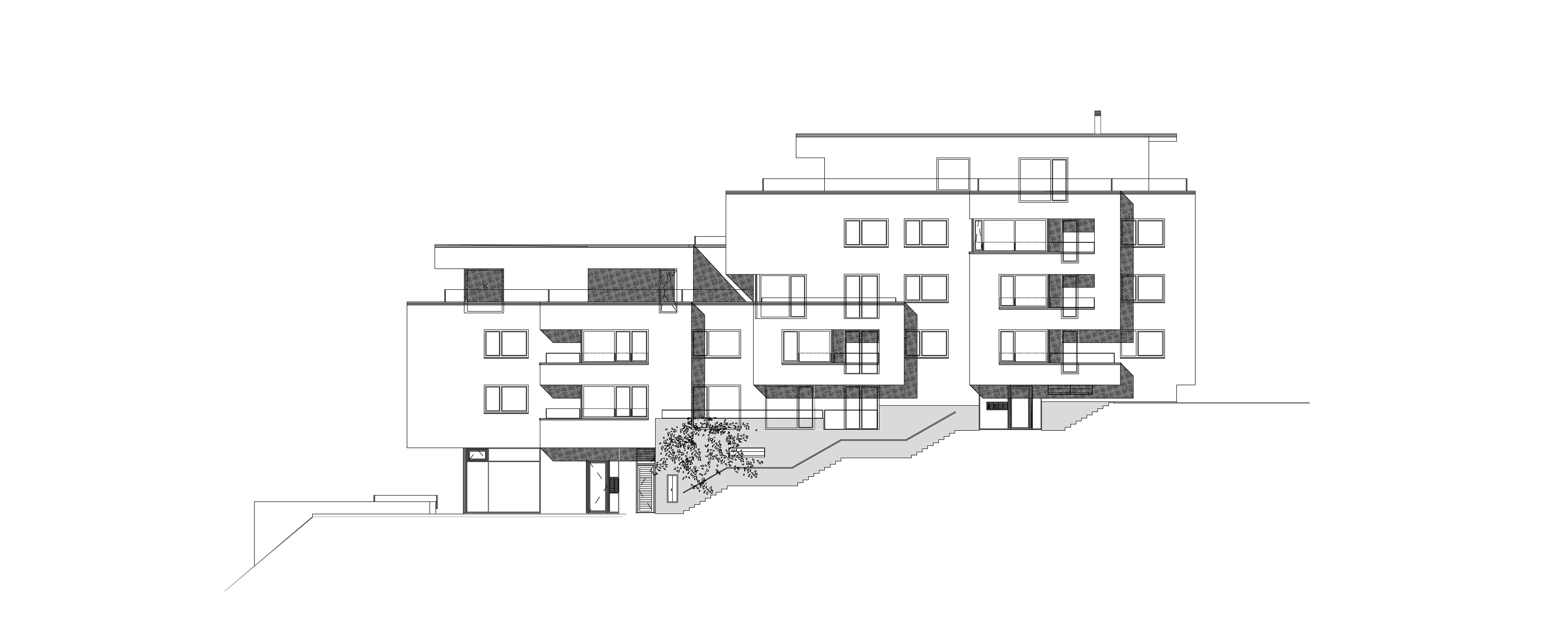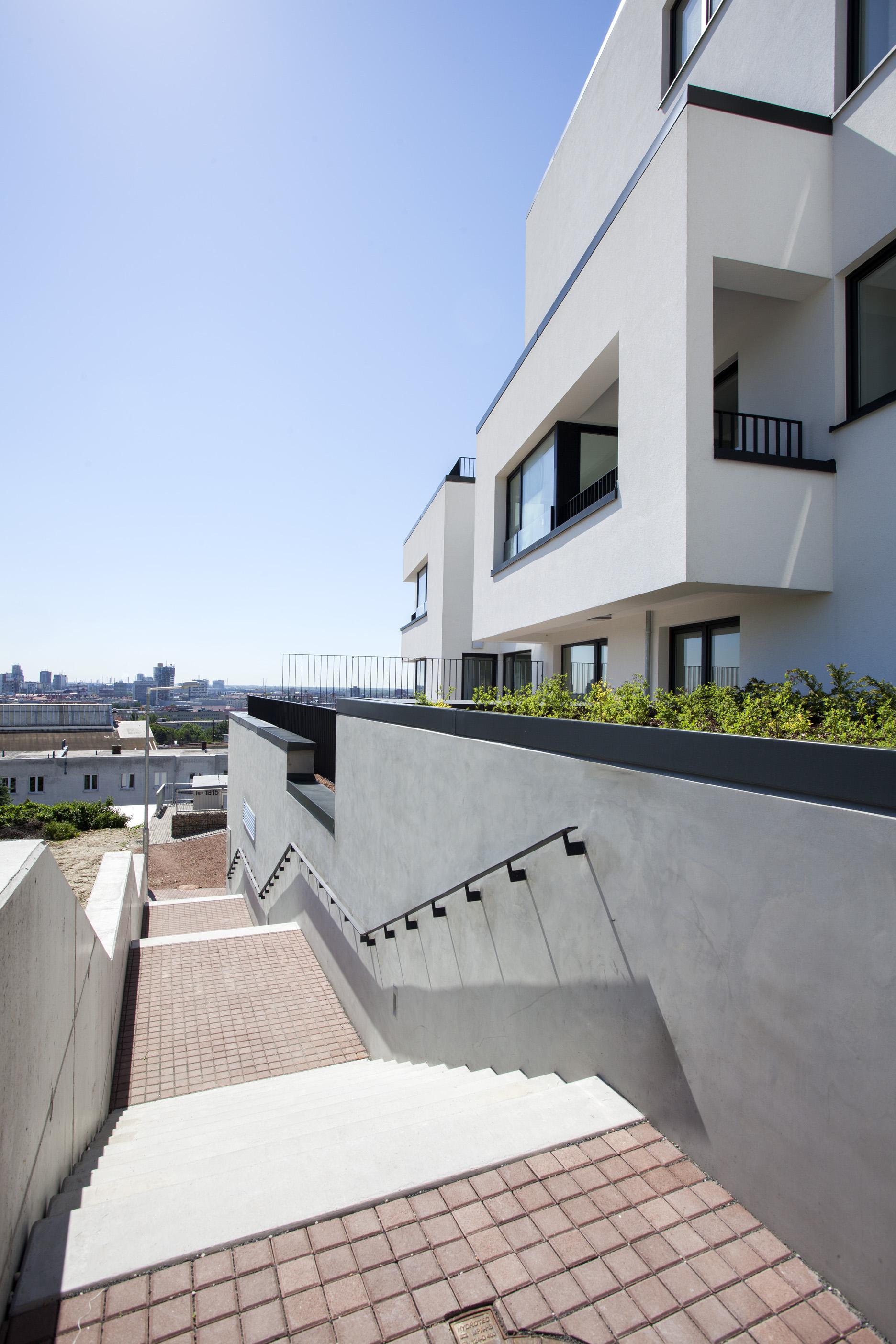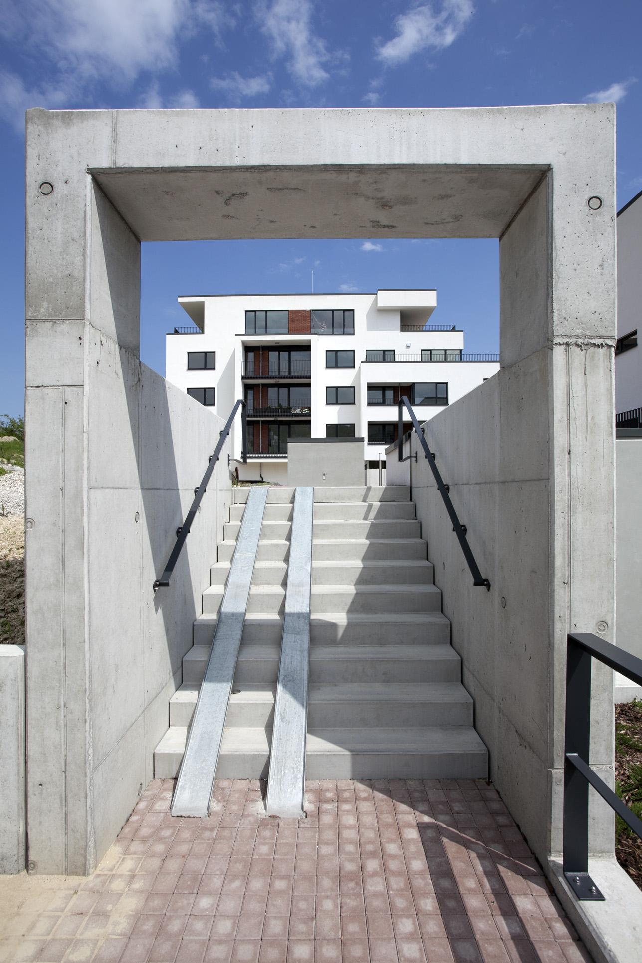Dom je osadený v pomerne náročnom teréne. Bezbariérový pohyb je umožnený v interiéri bytového domu. Všetky náročné úpravy vonkajšíchkomunikácií boli dokončené zároveň s objektom.