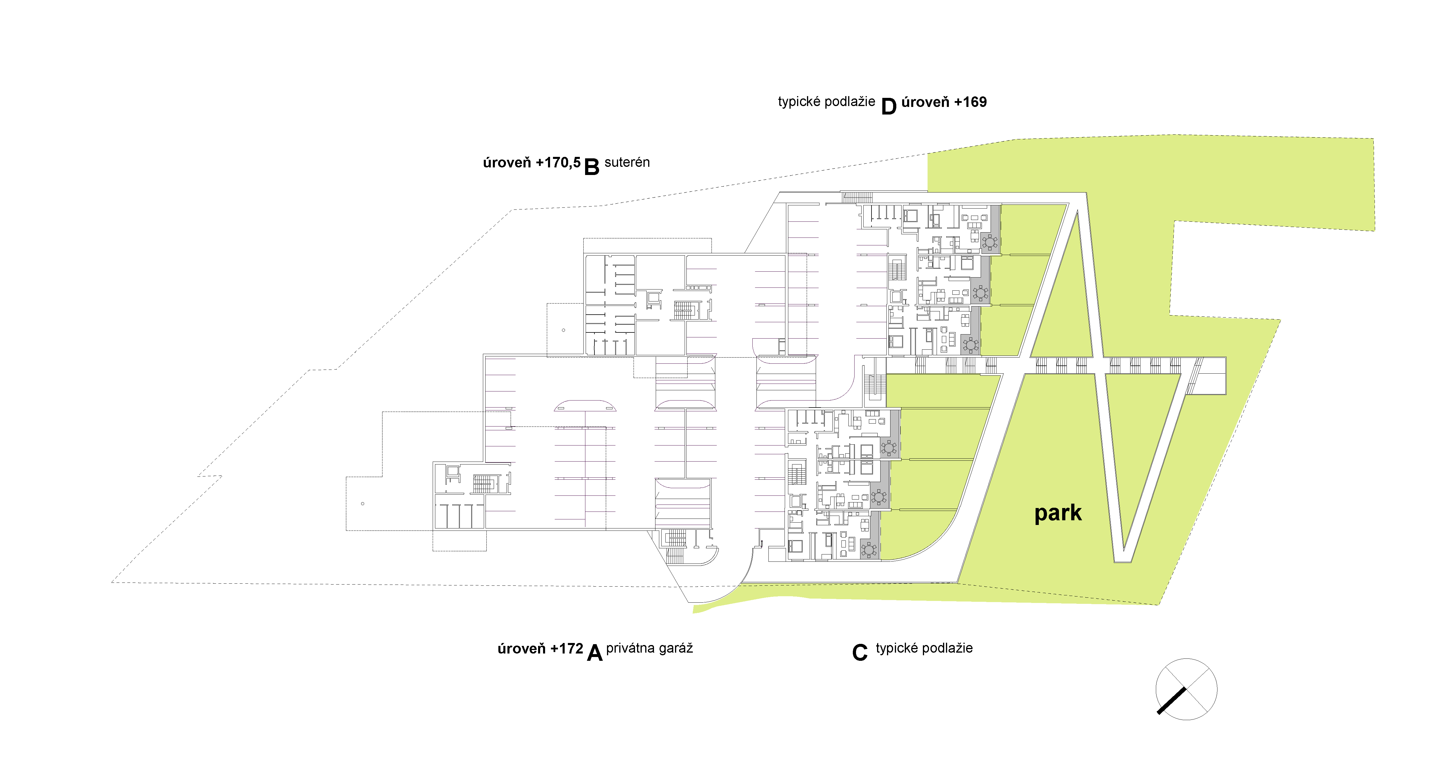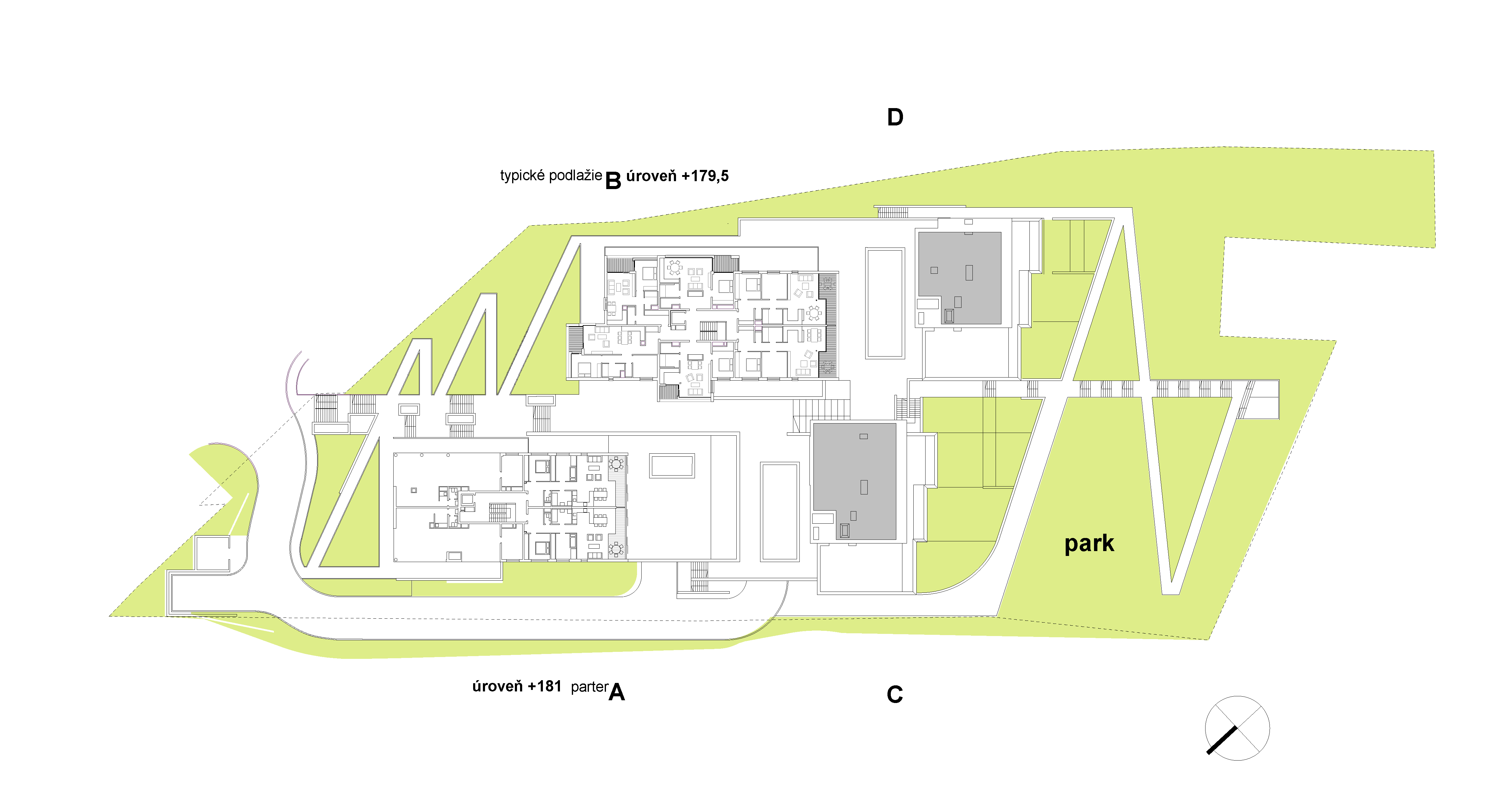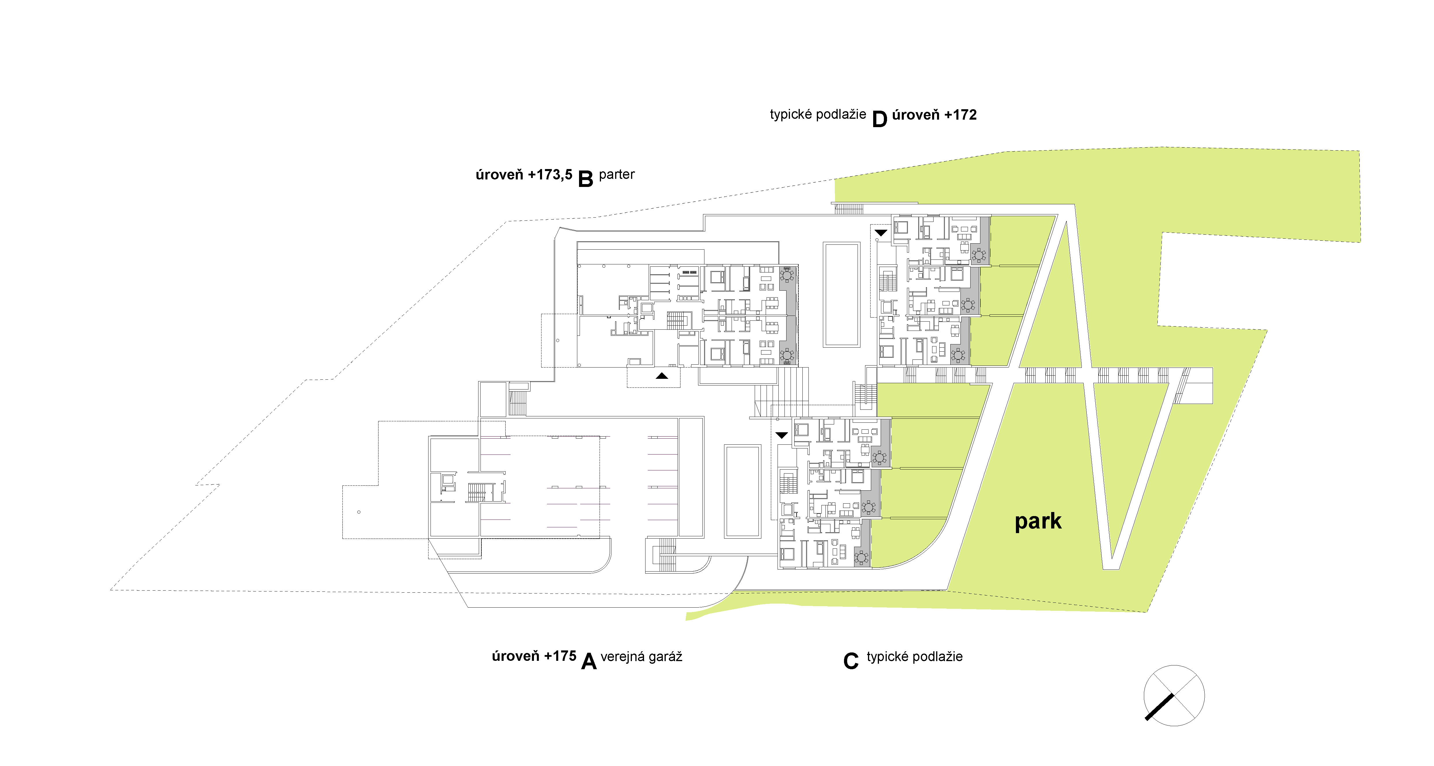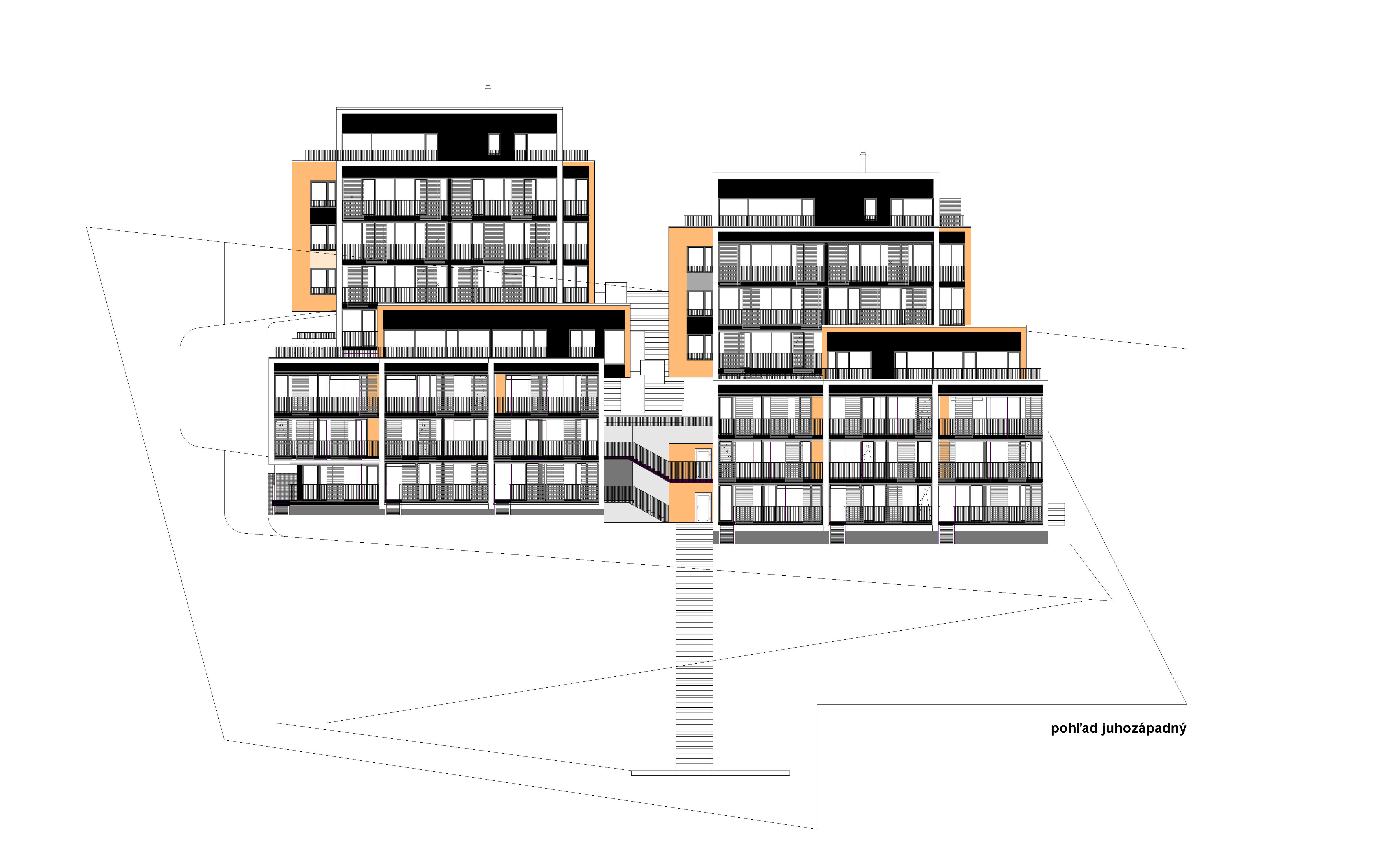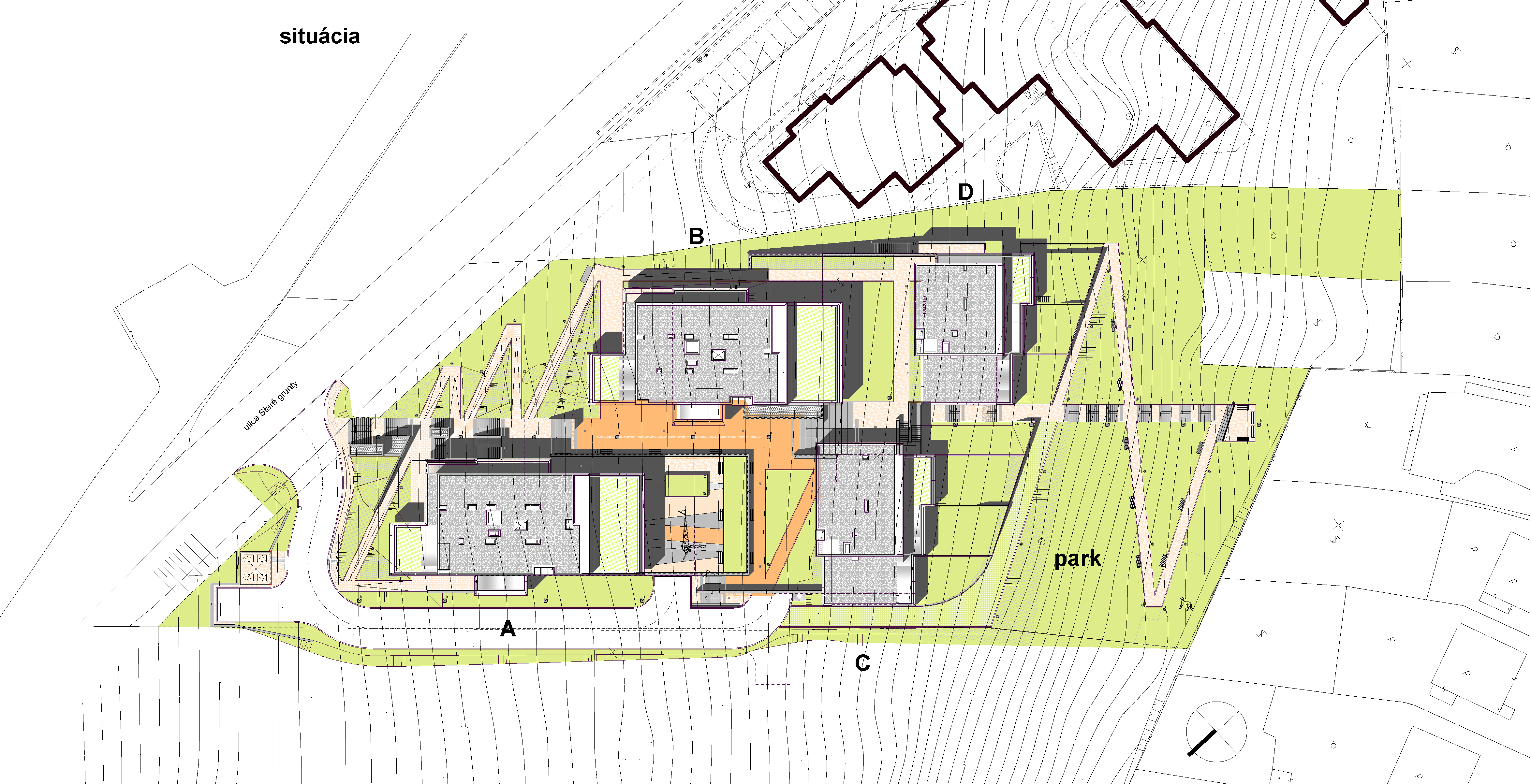 Obytný súbor tvoria 4 bodové bytové domy, osadené na spoločnej podzemnej halovej garáži kopírujúcej zvažujúci sa terén. Koncept šachovnicového osadenia domov umožňuje vizuálne zaujímavé komponovanie vnútroblokových priestorov so zachovaním voľných výhľadov z bytov a zaujímavých priehľadov medzi objektami na najbližšiu realitu súboru a vzdialenú panorámu protiľahlých svahov.