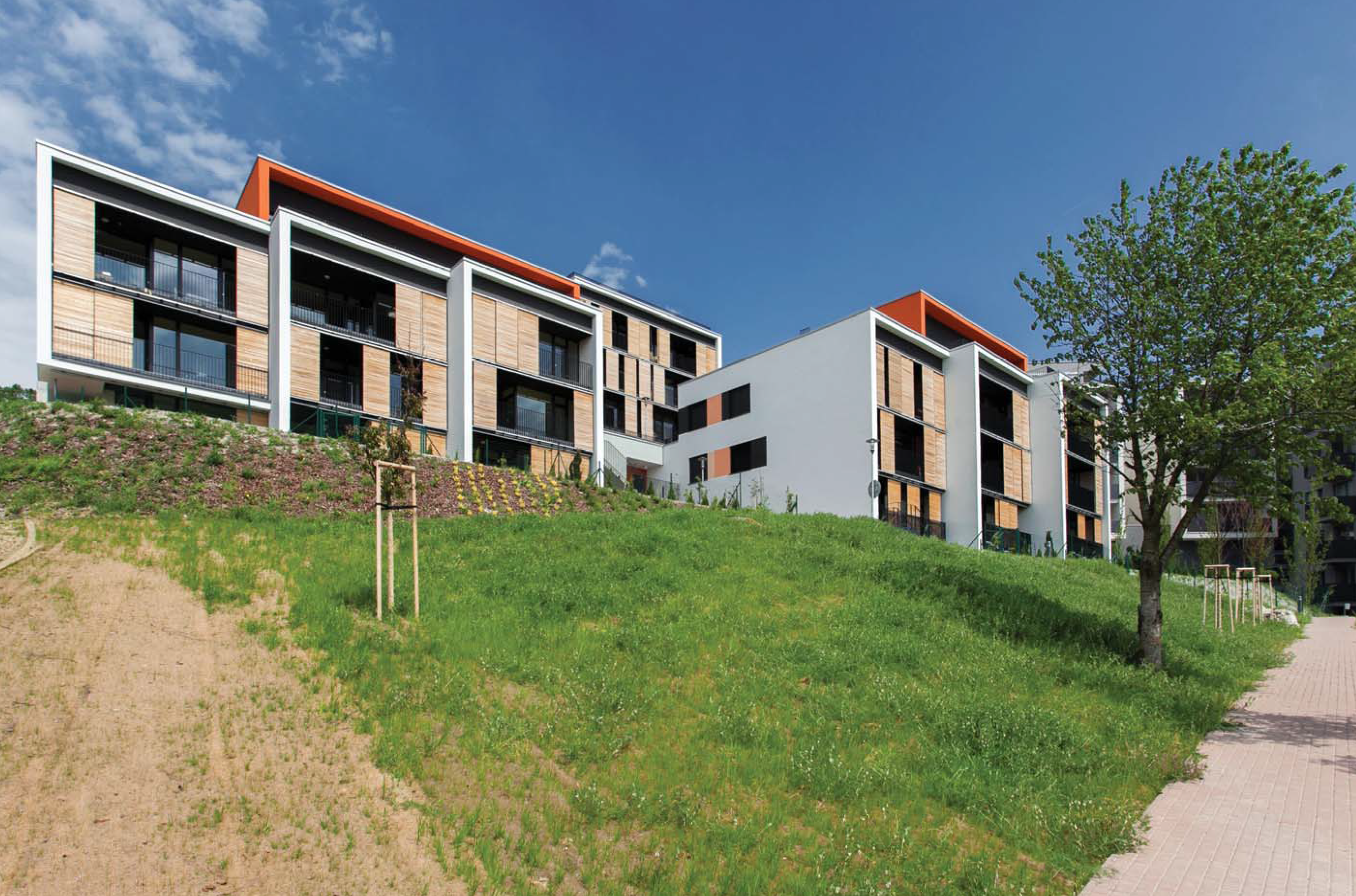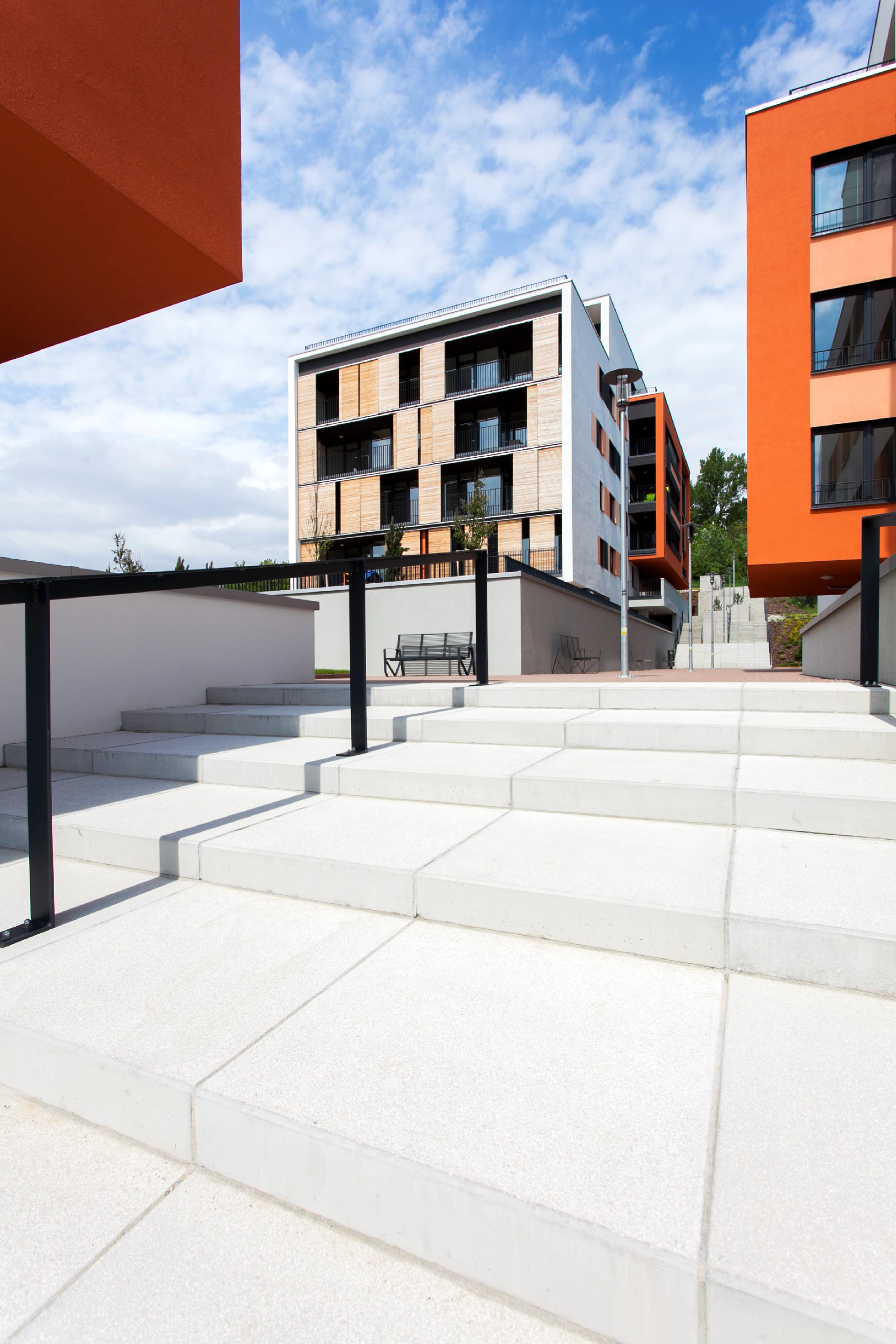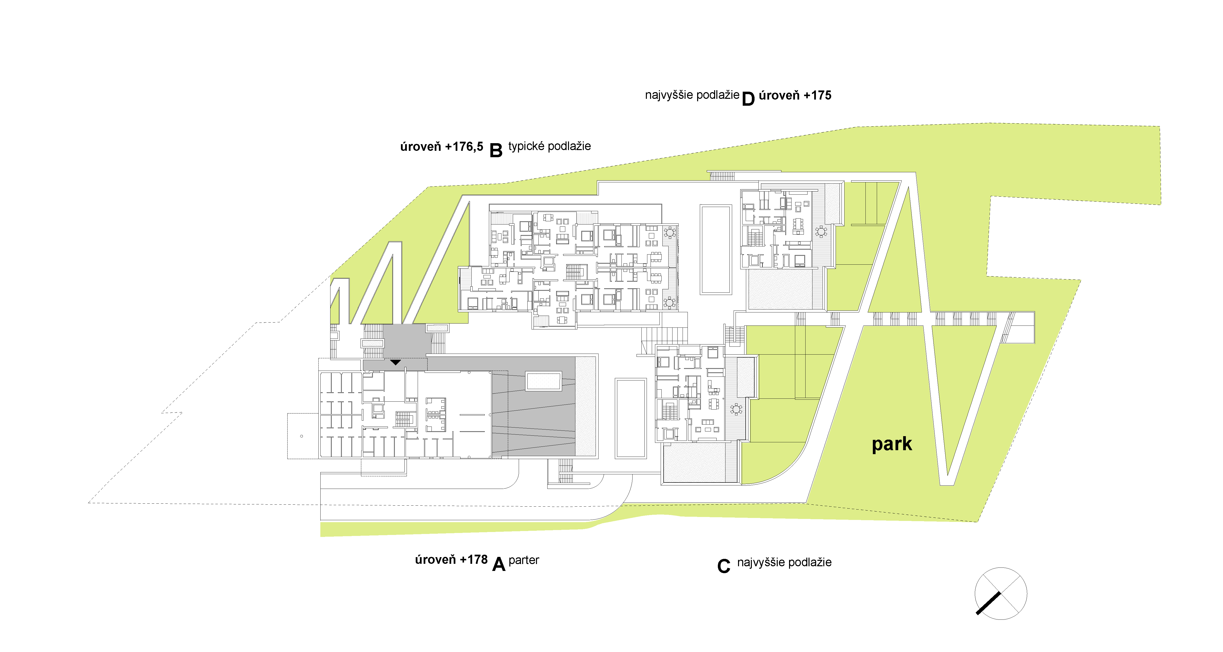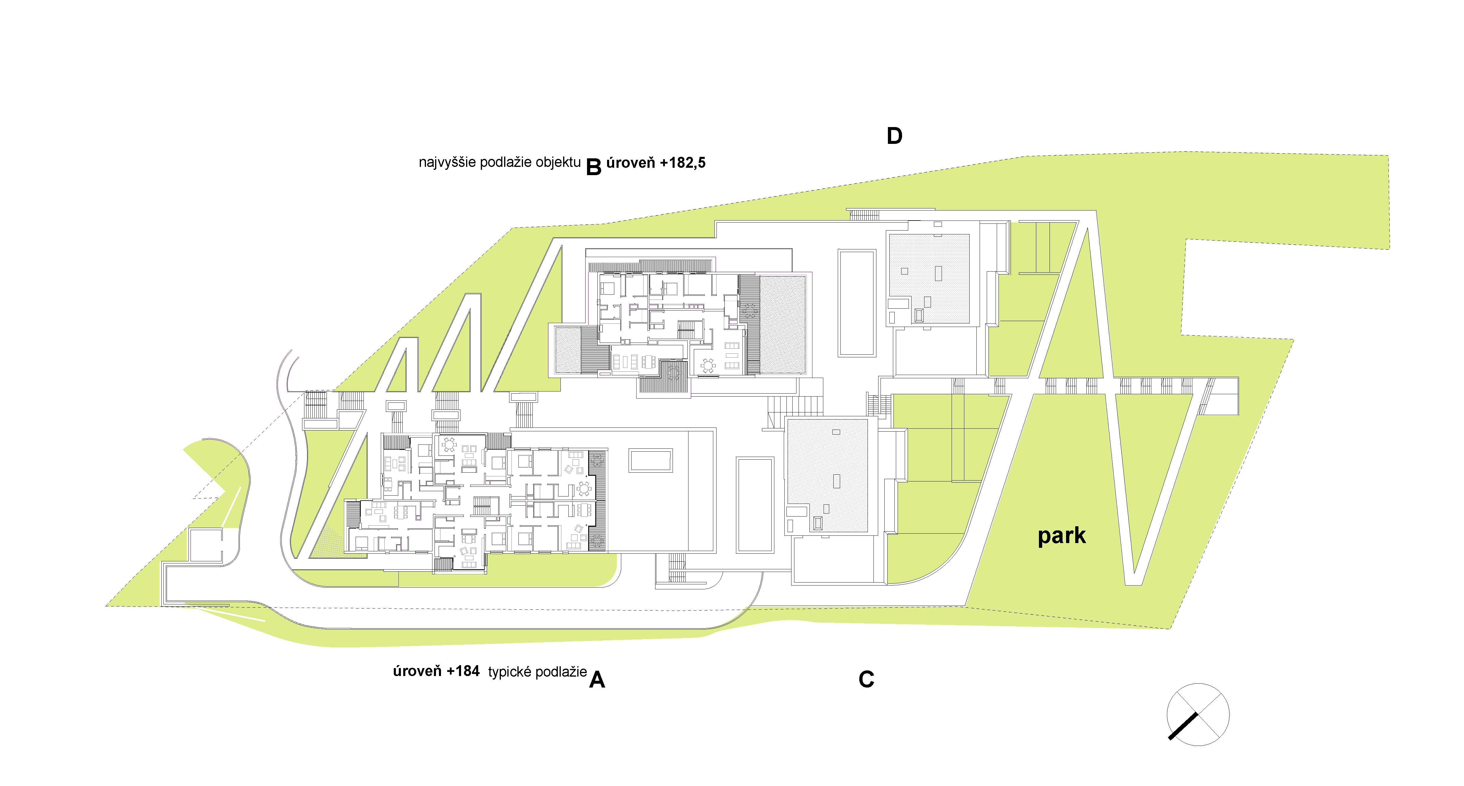 Obytný súbor tvoria 4 bodové bytové domy, osadené na spoločnej podzemnej halovej garáži kopírujúcej zvažujúci sa terén. Koncept šachovnicového osadenia domov umožňuje vizuálne zaujímavé komponovanie vnútroblokových priestorov so zachovaním voľných výhľadov z bytov a zaujímavých priehľadov medzi objektami na najbližšiu realitu súboru a vzdialenú panorámu protiľahlých svahov.