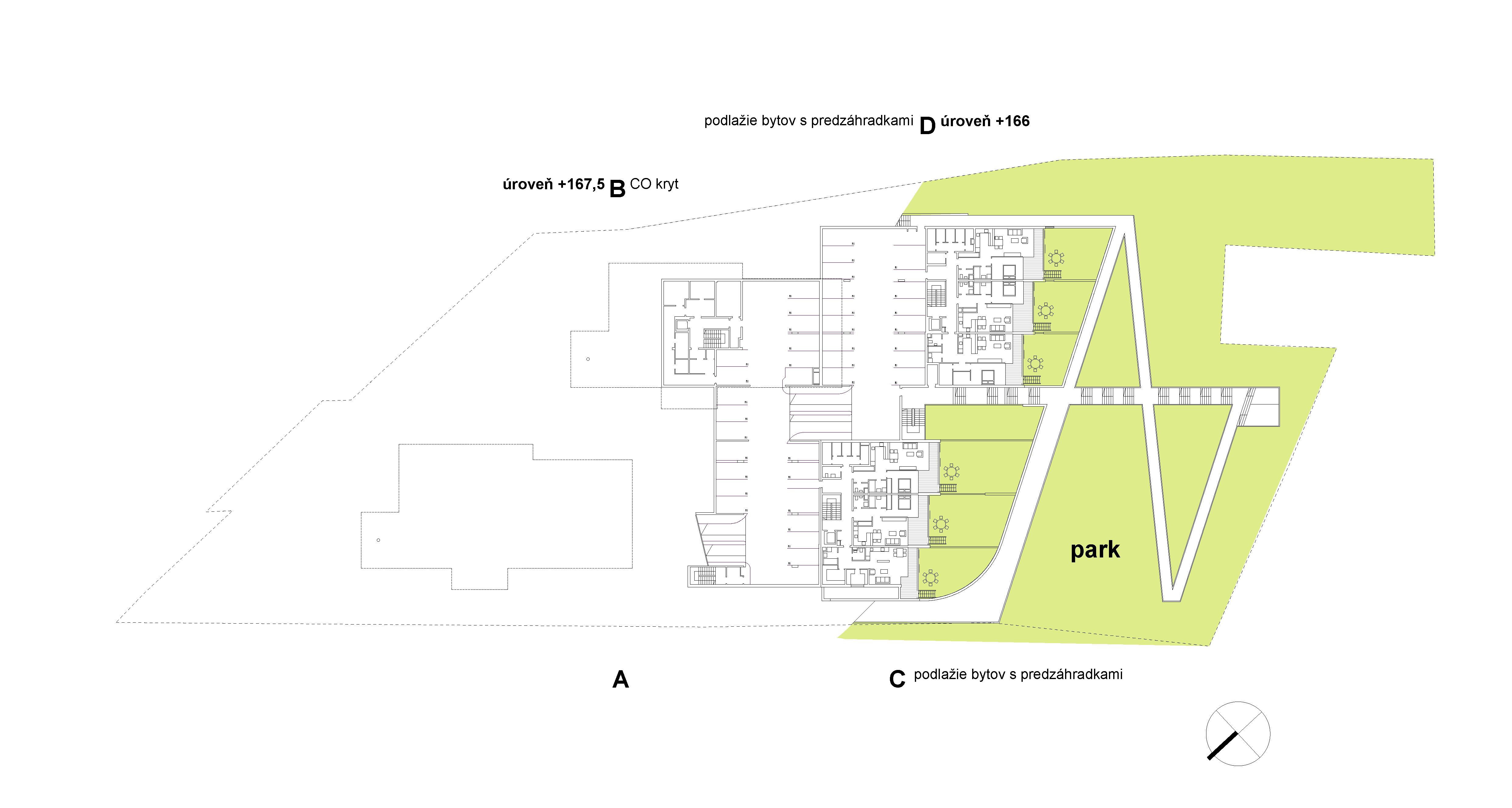 Kompozičnou osou je centrálny peší prístupový komunikačný priestor, ktorý začína v najvyššom bode pri vstupe do územia a ústi do rozsiahlej plochy verejnej zelene v spodnej južnej časti parcely. Tam na konci prechádzkového koridoru v kútiku pod jabloňou čaká plôška pre susedské sociálne interakcie.