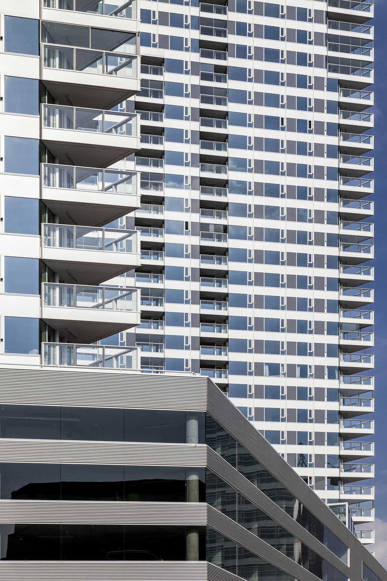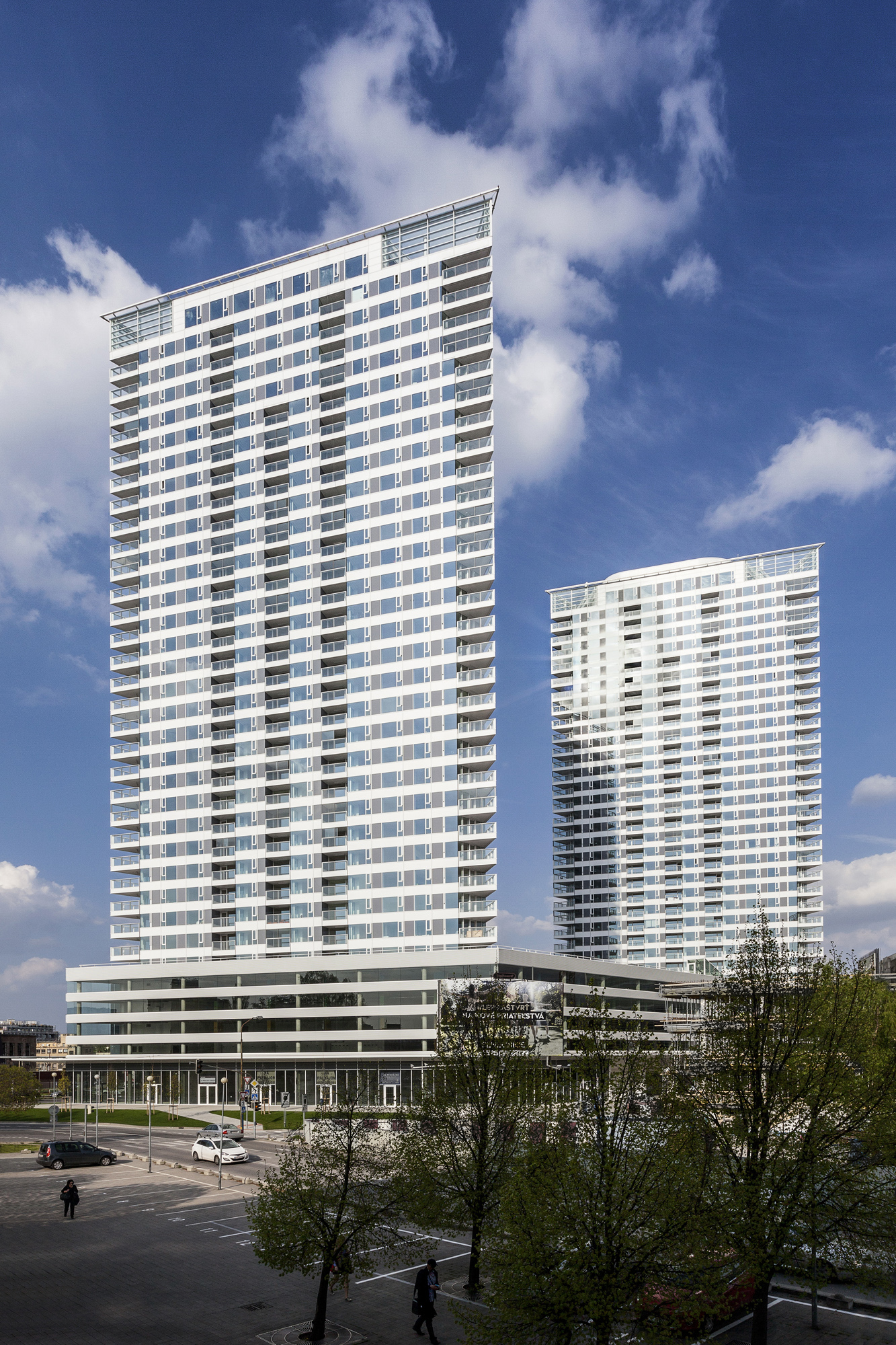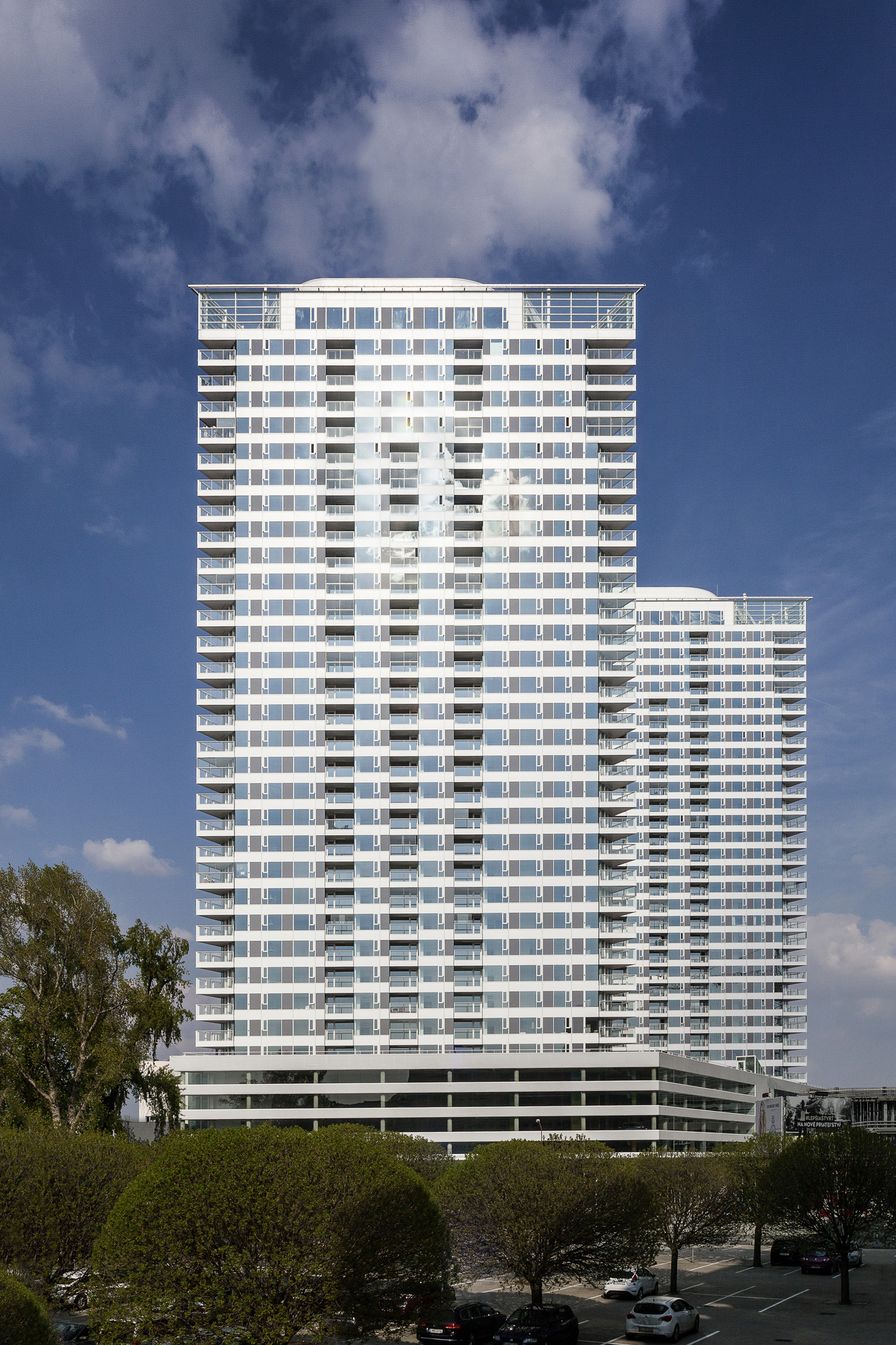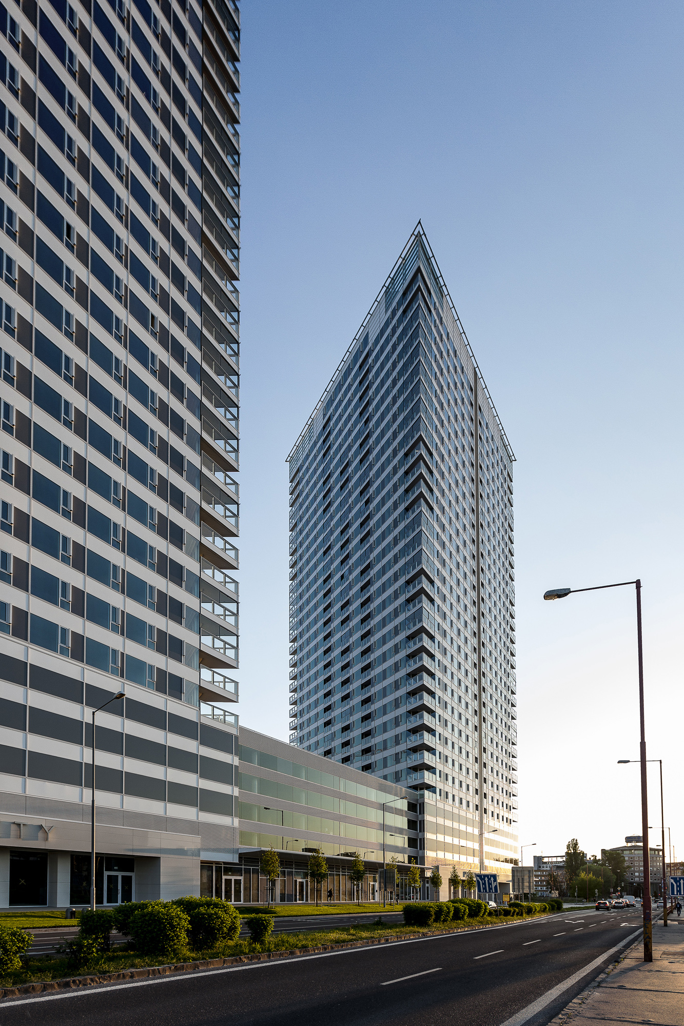 Bofill navrhol celosklené štíhle veže, ktoré v evokovali skôr administratívne výškové stavby, preto boli do súčasnej podoby projektu navrhnuté otvorené obytné loggie pre každý byt. Jednotlivé bloky čistých hladkých stien s „vyhryznutými“ objemami loggií využívajú rôzne uhly dopadu slnečných lúčov a vytvárajú tak hru svetla a tieňa. Architektonický výraz obytných veží okrem samotných loggií výrazne ovplyvňujú priebežné biele horizontálne parapetné pásy rozličnej výšky. Sú vyhotovené z tepelnoizolačných výplní na báze pohľadového hliníkového plechu hrúbky 3 mm. V zasklených častiach fasády sa strieda priehľadná plocha s netransparentnou výplňou tepelnoizolačných panelov s predsadeným sivým kaleným sklom. Charakteristické sú najvyššie podlažia, na ktorých dominujú v nárožiach veľké presklené terasy, evokujúce určitú afinitu s architektúrou blízkeho Toweru 115. Výškové obytné budovy sa stali neoddeliteľnou súčasťou panorámy Bratislavy.