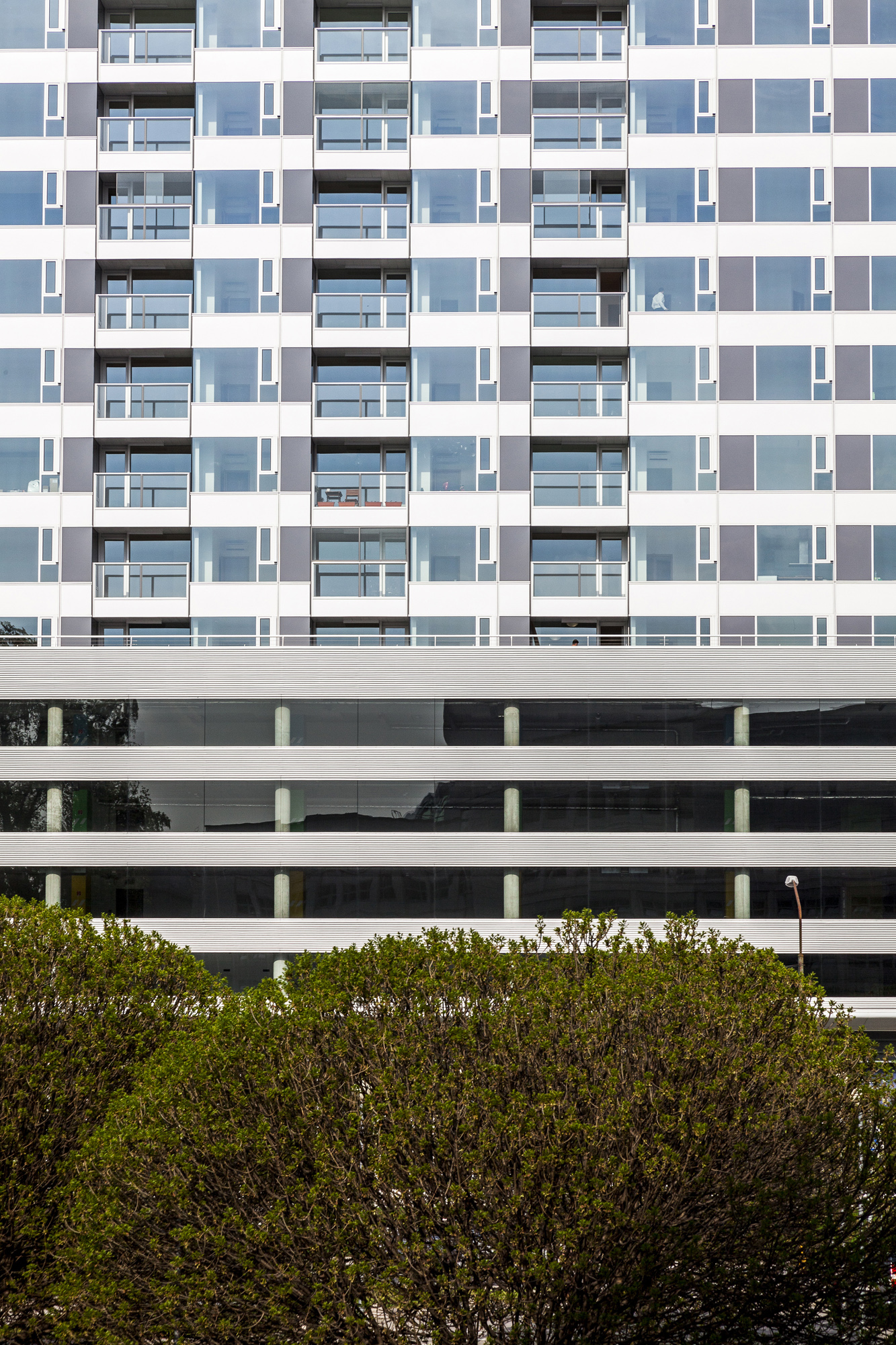 Podnož je jednoducho a presvedčivo architektonicky stvárnená. Horizontálne línie lamelových parapetov sa striedajú s bezrámovým zasklením. Hromadné garáže, ktoré sú situované na 1. až 4. poschodí sú elegantne integrované a nenarúšajú celistvý výraz fasády.