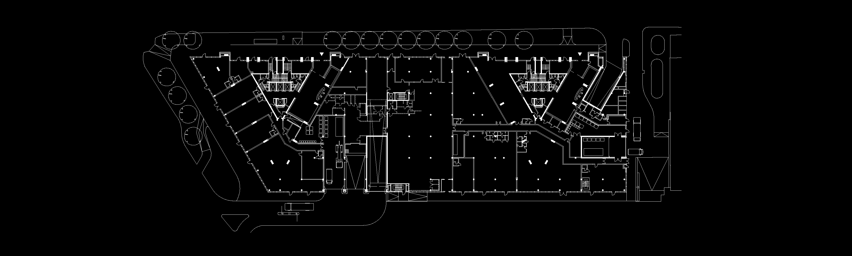 Prízemie zastrešuje obchodné prevádzky, v suteréne a na 1. až 4. poschodí podnože sú hromadné garáže. Hlavné vstupné haly do obytnej časti sú prístupné z Landererovej ulice, z nich je zabezpečený prístup do komunikačných jadier veží so štvoricami rýchlovýťahov.