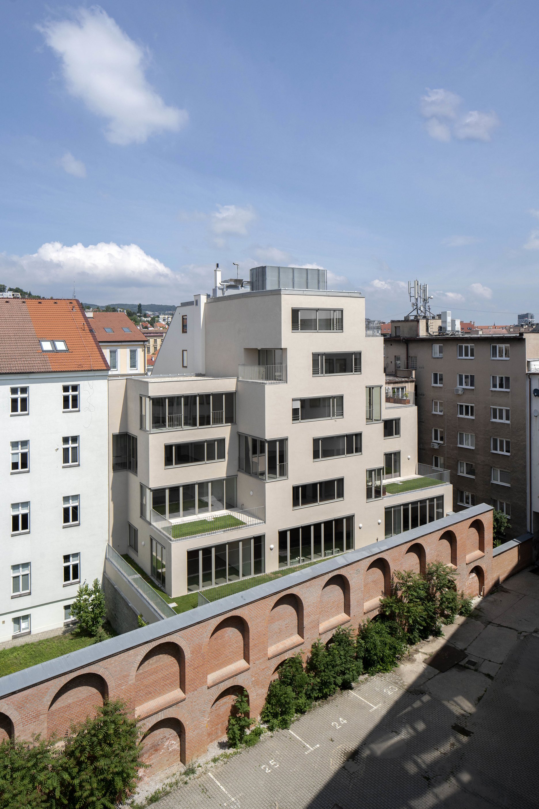 Investorom zrealizovaná architektonická súťaž preverila, že miera zastavania parcely pozitívne ovplyvňuje a doplňuje riešené územie, dotvára a sceľuje priestory ulice a dvorov.